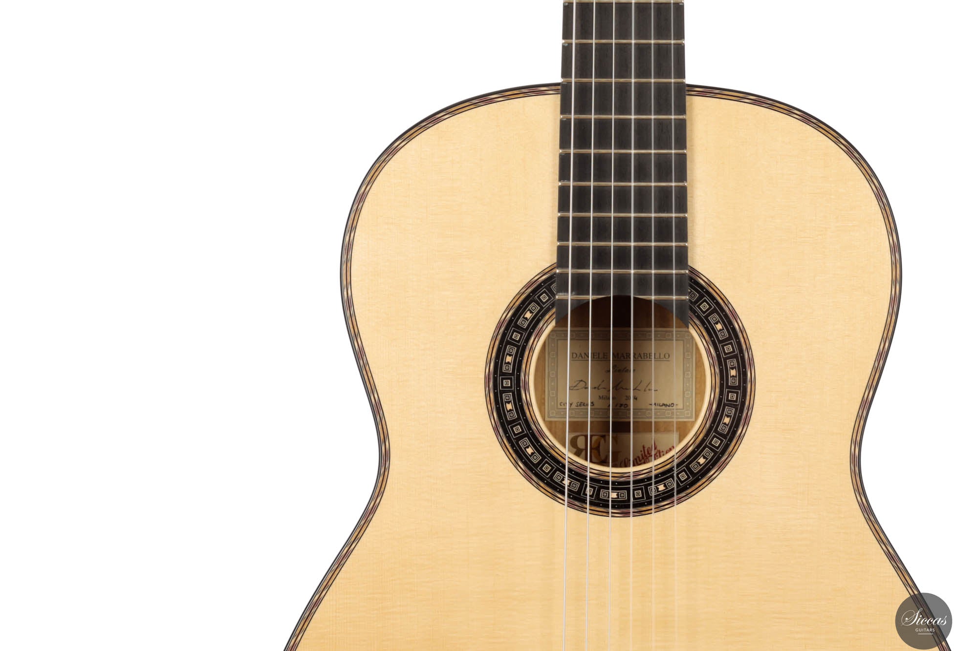 Daniele Marrabello ist einer der gefragtesten italienischen Gitarrenbauer. Nach seinem Studienabschluss als Gitarrenbauer an der Civica Scuola di Liuteria in Mailand wurde er Schüler von Enrico Bottelli und vertiefte seine Holzbearbeitungsfähigkeiten, seine ästhetische Identität und seine Klangpersönlichkeit unter der Anleitung des geschätzten Maestros. Im Jahr 2012 eröffnete Daniele Marrabello seine eigene Werkstatt in Vimodrone, am Rande von Mailand.