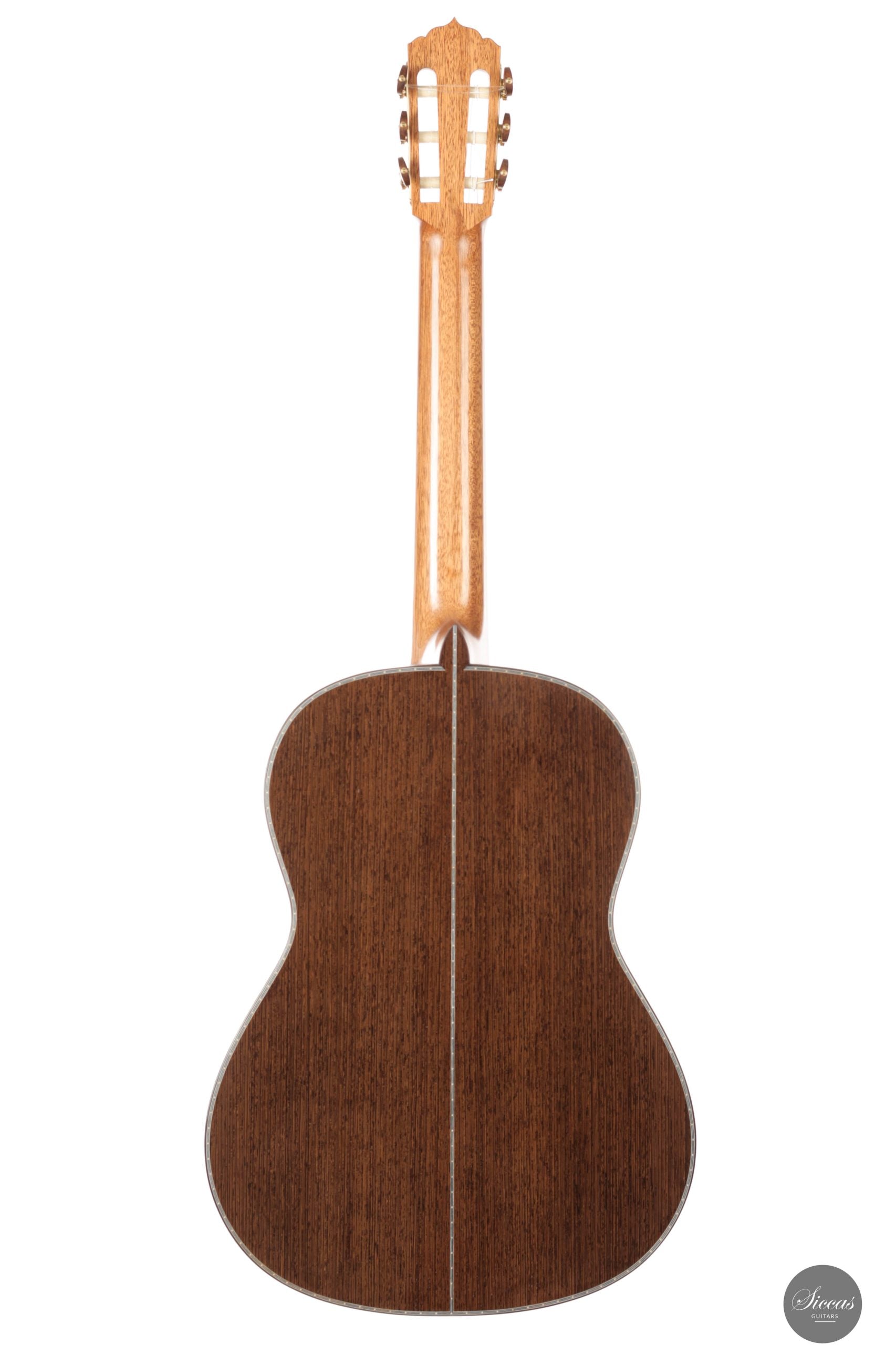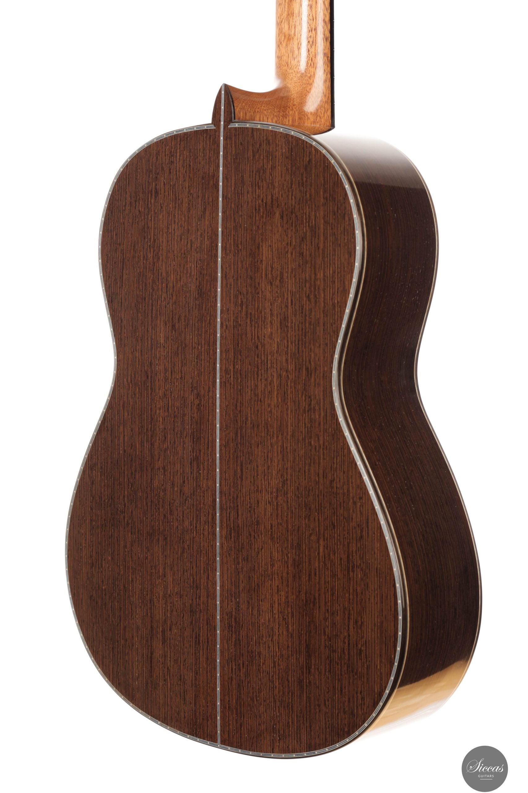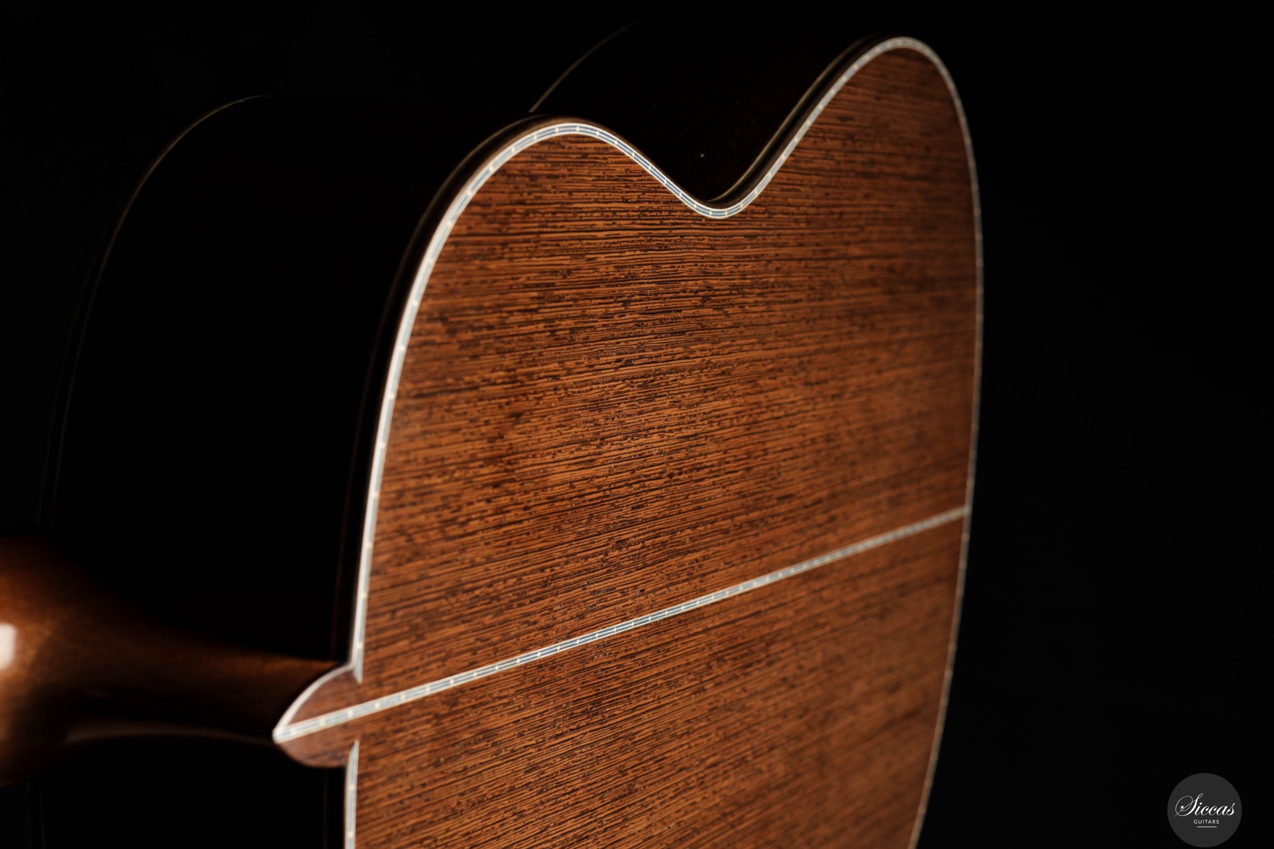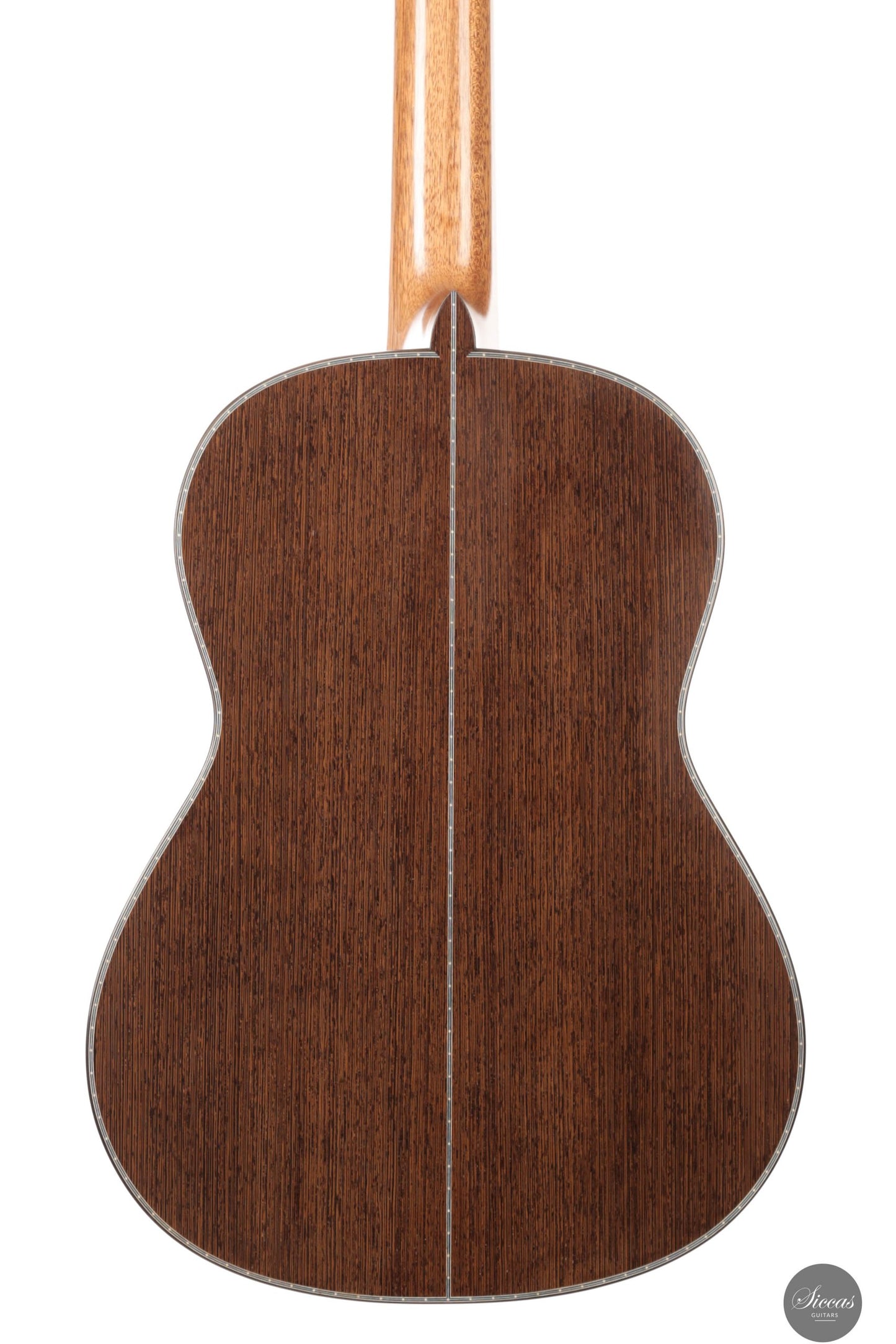 It delivers crystal-clear trebles with balanced, focused basses, providing a sound that is both refined and powerful. The choice of wengé for the back and sides significantly enhances the projection and overall volume of the instrument, giving it the strength and presence required for concert performance. This guitar responds beautifully to polyphonic repertoire, allowing complex musical textures to be articulated with clarity and depth. In addition, it offers a remarkably organic timbre that feels natural and pleasing to the ear.