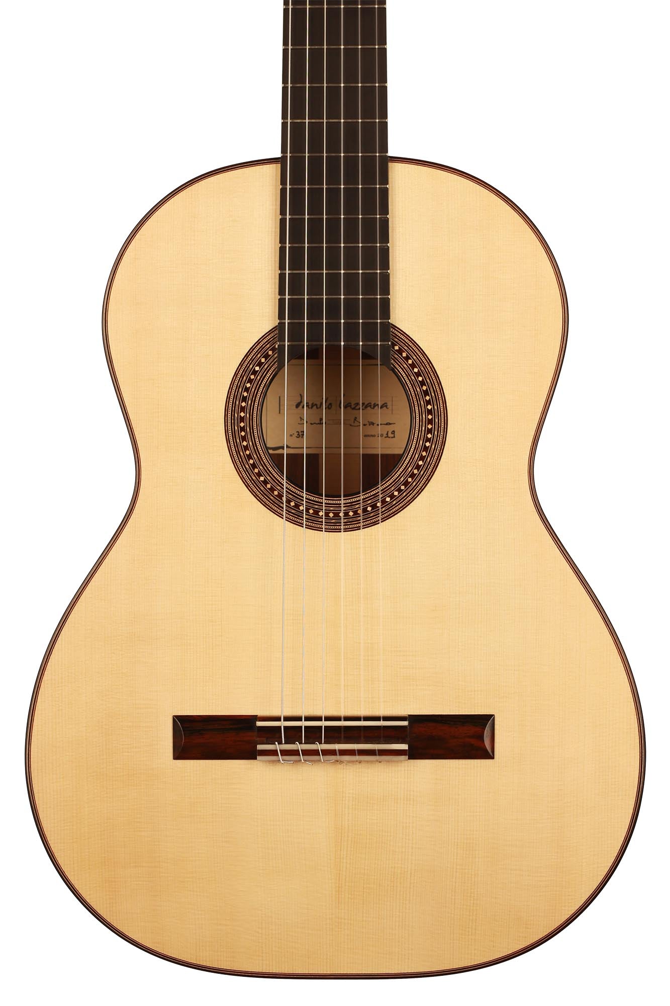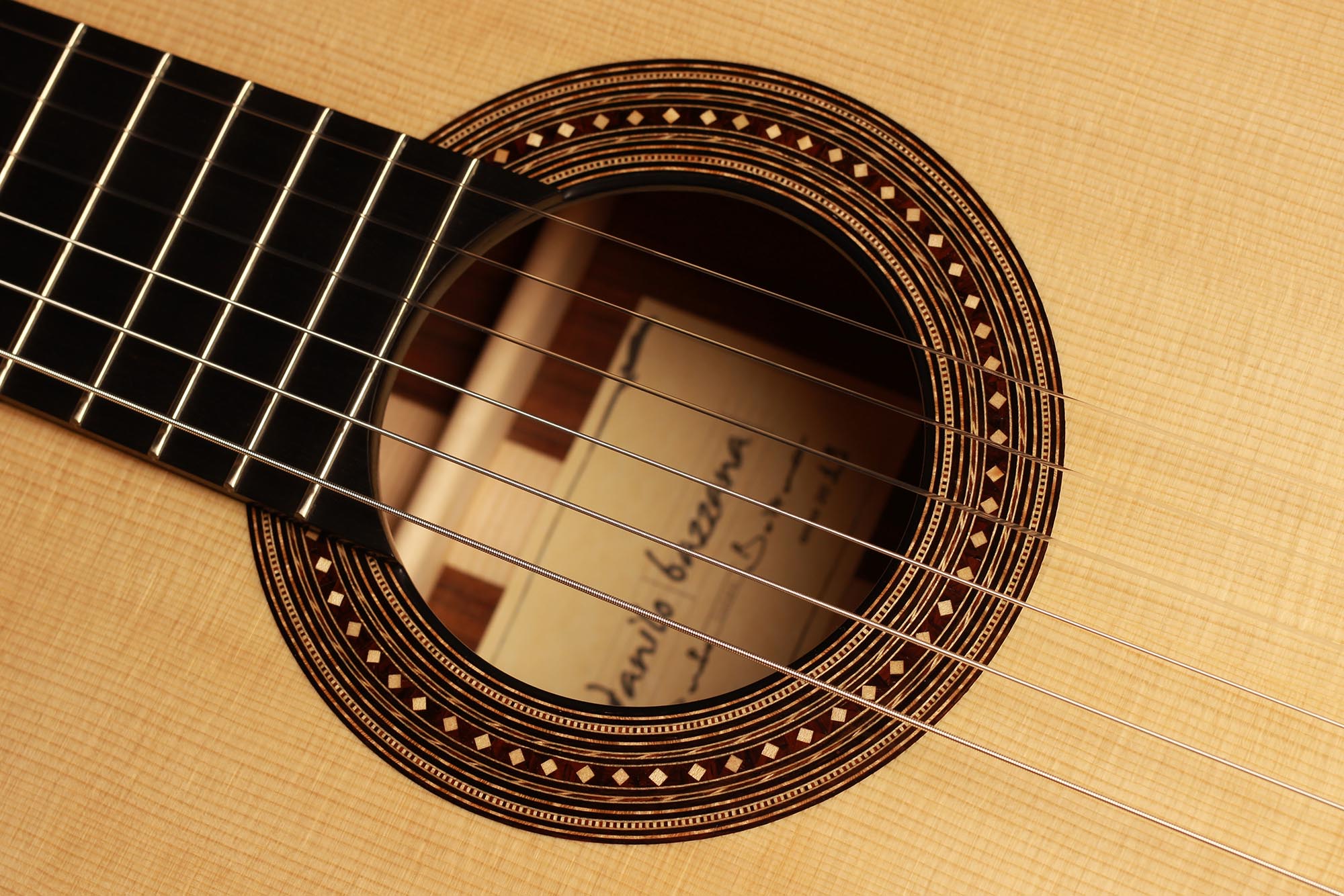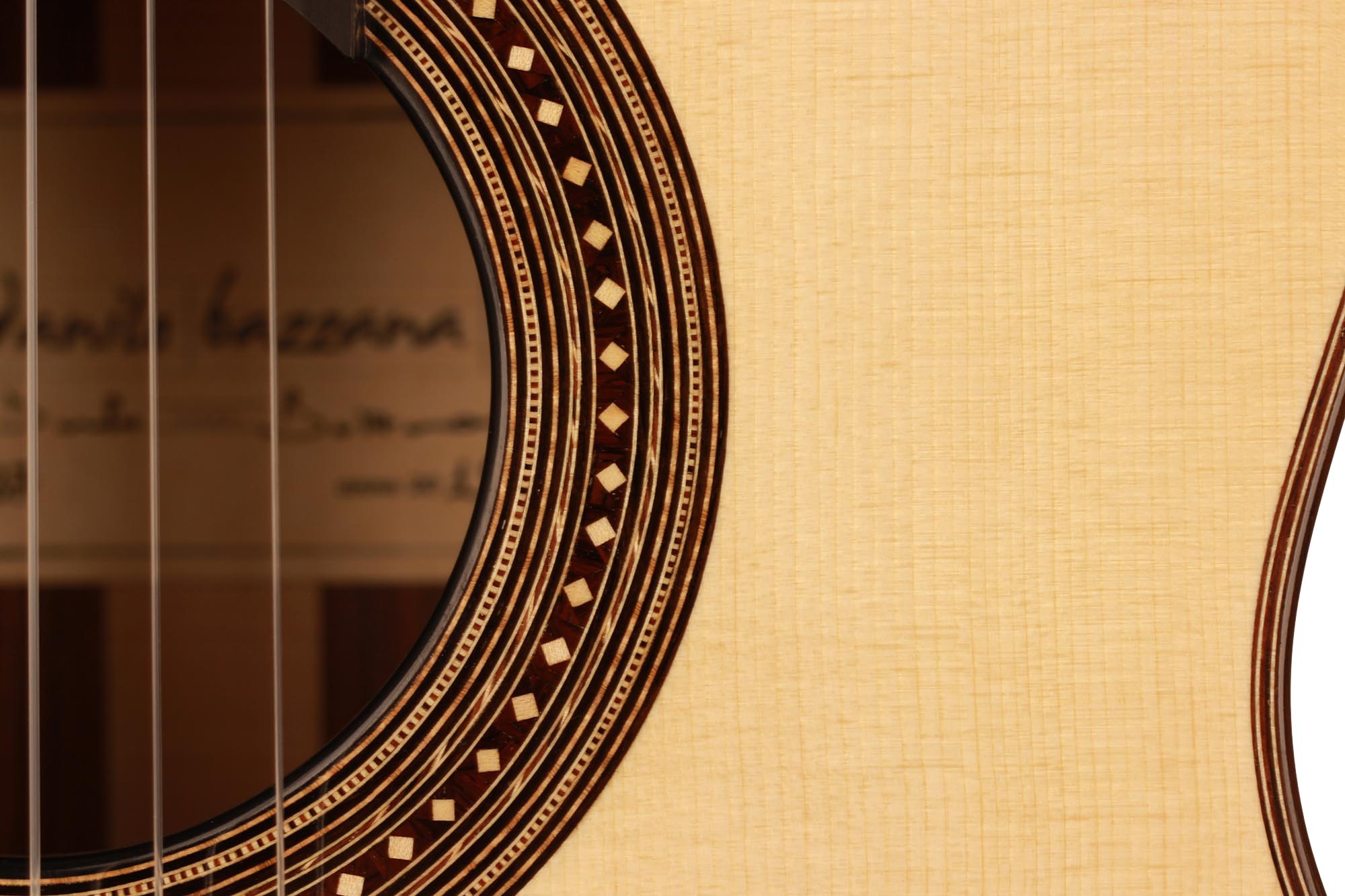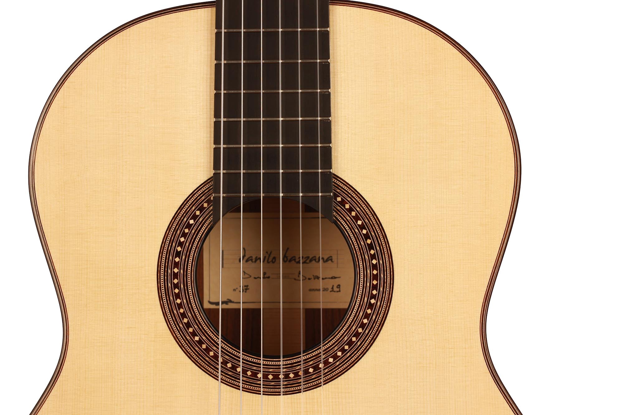 Danilo Bazzana ist ein italienischer Gitarrenbauer aus der Nähe von Mailand. Seine Gitarren sind, wie immer in der italienischen Lutherie-Tradition, sehr präzise gebaut und zeigen ein hohes Maß an Einlegekunst. Dieses Instrument hat eine erstklassige Fichtendecke, die mit einer filigranen Rosette und dunklen Randeinlagen verziert ist, die einen geschmackvollen Kontrast erzeugen. Danilo wählte für diese Gitarre einen 12-Loch-Steg, der dem Klang eine sehr schnelle und präzise Definition verleiht. Außerdem ist diese Gitarre ohne geschützte Hölzer hergestellt und damit CITES-Frei.