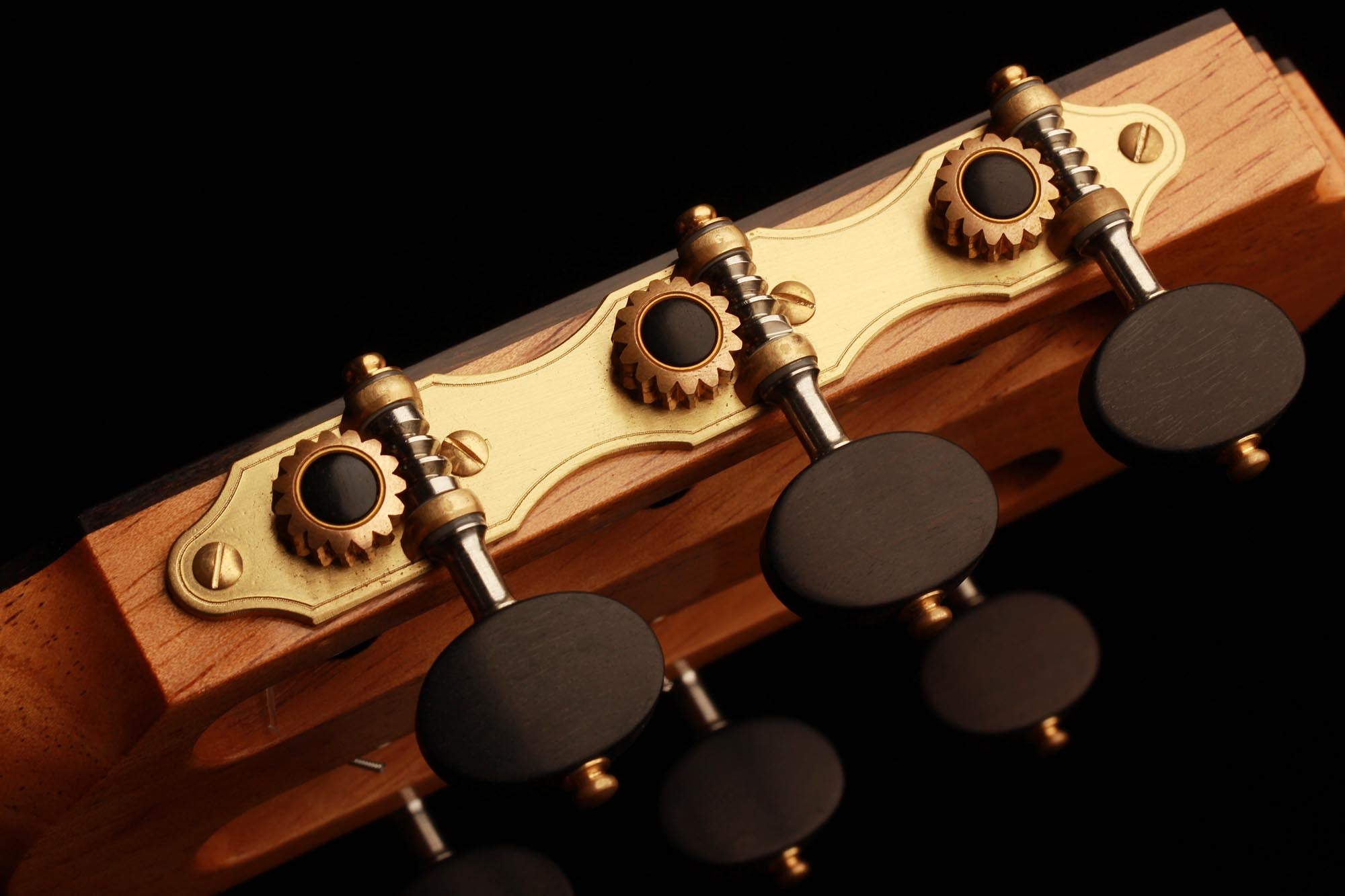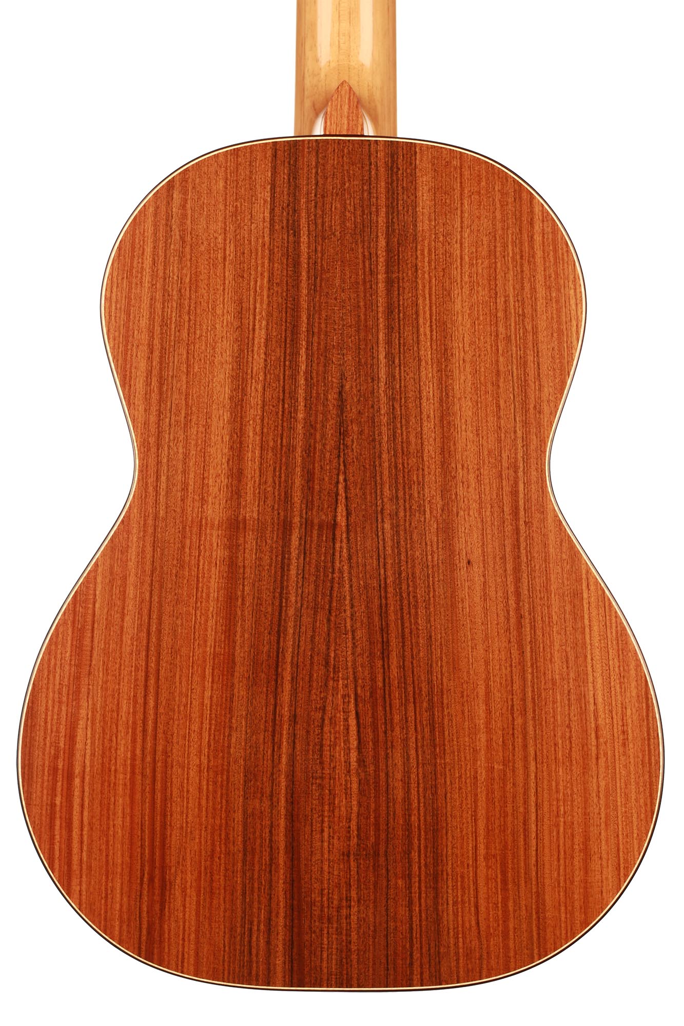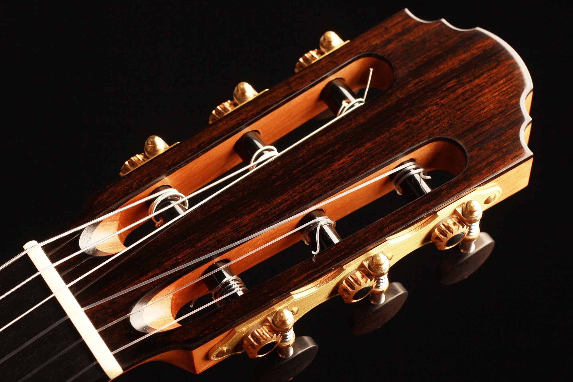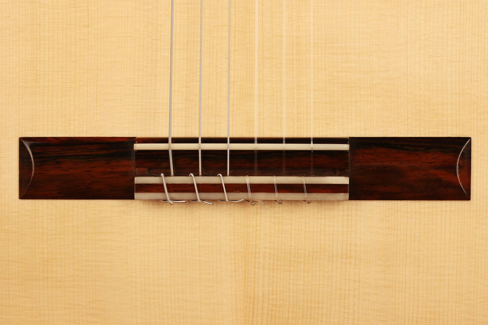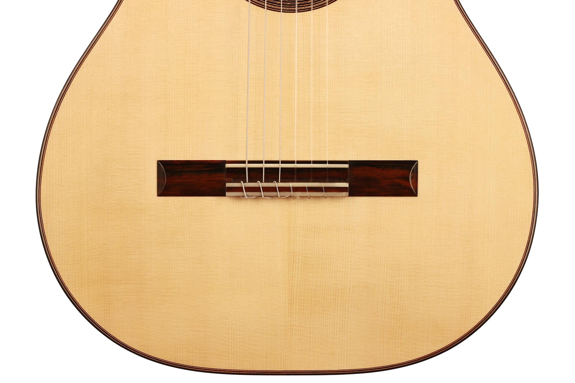 Danilo Bazzana ist ein italienischer Gitarrenbauer aus der Nähe von Mailand. Seine Gitarren sind, wie immer in der italienischen Lutherie-Tradition, sehr präzise gebaut und zeigen ein hohes Maß an Einlegekunst. Dieses Instrument hat eine erstklassige Fichtendecke, die mit einer filigranen Rosette und dunklen Randeinlagen verziert ist, die einen geschmackvollen Kontrast erzeugen. Danilo wählte für diese Gitarre einen 12-Loch-Steg, der dem Klang eine sehr schnelle und präzise Definition verleiht. Außerdem ist diese Gitarre ohne geschützte Hölzer hergestellt und damit CITES-Frei.