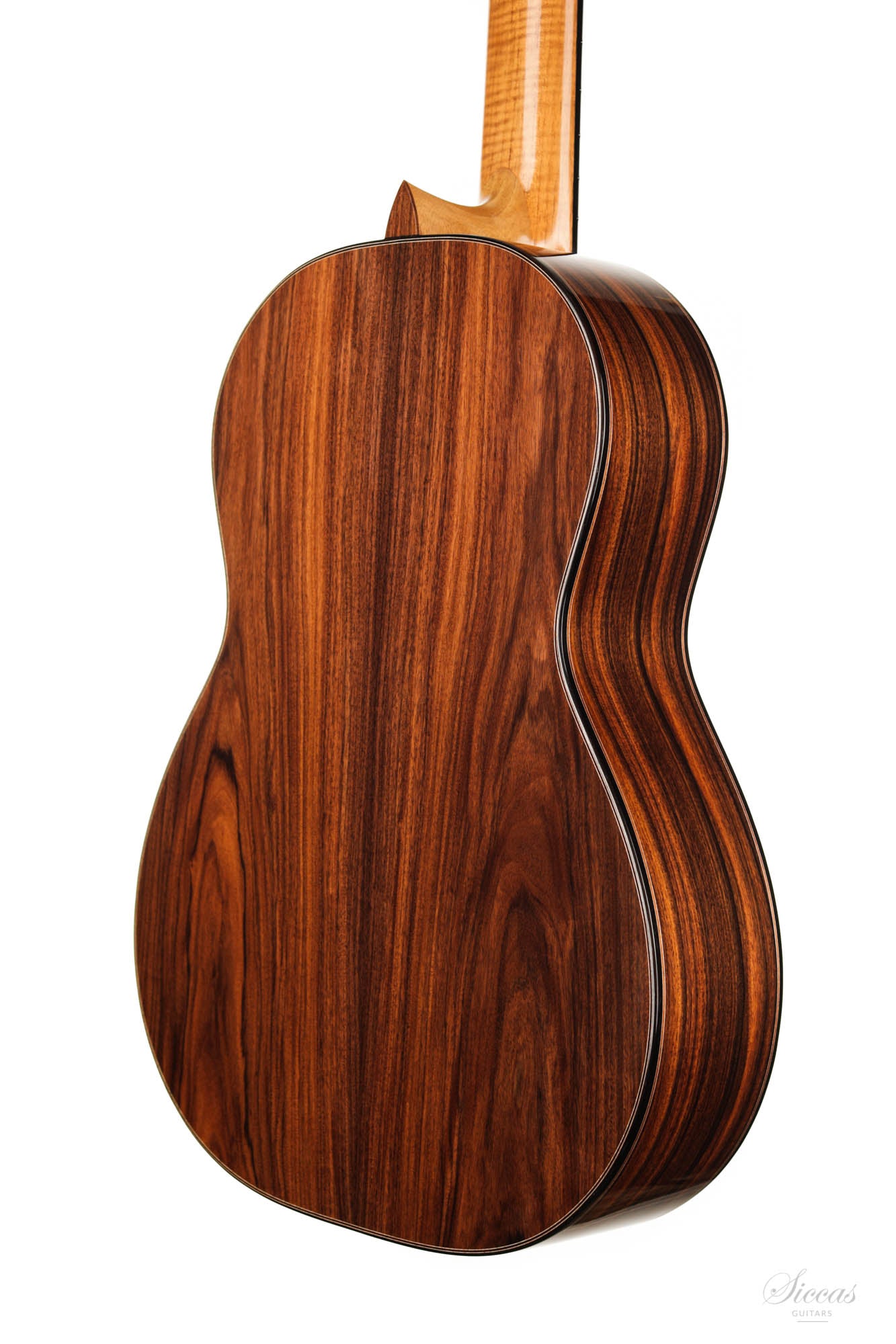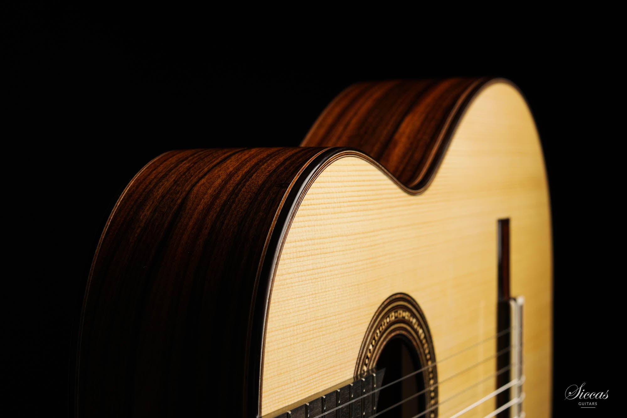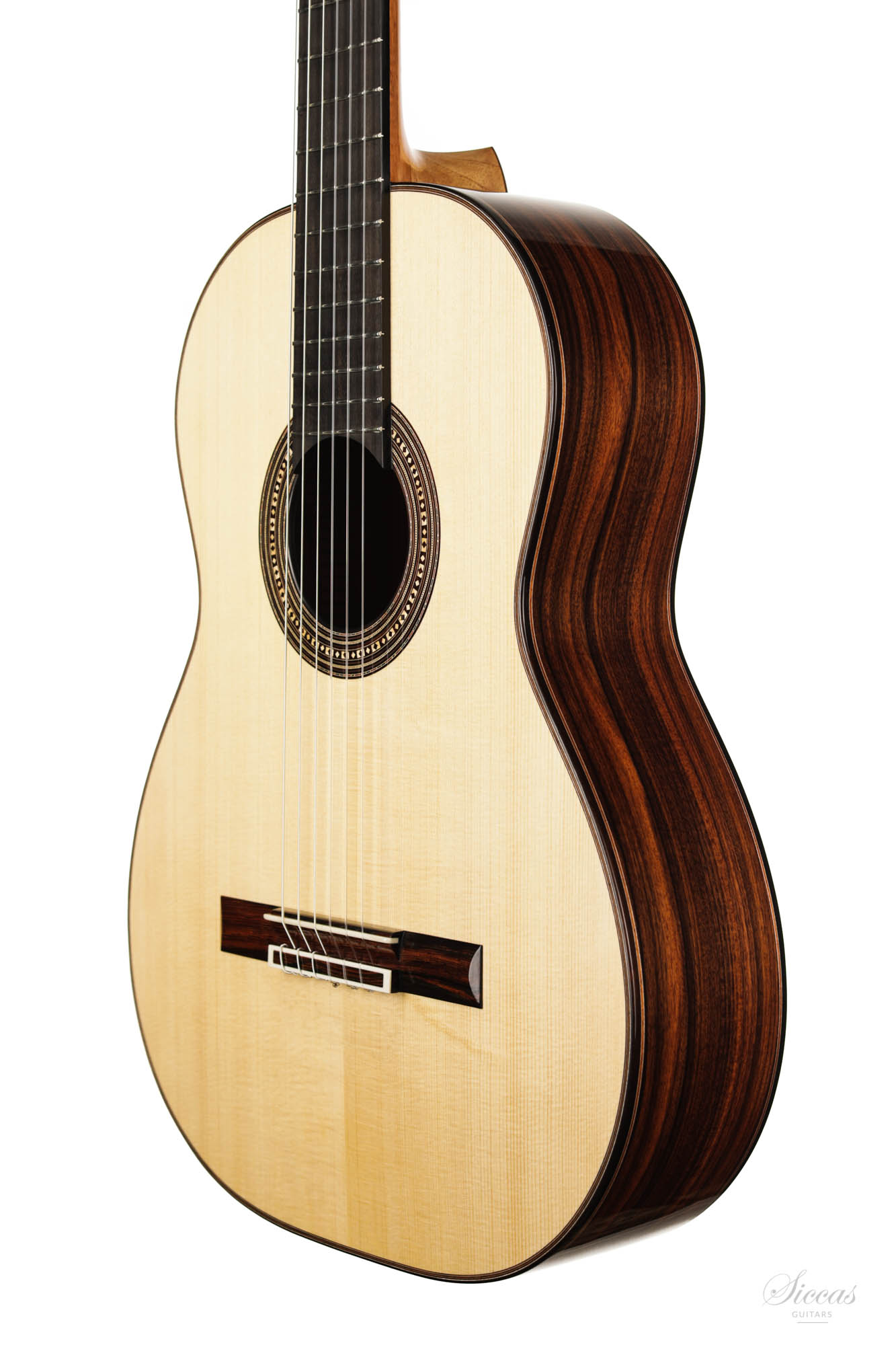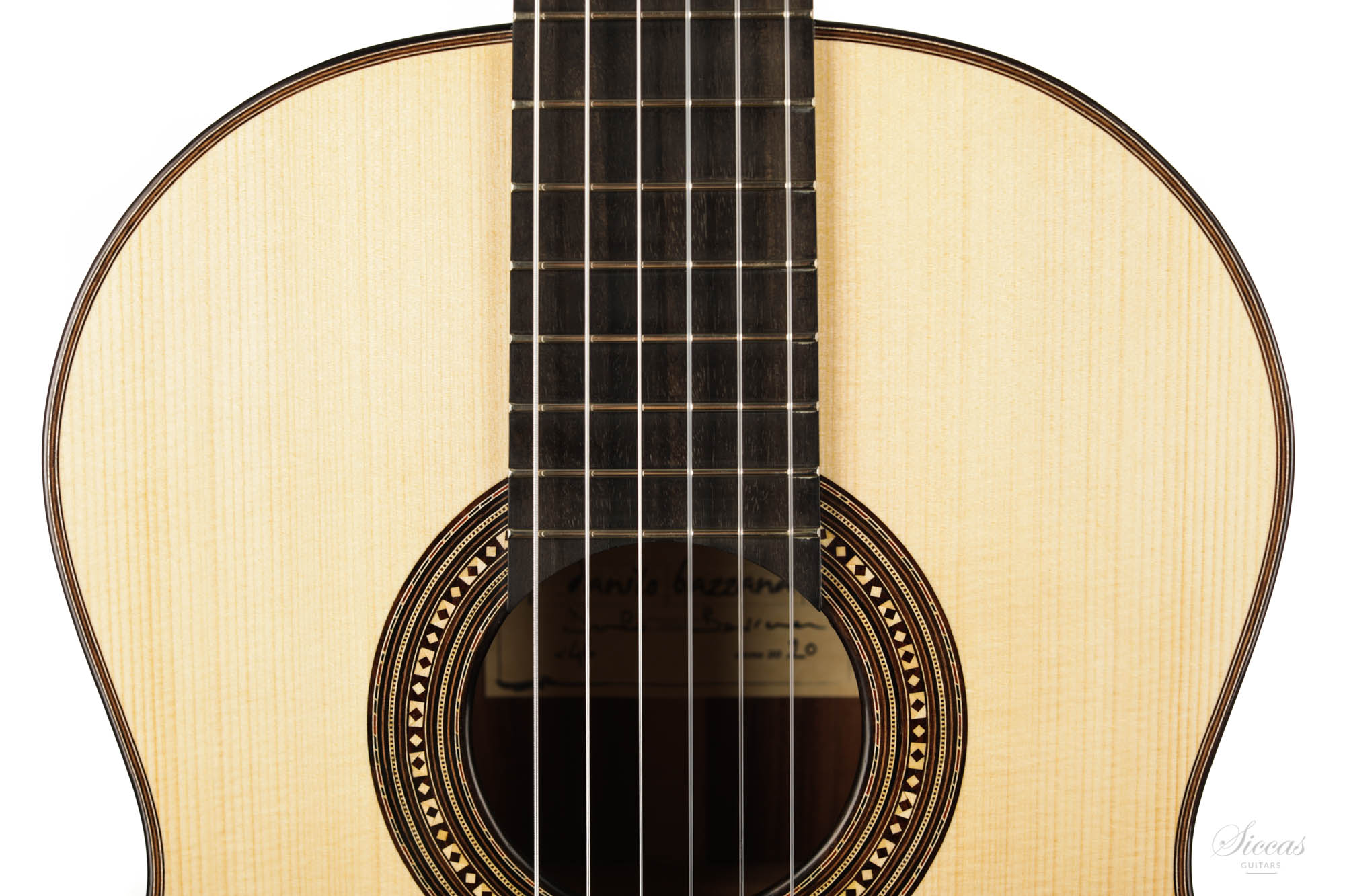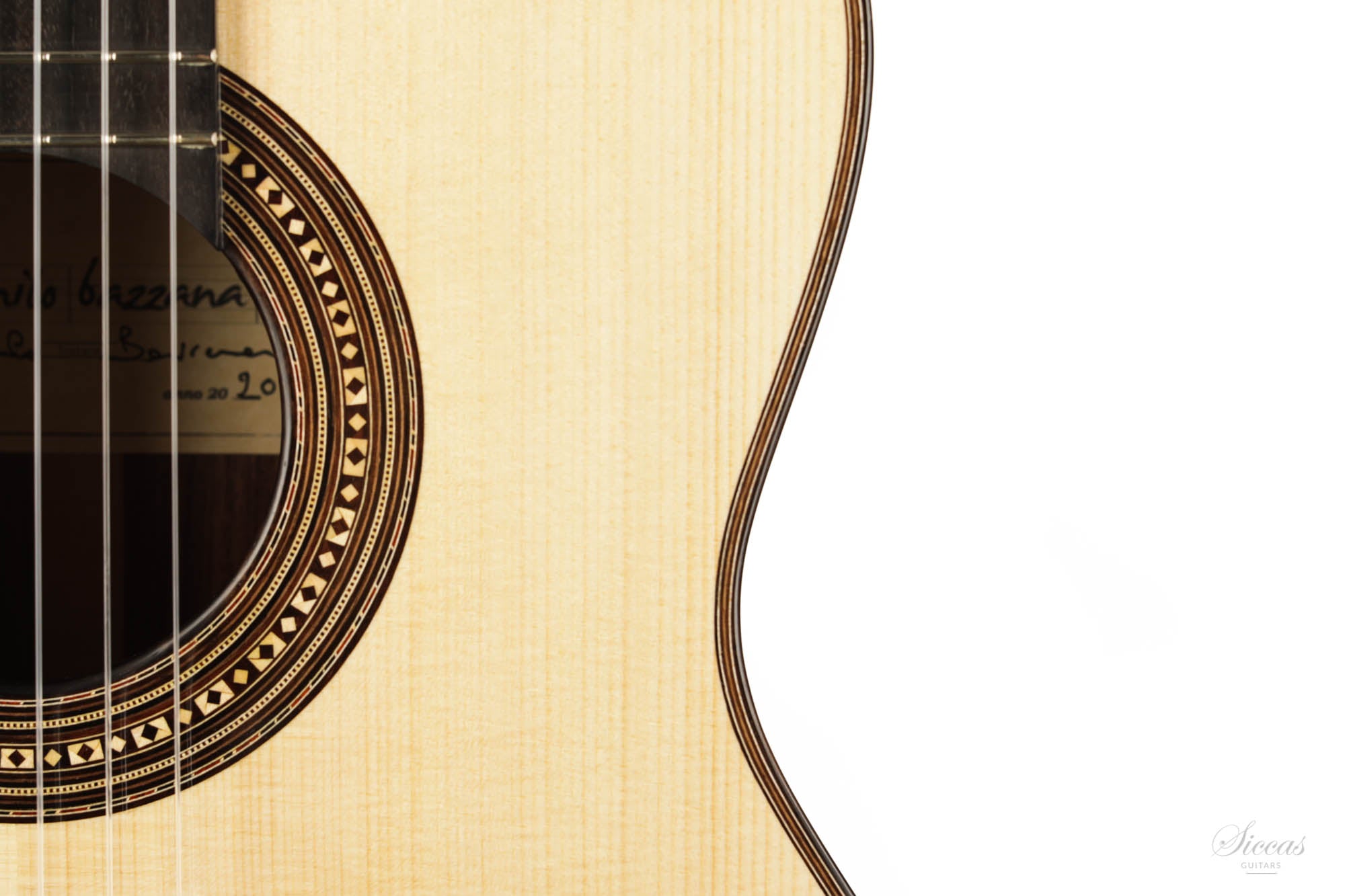 As usual with Bazzana's guitars the craftsmanship is excellent, this is a gorgeous looking and sounding instrument. It is built with a dazzling set of Santos rosewood for back and sides, and a beautiful flamed Spanish cedar neck. The playability is absolutely perfect and this instrument has also plenty of sustain, accurate balance between the voices and the ideal volume for a perfect concert guitar. Also, the crystalline sound character gives an added projection to its sound and great definition in the polyphony harmonies. All different kinds of repertoires can be approached and mastered with this splendid instrument.