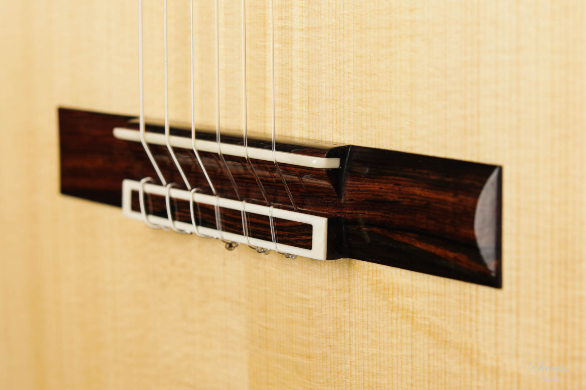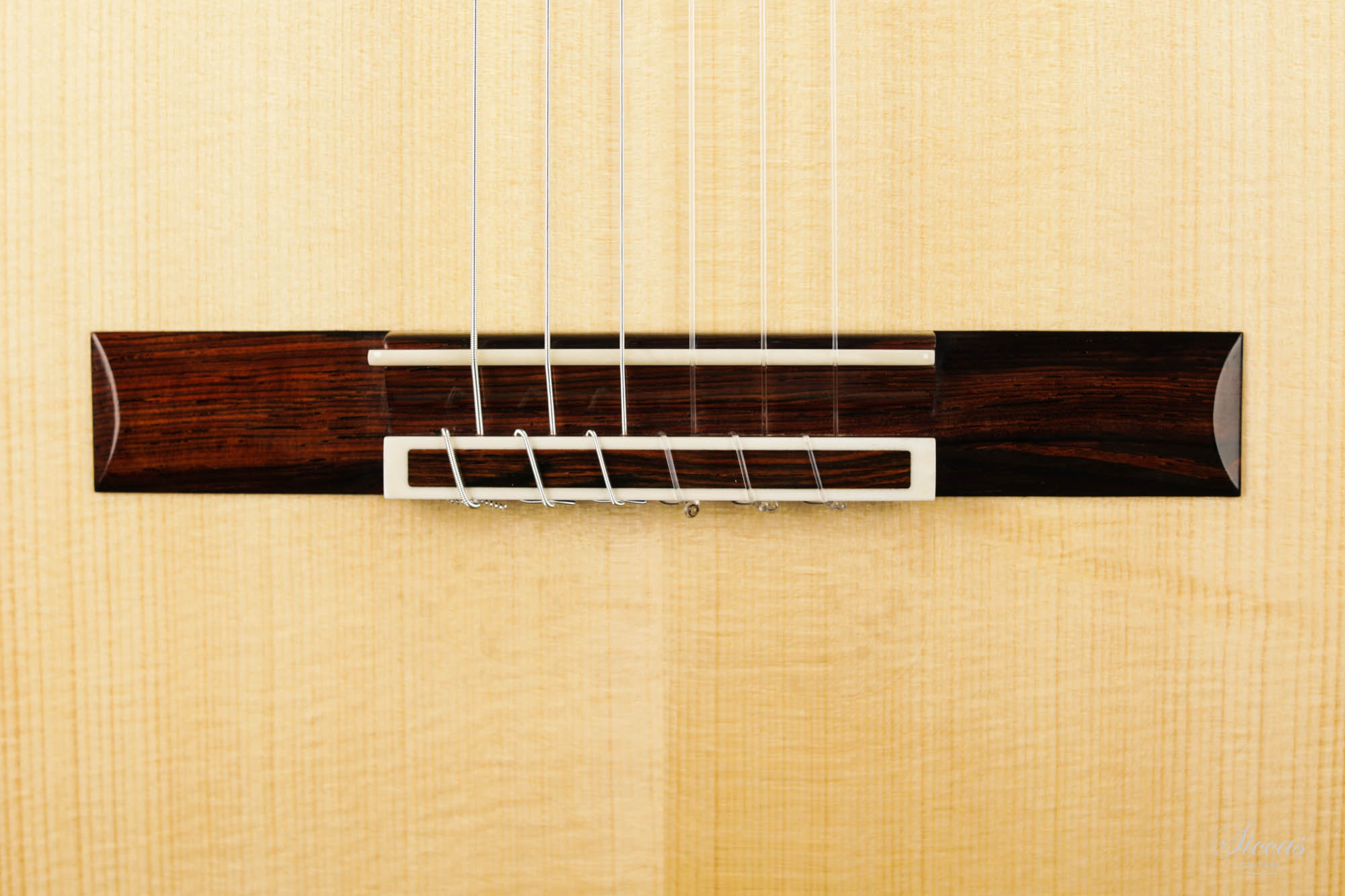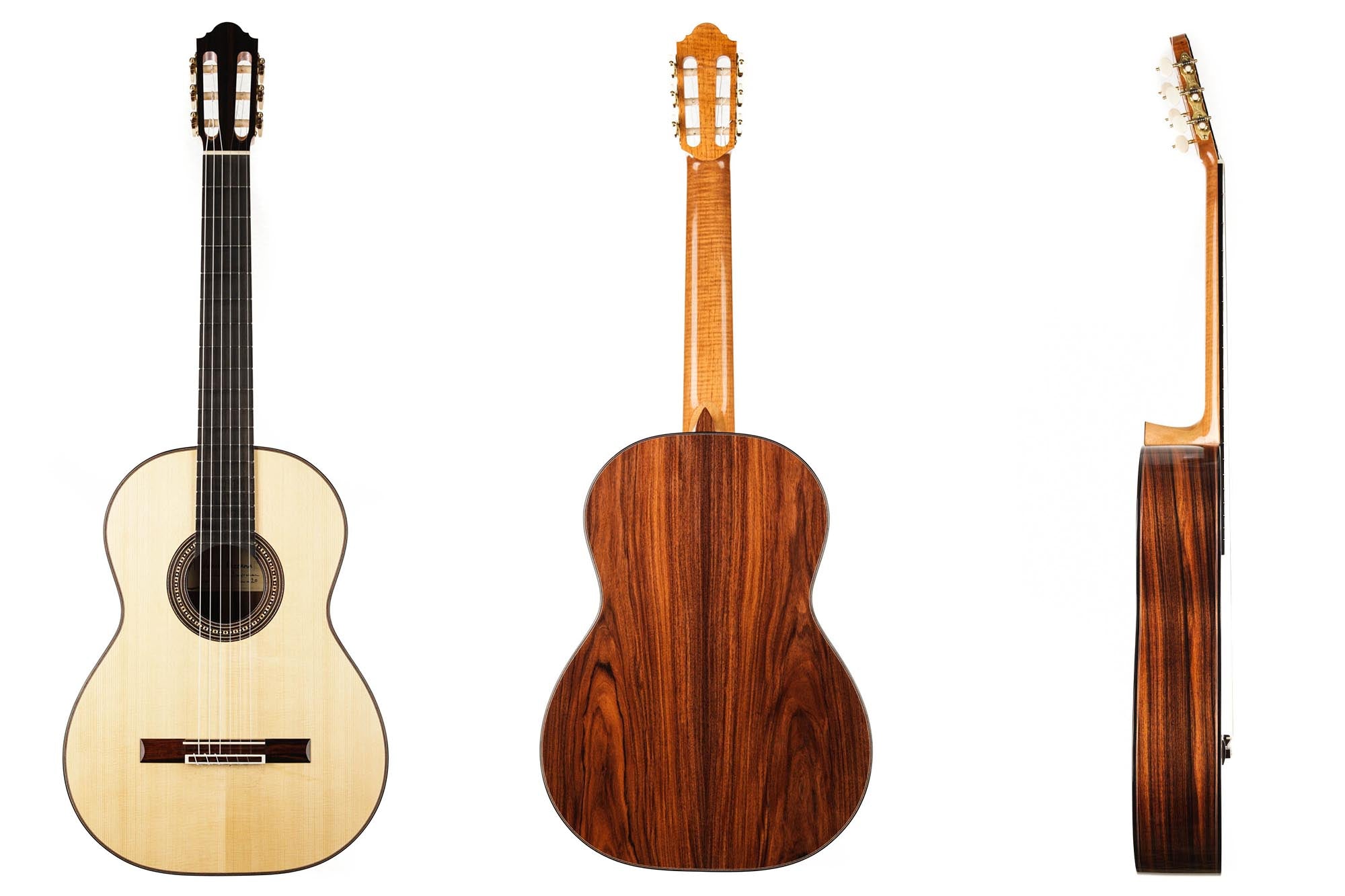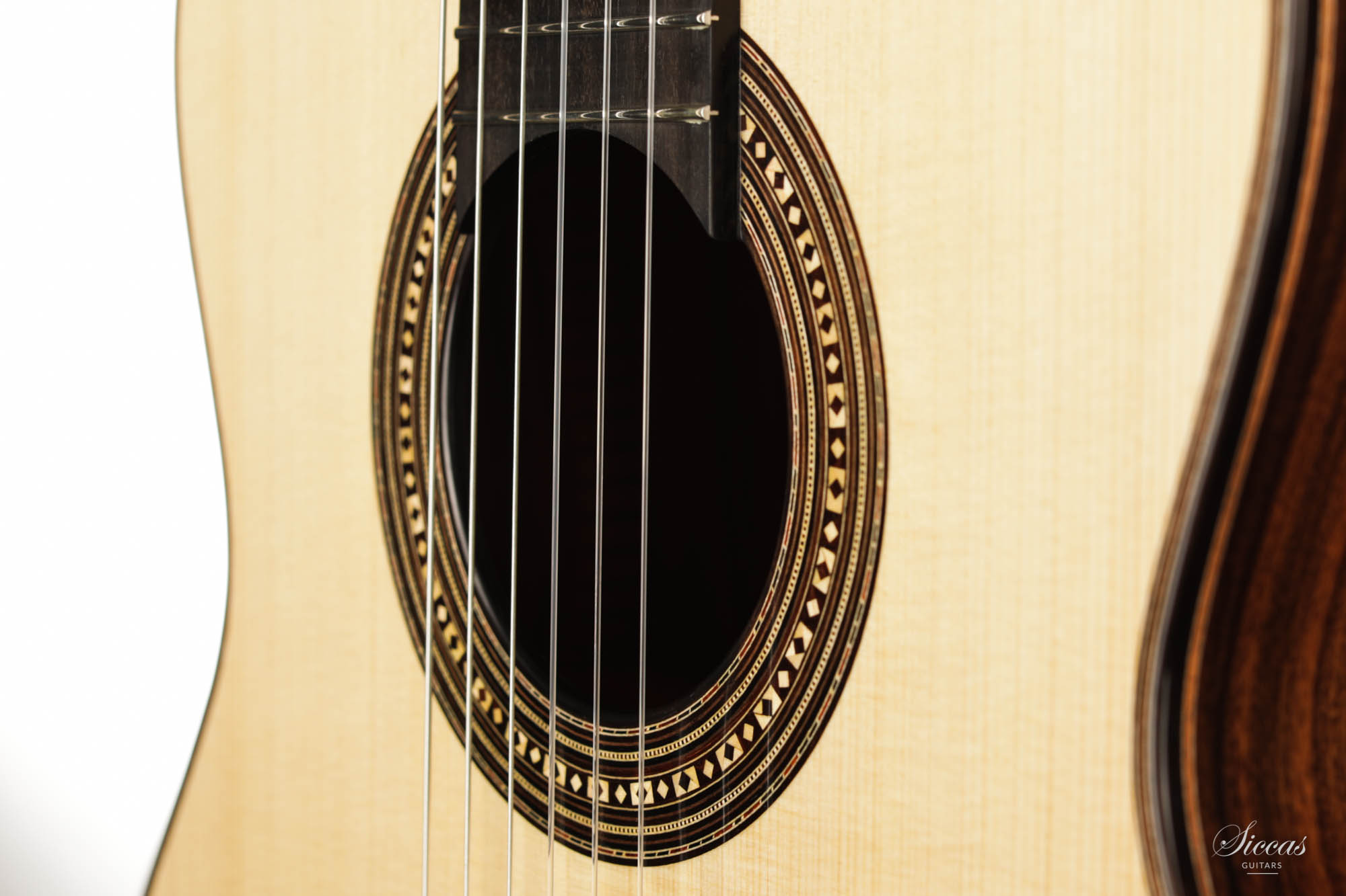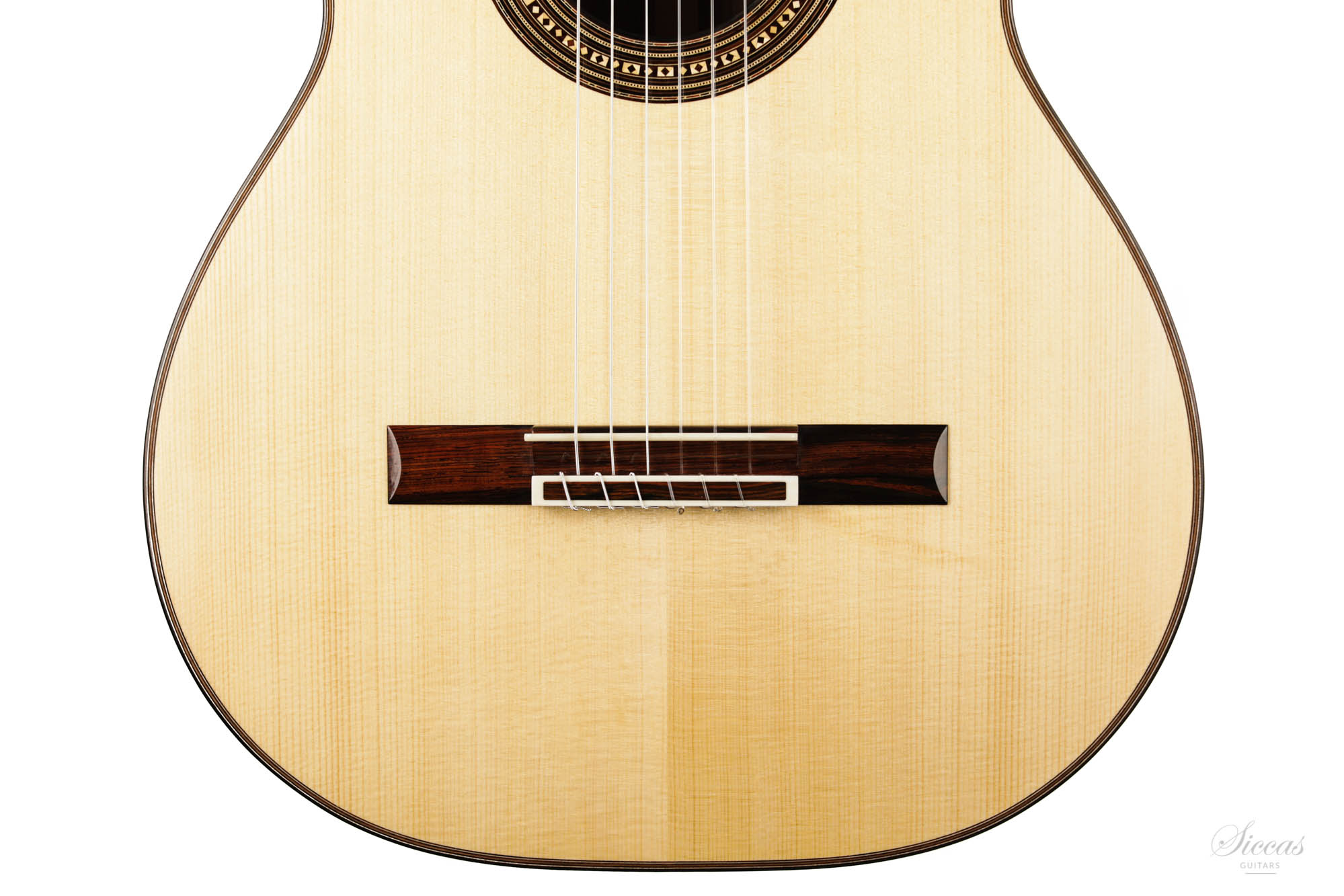 As usual with Bazzana's guitars the craftsmanship is excellent, this is a gorgeous looking and sounding instrument. It is built with a dazzling set of Santos rosewood for back and sides, and a beautiful flamed Spanish cedar neck. The playability is absolutely perfect and this instrument has also plenty of sustain, accurate balance between the voices and the ideal volume for a perfect concert guitar. Also, the crystalline sound character gives an added projection to its sound and great definition in the polyphony harmonies. All different kinds of repertoires can be approached and mastered with this splendid instrument.