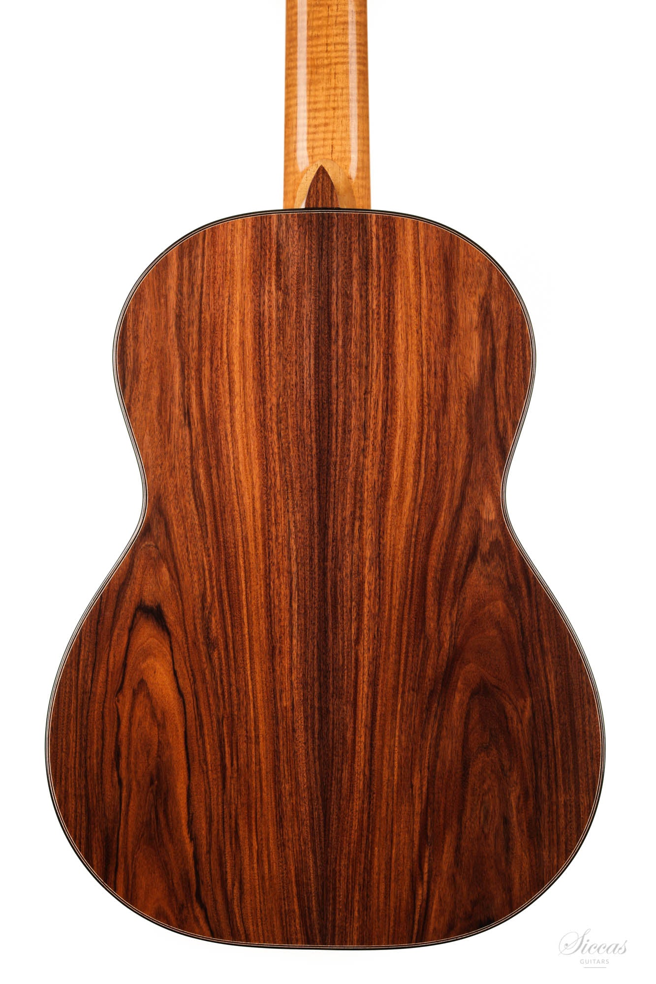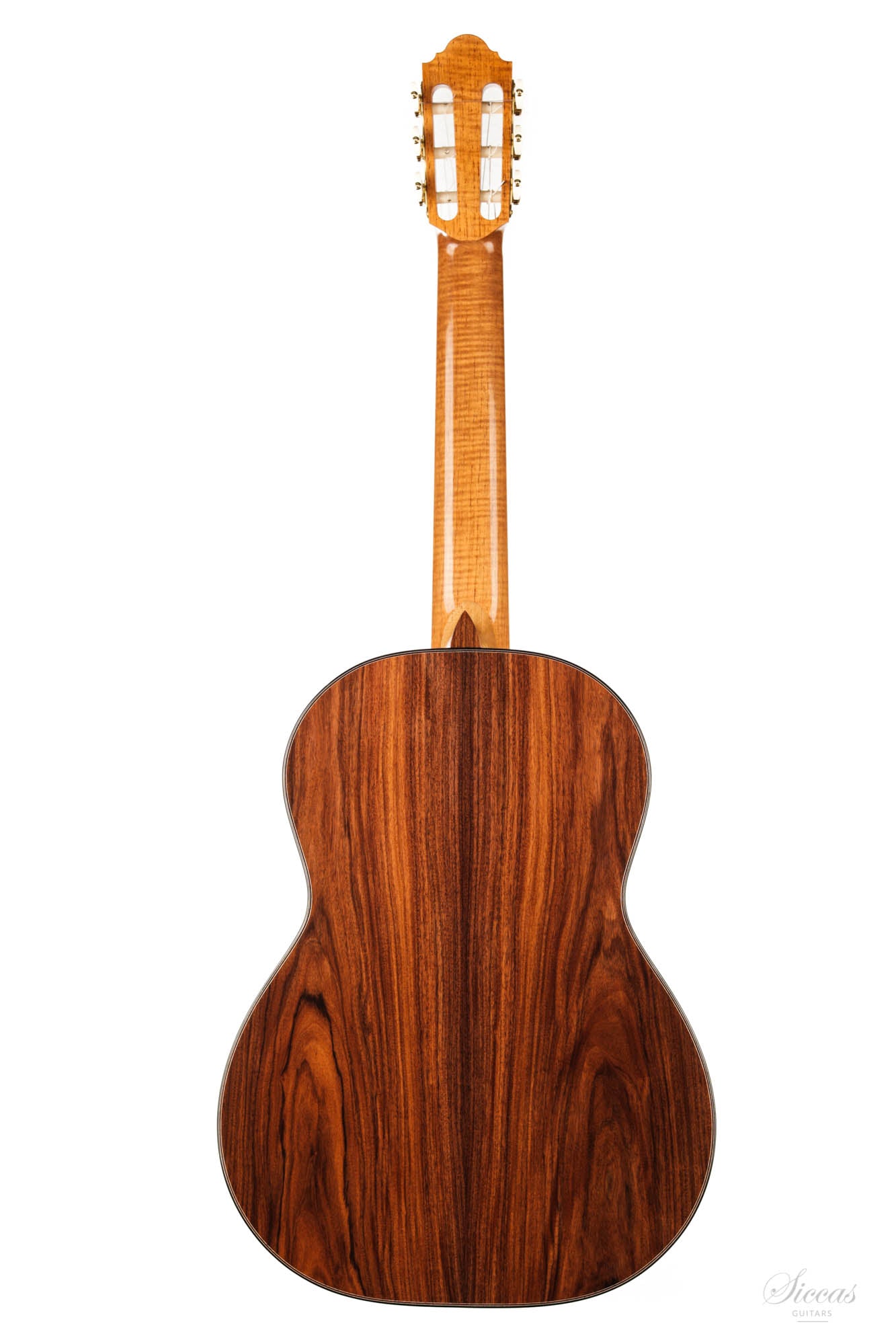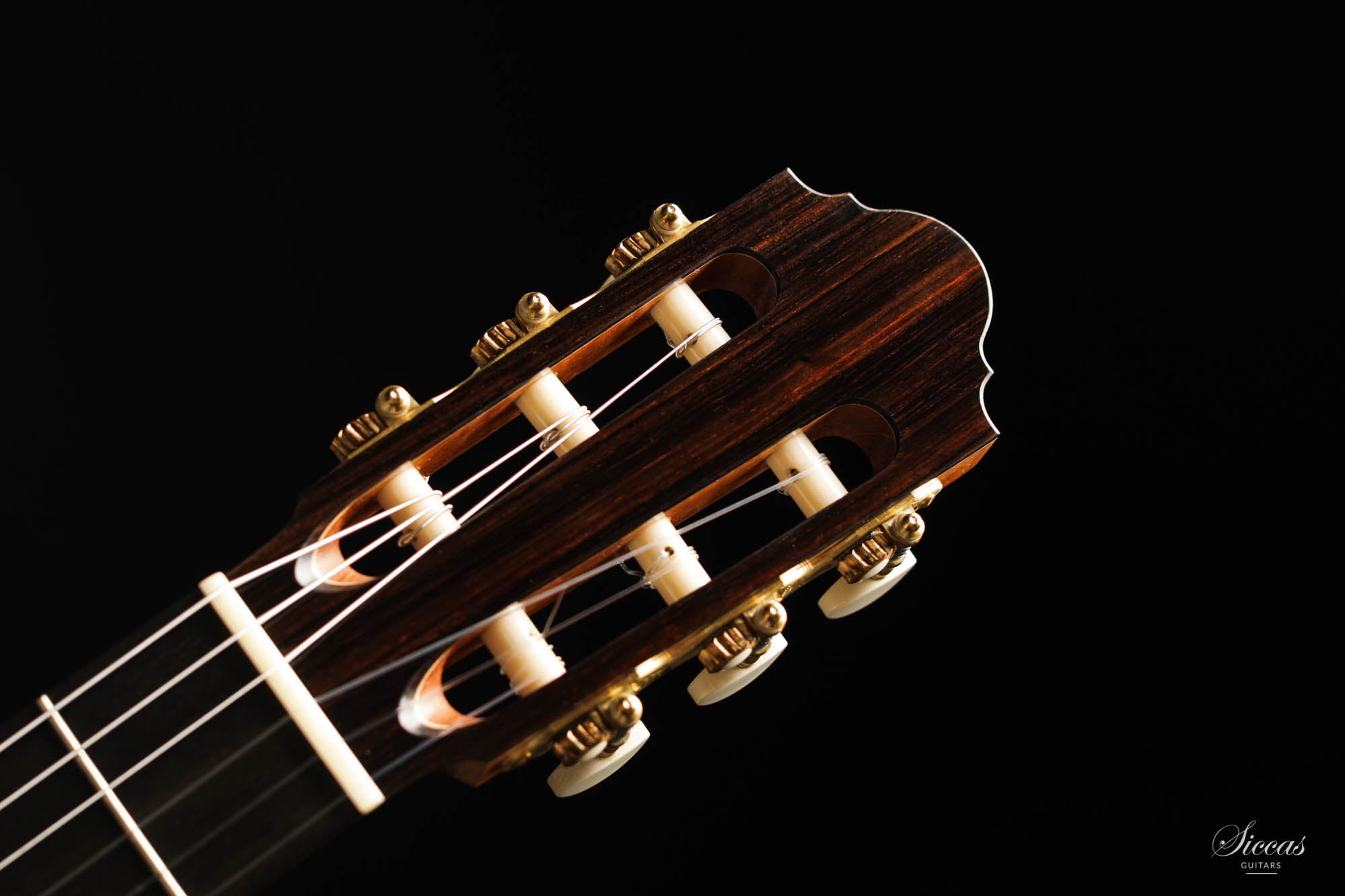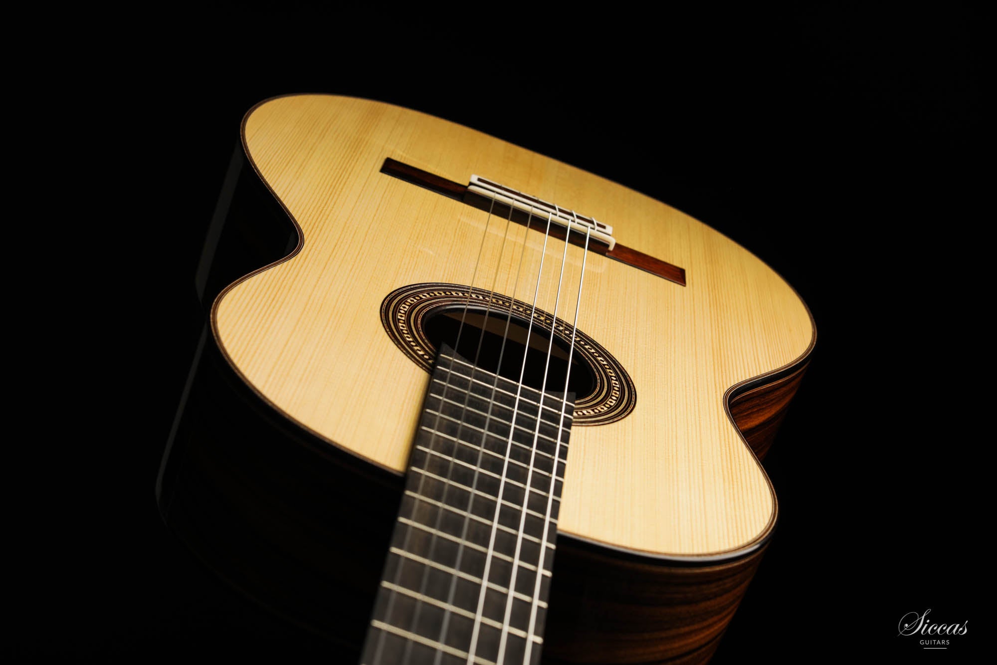 As usual with Bazzana's guitars the craftsmanship is excellent, this is a gorgeous looking and sounding instrument. It is built with a dazzling set of Santos rosewood for back and sides, and a beautiful flamed Spanish cedar neck. The playability is absolutely perfect and this instrument has also plenty of sustain, accurate balance between the voices and the ideal volume for a perfect concert guitar. Also, the crystalline sound character gives an added projection to its sound and great definition in the polyphony harmonies. All different kinds of repertoires can be approached and mastered with this splendid instrument.