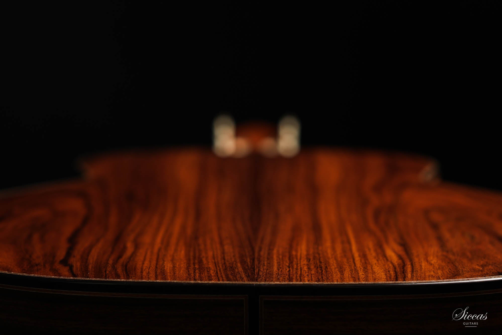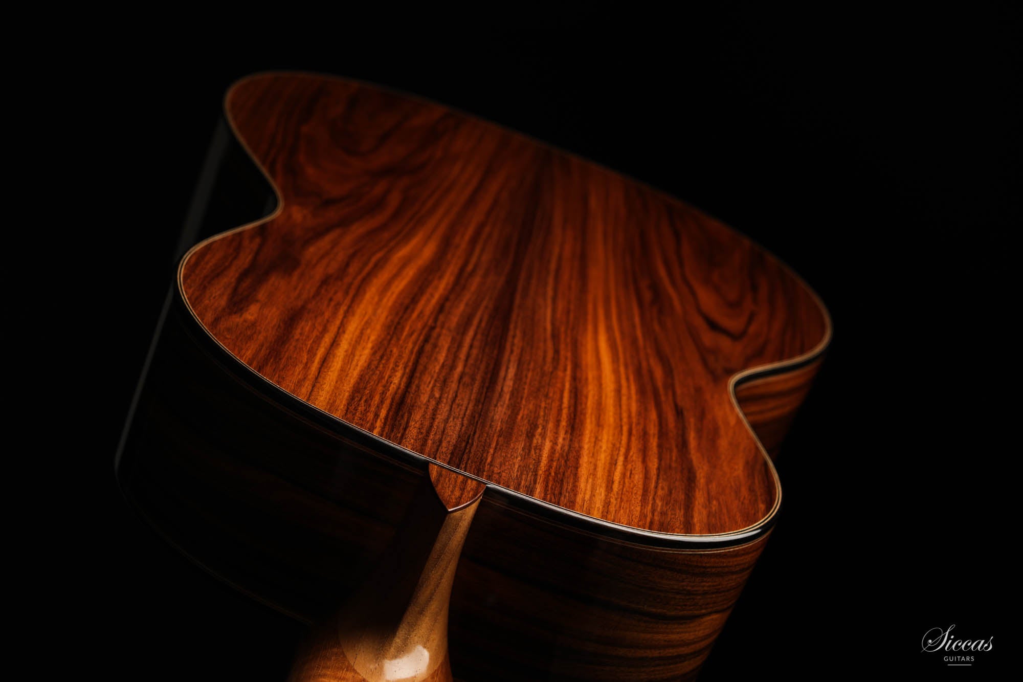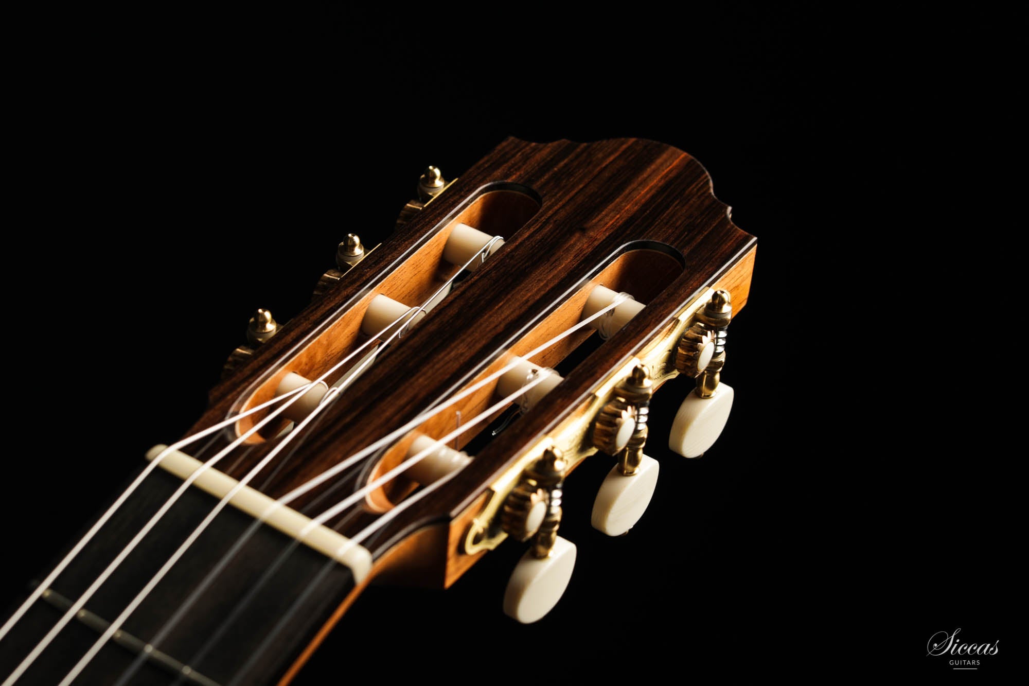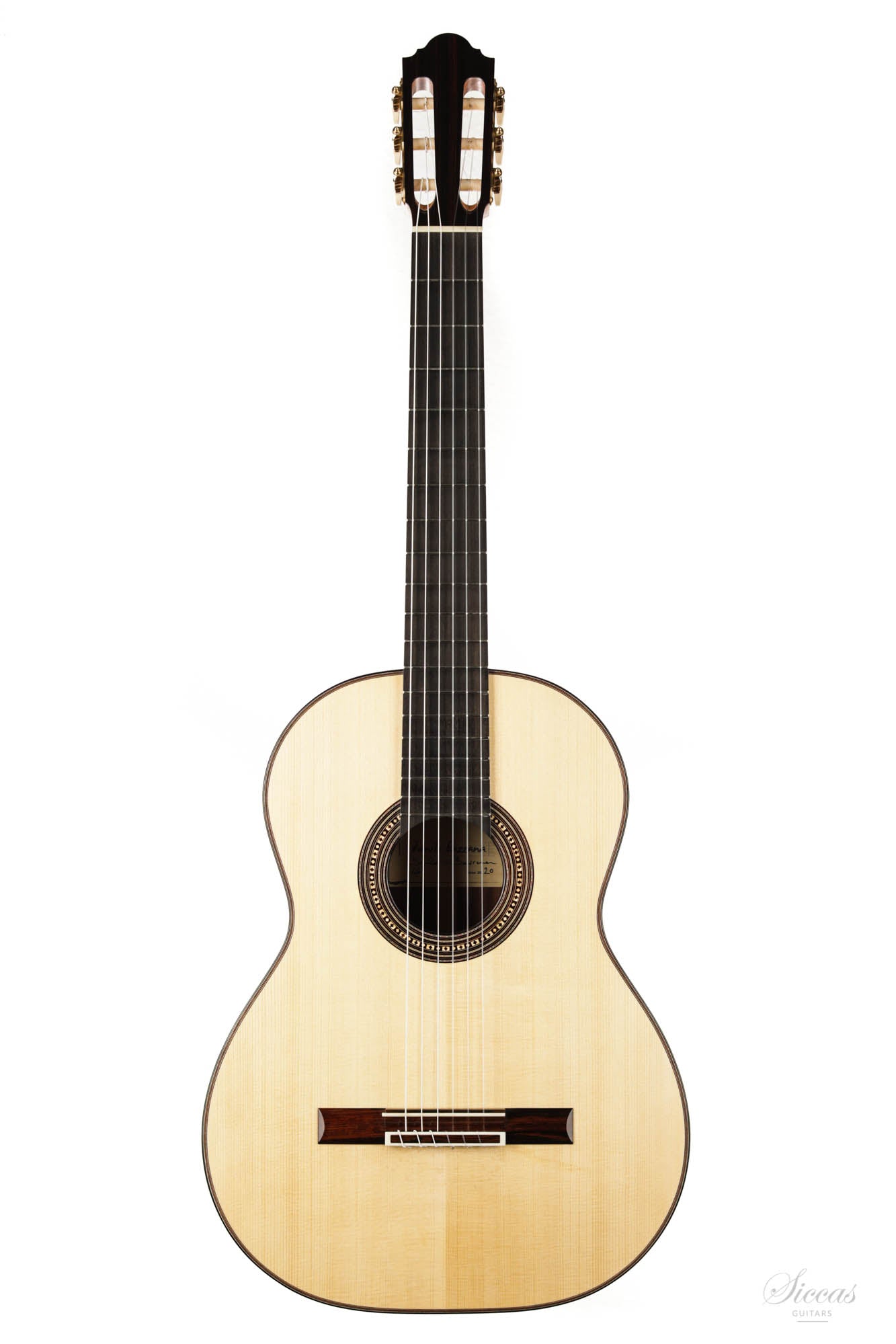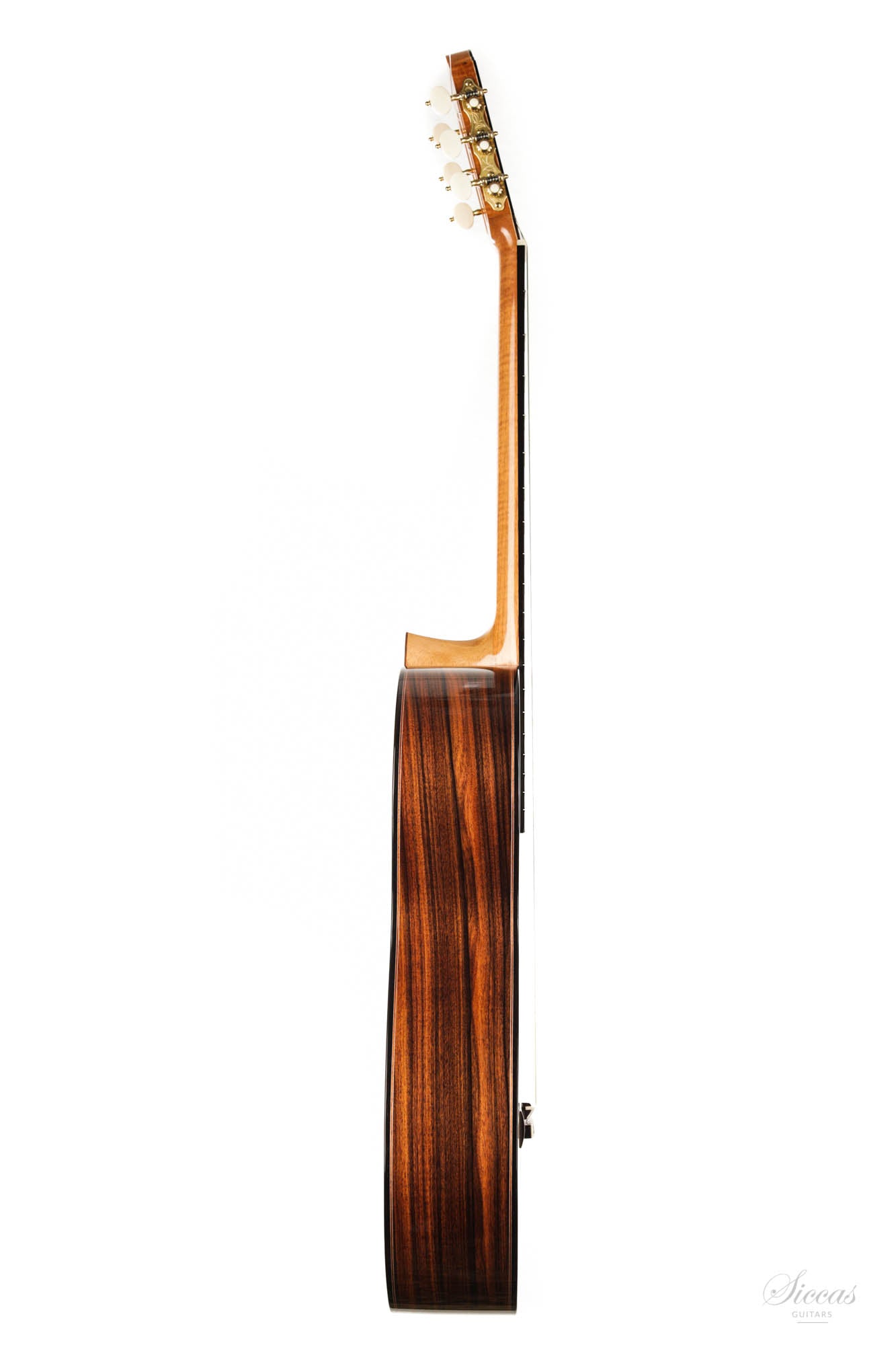 As usual with Bazzana's guitars the craftsmanship is excellent, this is a gorgeous looking and sounding instrument. It is built with a dazzling set of Santos rosewood for back and sides, and a beautiful flamed Spanish cedar neck. The playability is absolutely perfect and this instrument has also plenty of sustain, accurate balance between the voices and the ideal volume for a perfect concert guitar. Also, the crystalline sound character gives an added projection to its sound and great definition in the polyphony harmonies. All different kinds of repertoires can be approached and mastered with this splendid instrument.