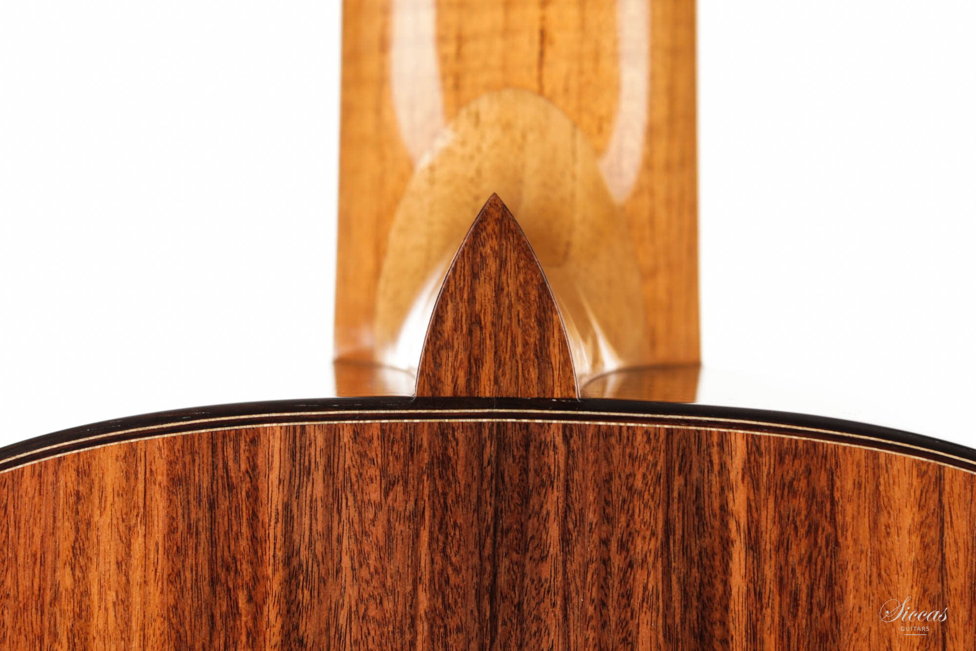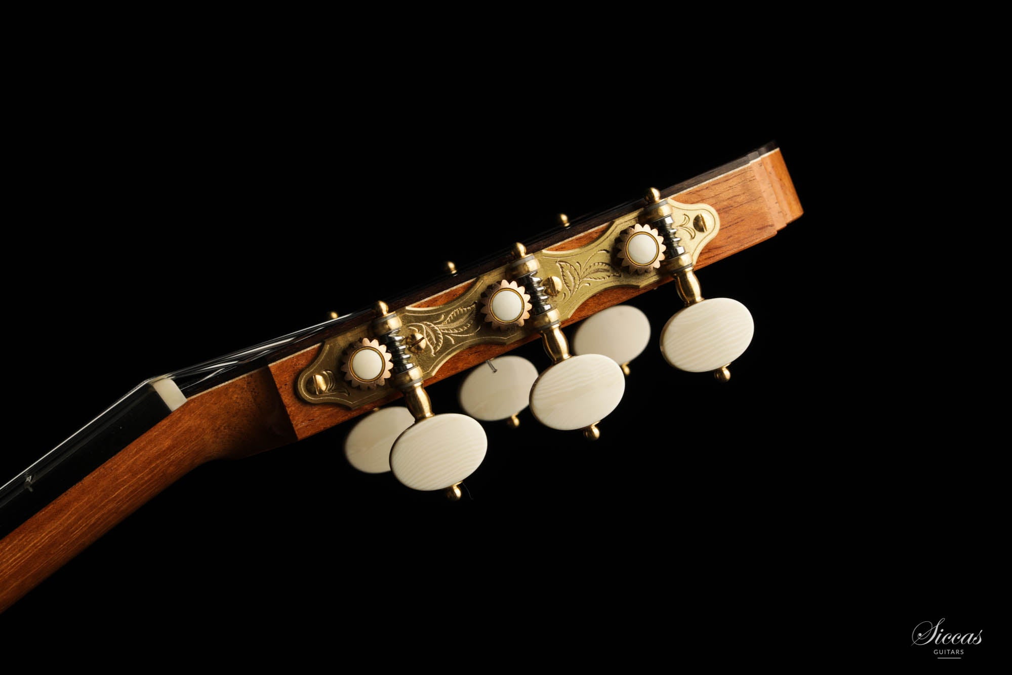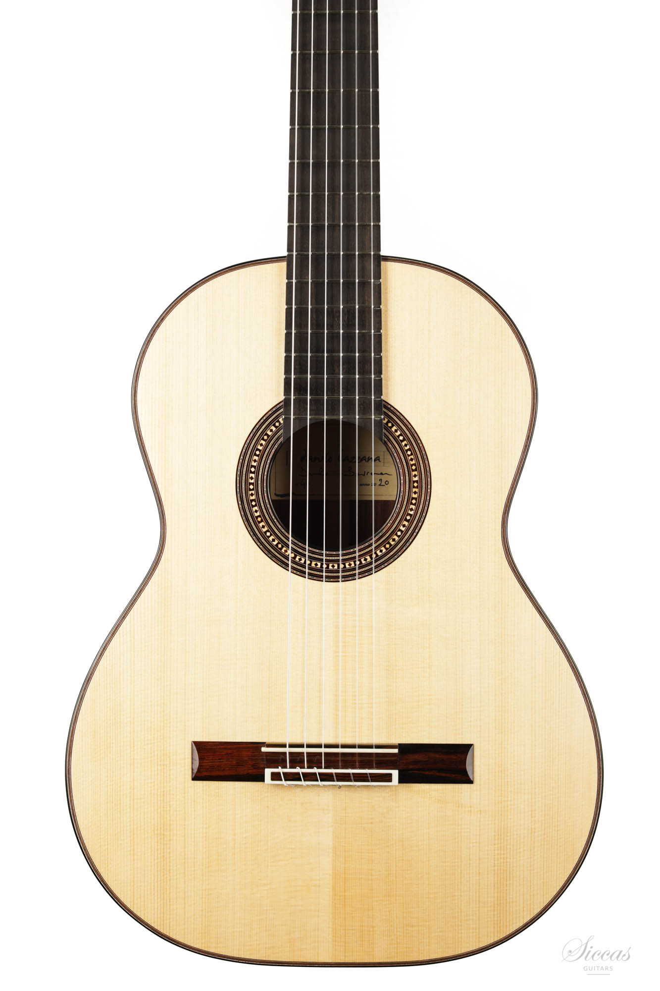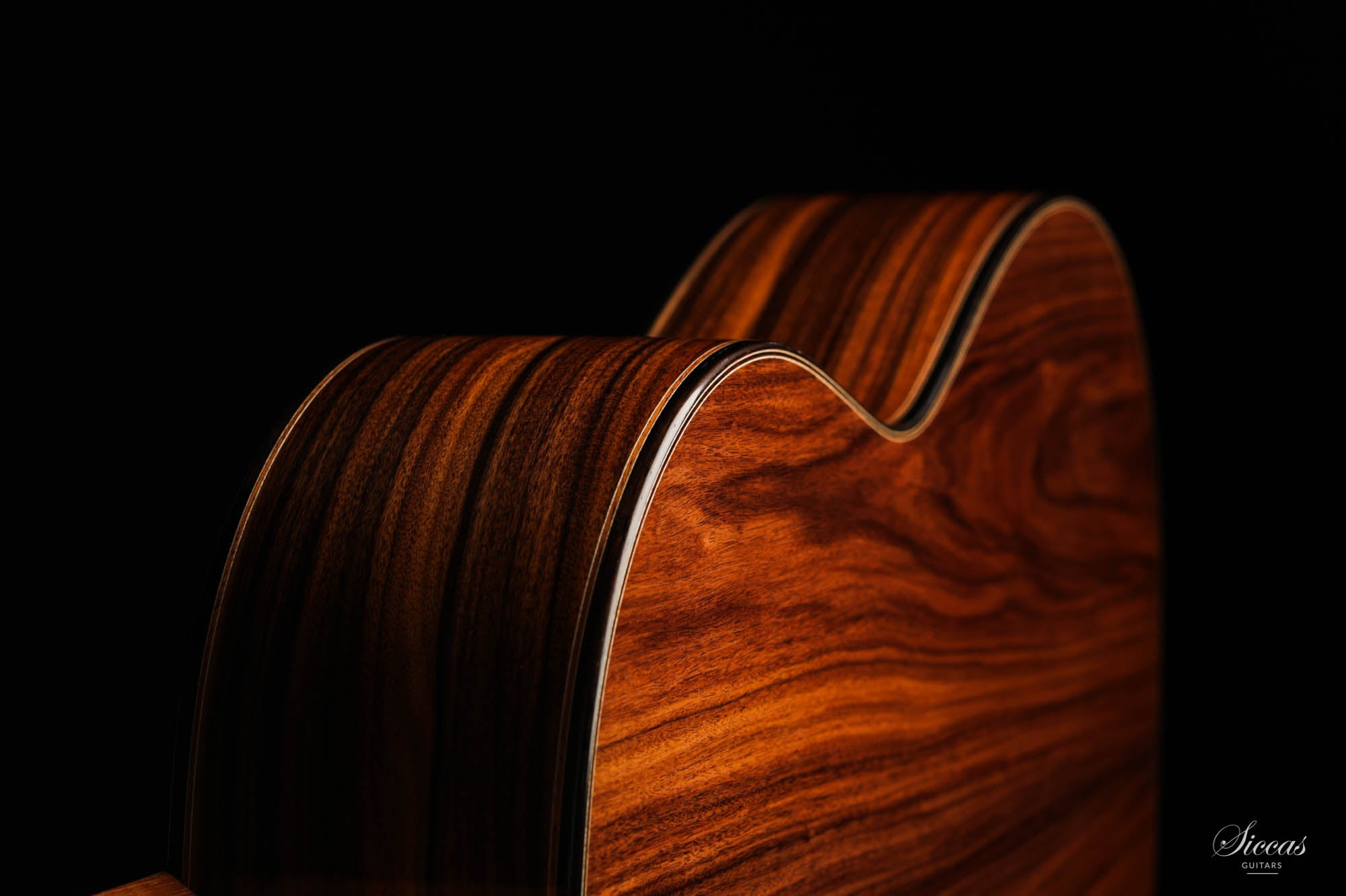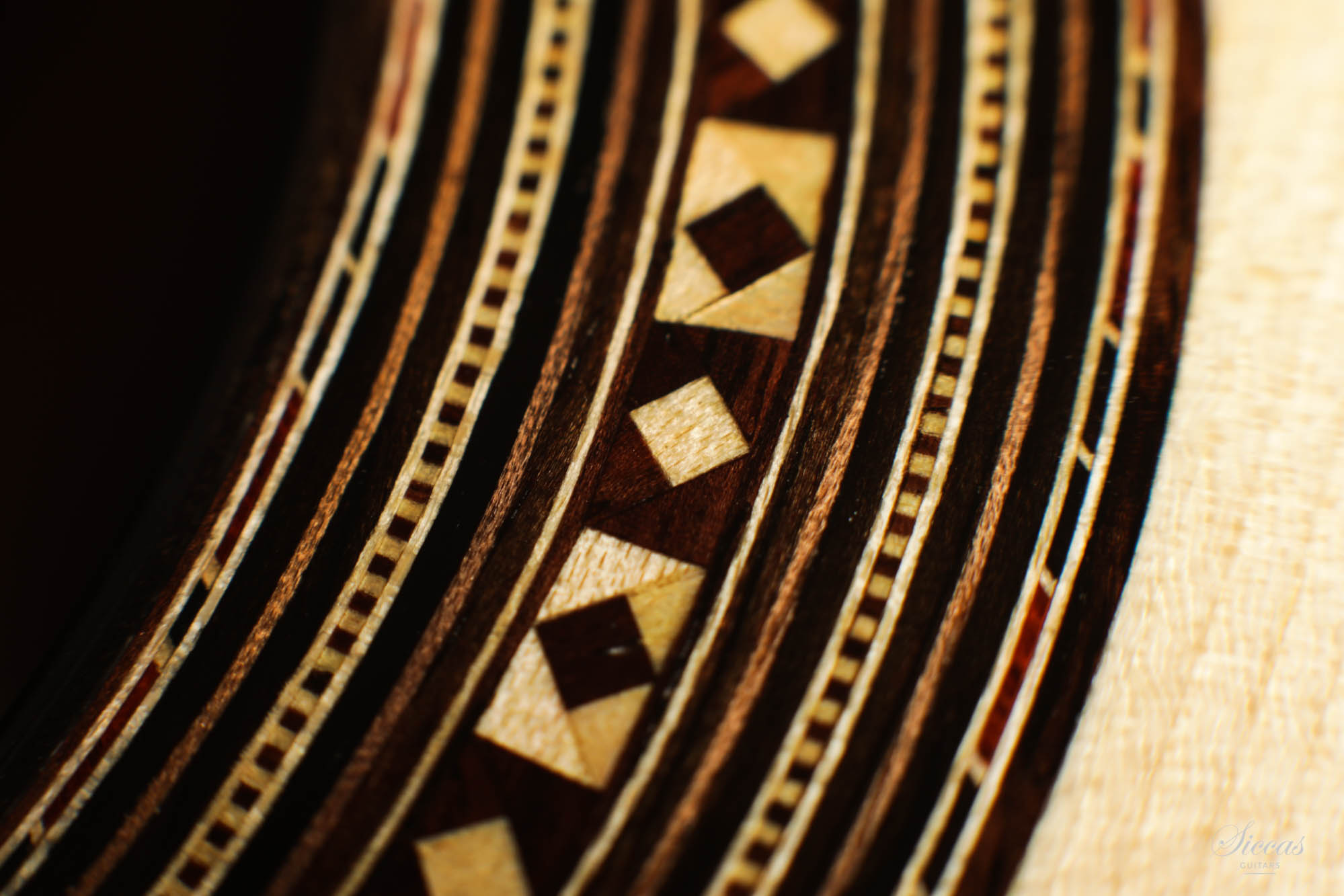 As usual with Bazzana's guitars the craftsmanship is excellent, this is a gorgeous looking and sounding instrument. It is built with a dazzling set of Santos rosewood for back and sides, and a beautiful flamed Spanish cedar neck. The playability is absolutely perfect and this instrument has also plenty of sustain, accurate balance between the voices and the ideal volume for a perfect concert guitar. Also, the crystalline sound character gives an added projection to its sound and great definition in the polyphony harmonies. All different kinds of repertoires can be approached and mastered with this splendid instrument.