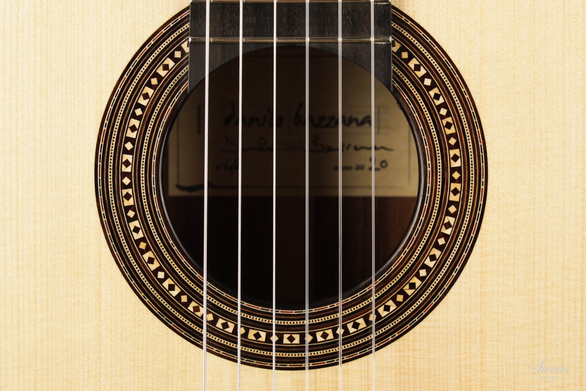His guitar is elastic and touch-sensitive, and also tonally rich in nuances. Danilo pays close attention to the creation of the fingerboard, obtaining the right degree of comfort and playability. Bazzana is very fascinated by the intimate aspect of guitar playing, where the guitarist is in direct contact with the string unlike the piano or the violin were a bow or a key interferes somehow. The construction is purely traditional, so he pays close attention to the choice of materials for every single component of the instrument which "must vibrate in its entirety".