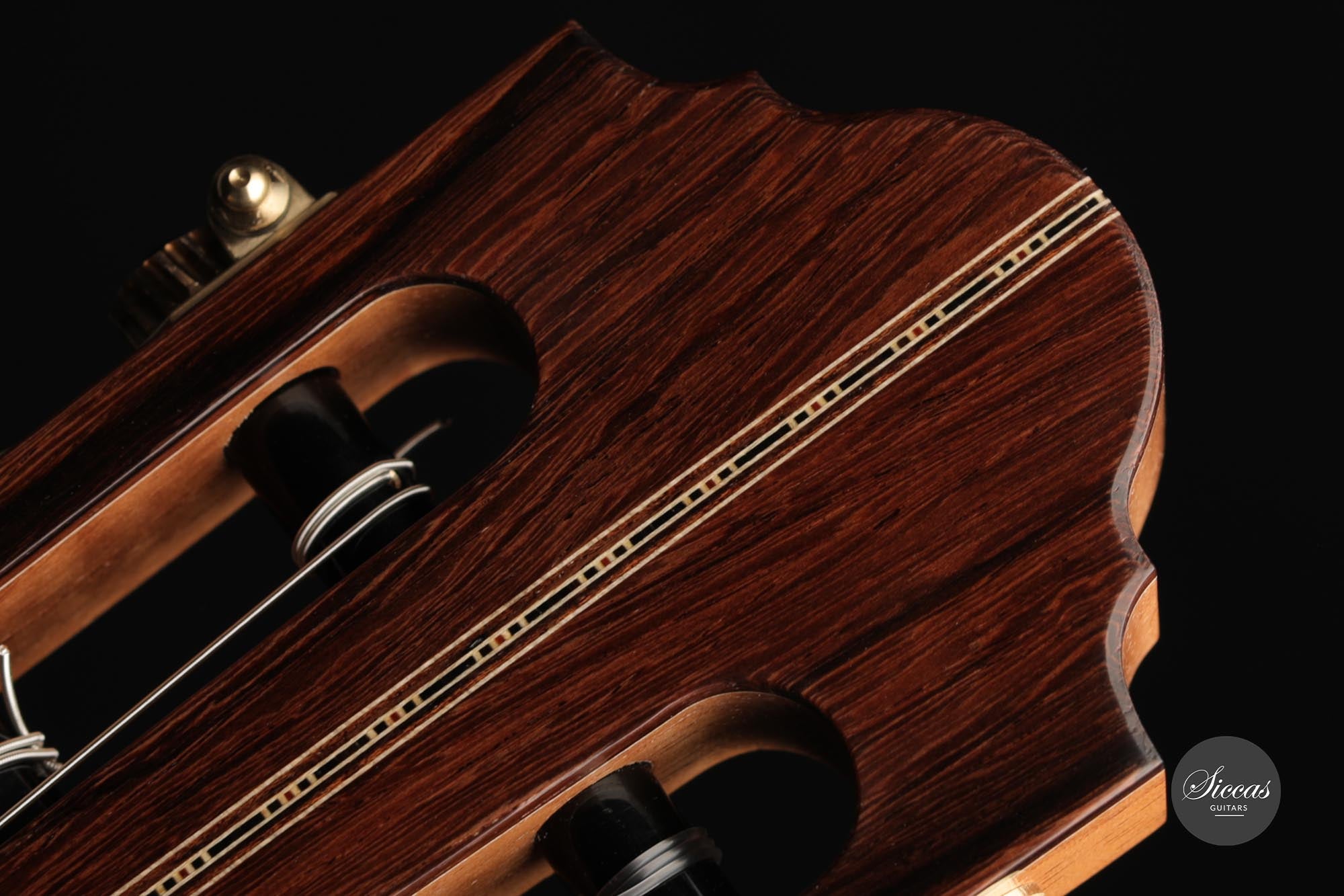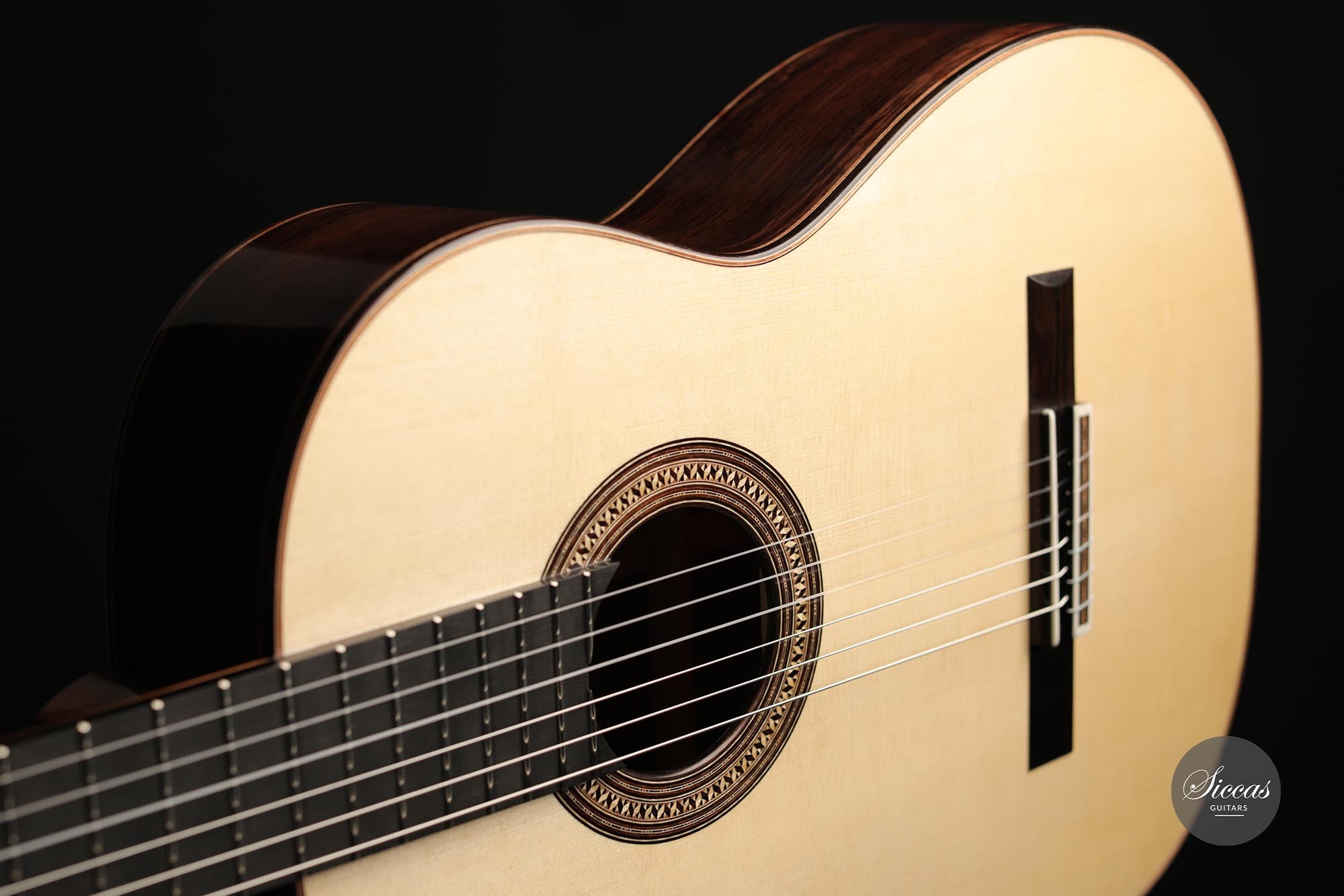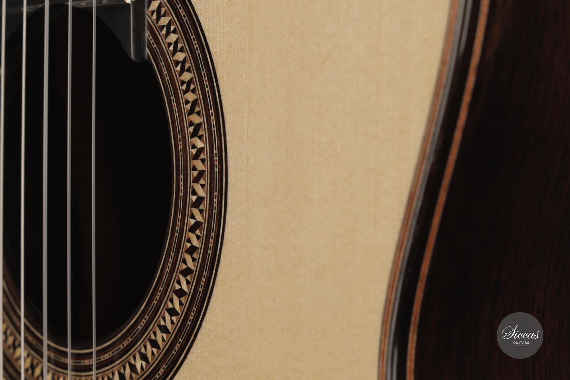 This guitar is a very special instrument and a true masterpiece. It is the model designed by Danilo Bazzana for the important meeting of Italian guitar makers, Roma Guitar Expo 2020. The inlays are both exquisitely crafted and richly detailed, the gorgeous Madagascar rosewood for the back and sides shows extraordinary purple reflections, and the flamed mahogany neck is just gorgeous. One gets caught up in both the wonderful beauty of the woods used and the immense charm of the sound. The first string sings almost beguilingly with a marvelous sustain. The balance and clarity of the sound are in ideal harmony, giving the guitarist a lot of freedom and possibilities. This very special model is an extremely accomplished instrument and will appeal to many guitarists looking for a master grade guitar.