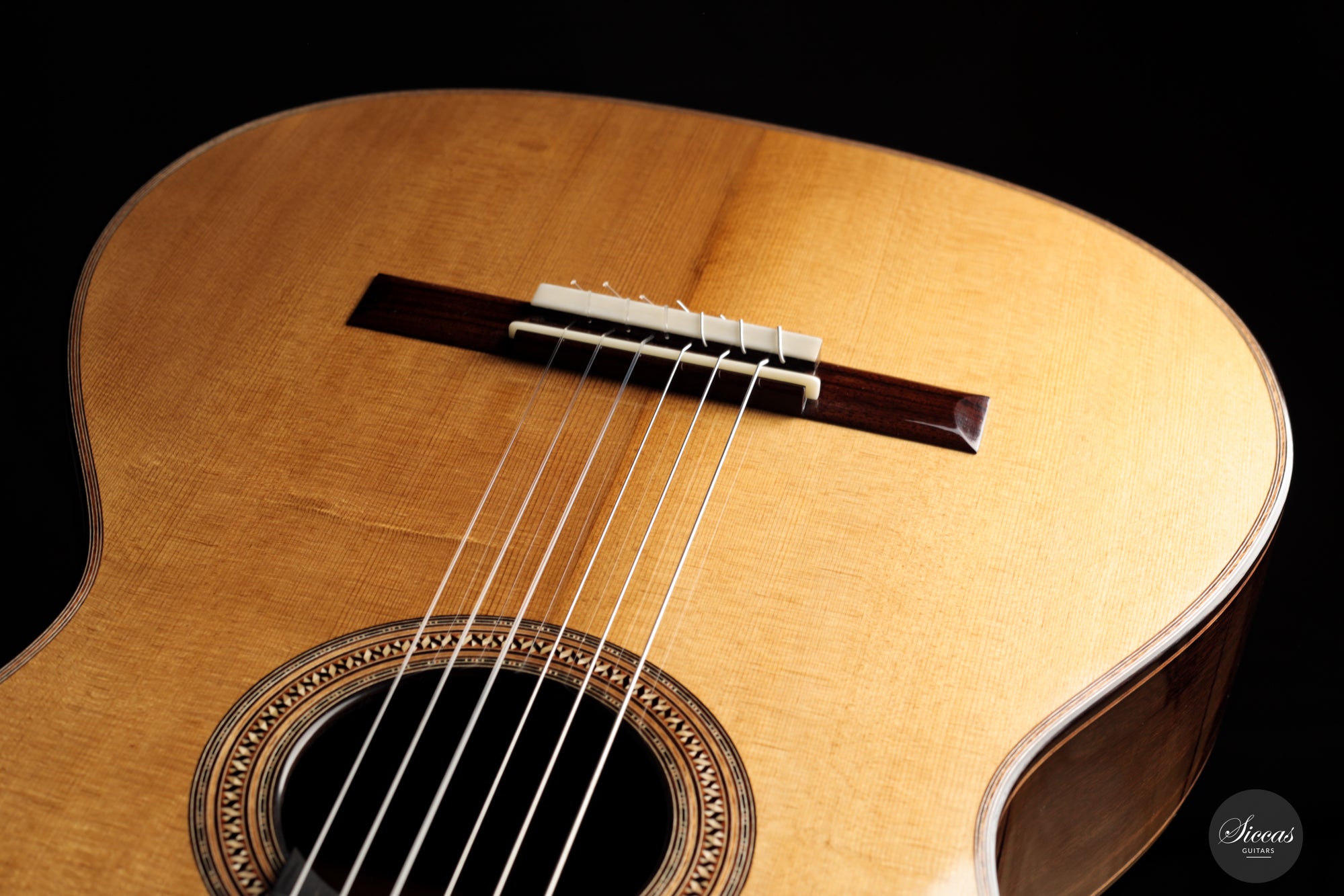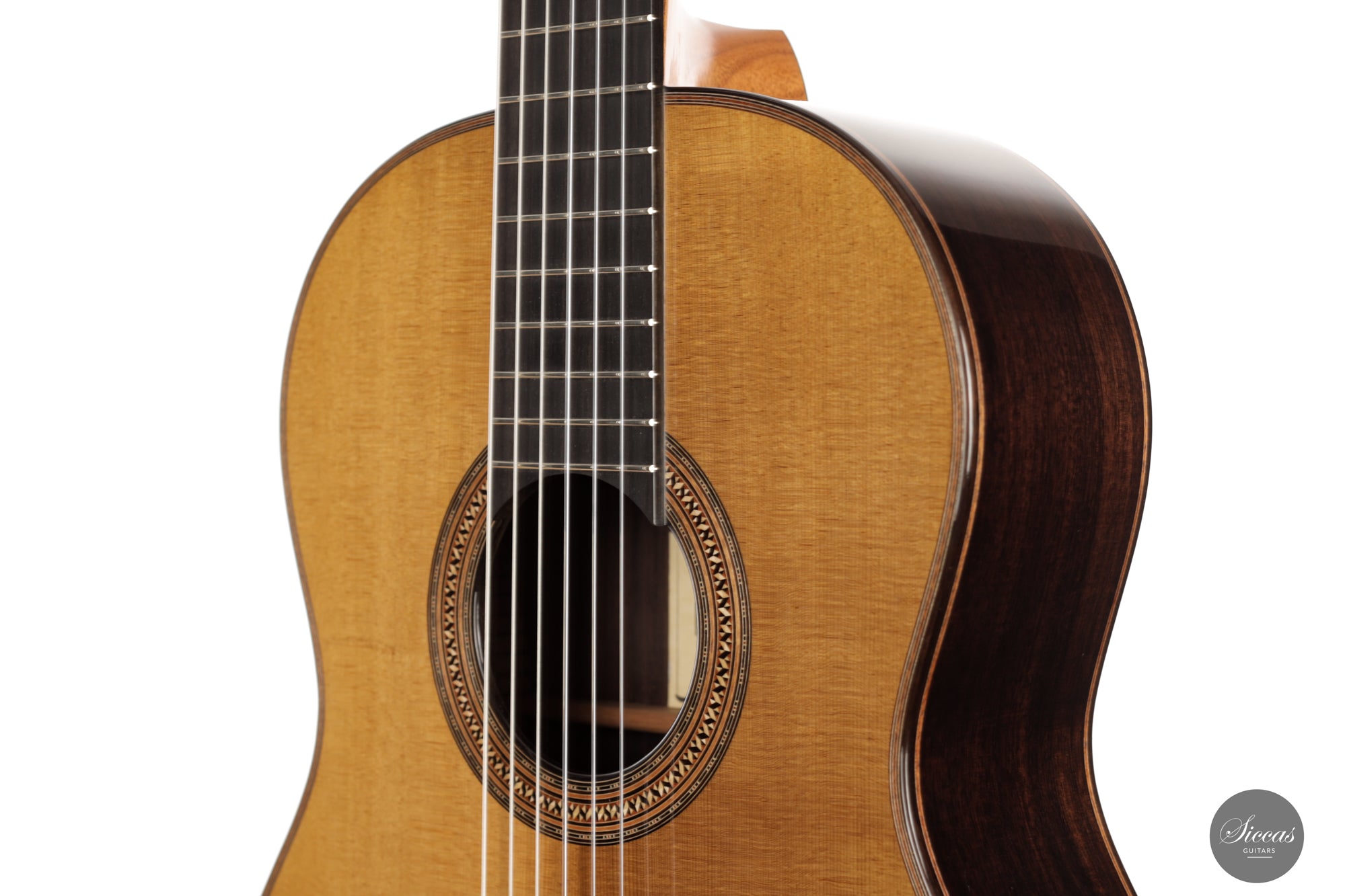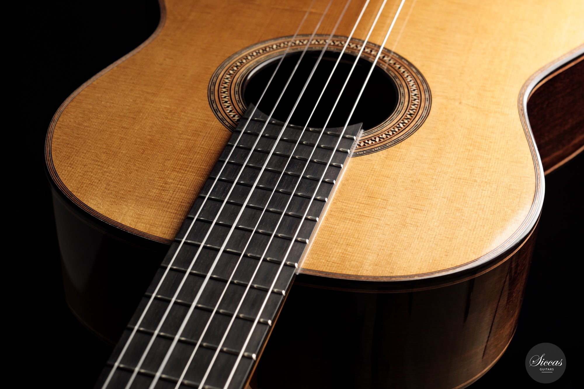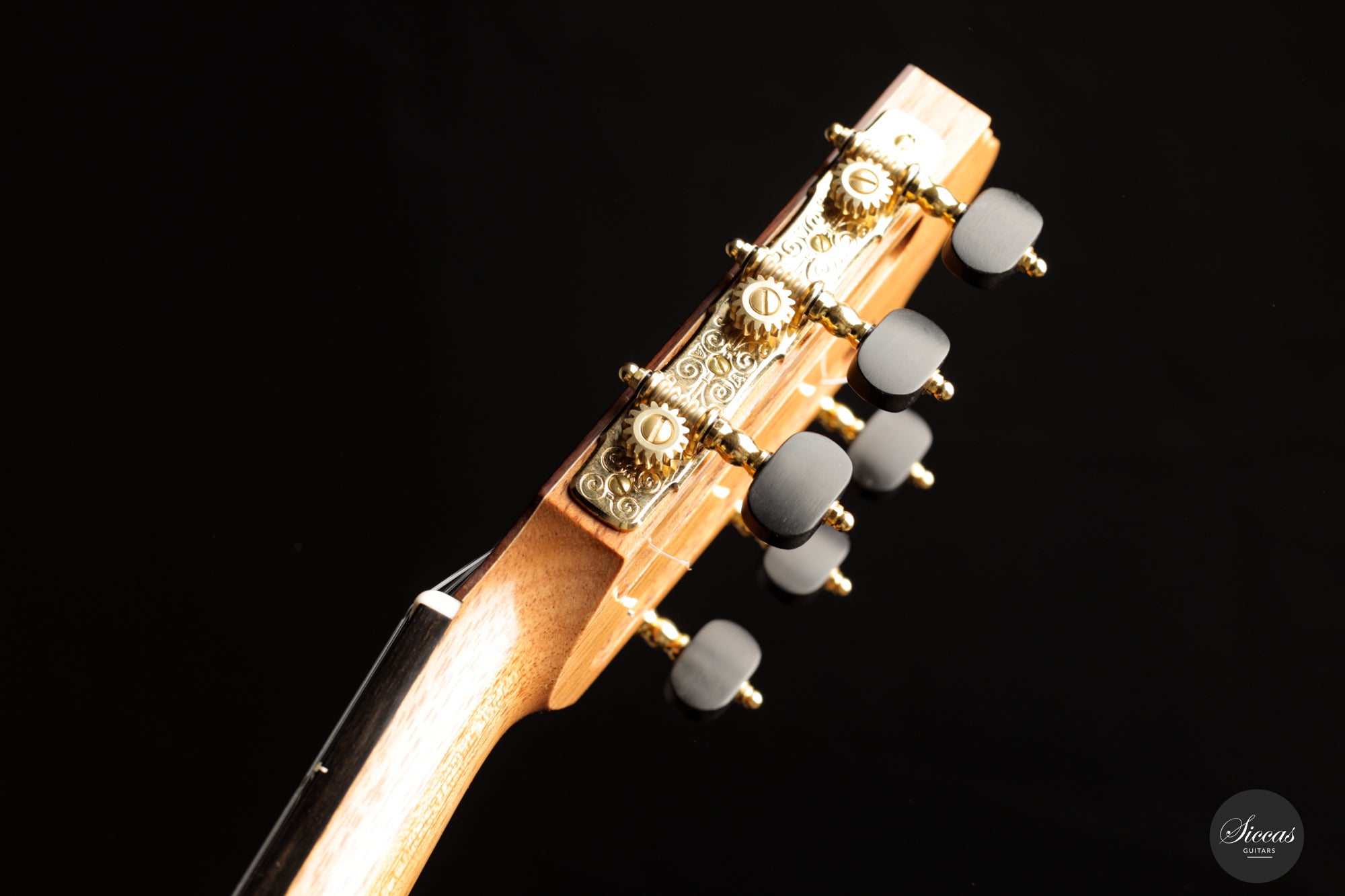 In Reflexion seiner unerschütterlichen Verpflichtung zur Qualität verkörpert dieses spezielle Stück Bazzanas charakteristische Handwerkskunst. Mit einer Fichtendecke, die eloquent mit klassischem indischem Rosenholz für den Boden und die Zargen gepaart ist, sind seine Ästhetik genauso überzeugend wie sein Klang. Seine Abstammung ist unverkennbar von der verehrten französischen Schule des Gitarrenbaus beeinflusst und hallt die Meisterschaft wider, die in den Kreationen von Größen wie Robert Bouchet und Daniel Friederich zu finden ist.