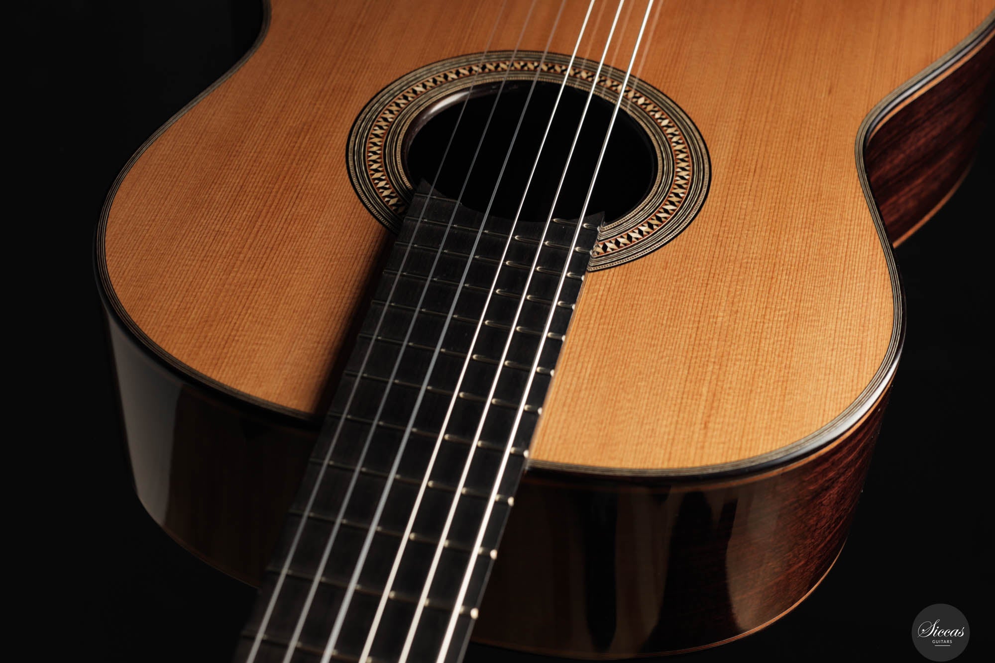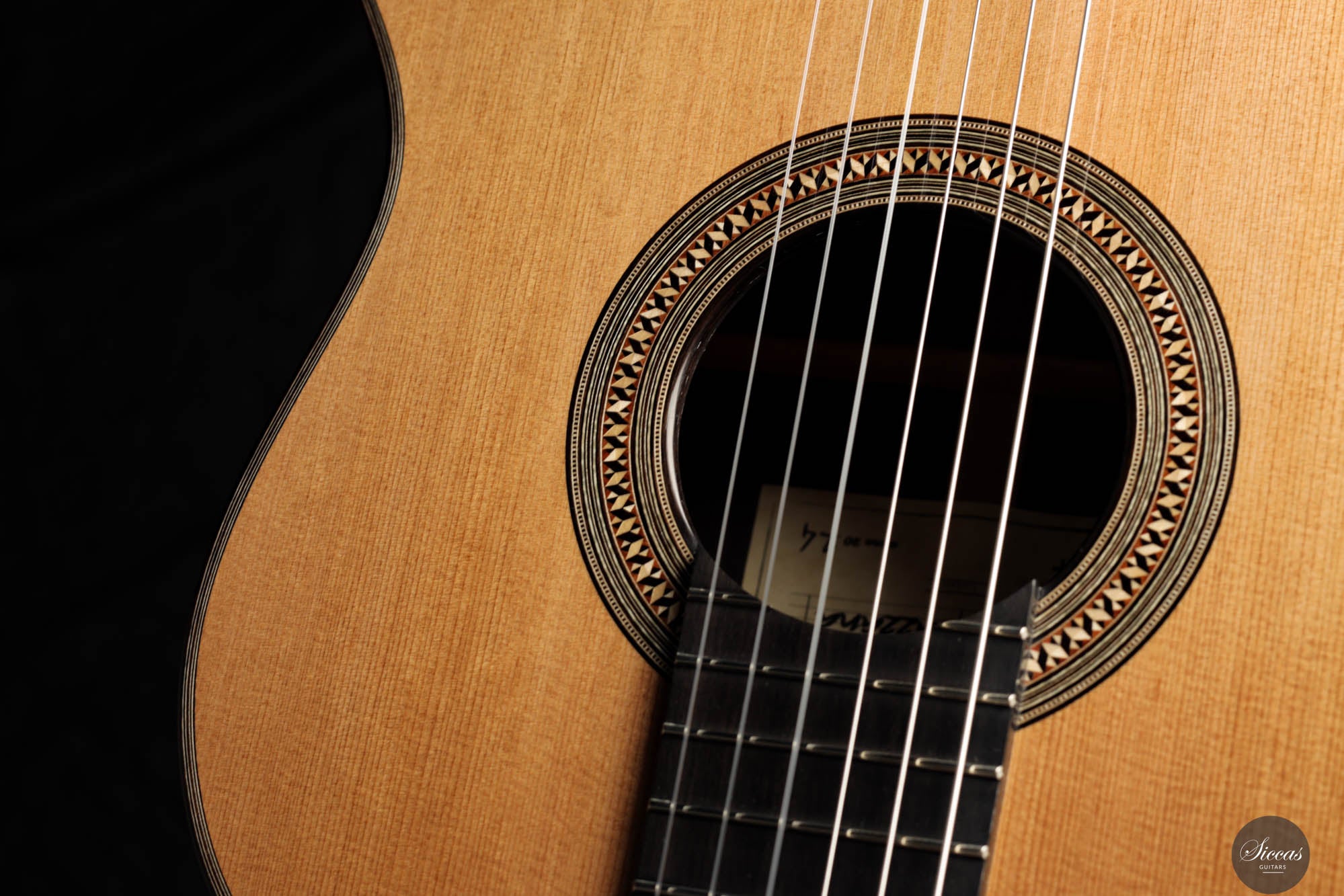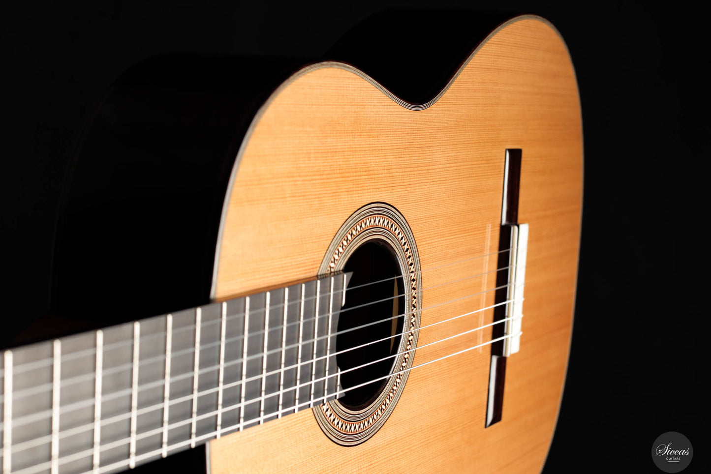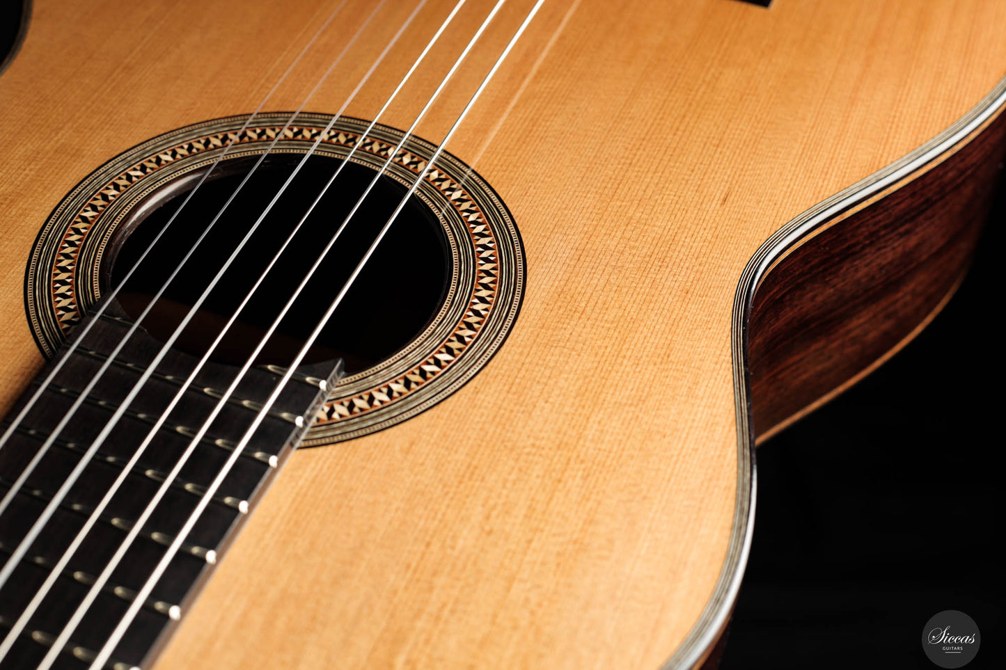 Tief in der Tradition verwurzelt, vertritt Danilo die Philosophie, dass jede Komponente einer Gitarre „in ihrer Gesamtheit schwingen muss.“ Diese Überzeugung prägt seine akribische Materialauswahl, um eine perfekte klangliche Harmonie zu erzielen. Diese Hingabe zeigt sich in einer bemerkenswerten Gitarre mit einer Fichtendecke und Boden sowie Zargen aus indischem Palisander, die eine beeindruckende Ästhetik mit außergewöhnlichem Klang vereint. Beeinflusst von der angesehenen französischen Schule des Gitarrenbaus spiegelt sie das Erbe von Meistern wie Robert Bouchet und Daniel Friederich wider. Das Instrument zeichnet sich durch hervorragende Bespielbarkeit aus, mit lang anhaltenden Tönen, die mühelos fließen, einer ausgewogenen Harmonie und einem konzerttauglichen Klangvolumen. Der Ton ist kristallklar und vielschichtig, mit hervorragender Projektion und ausgeprägter Klarheit, was die Gitarre zu einem vielseitigen Instrument für sowohl polyphone als auch melodische Stücke macht. Besonders hervorzuheben ist das sorgfältig gestaltete Griffbrett, das optimalen Komfort und beste Spielbarkeit gewährleistet.