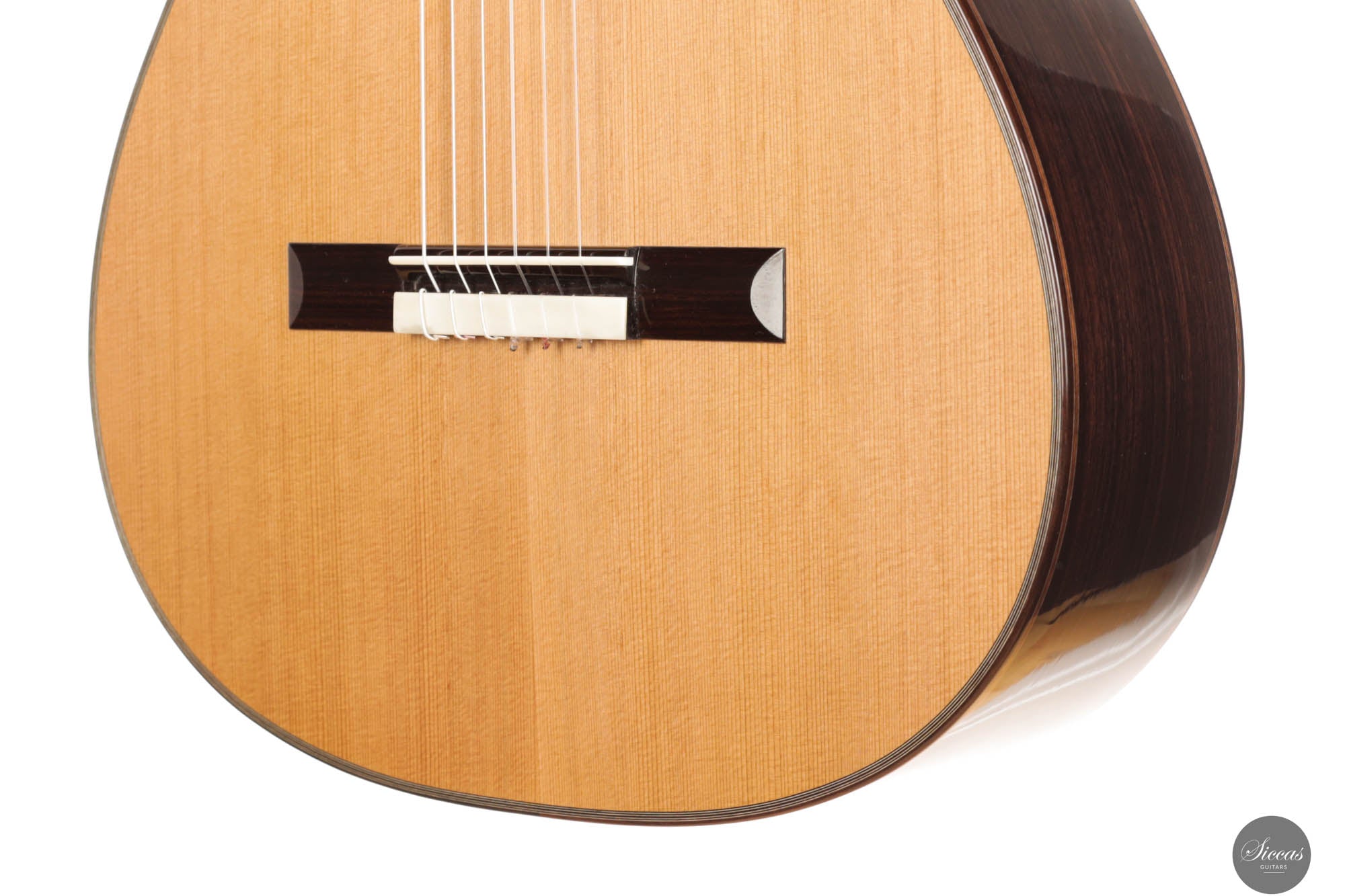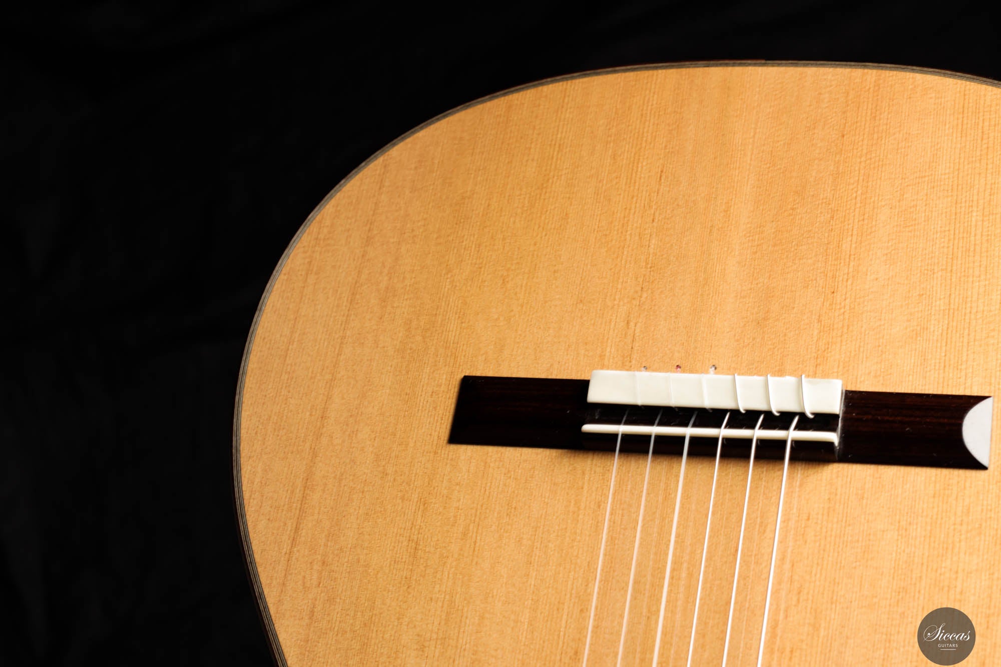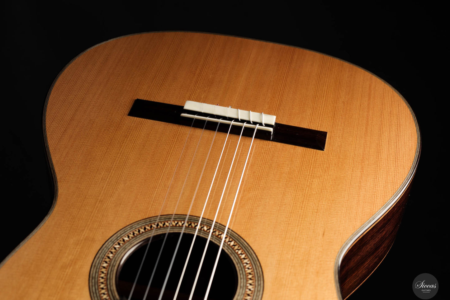 Tief in der Tradition verwurzelt, vertritt Danilo die Philosophie, dass jede Komponente einer Gitarre „in ihrer Gesamtheit schwingen muss.“ Diese Überzeugung prägt seine akribische Materialauswahl, um eine perfekte klangliche Harmonie zu erzielen. Diese Hingabe zeigt sich in einer bemerkenswerten Gitarre mit einer Fichtendecke und Boden sowie Zargen aus indischem Palisander, die eine beeindruckende Ästhetik mit außergewöhnlichem Klang vereint. Beeinflusst von der angesehenen französischen Schule des Gitarrenbaus spiegelt sie das Erbe von Meistern wie Robert Bouchet und Daniel Friederich wider. Das Instrument zeichnet sich durch hervorragende Bespielbarkeit aus, mit lang anhaltenden Tönen, die mühelos fließen, einer ausgewogenen Harmonie und einem konzerttauglichen Klangvolumen. Der Ton ist kristallklar und vielschichtig, mit hervorragender Projektion und ausgeprägter Klarheit, was die Gitarre zu einem vielseitigen Instrument für sowohl polyphone als auch melodische Stücke macht. Besonders hervorzuheben ist das sorgfältig gestaltete Griffbrett, das optimalen Komfort und beste Spielbarkeit gewährleistet.
