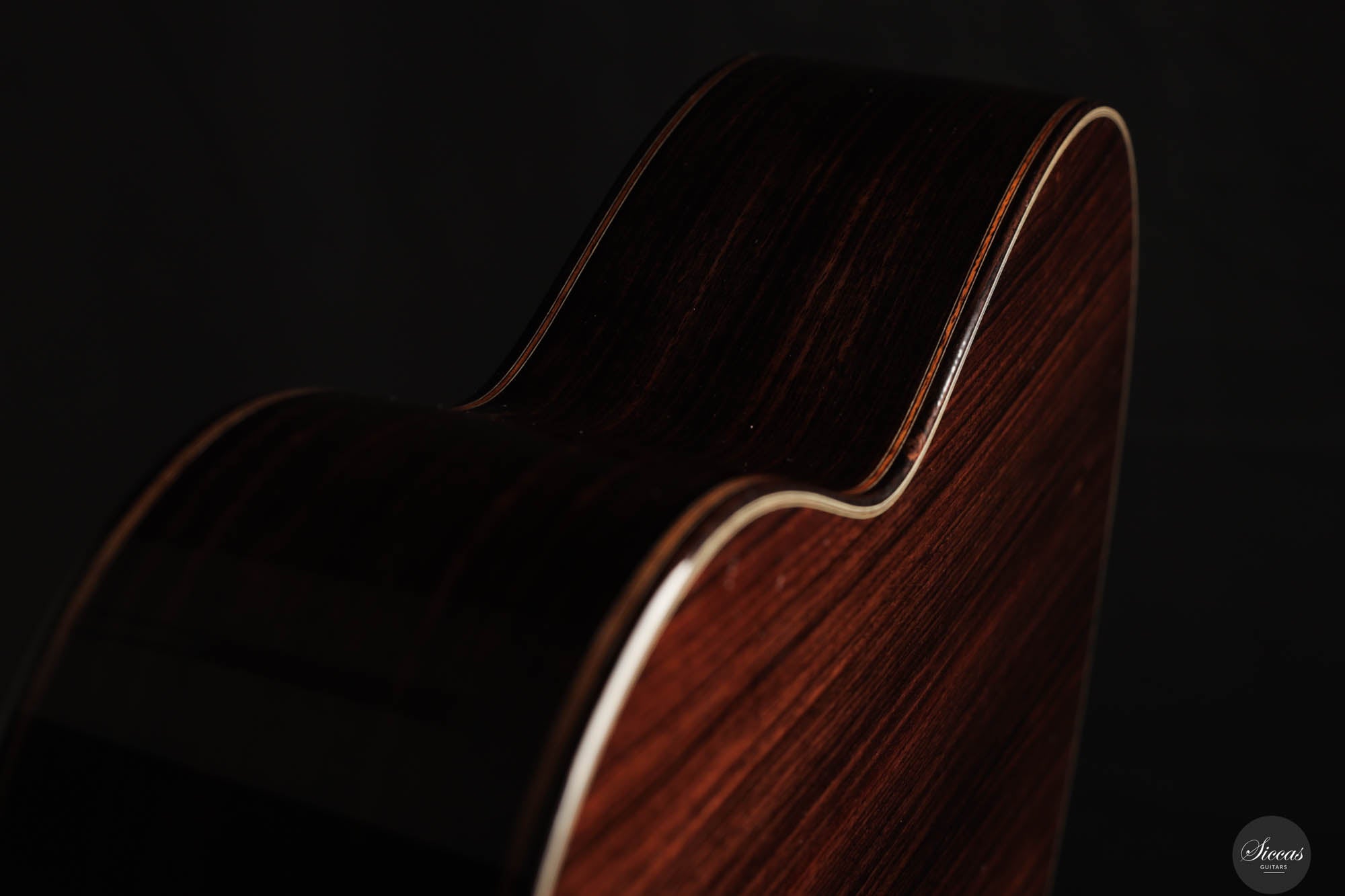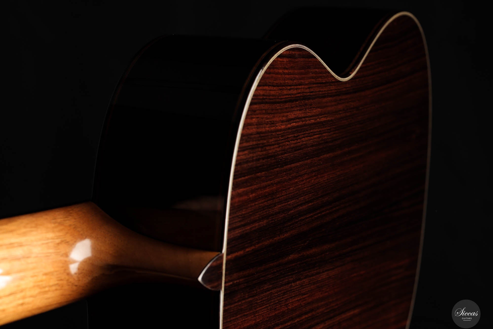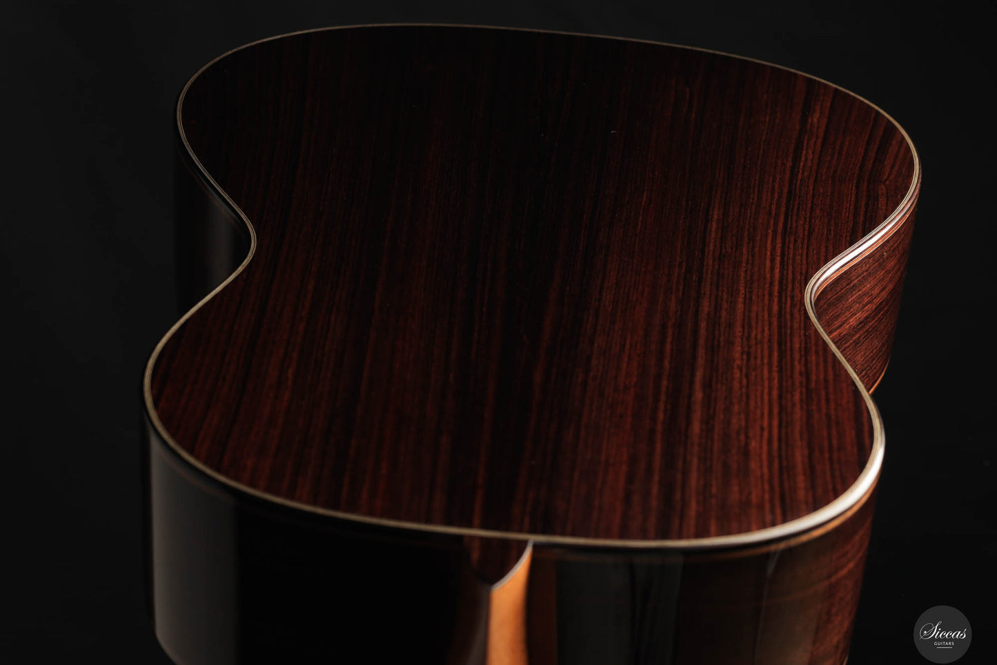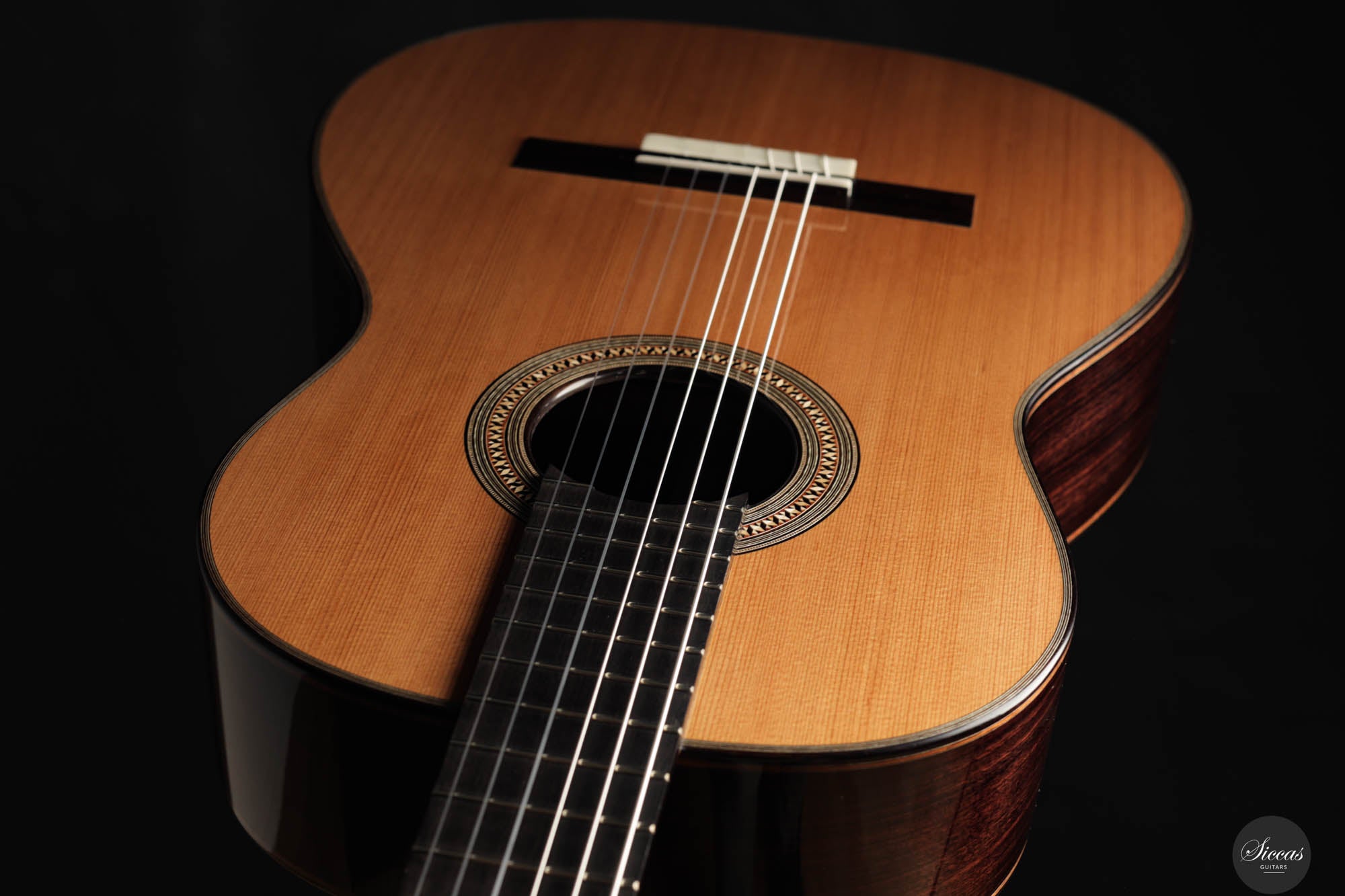 Tief in der Tradition verwurzelt, vertritt Danilo die Philosophie, dass jede Komponente einer Gitarre „in ihrer Gesamtheit schwingen muss.“ Diese Überzeugung prägt seine akribische Materialauswahl, um eine perfekte klangliche Harmonie zu erzielen. Diese Hingabe zeigt sich in einer bemerkenswerten Gitarre mit einer Fichtendecke und Boden sowie Zargen aus indischem Palisander, die eine beeindruckende Ästhetik mit außergewöhnlichem Klang vereint. Beeinflusst von der angesehenen französischen Schule des Gitarrenbaus spiegelt sie das Erbe von Meistern wie Robert Bouchet und Daniel Friederich wider. Das Instrument zeichnet sich durch hervorragende Bespielbarkeit aus, mit lang anhaltenden Tönen, die mühelos fließen, einer ausgewogenen Harmonie und einem konzerttauglichen Klangvolumen. Der Ton ist kristallklar und vielschichtig, mit hervorragender Projektion und ausgeprägter Klarheit, was die Gitarre zu einem vielseitigen Instrument für sowohl polyphone als auch melodische Stücke macht. Besonders hervorzuheben ist das sorgfältig gestaltete Griffbrett, das optimalen Komfort und beste Spielbarkeit gewährleistet.