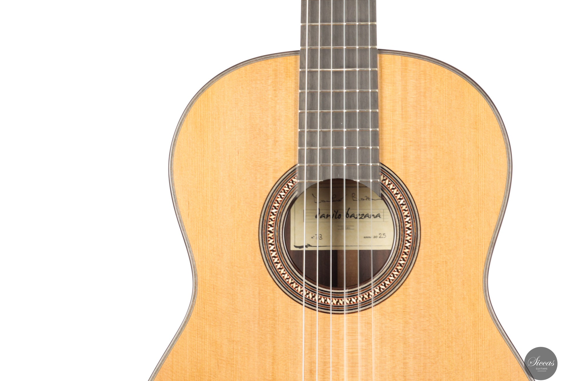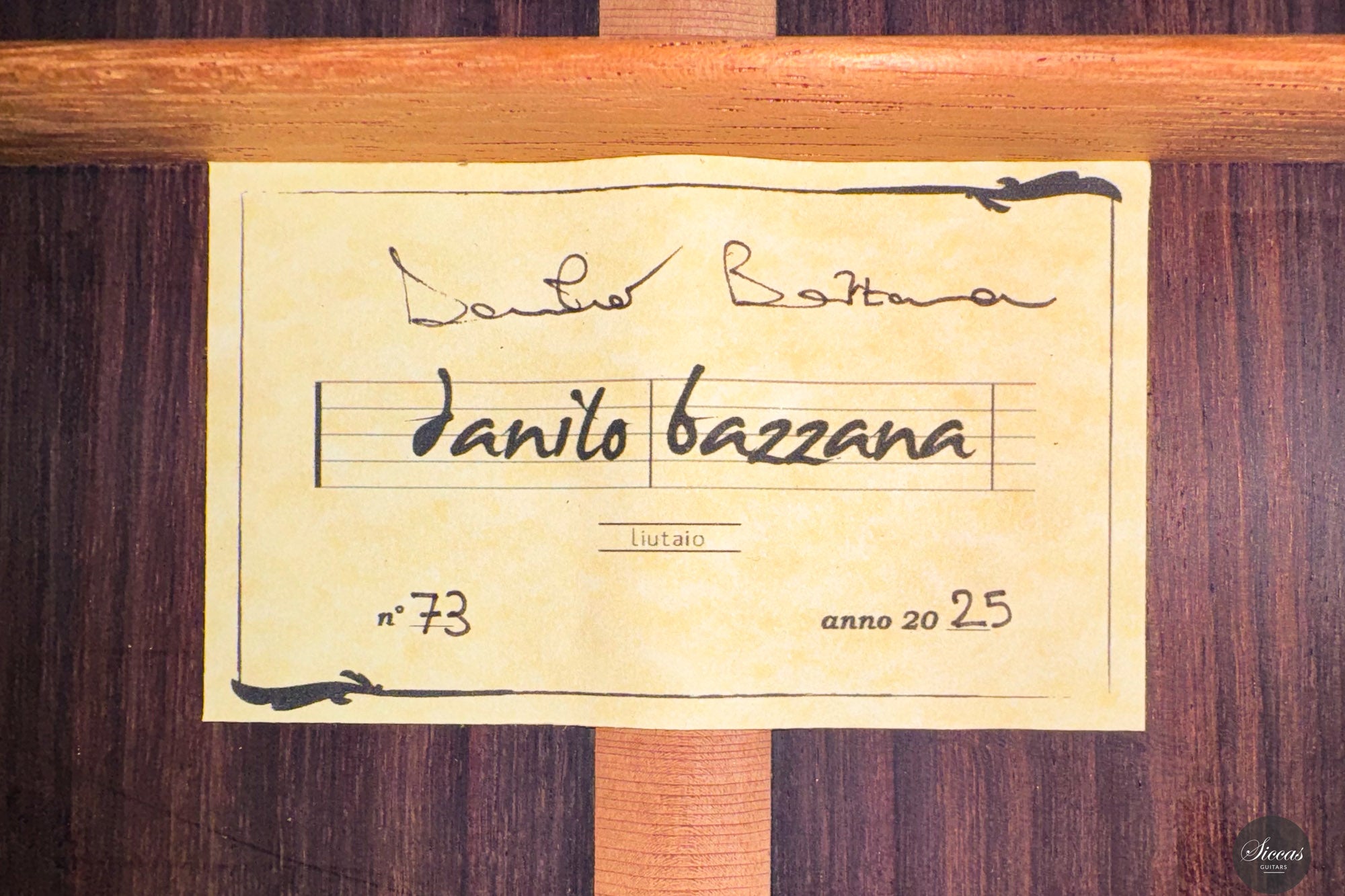 Danilo Bazzana, geboren 1985 in Mailand, begann im Alter von dreizehn Jahren Gitarre zu spielen – eine frühe Leidenschaft, die später zu seinem Beruf wurde. 2015 eröffnete er seine Werkstatt in Paderno Dugnano bei Mailand, wo er klassische Gitarren baut und zudem Feineinstellungen, Restaurierungen und Reparaturen an Zupfinstrumenten vornimmt. Seine Gitarren sind in der Tradition verwurzelt und von den großen Meistern inspiriert, geprägt jedoch durch seine äußerst sorgfältige Materialauswahl und präzise Bauweise. Bazzana folgt der Philosophie, dass jede einzelne Komponente einer Gitarre „in ihrer Gesamtheit schwingen“ muss, um klangliche Harmonie zu erreichen. Beeinflusst von der französischen Schule des Gitarrenbaus, insbesondere von Robert Bouchet und Daniel Friederich, verbinden seine Instrumente Klarheit, Projektion und Sensibilität mit einer eleganten Gestaltung.Über die Gitarre