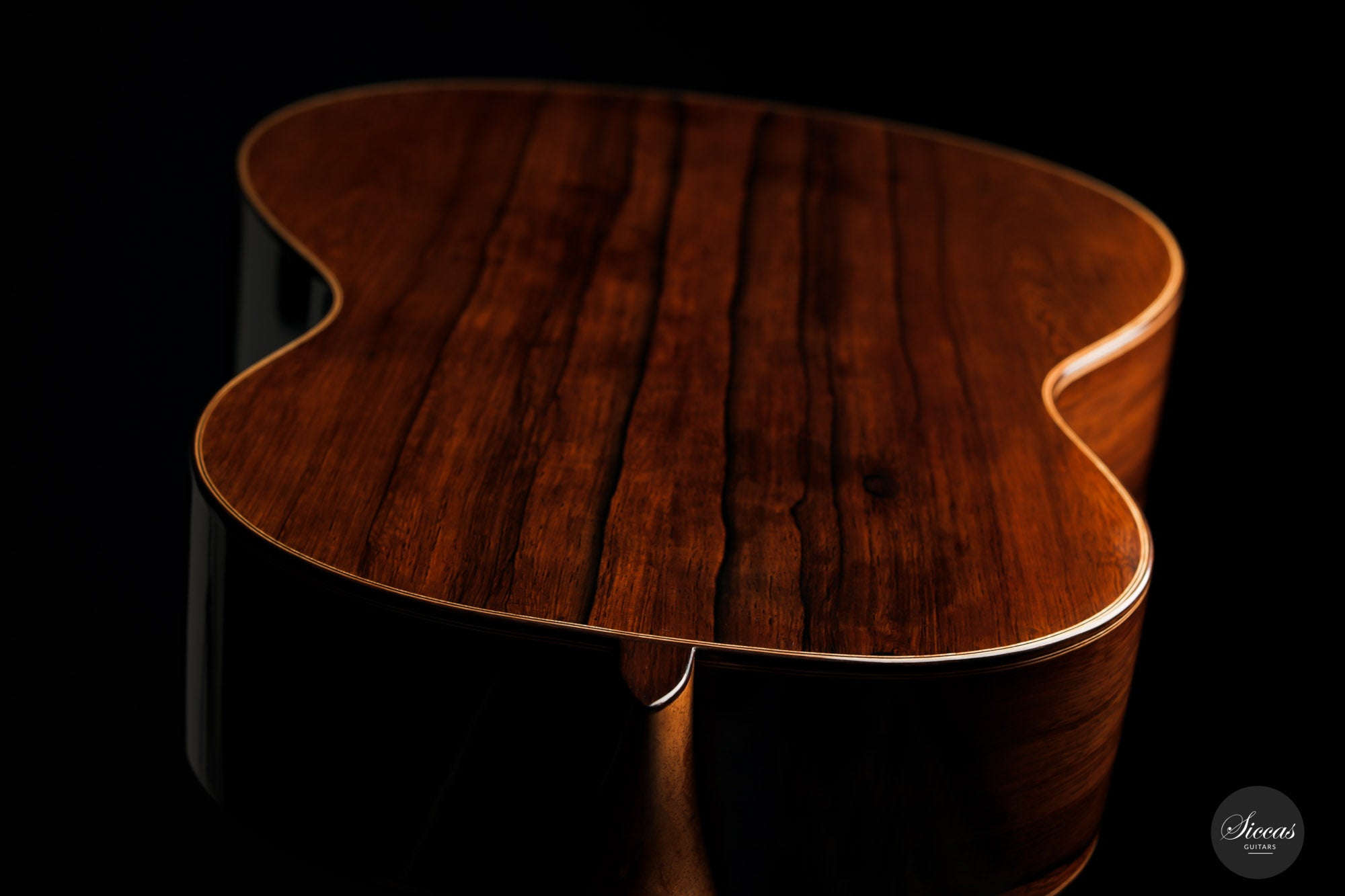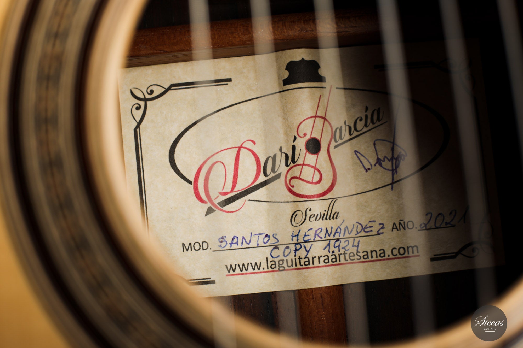 Darío García built this elegant guitar as a faithful copy of the Santos Hernández guitar from 1924, which belonged to Andrés Segovia and was donated by Segovia to the Victor Espinós Music Library in Madrid, where it is still preserved today. This beautiful instrument is made of fine spruce and stunning African rosewood. It is characterised by its light weight due to the thinly crafted woods. When playing, the sound of the instrument is surprisingly powerful with a present harmonic content. A truly inspiring guitar that has a charming vintage timbre that is rarely found in new instruments.