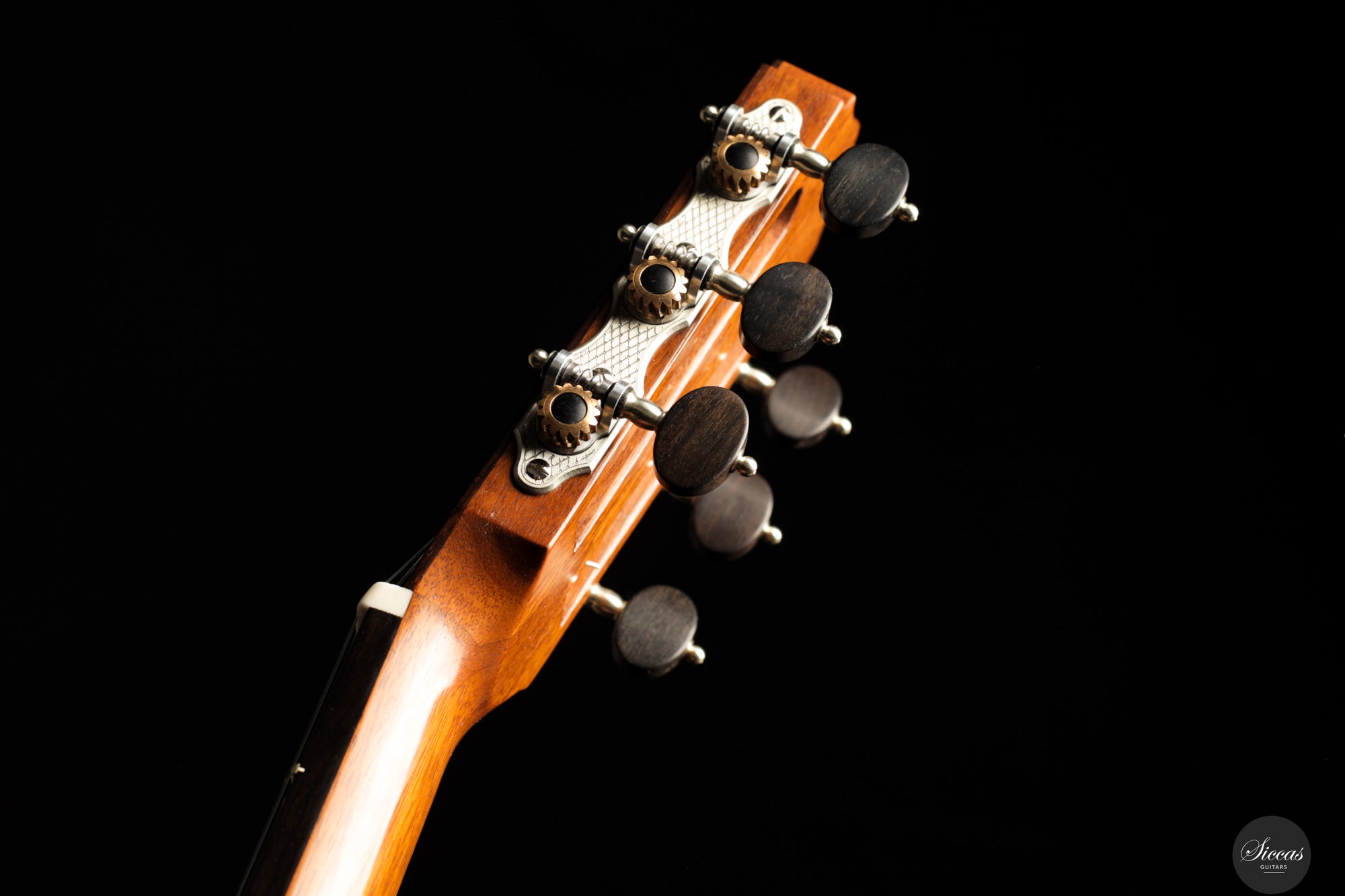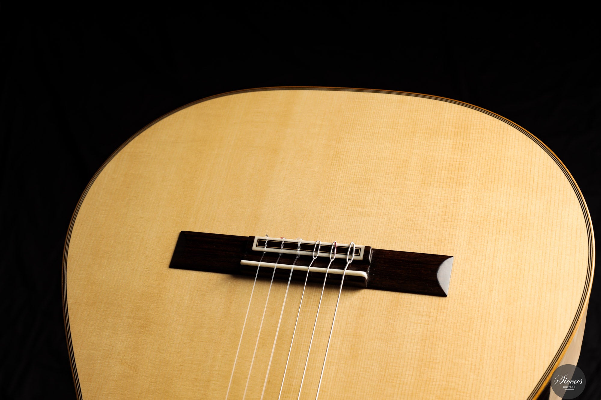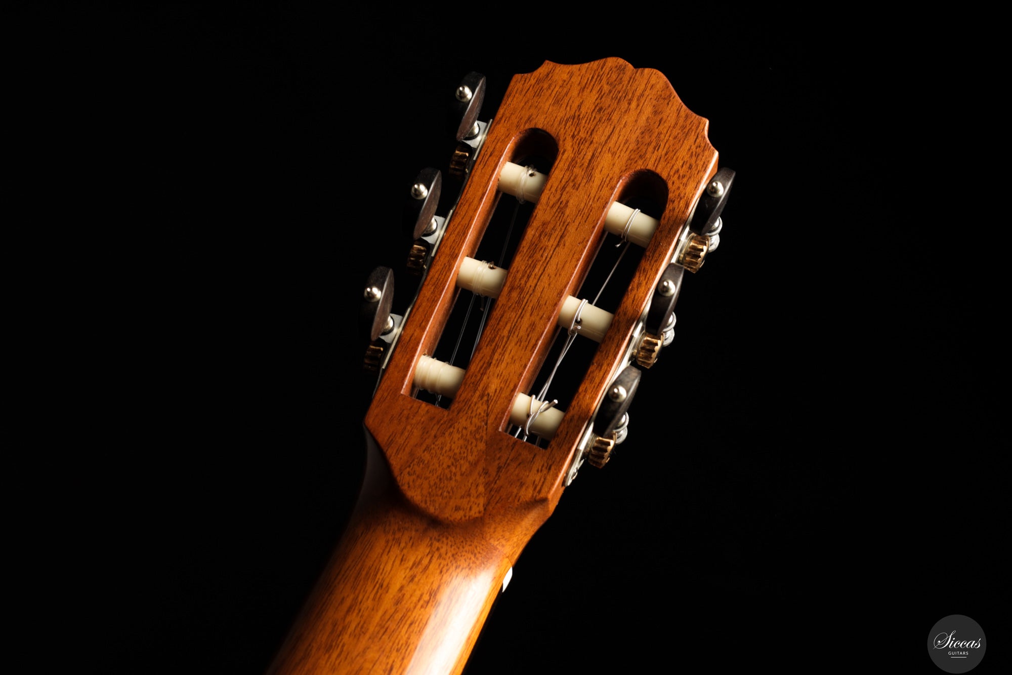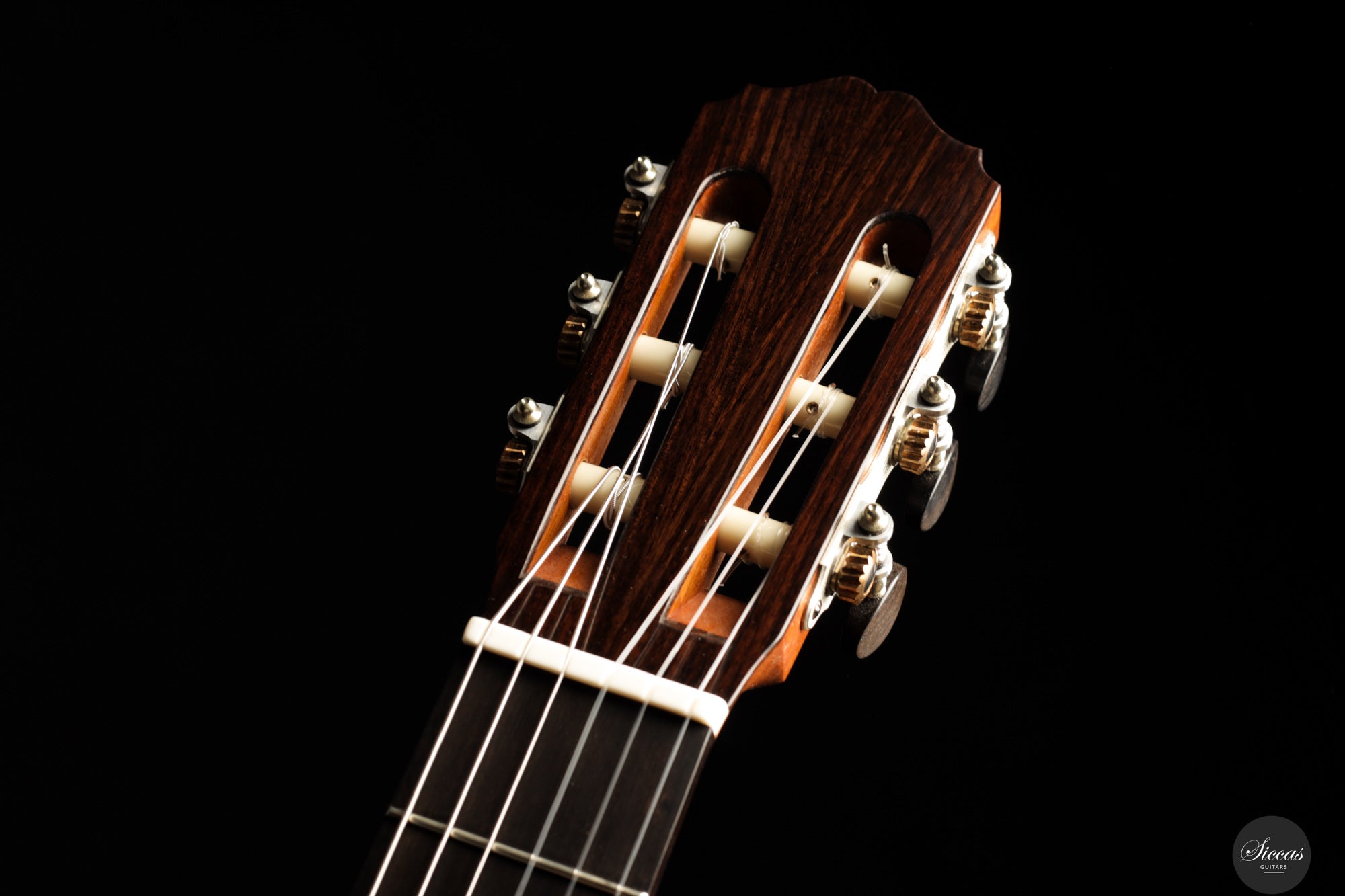 Mit einer Mensur von 650 mm und einer Sattelbreite von 51 mm spielt sich das Instrument äußerst angenehm. Das geringe Gewicht von nur 1.440 Gramm trägt zusätzlich zu seiner unmittelbaren Ansprache und seinem intimen Charakter bei. Ausgestattet mit Alessi-Mechaniken und vollständig in Schellack ausgeführt, ist diese Gitarre ein fein gearbeitetes Konzertinstrument, das in jeder Hinsicht höchste Ansprüche erfüllt.