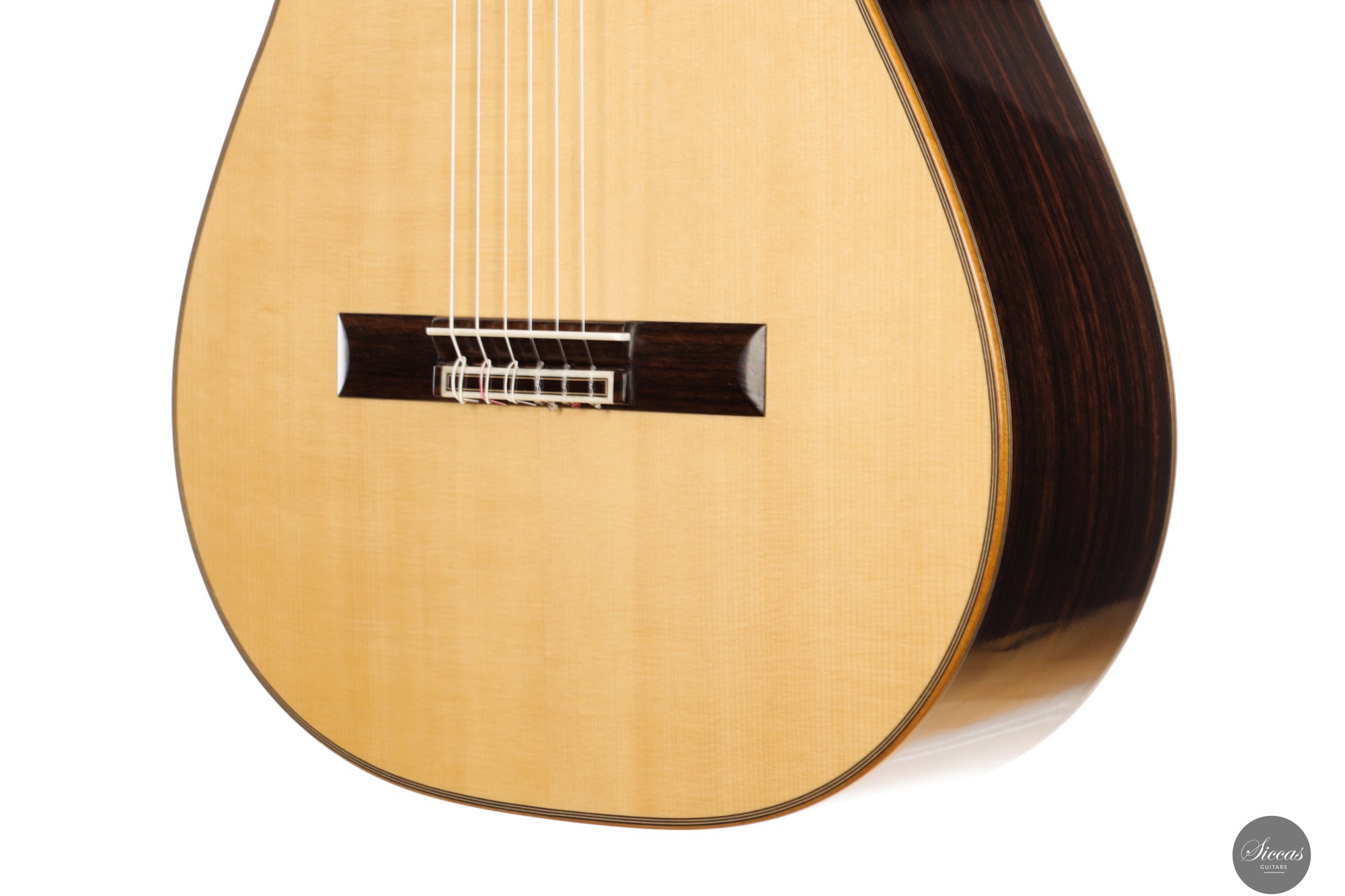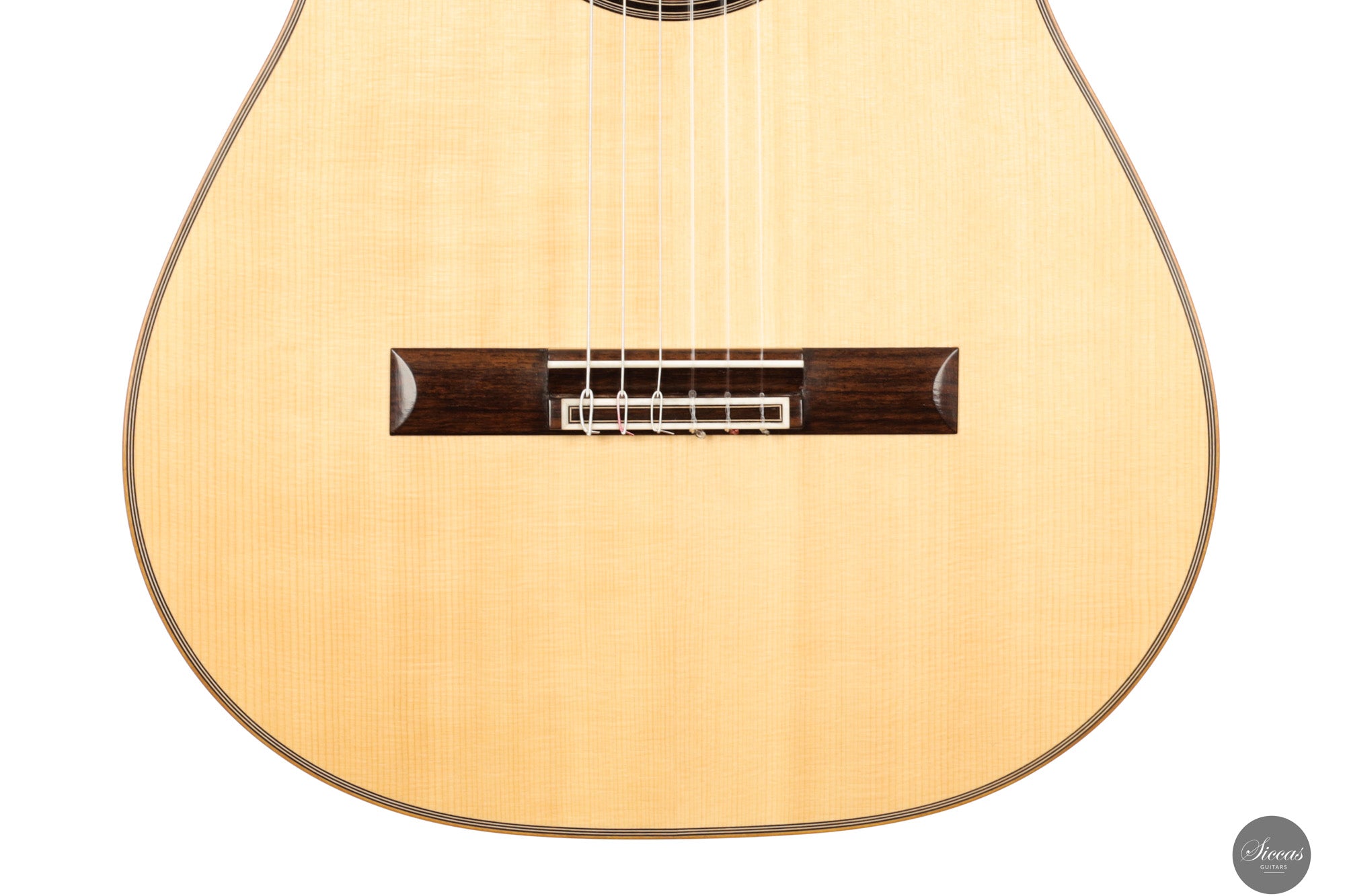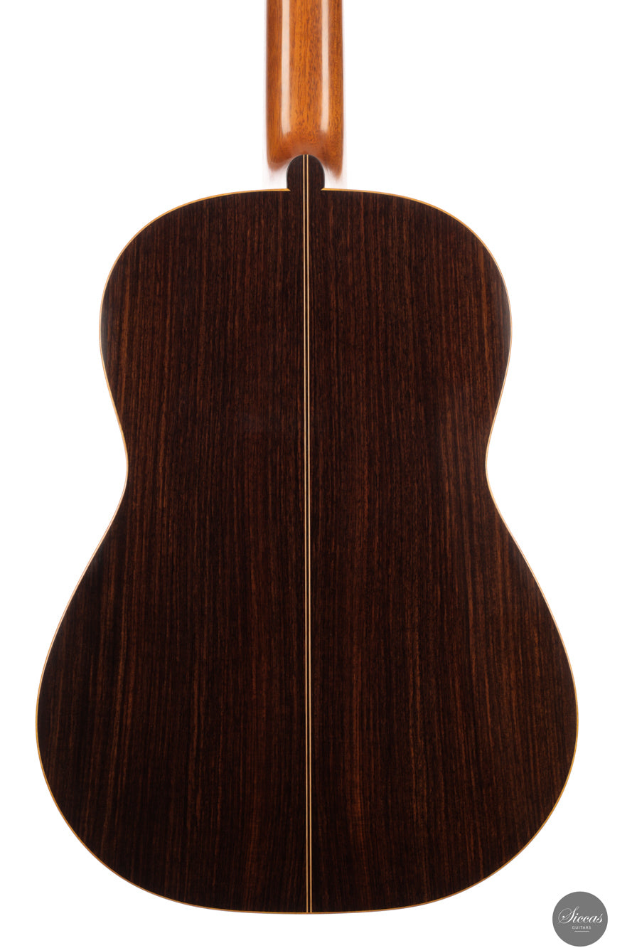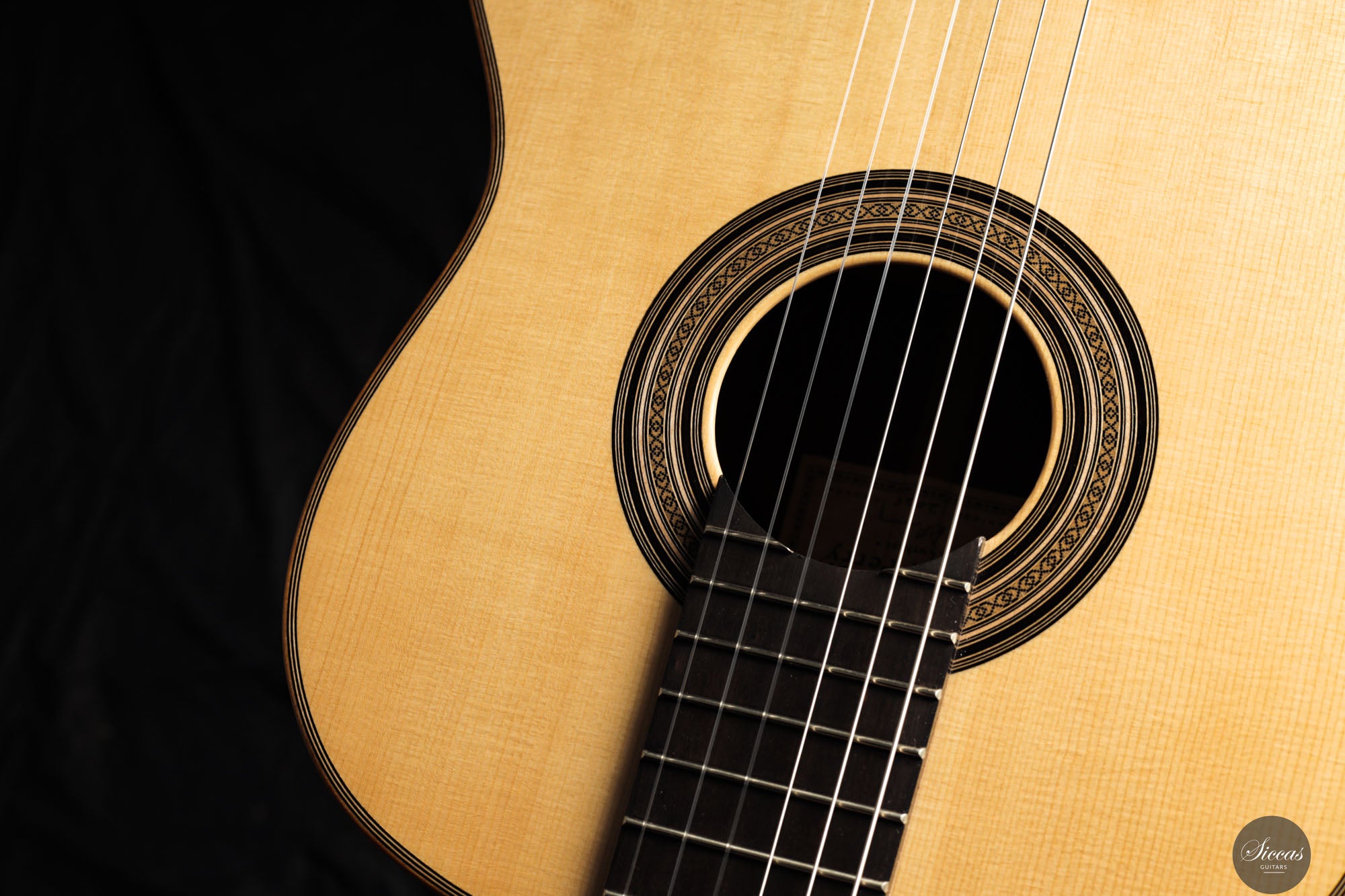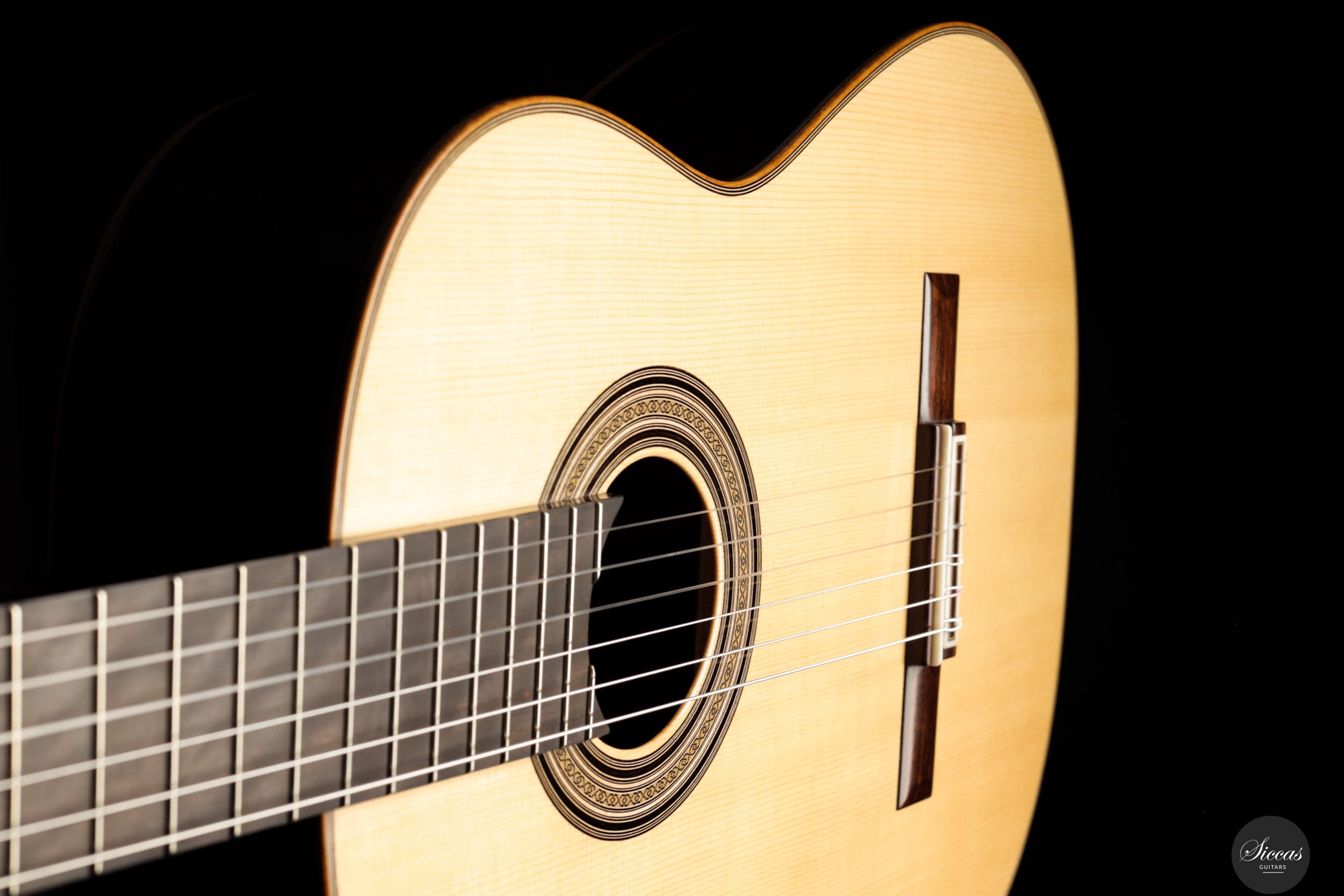 Mit einer Mensur von 650 mm und einer Sattelbreite von 51 mm spielt sich das Instrument äußerst angenehm. Das geringe Gewicht von nur 1.440 Gramm trägt zusätzlich zu seiner unmittelbaren Ansprache und seinem intimen Charakter bei. Ausgestattet mit Alessi-Mechaniken und vollständig in Schellack ausgeführt, ist diese Gitarre ein fein gearbeitetes Konzertinstrument, das in jeder Hinsicht höchste Ansprüche erfüllt.