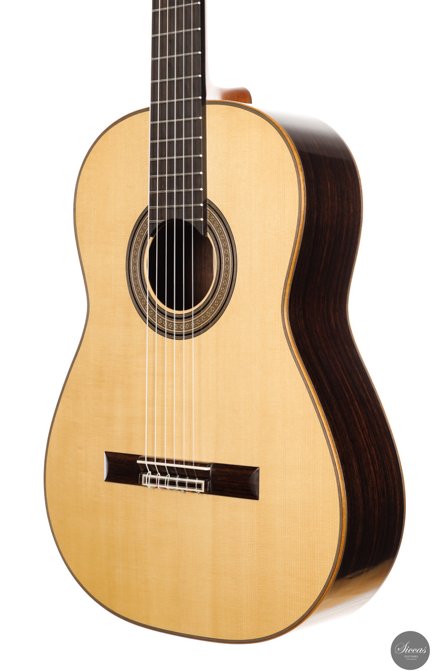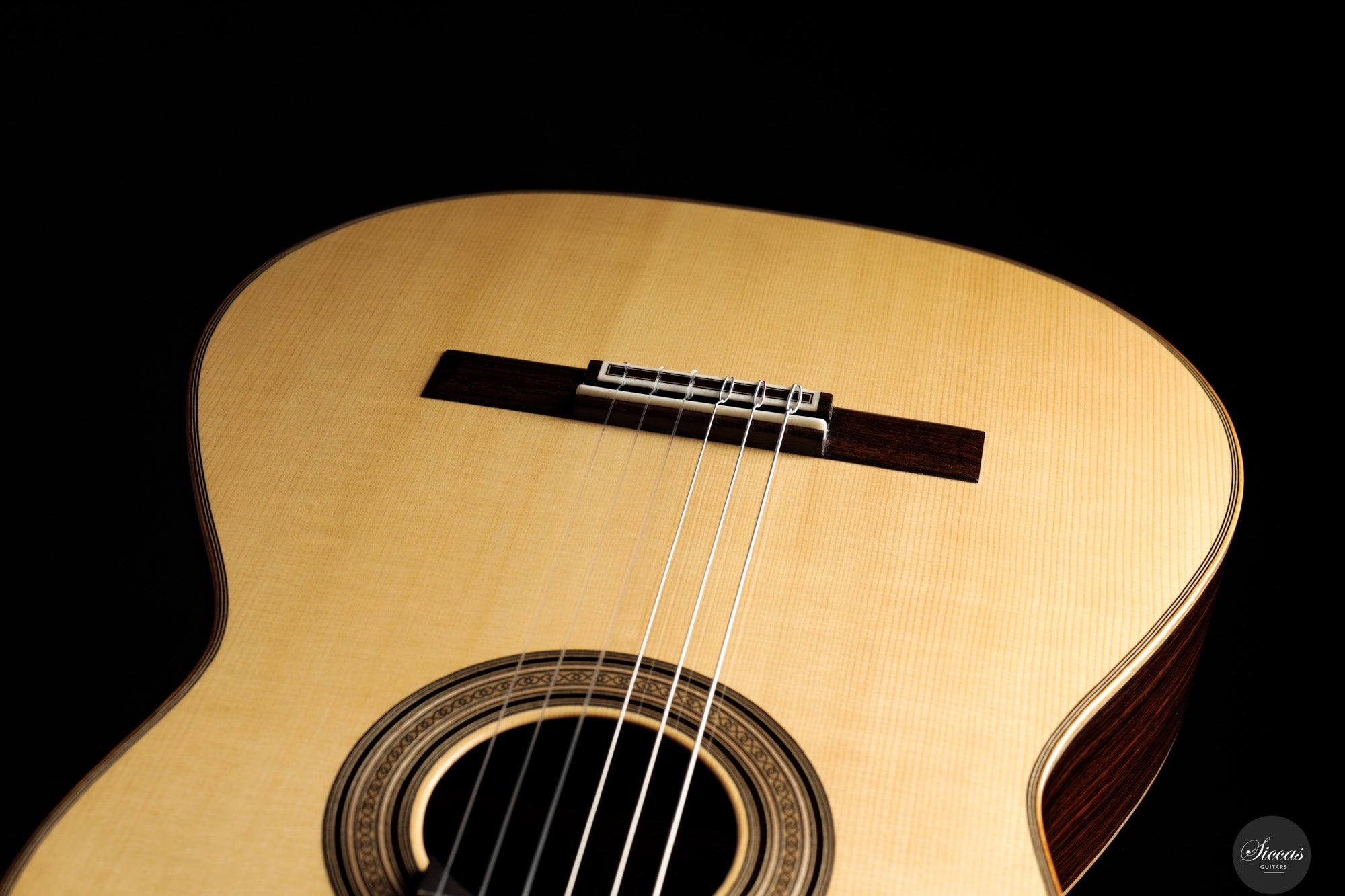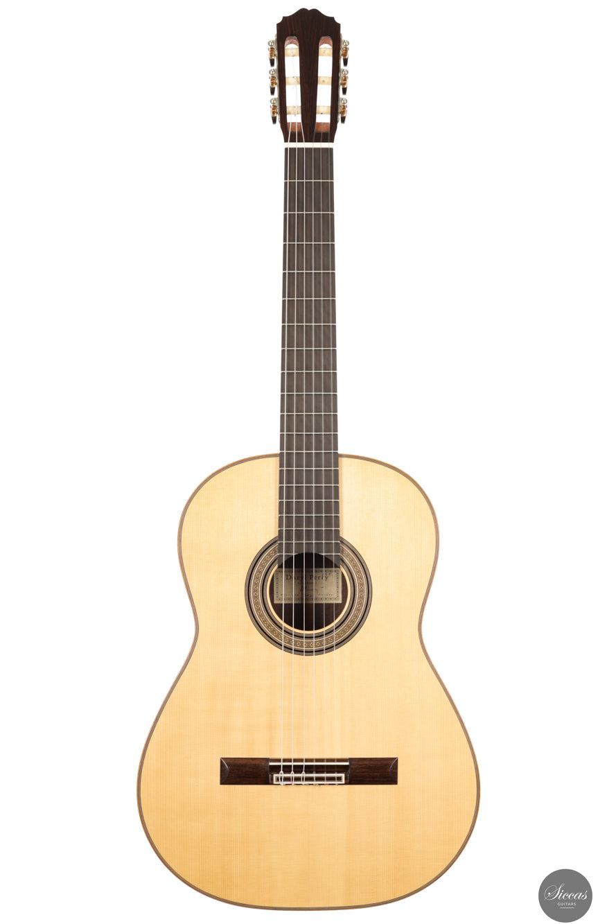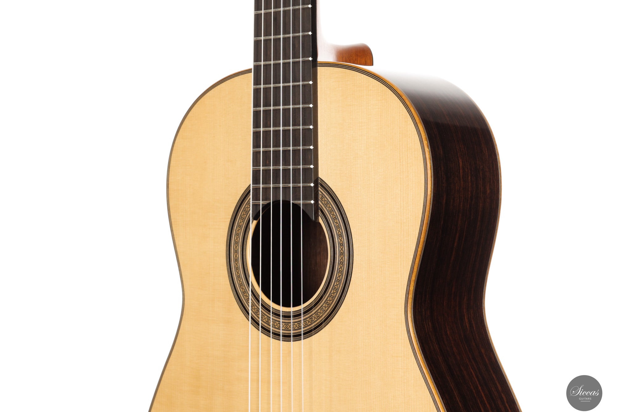 Mit einer Mensur von 650 mm und einer Sattelbreite von 51 mm spielt sich das Instrument äußerst angenehm. Das geringe Gewicht von nur 1.440 Gramm trägt zusätzlich zu seiner unmittelbaren Ansprache und seinem intimen Charakter bei. Ausgestattet mit Alessi-Mechaniken und vollständig in Schellack ausgeführt, ist diese Gitarre ein fein gearbeitetes Konzertinstrument, das in jeder Hinsicht höchste Ansprüche erfüllt.
