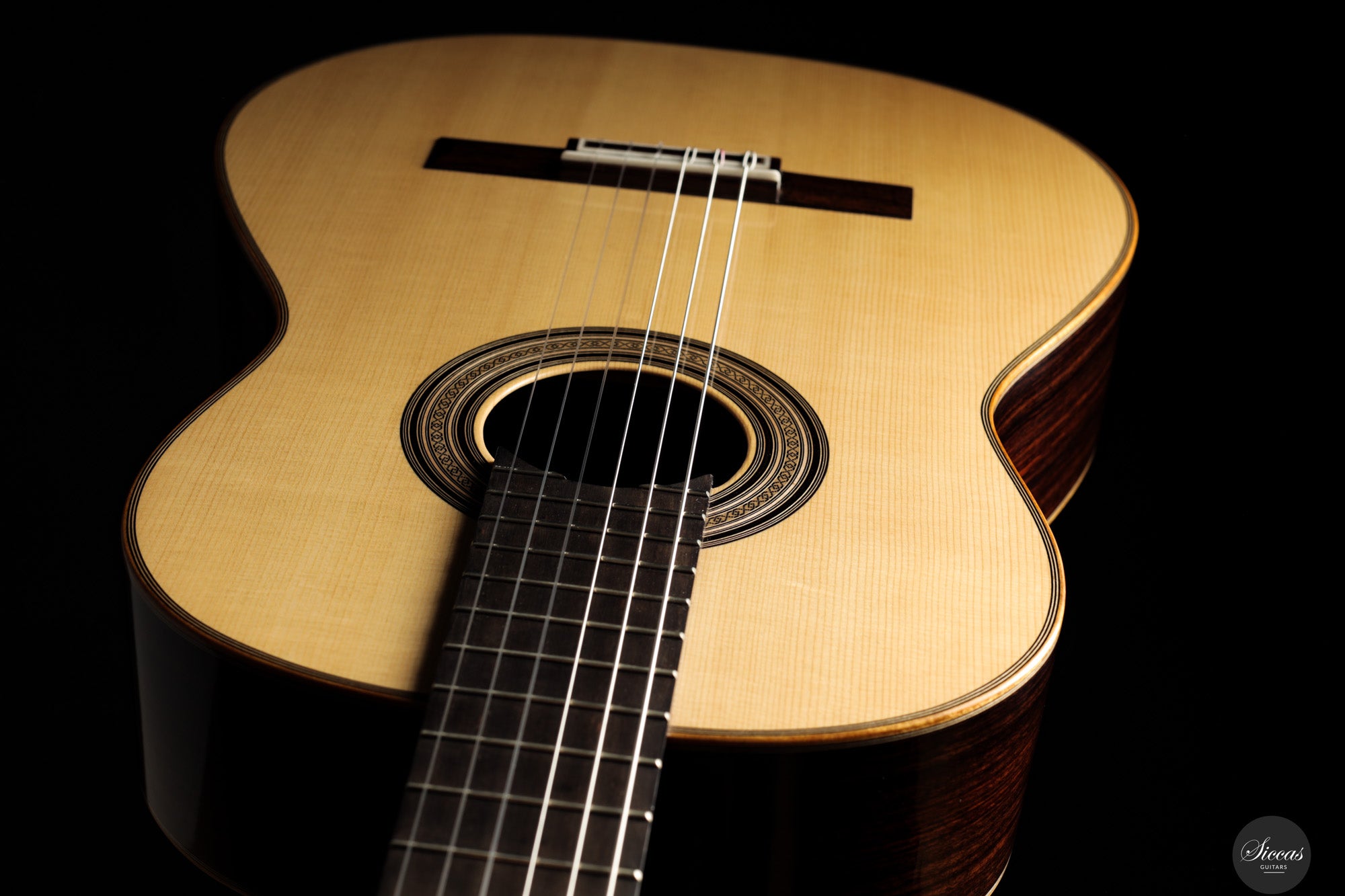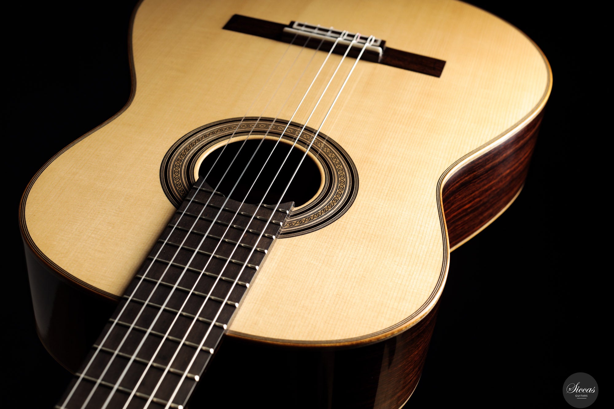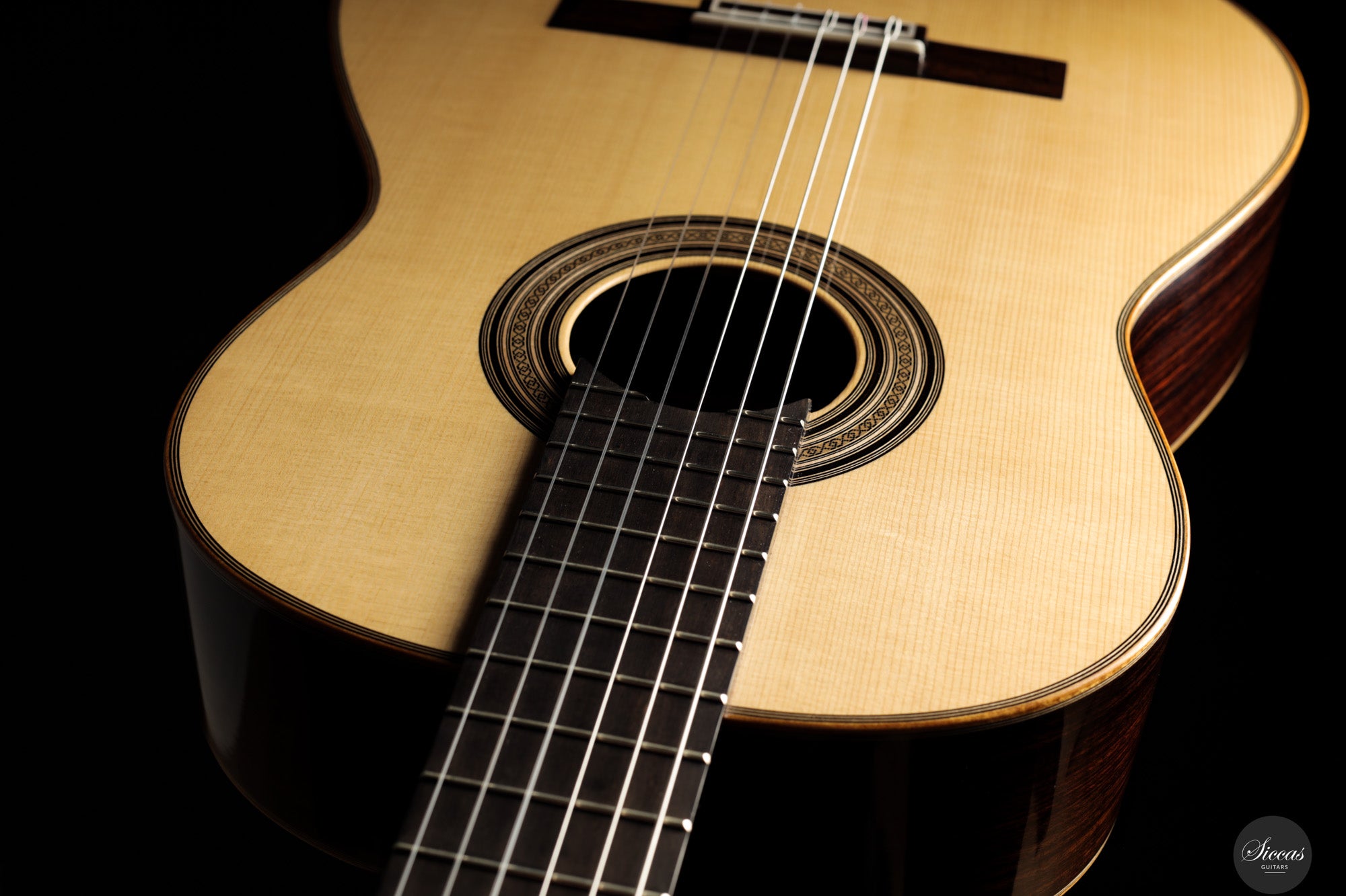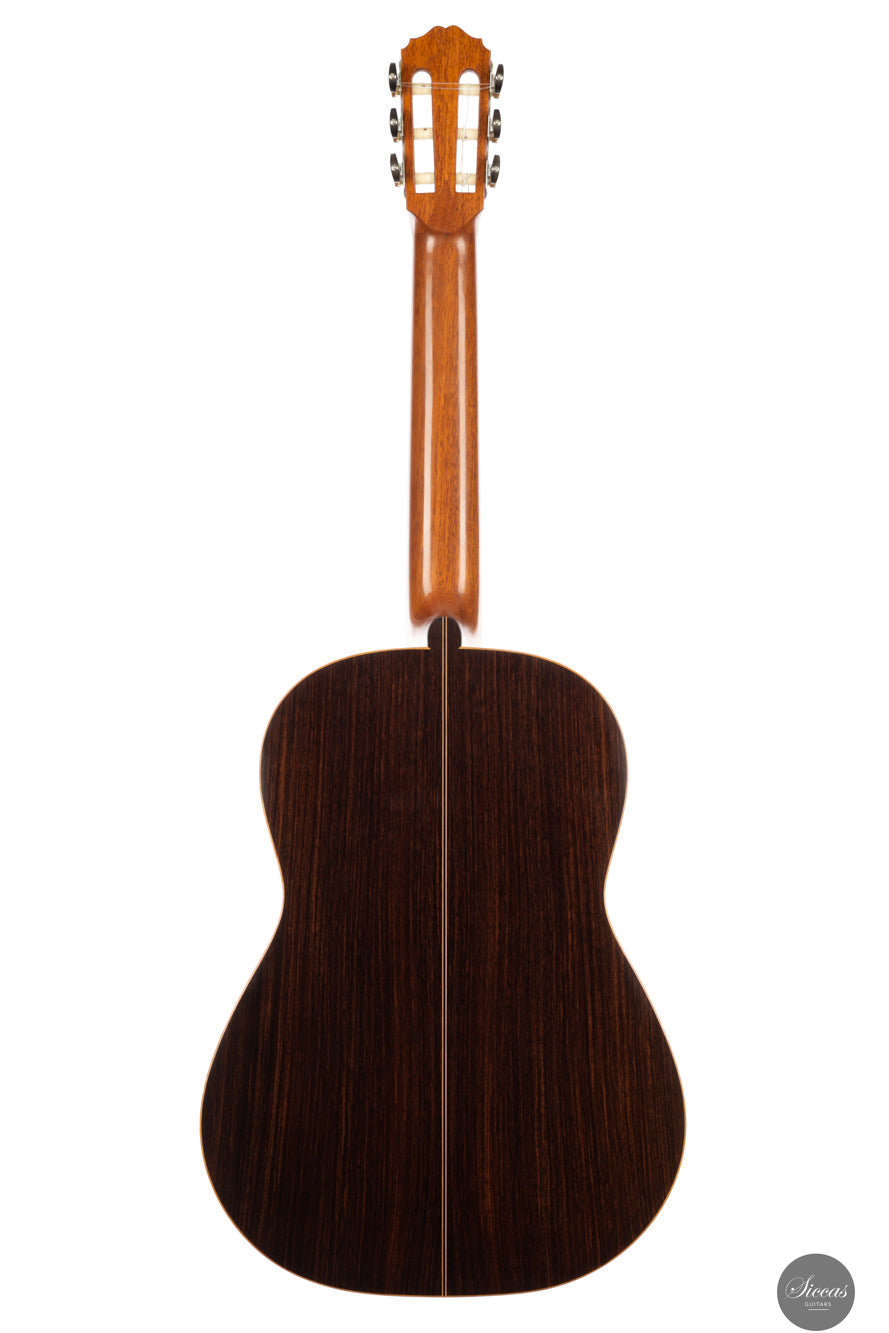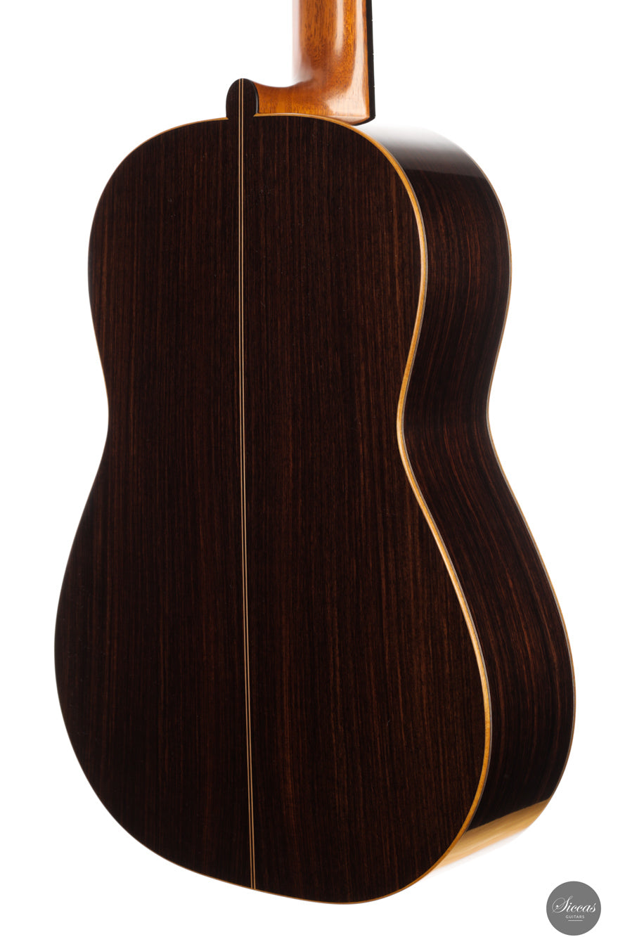 Mit einer Mensur von 650 mm und einer Sattelbreite von 51 mm spielt sich das Instrument äußerst angenehm. Das geringe Gewicht von nur 1.440 Gramm trägt zusätzlich zu seiner unmittelbaren Ansprache und seinem intimen Charakter bei. Ausgestattet mit Alessi-Mechaniken und vollständig in Schellack ausgeführt, ist diese Gitarre ein fein gearbeitetes Konzertinstrument, das in jeder Hinsicht höchste Ansprüche erfüllt.
