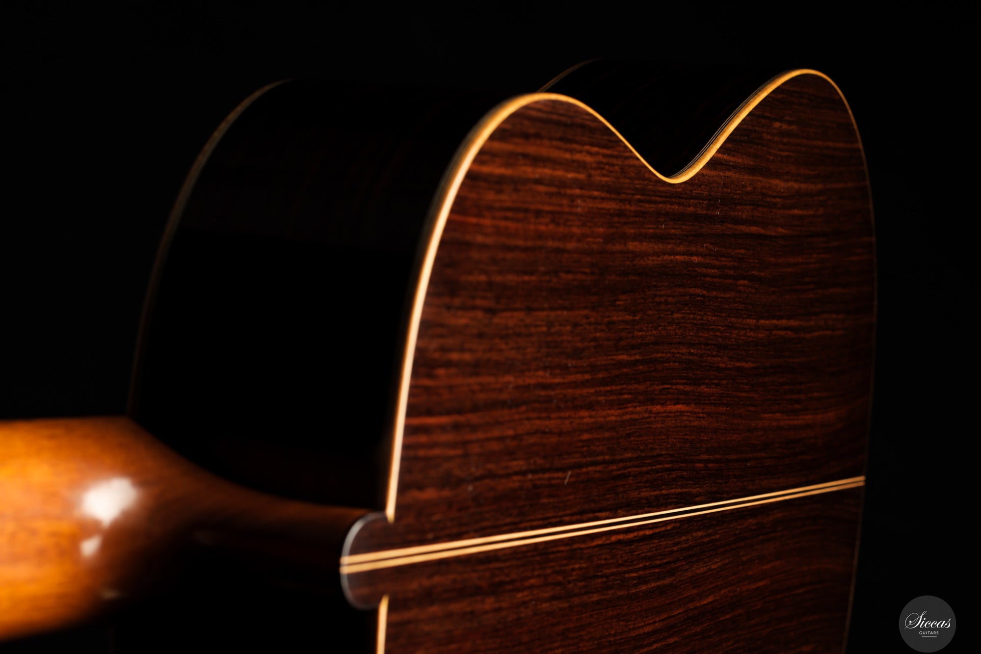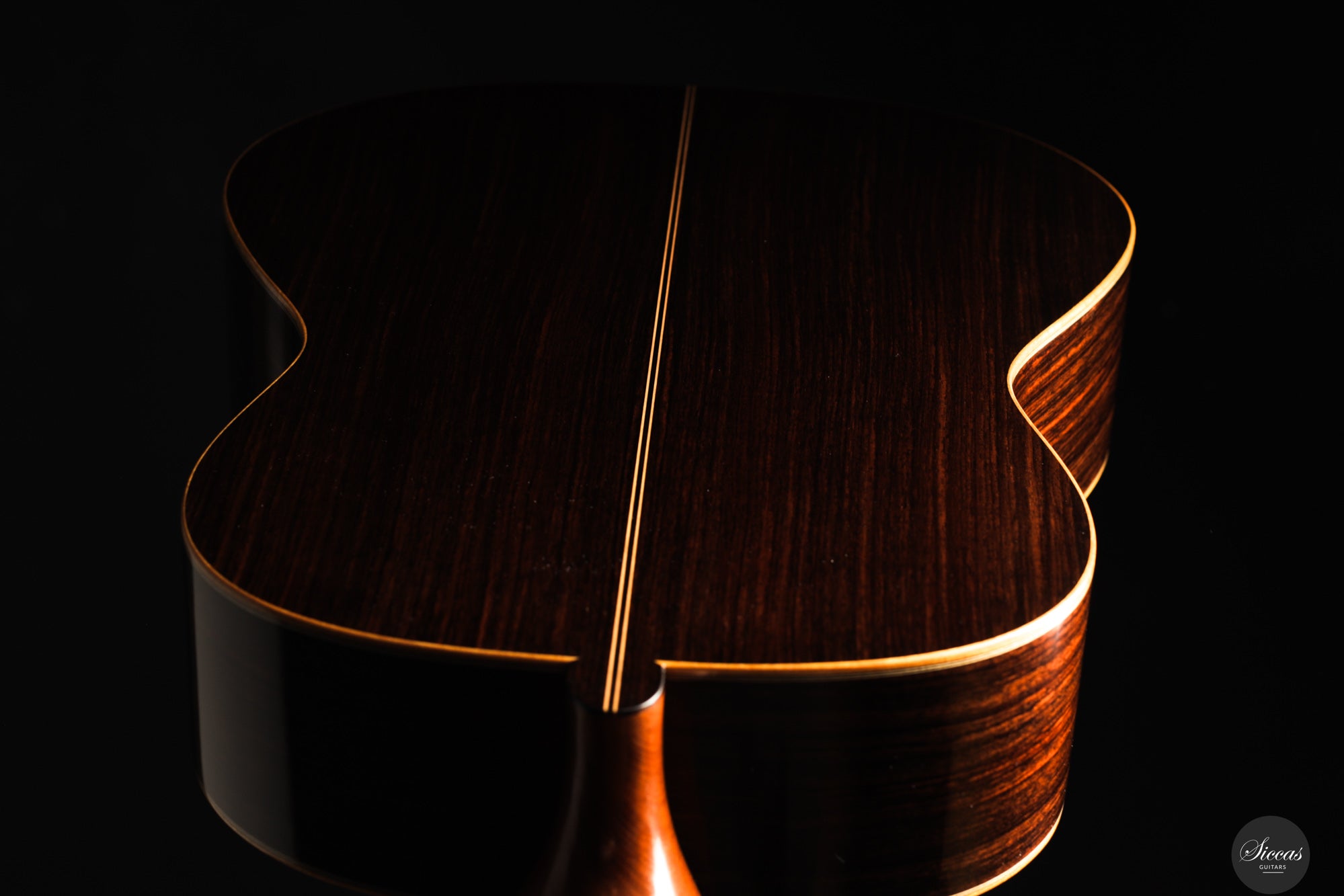 Die 2025 gebaute Gitarre mit der Nummer 264 ist ein Beispiel für Daryl Perrys ausgereifte traditionelle Bauweise. Die Fichtendecke und der Korpus aus indischem Palisander sind vollständig mit Schellack handpoliert und verleihen dem Instrument eine klare, gesangliche Stimme mit außergewöhnlicher Ausgewogenheit und Farbtrennung. Ihr Erscheinungsbild ist zurückhaltend und edel zugleich – geprägt von klassischer Linienführung und stiller Ausdruckskraft.
