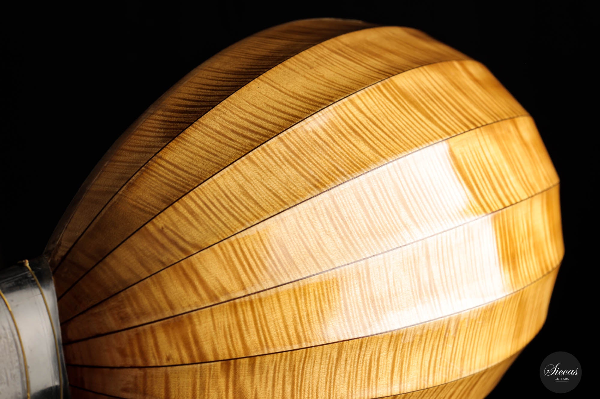This 1973 Rubio Lute is a true masterpiece of craftsmanship. It can be used as a Baroque or Renaissance lute with ten courses, including two single strings. This special instrument is in fantastic condition, with only one perfectly repaired crack on the soundboard. The body of the lute is crafted from 9 beautifully flamed maple ribs, held to the soundboard with parchment in the traditional manner, making it visually stunning and durable.