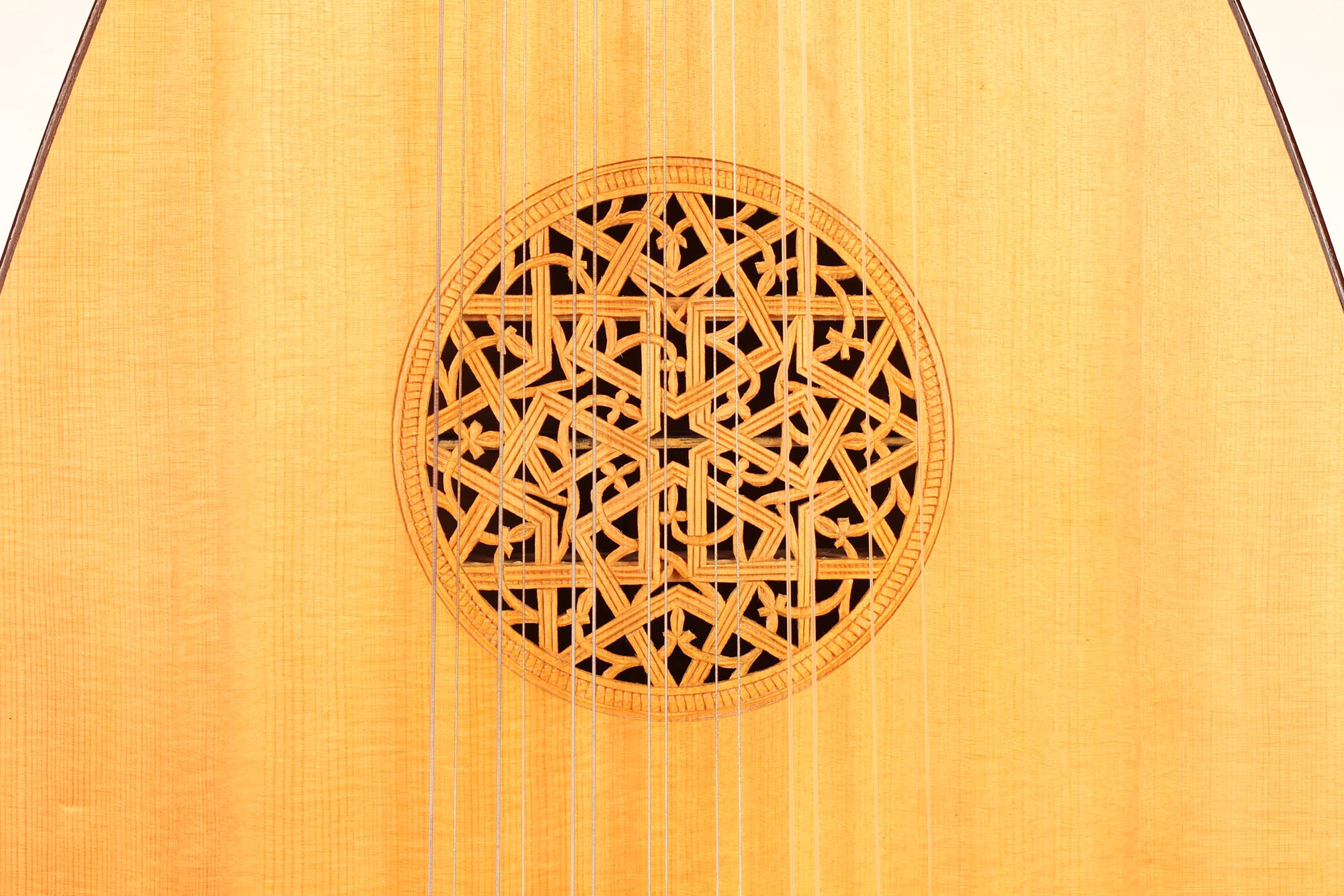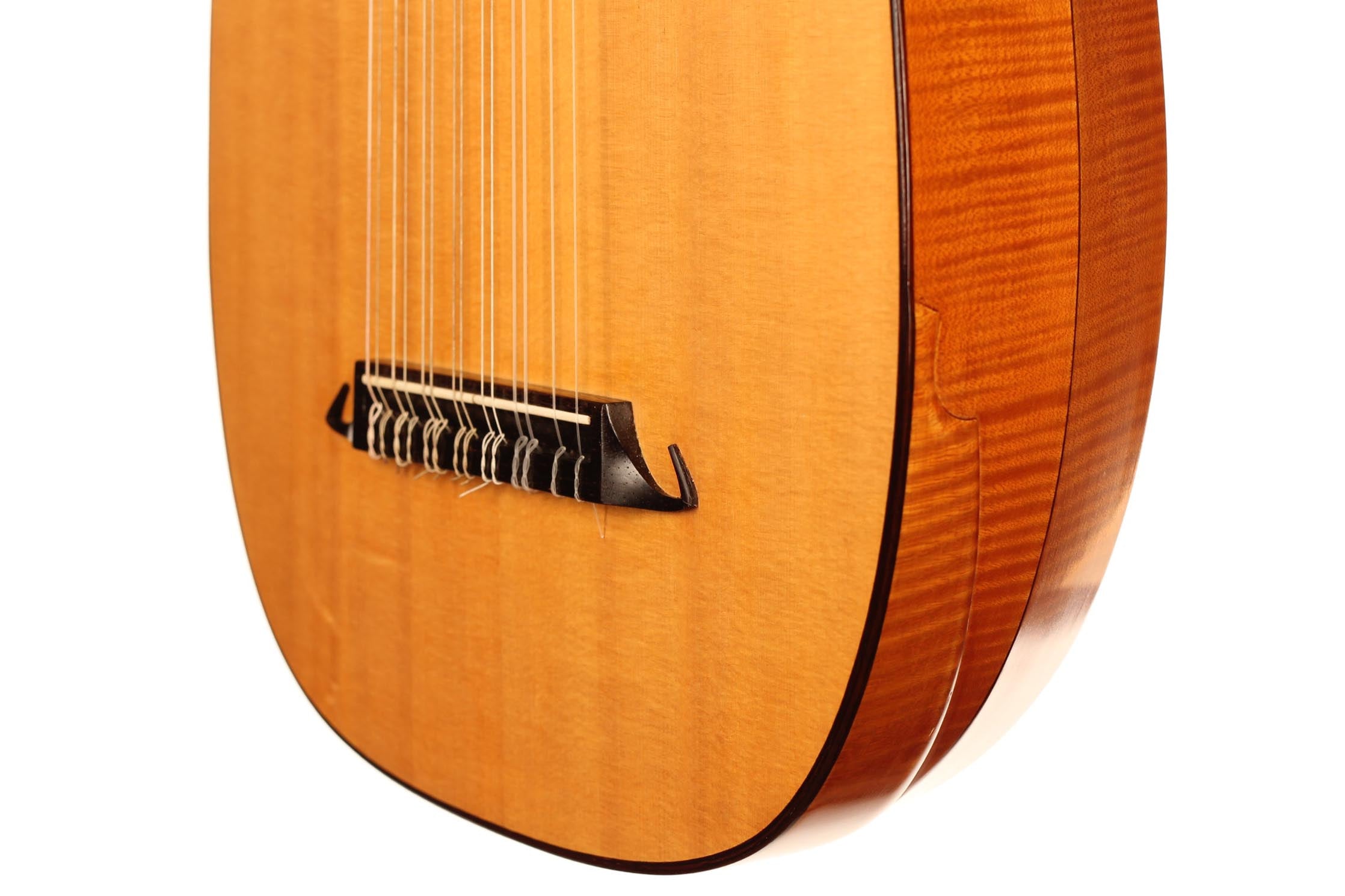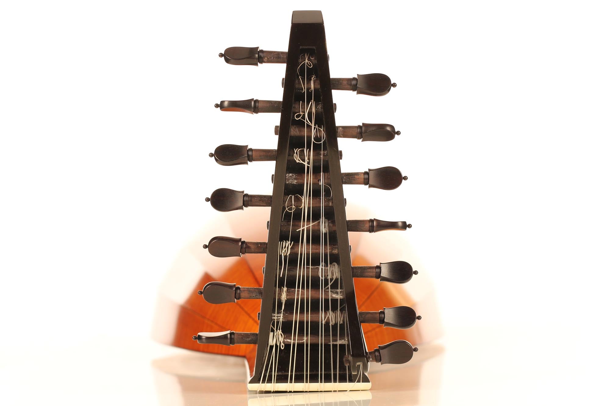 This 8 courses lute is a gorgeous example of David José Rubio’s high-quality workmanship. It is generously decorated with fine marquetry inlays on the head and the neck. This instrument was built based on the model of Bream’s 1967 8 courses lute, featuring the two first two strings as single-strings, the inlaid frets and the elevated first-string peg. This lute is in excellent condition, no cracks nor repairs have occurred. This lute only has some handling wear on the top of the head and some imperceptible playing marks on the top. It is a rare opportunity to see a lute made by this great English master and an even bigger event to have the chance to approach such a gorgeously decorated instrument made on the model of Julian Bream’s one.