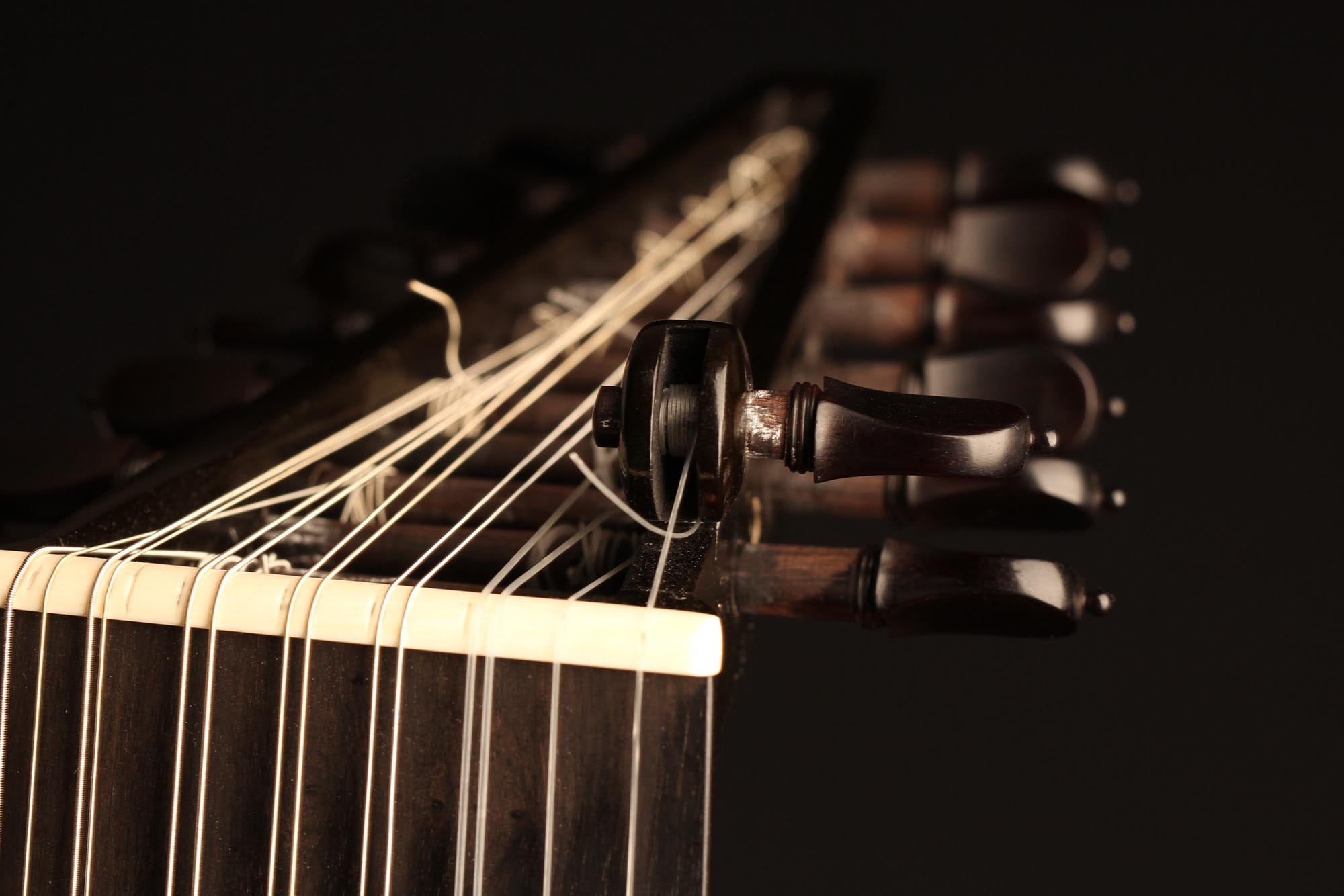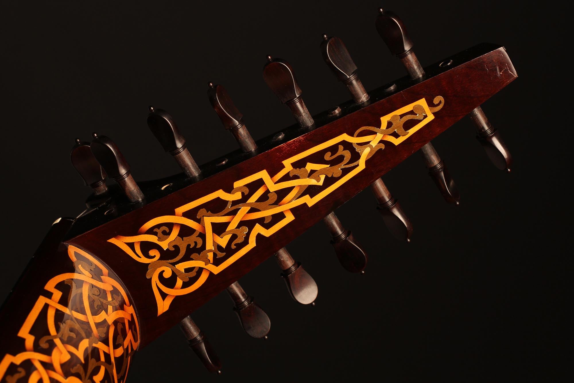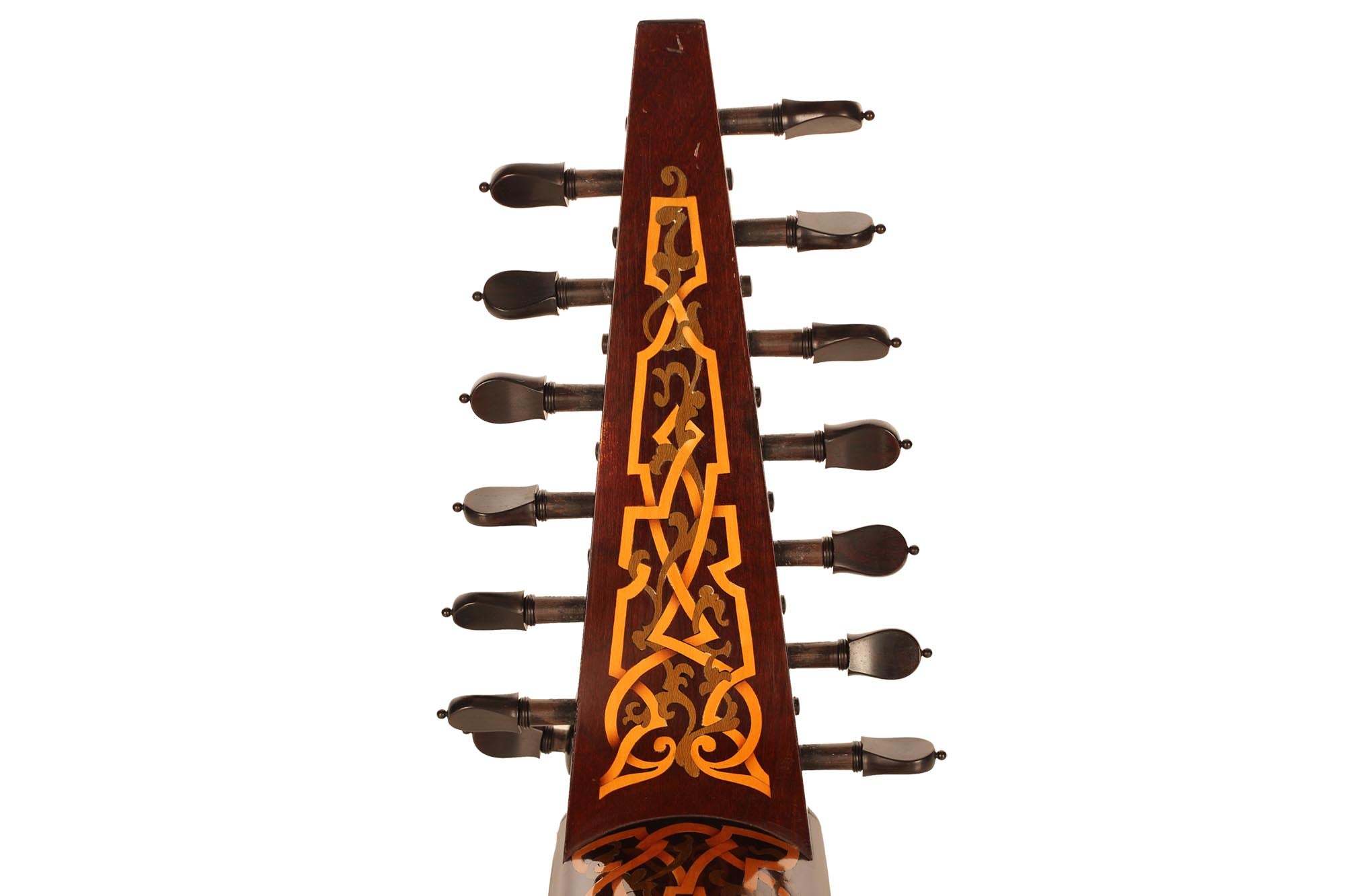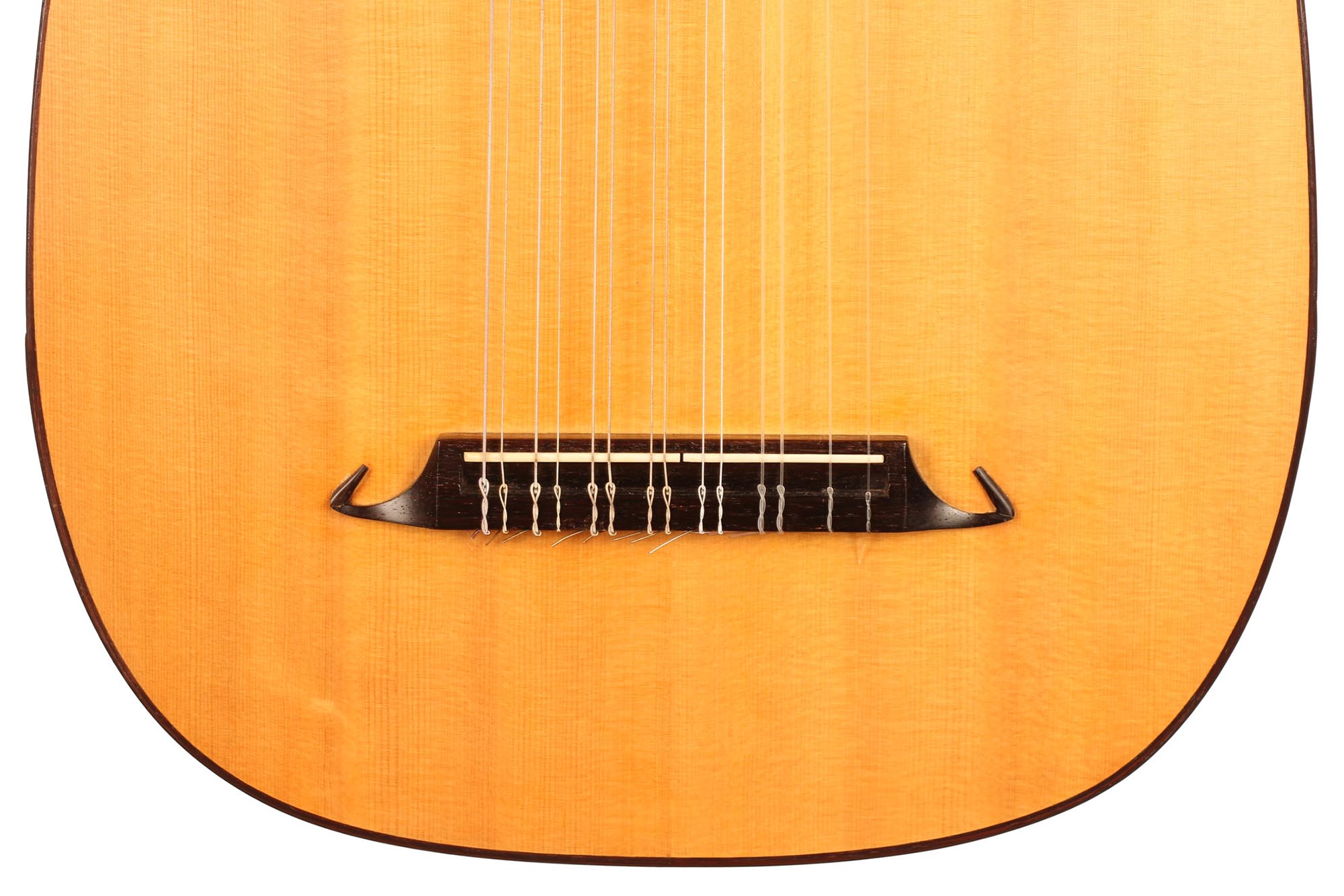 This 8 courses lute is a gorgeous example of David José Rubio’s high-quality workmanship. It is generously decorated with fine marquetry inlays on the head and the neck. This instrument was built based on the model of Bream’s 1967 8 courses lute, featuring the two first two strings as single-strings, the inlaid frets and the elevated first-string peg. This lute is in excellent condition, no cracks nor repairs have occurred. This lute only has some handling wear on the top of the head and some imperceptible playing marks on the top. It is a rare opportunity to see a lute made by this great English master and an even bigger event to have the chance to approach such a gorgeously decorated instrument made on the model of Julian Bream’s one.