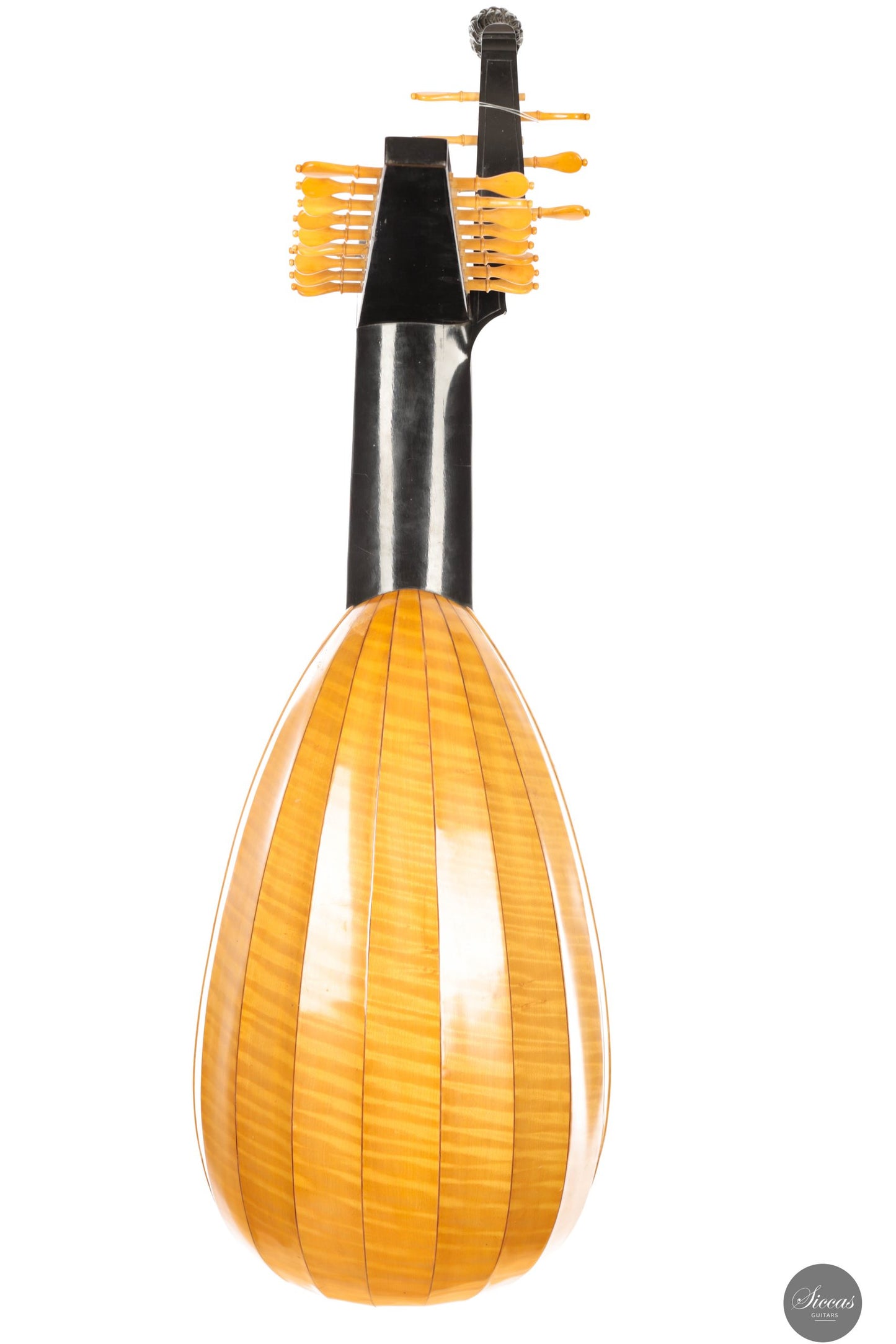 Der Korpus besteht aus wunderschön geflammten Ahornspänen, die abwechselnd angeordnet sind und so ein eindrucksvolles Streifenmuster erzeugen. Dieses zieht sich bis in den Hals und verleiht der Laute eine eindrucksvolle visuelle Harmonie. Klanglich überzeugt das Instrument durch Wärme, Ausgewogenheit und Klarheit in allen Lagen – ideal für den professionellen Konzertgebrauch.