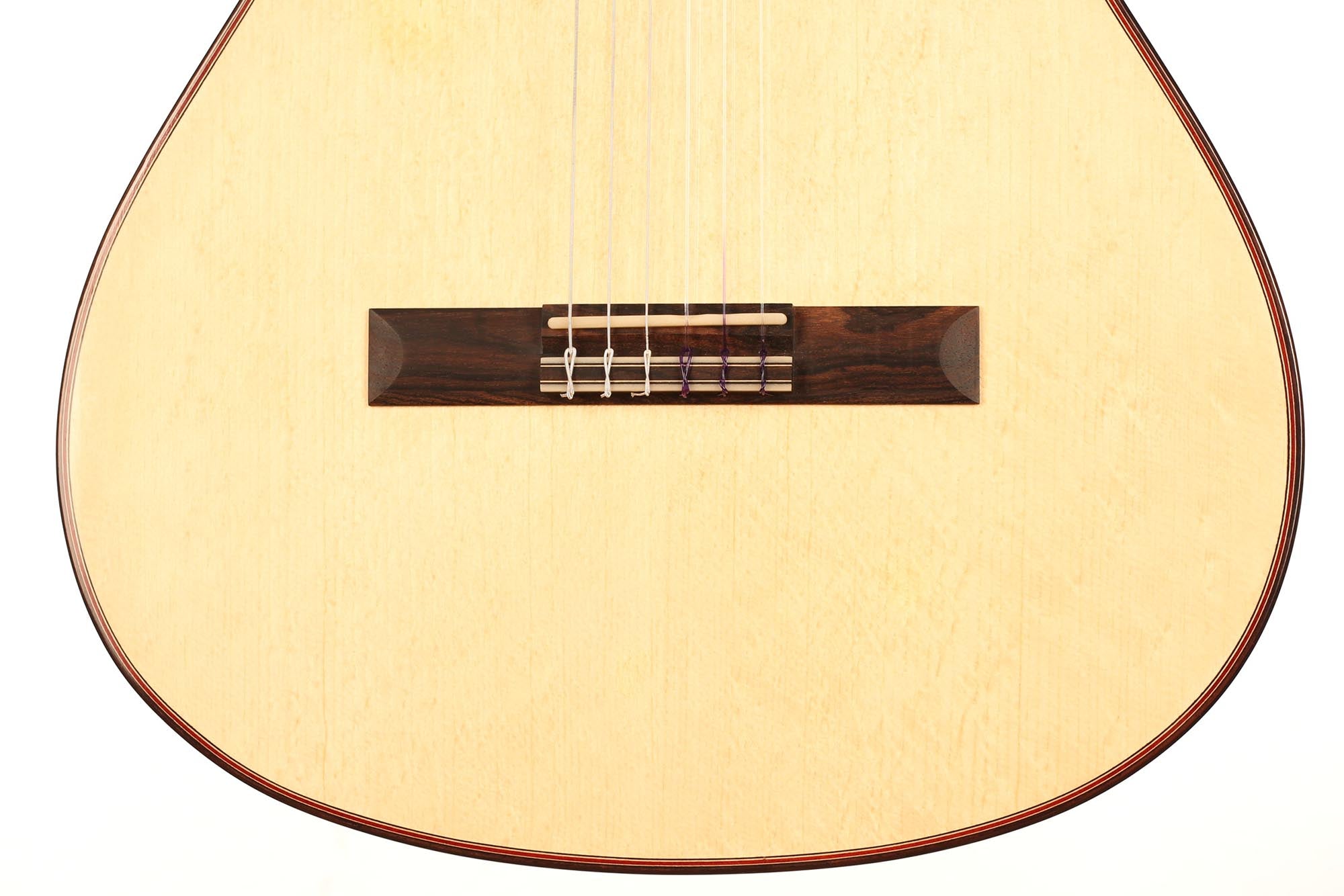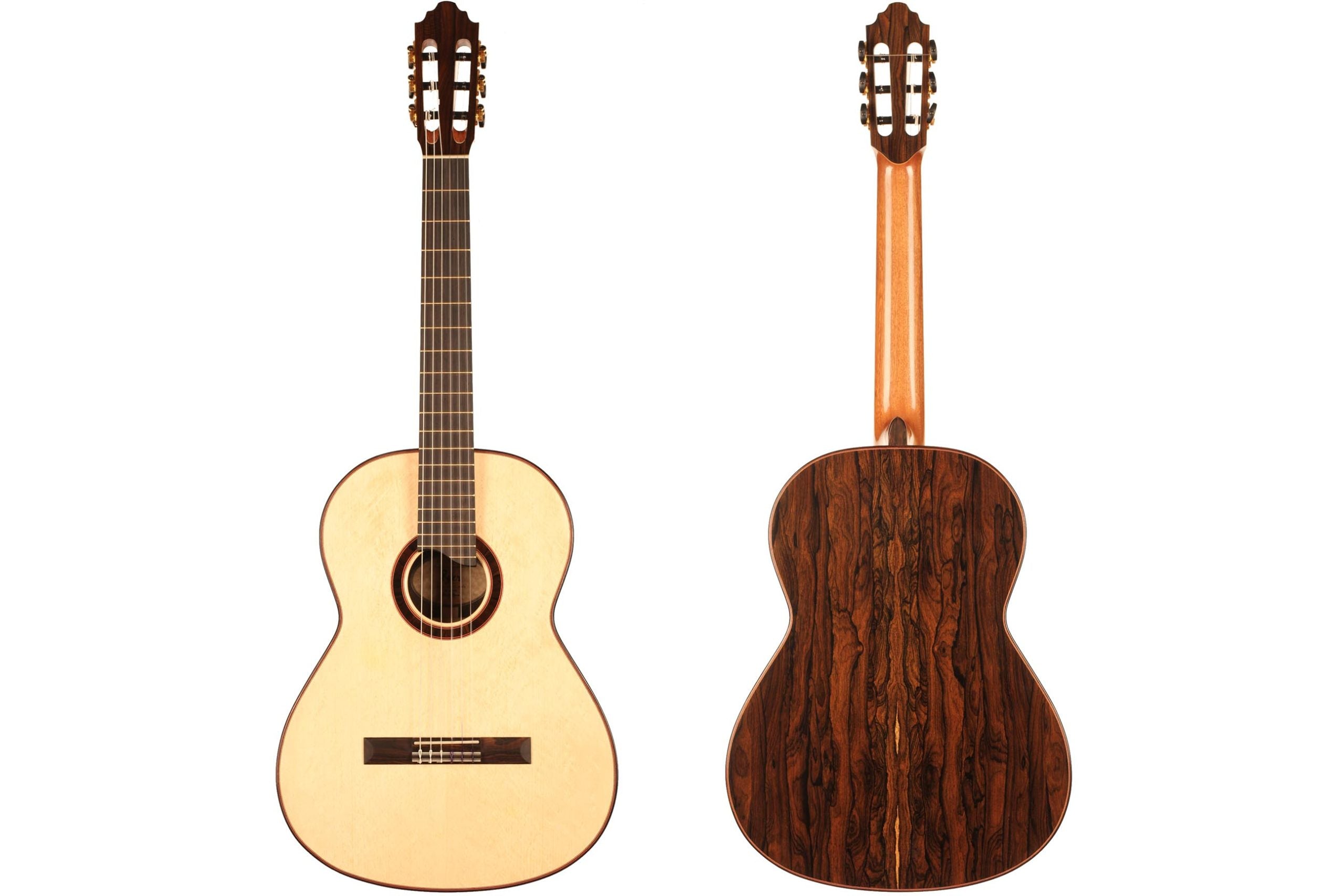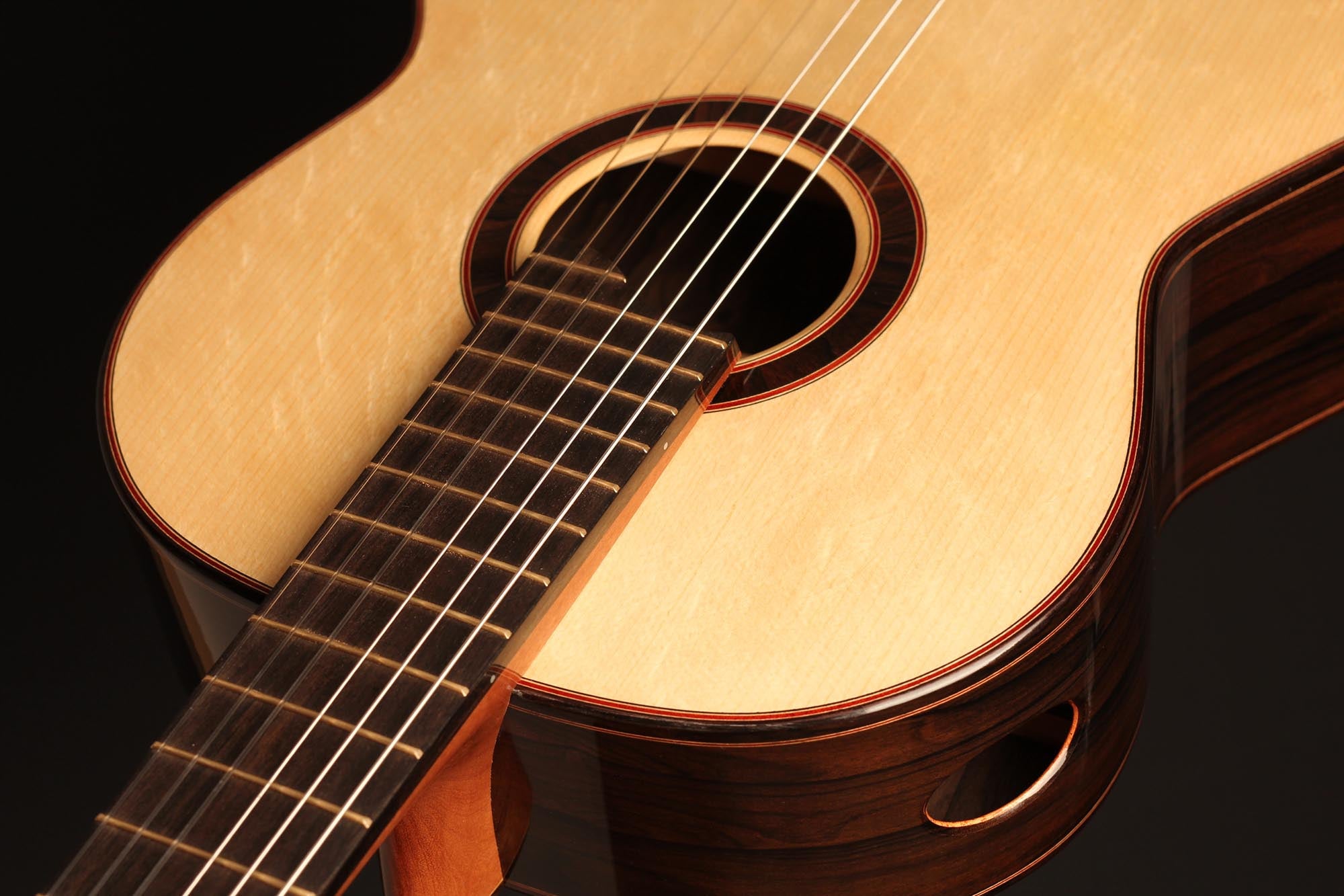 This spruce double-top guitar is absolutely fantastic. It is an incredibly powerful and direct instrument with an immediate response, a huge volume and a clear sound. The bear-clawed spruce top is definitely one of the most impressive we’ve ever seen at the shop. This instrument also features a sound port, making it an optimal guitar for chamber music and recitals.