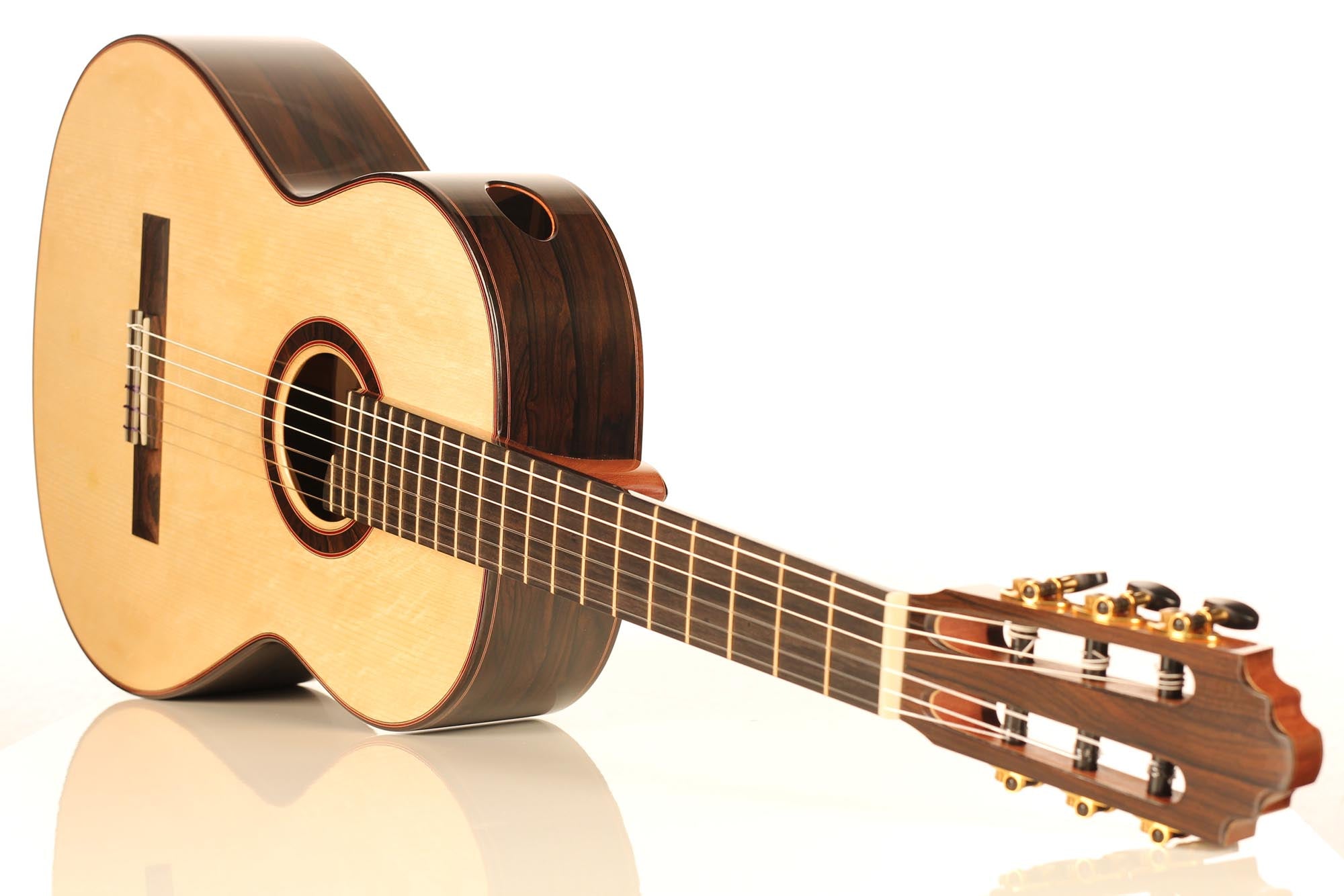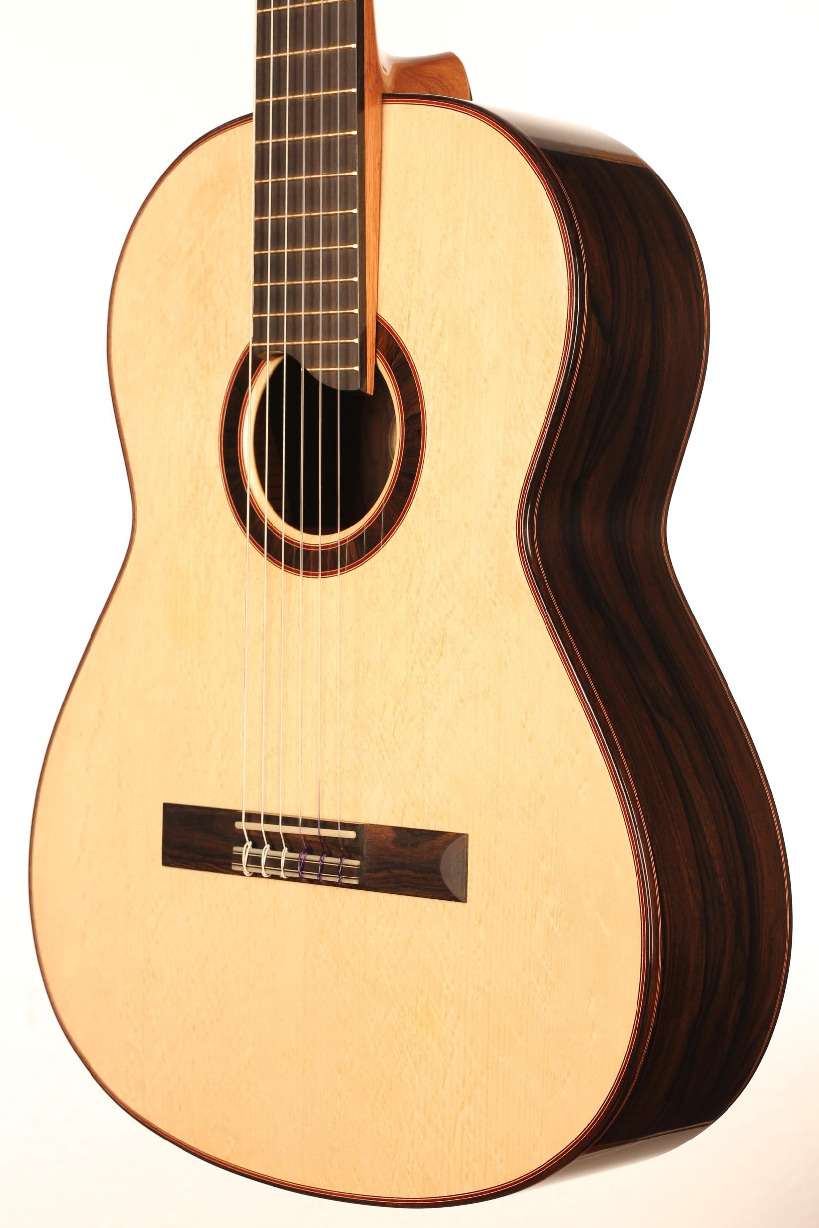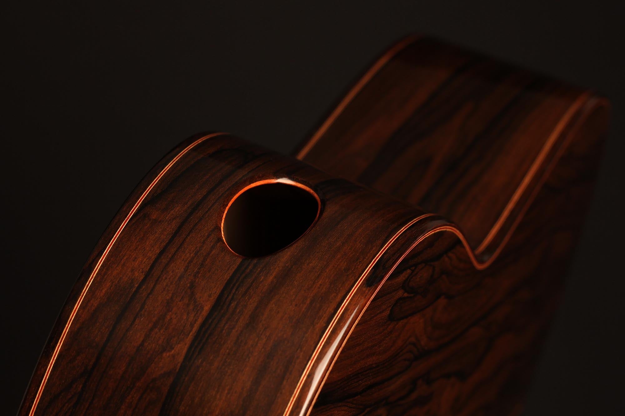 This spruce double-top guitar is absolutely fantastic. It is an incredibly powerful and direct instrument with an immediate response, a huge volume and a clear sound. The bear-clawed spruce top is definitely one of the most impressive we’ve ever seen at the shop. This instrument also features a sound port, making it an optimal guitar for chamber music and recitals.