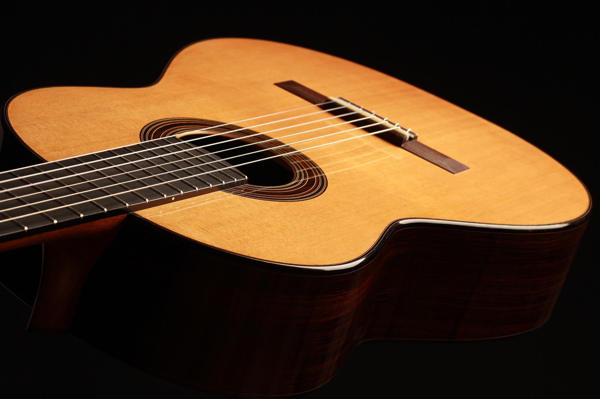 Diese wunderschöne 2017 Dennis Tolz Gitarre ist in ausgezeichnetem Zustand, mit nur wenigen oberflächlichen Spielspuren auf der Decke. Der Klang ist einfach atemberaubend: Sie hat eine kraftvolle Klangfülle, eine perfekte Balance und charmante Klangfarben. Die Bespielbarkeit ist fantastisch, und sie kann jeden Konzertsaal ausfüllen. All diese Eigenschaften unterstützen den Gitarristen bei Live-Auftritten und Wettbewerben, wenn es um ein 100% zuverlässiges Instrument in Bezug auf Klang, Lautstärke und Spielkomfort geht.