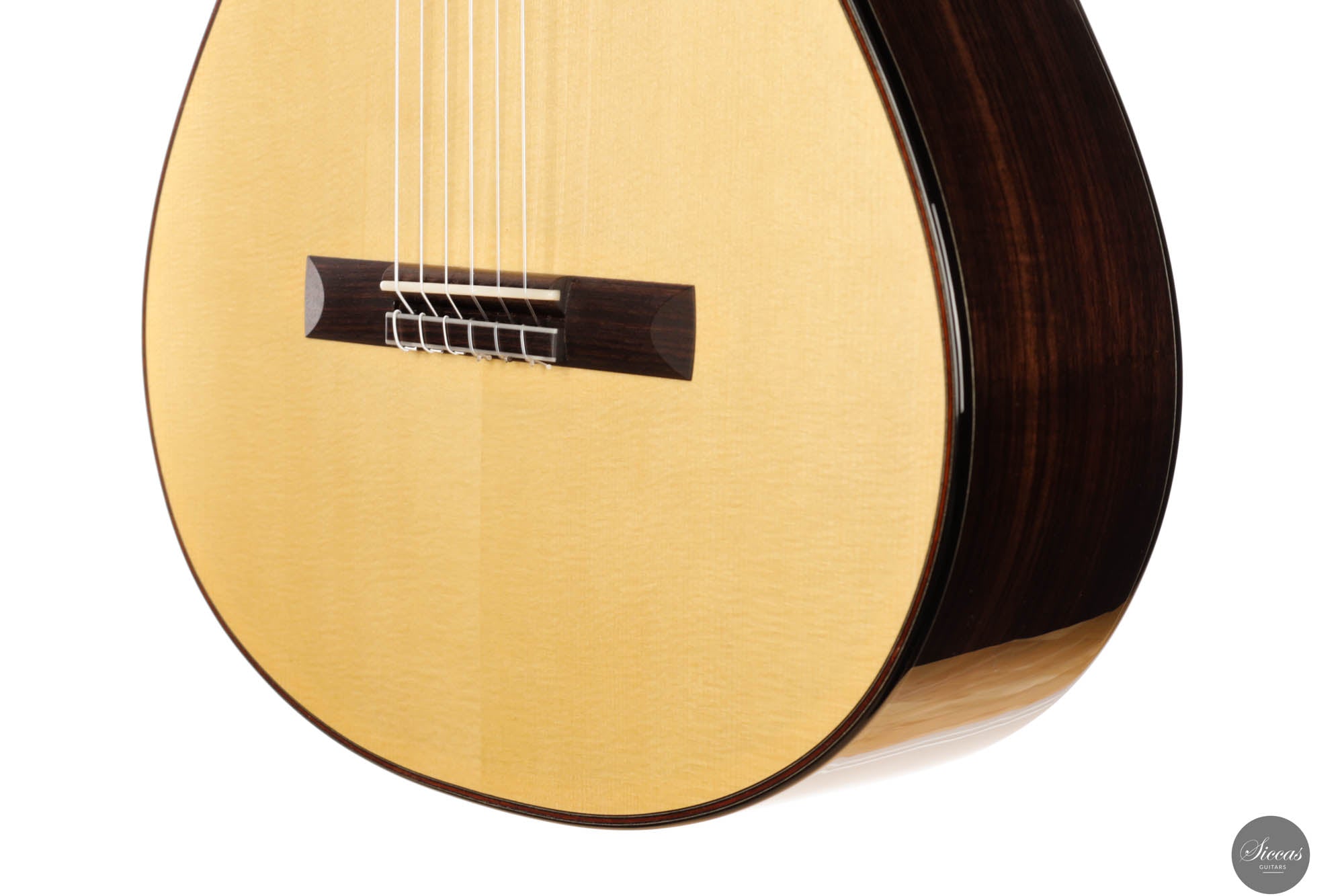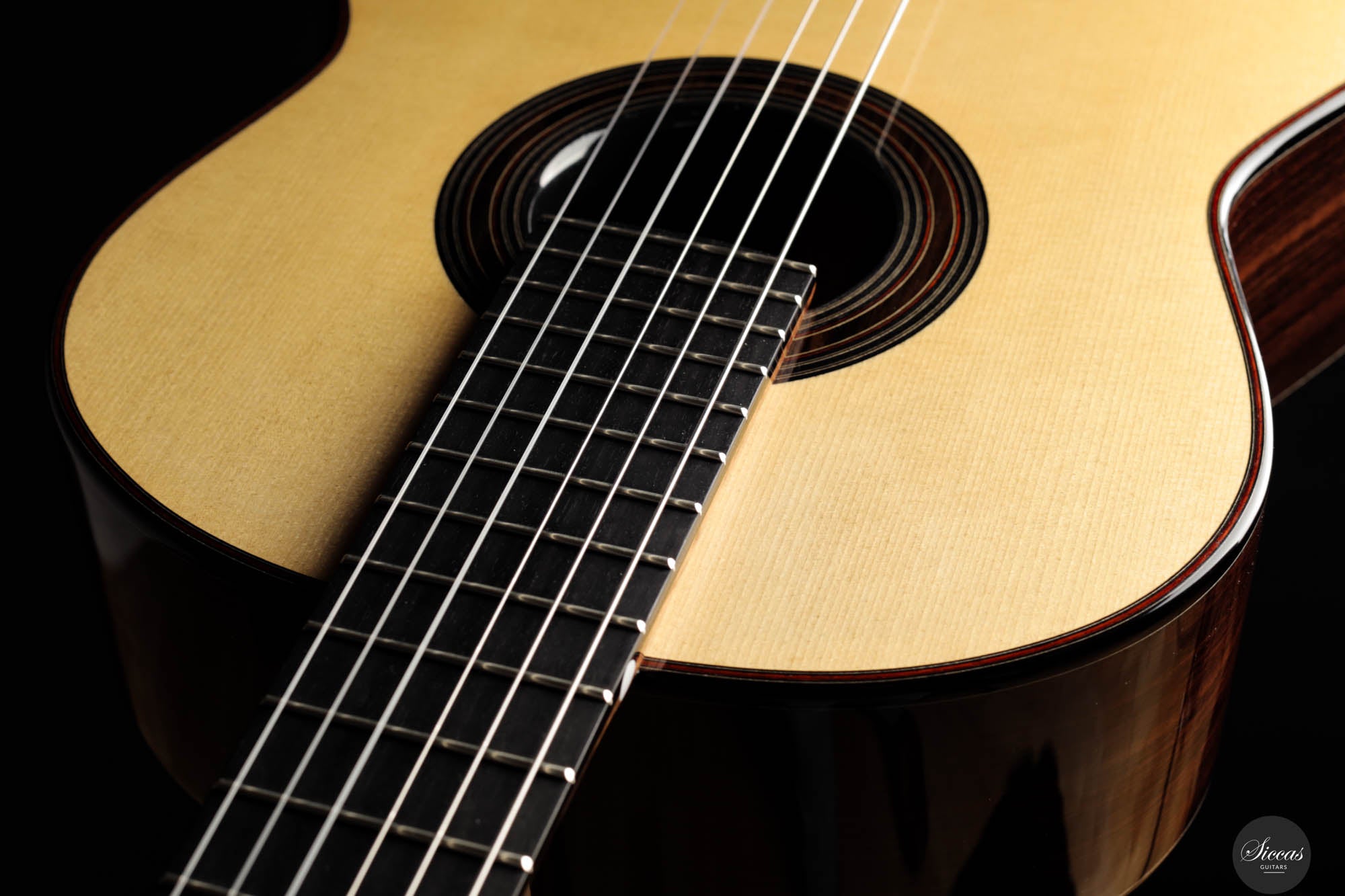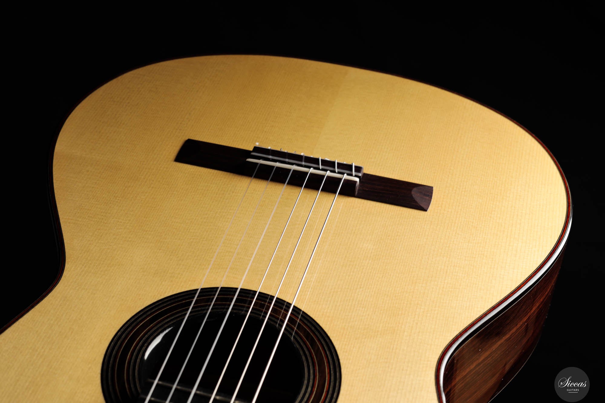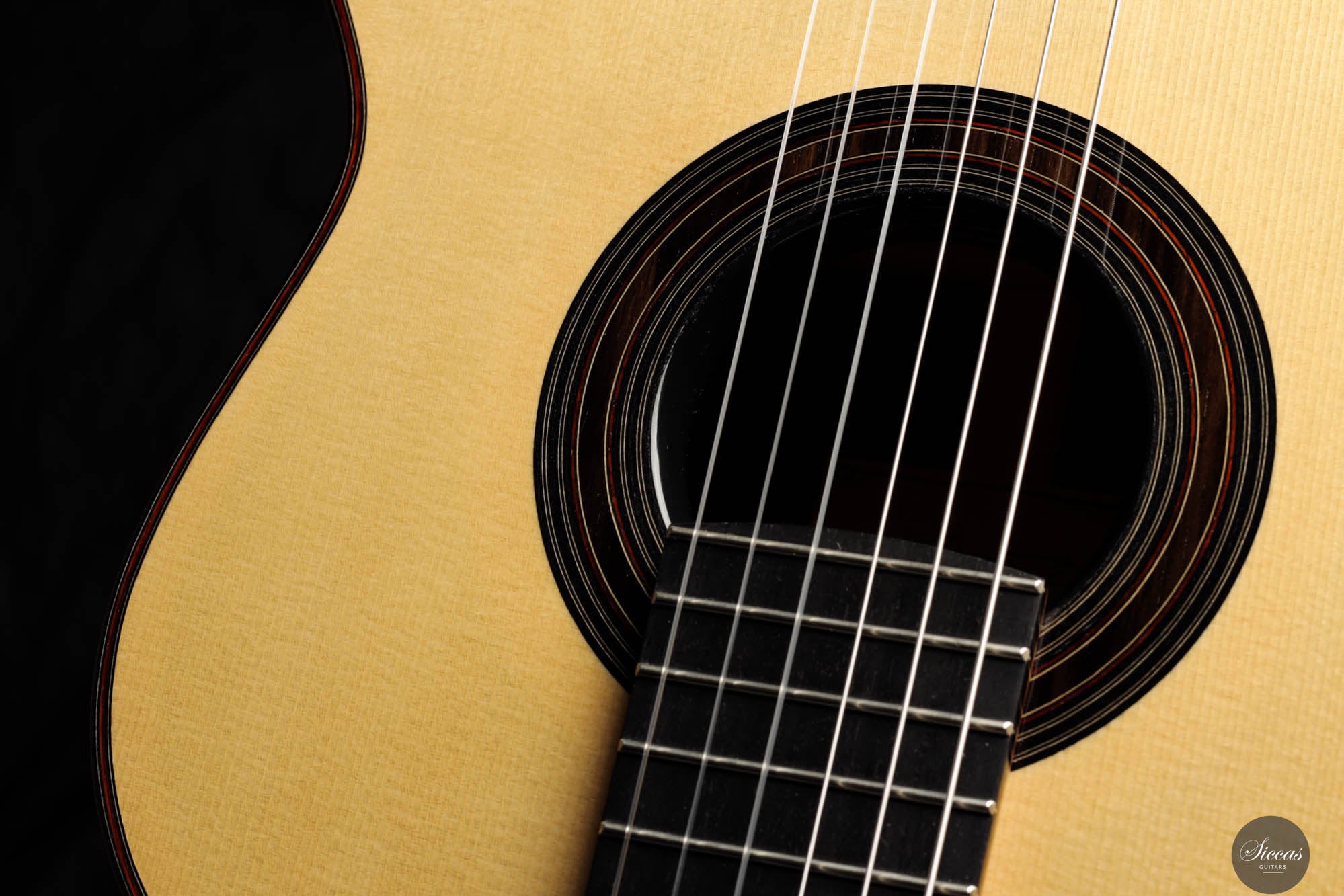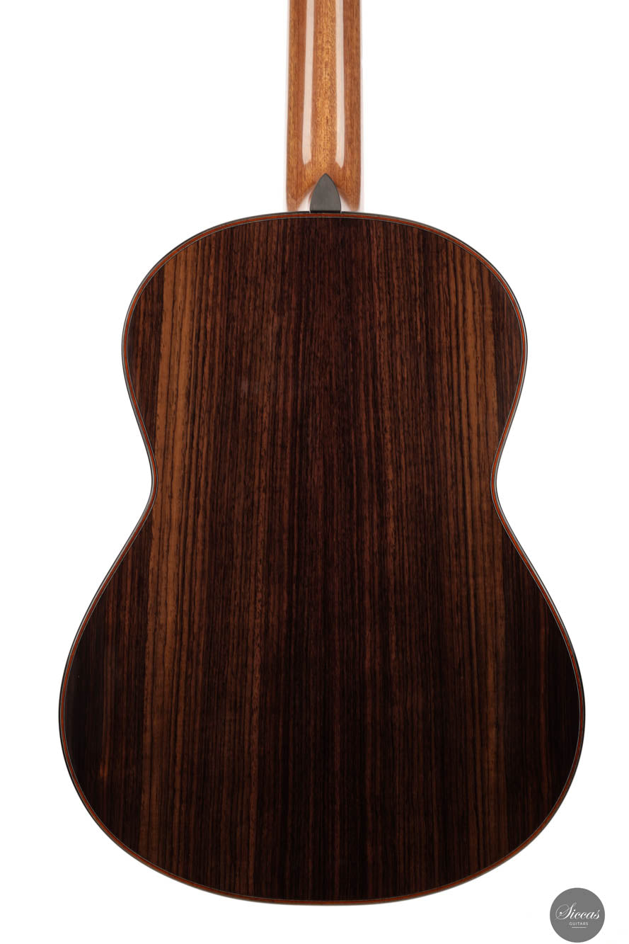 Diese exquisite Gitarre, gefertigt von Dennis Tolz, ist ein Paradebeispiel für zeitgenössischen Gitarrenbau in höchster Vollendung und zeigt eine perfekte Mischung aus Balance und Eleganz. Das Design des Instruments spiegelt Tolz' Hingabe zu intelligentem und raffiniertem Gitarrenbau wider, wobei jedes Detail sorgfältig durchdacht ist, um eine harmonische Verbindung von Form und Funktion zu schaffen. Die Double-Top-Schalldecke mit einer äußeren Schicht aus Fichte und einer inneren Schicht aus Zeder ist ein Zeugnis für dieses Engagement. Diese Kombination, zusammen mit der traditionellen, leichten Fächerbeleistung, verleiht der Gitarre eine fantastische Projektion, während sie einen warmen, präzisen und charmanten Ton beibehält. Die Seiten der Gitarre sind mit Zypressenholz verdoppelt, was nicht nur die strukturelle Integrität des Instruments verbessert, sondern auch zu seiner bemerkenswerten Klangprojektion beiträgt. Diese durchdachte Konstruktion stellt sicher, dass die Gitarre nicht nur wunderschön spielt, sondern auch in Bezug auf Haltbarkeit und Klangqualität heraussticht.