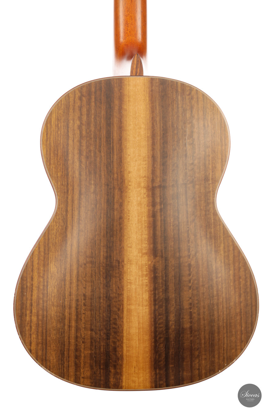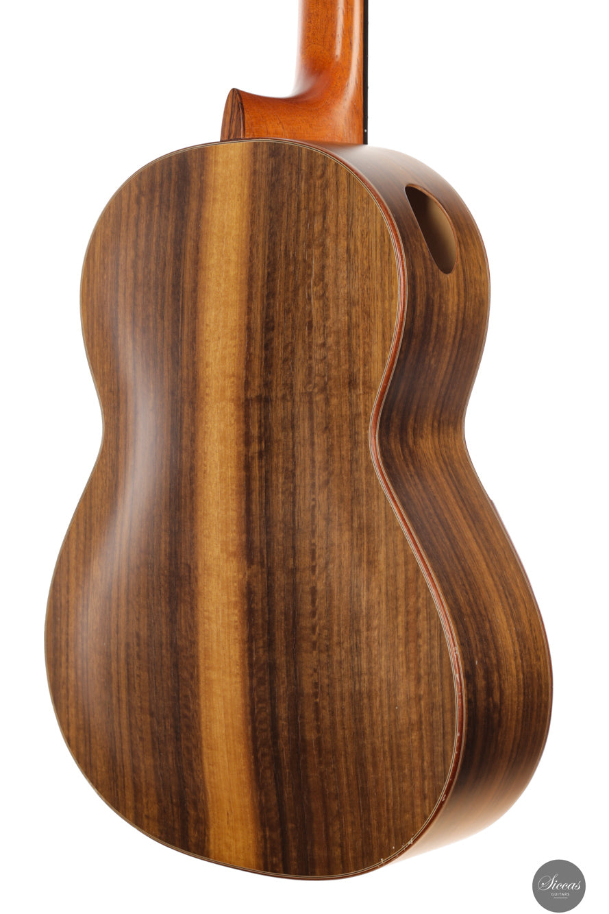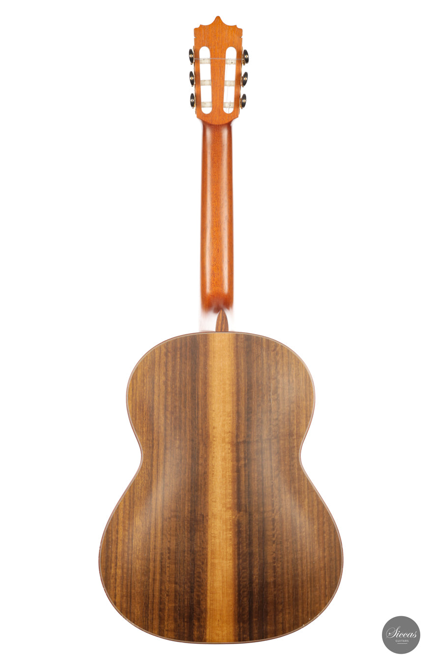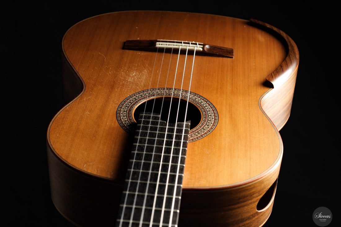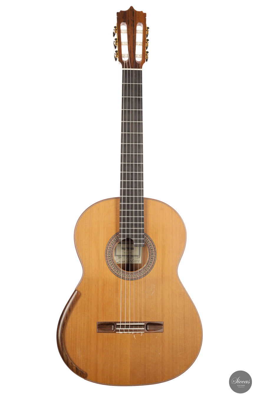 Diese Konzertgitarre von Diego Valencia aus dem Jahr 2016 verkörpert sein ausgereiftes Konzept des lattice-Baus und richtet sich an Spieler, die gezielt nach starker Projektion und klarer Stimmtrennung suchen. Die Zederndecke in Kombination mit Zargen und Boden aus Pau Ferro ergibt ein Klangbild mit schneller Ansprache und kräftigem Grundton, ergänzt durch eine charakteristische Wärme. Die Gitarre bietet eine hohe klangliche Tragfähigkeit, ohne dabei an Kontrolle einzubüßen, und eignet sich gleichermaßen für solistische wie kammermusikalische Kontexte. Die Ausgewogenheit über das gesamte Register hinweg und ein fokussiertes Sustain unterstützen sowohl kantables Spiel als auch präzise Polyphonie.
