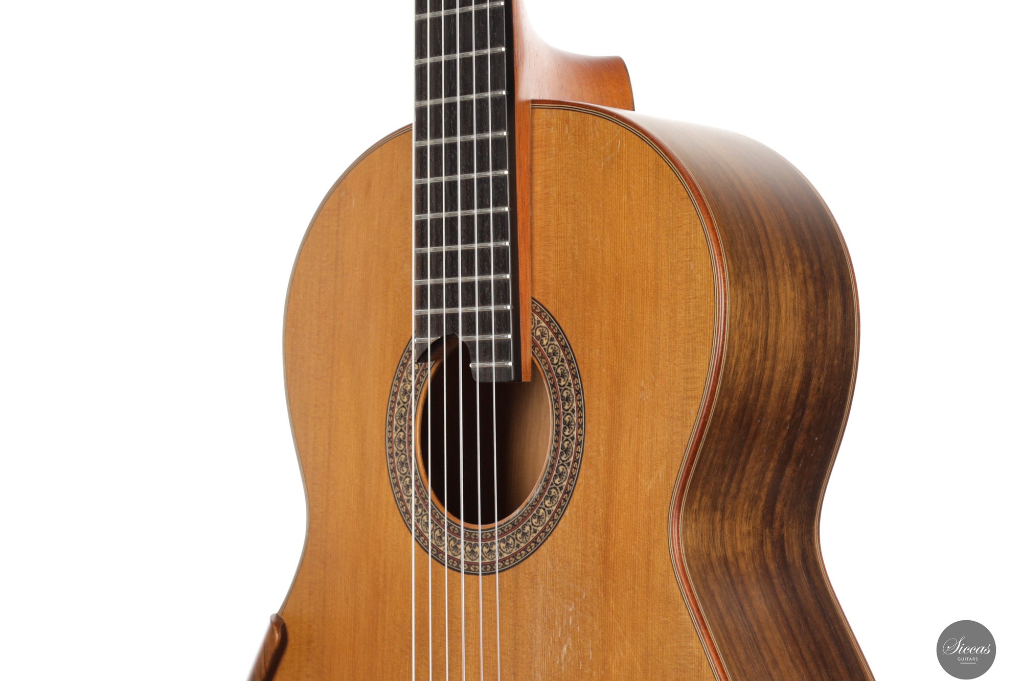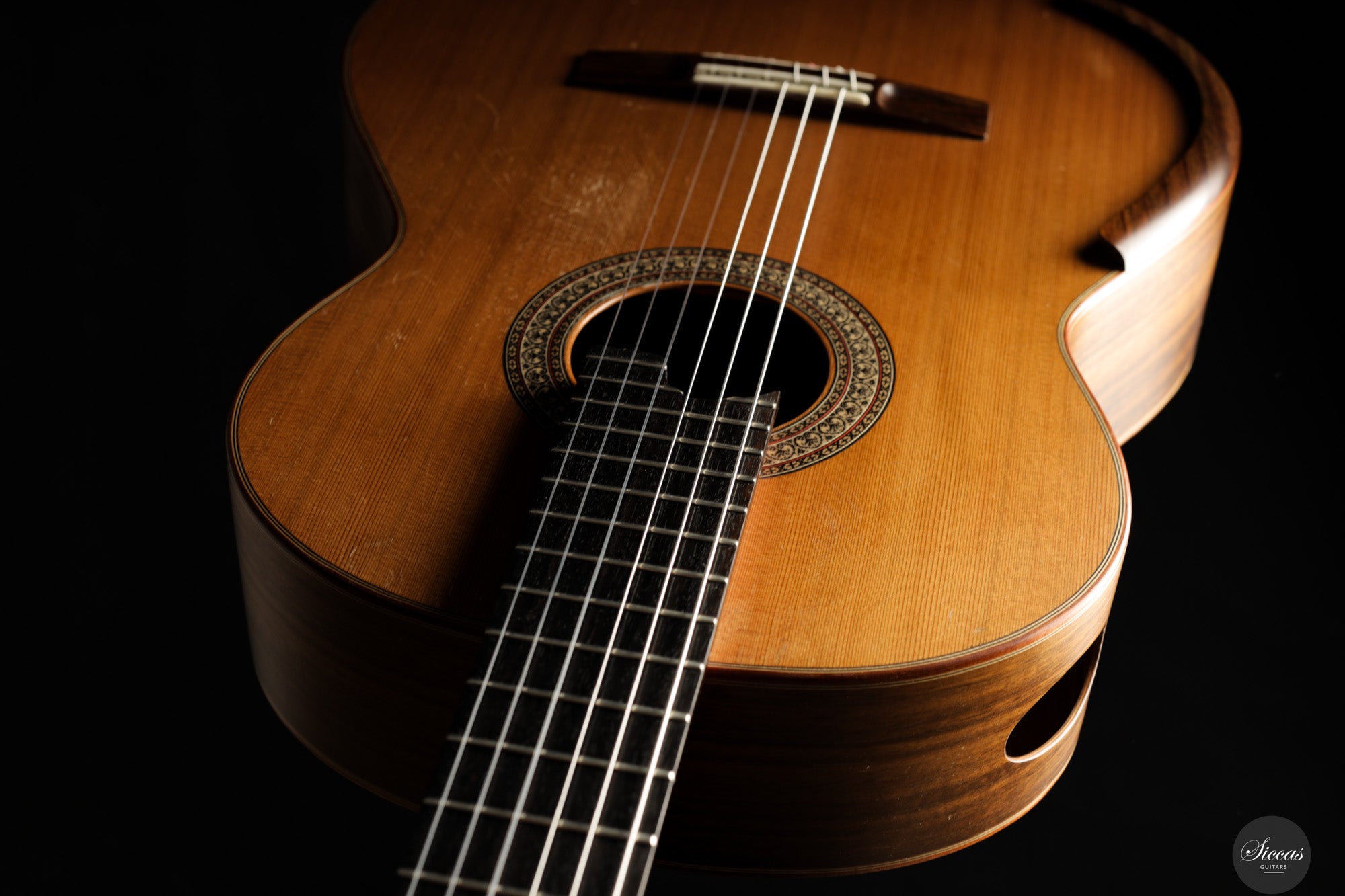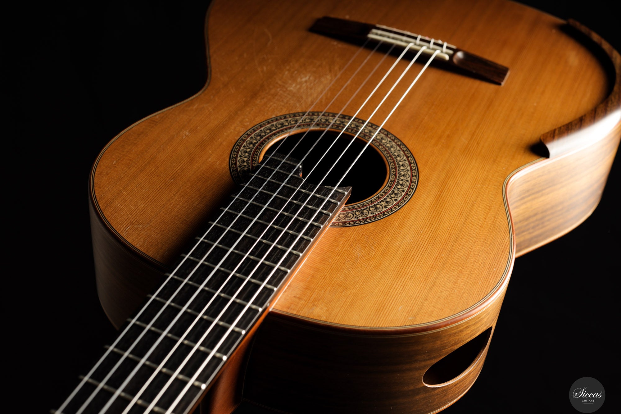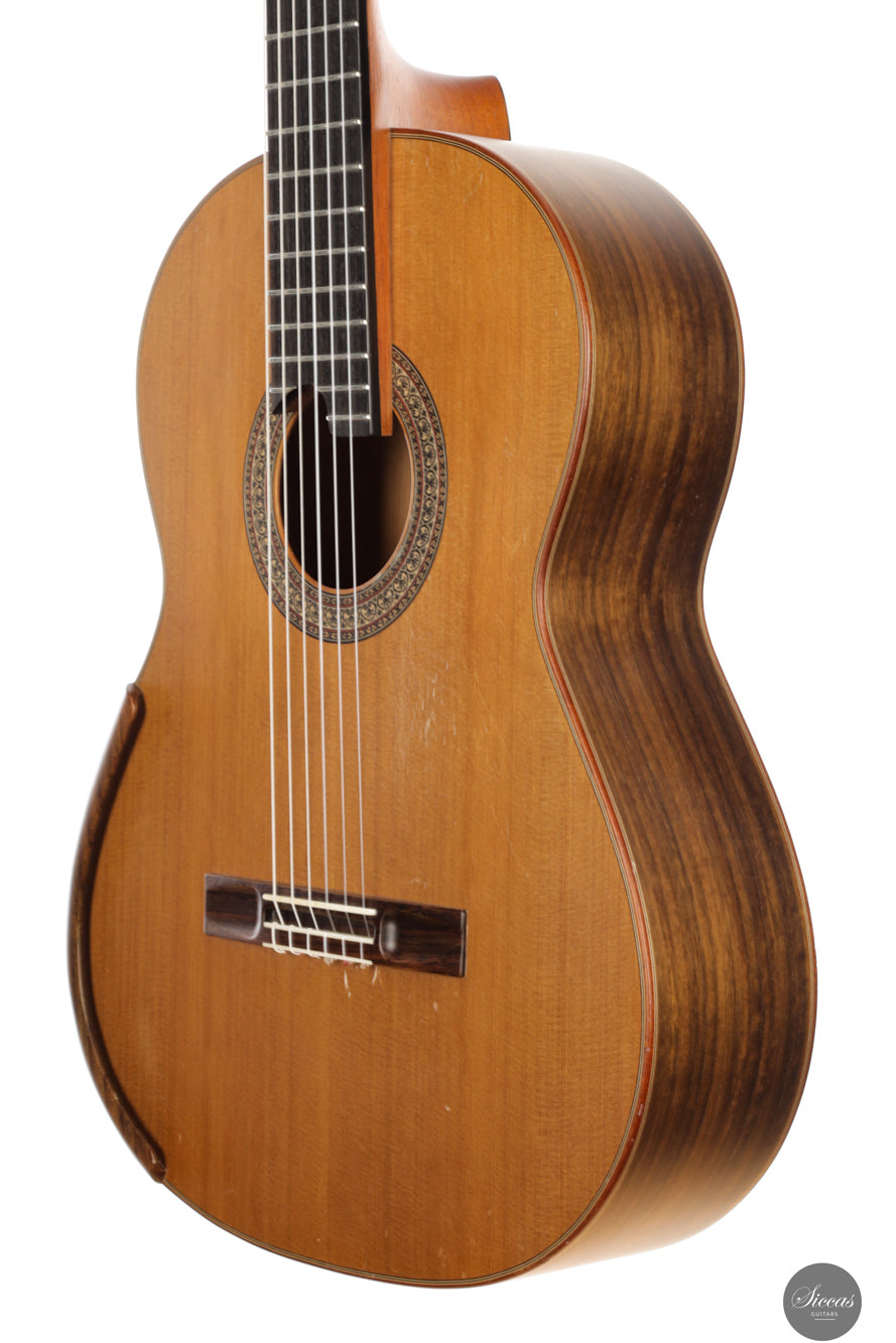 Diese Konzertgitarre von Diego Valencia aus dem Jahr 2016 verkörpert sein ausgereiftes Konzept des lattice-Baus und richtet sich an Spieler, die gezielt nach starker Projektion und klarer Stimmtrennung suchen. Die Zederndecke in Kombination mit Zargen und Boden aus Pau Ferro ergibt ein Klangbild mit schneller Ansprache und kräftigem Grundton, ergänzt durch eine charakteristische Wärme. Die Gitarre bietet eine hohe klangliche Tragfähigkeit, ohne dabei an Kontrolle einzubüßen, und eignet sich gleichermaßen für solistische wie kammermusikalische Kontexte. Die Ausgewogenheit über das gesamte Register hinweg und ein fokussiertes Sustain unterstützen sowohl kantables Spiel als auch präzise Polyphonie.