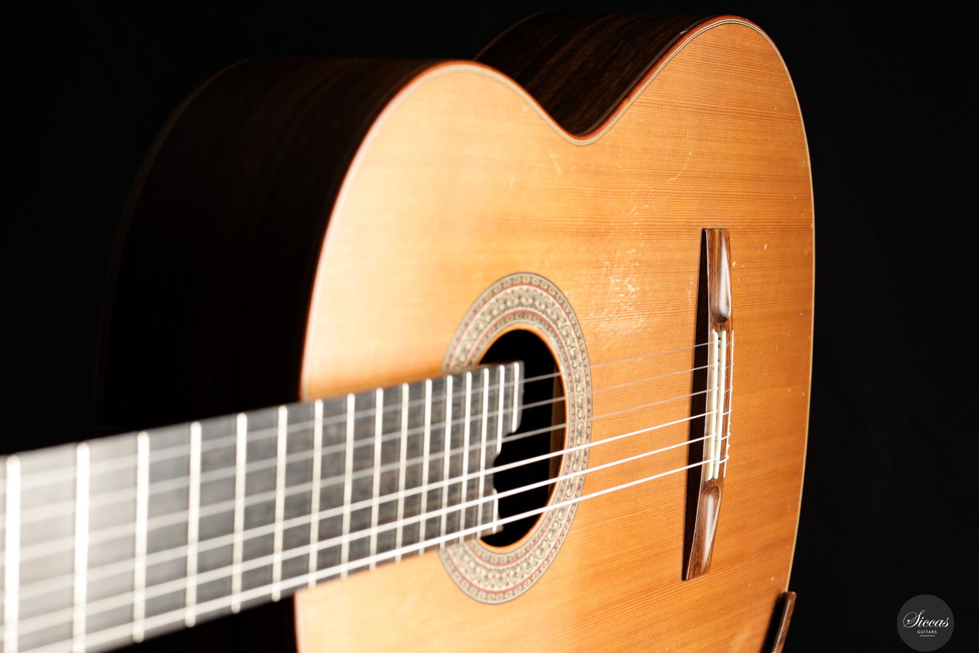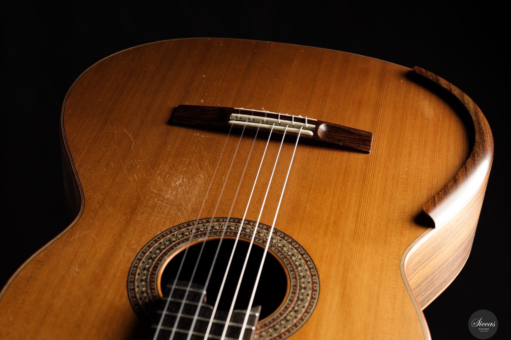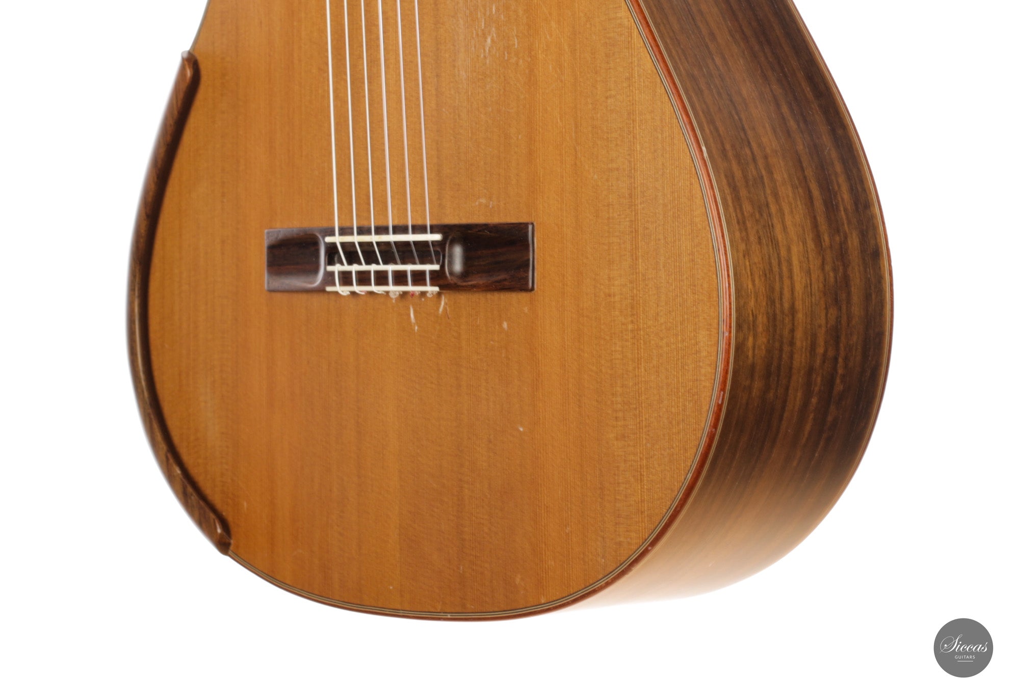 Die Gitarre weist deutliche Gebrauchsspuren auf. Die Decke zeigt mehrere tiefe Kratzer, und der Nitrozelluloselack auf Boden und Zargen ist stark gerissen. Es sind keine offenen Risse vorhanden, die strukturelle Stabilität ist gegeben.