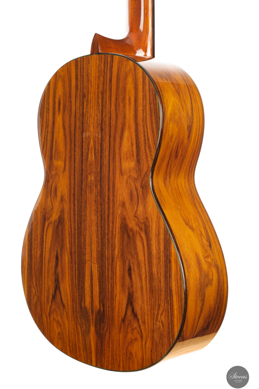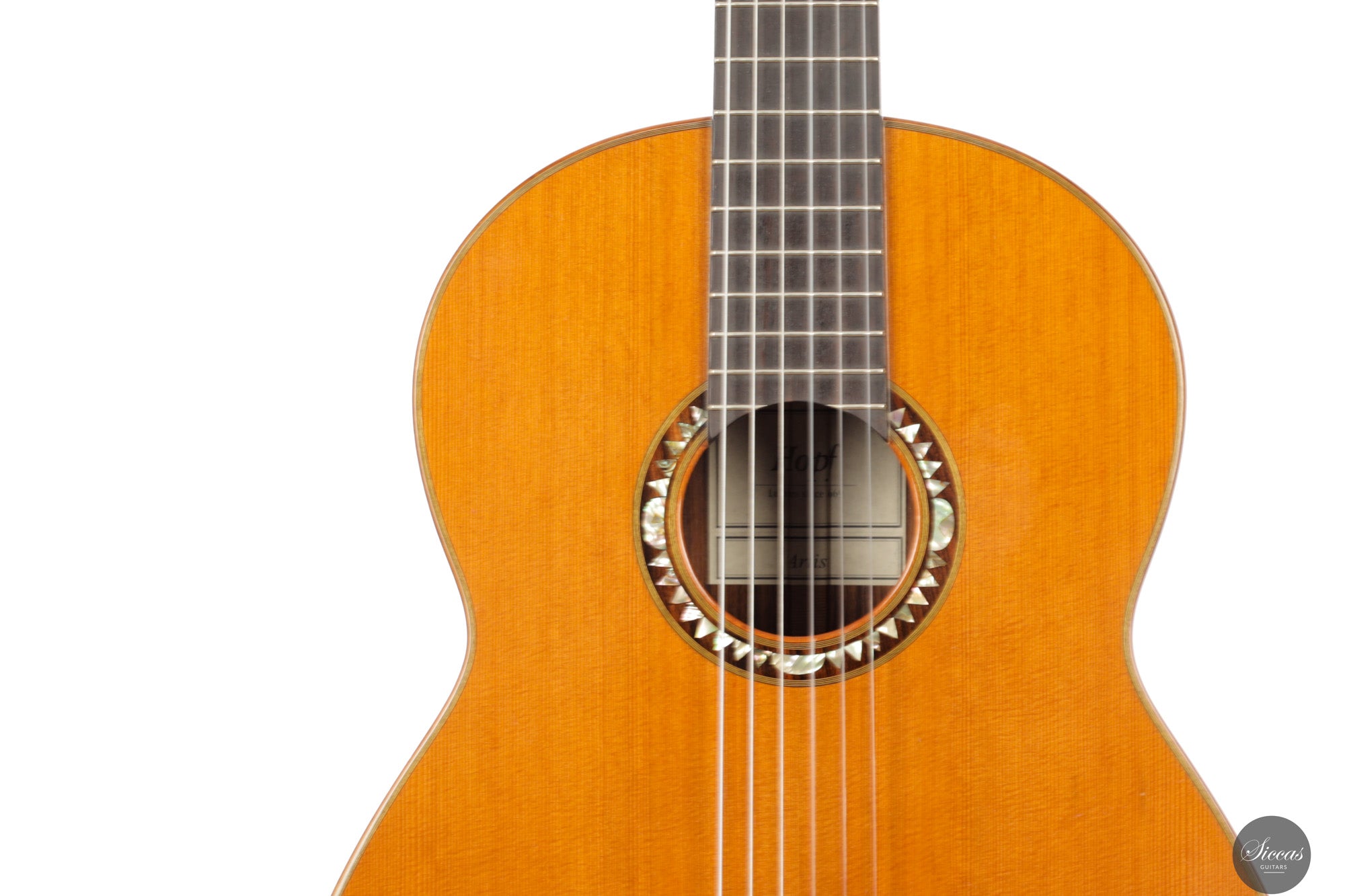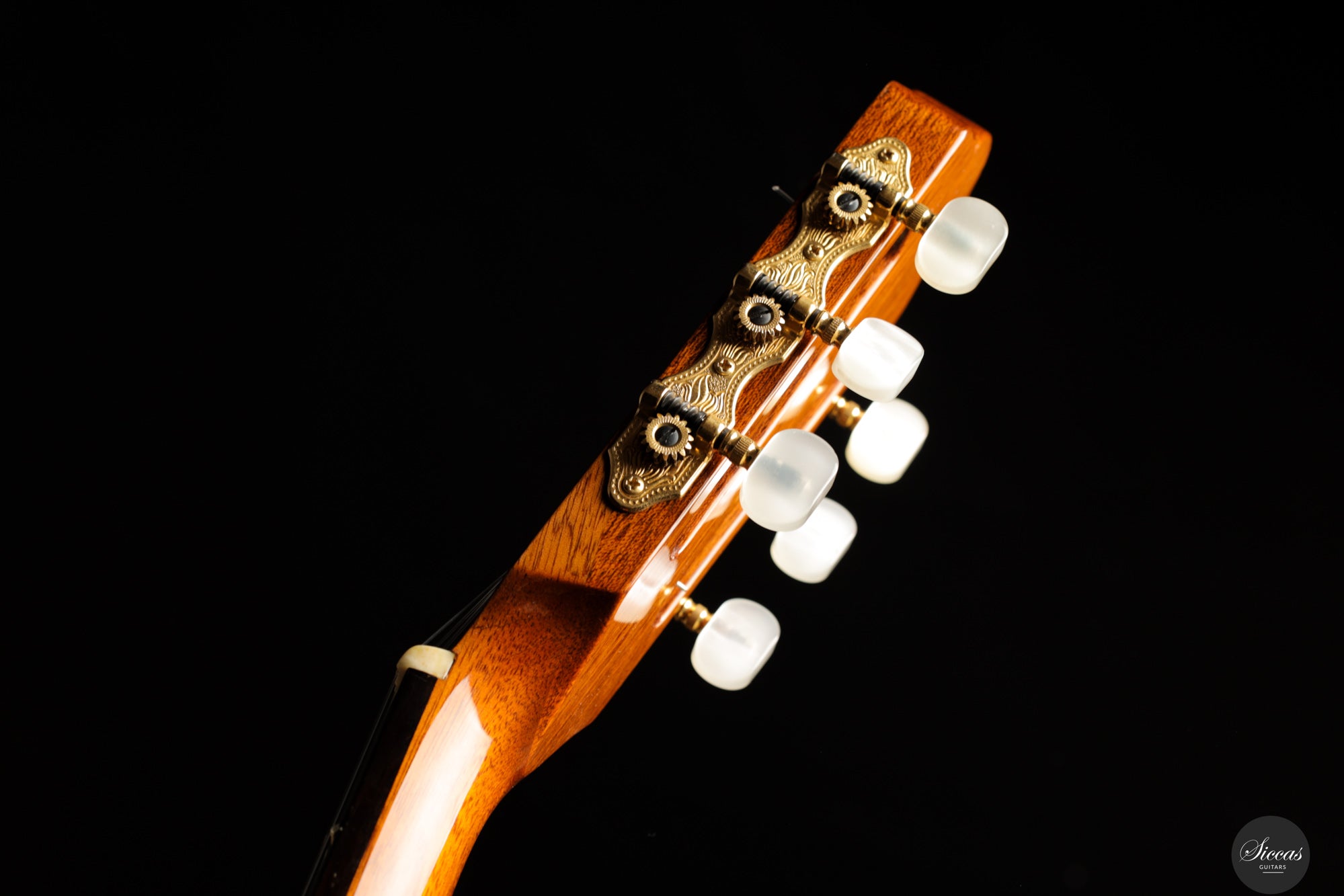Diese Konzertgitarre von Dieter Hopf aus dem Jahr 1980 repräsentiert den ausgereiften traditionellen Stil des Meisters. Die Decke aus Zeder und der Korpus aus Santos-Palisander erzeugen einen warmen, konzentrierten Klang mit sanftem Tonansatz und stabilem Sustain. Die Ansprache ist direkt, aber stets kontrolliert, was eine feine dynamische Abstufung und nuancierte Phrasierung ermöglicht. Die Ausgewogenheit zwischen den Registern ist sorgfältig abgestimmt und unterstützt sowohl kantable Melodieführung als auch dichte Polyphonie. Trotz ihres Alters überzeugt die Gitarre mit klarer Projektion und klanglicher Präsenz – ein Zeugnis für die Qualität von Materialwahl und Bauweise.