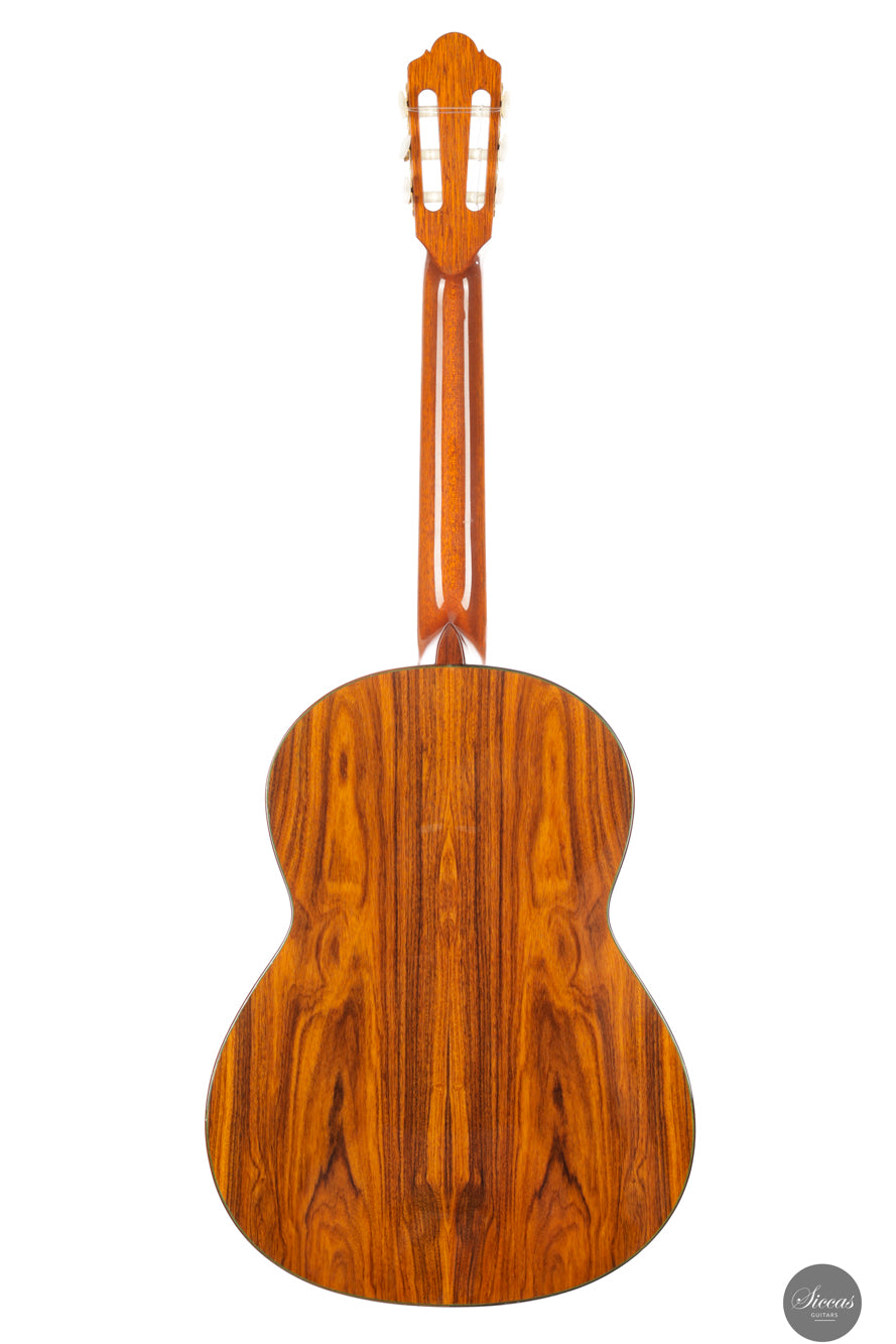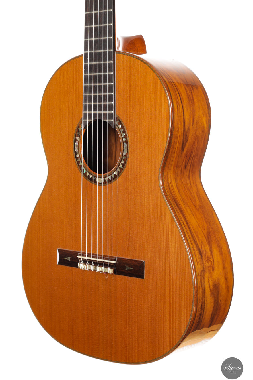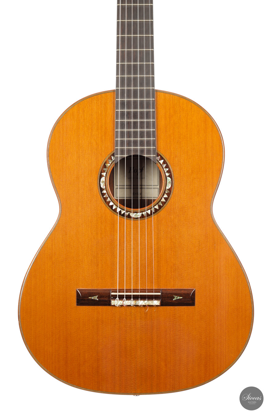 Dieter Hopf Konzertgitarre von 1980 in traditioneller Bauweise mit Zederndecke und Korpus aus Santos-Palisander. Warmer, ausgewogener Klang mit kontrollierter Ansprache.
