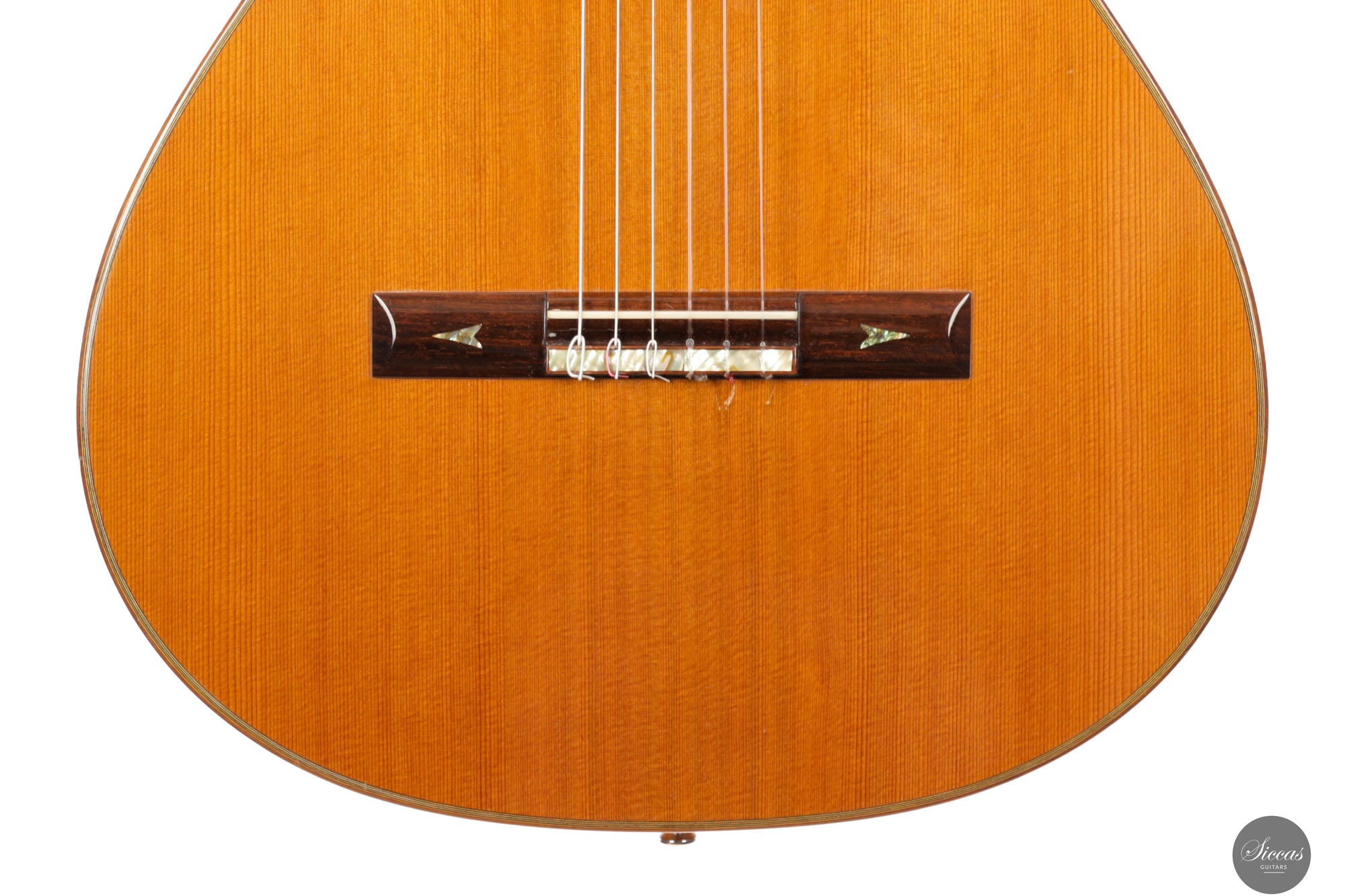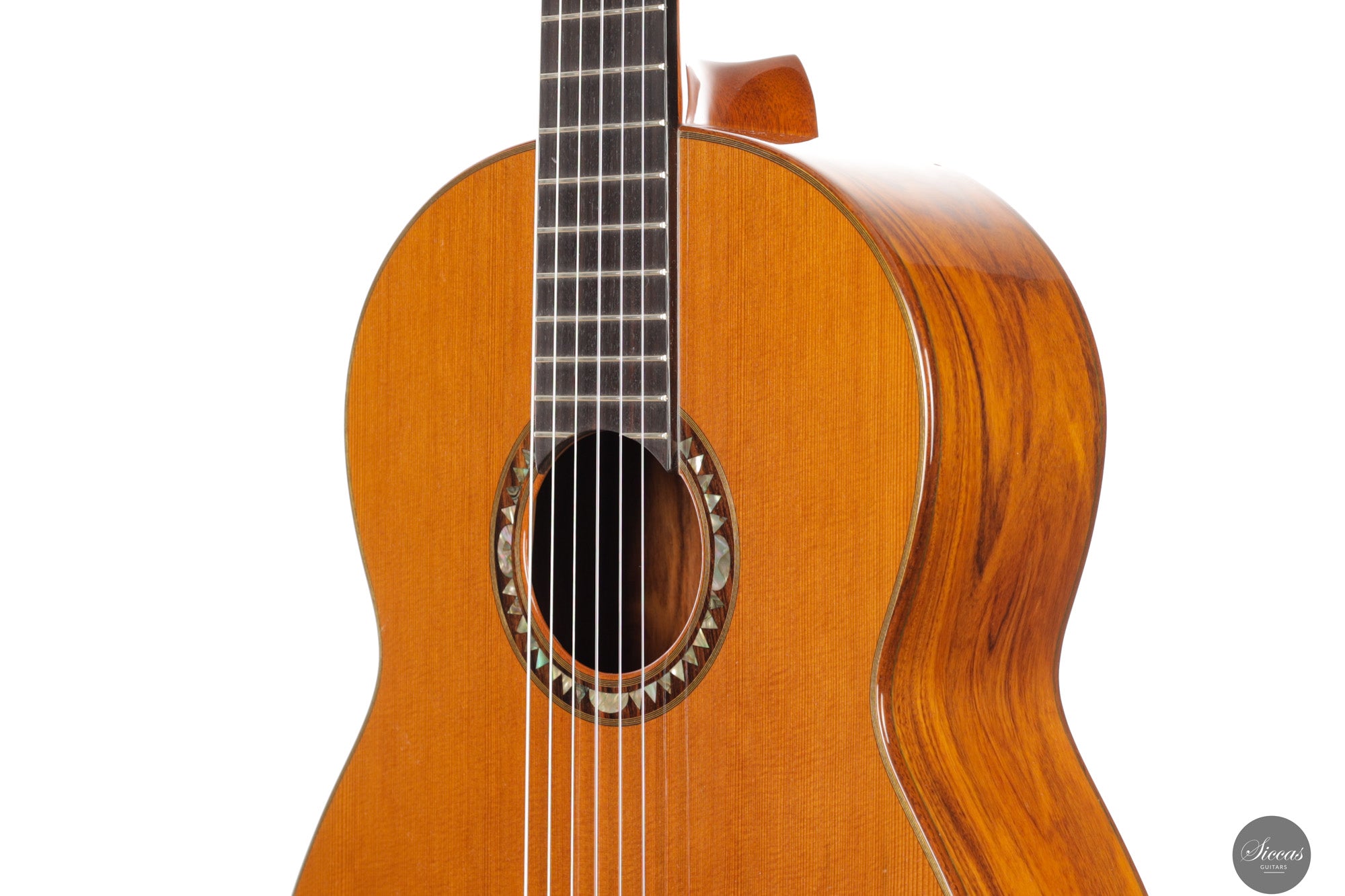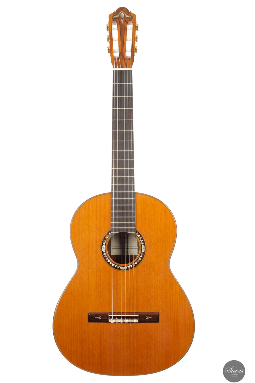 Dieter Hopf Konzertgitarre von 1980 in traditioneller Bauweise mit Zederndecke und Korpus aus Santos-Palisander. Warmer, ausgewogener Klang mit kontrollierter Ansprache.