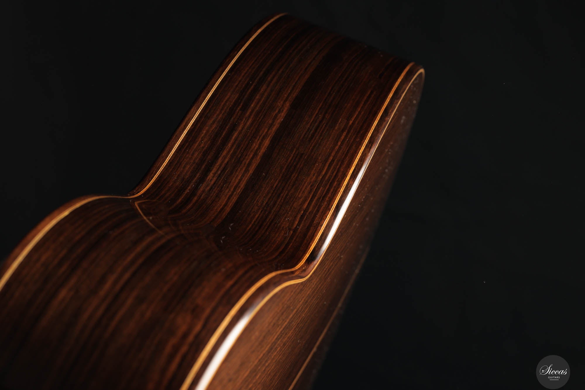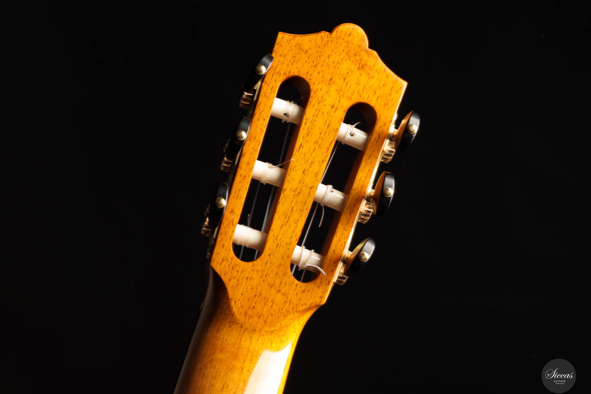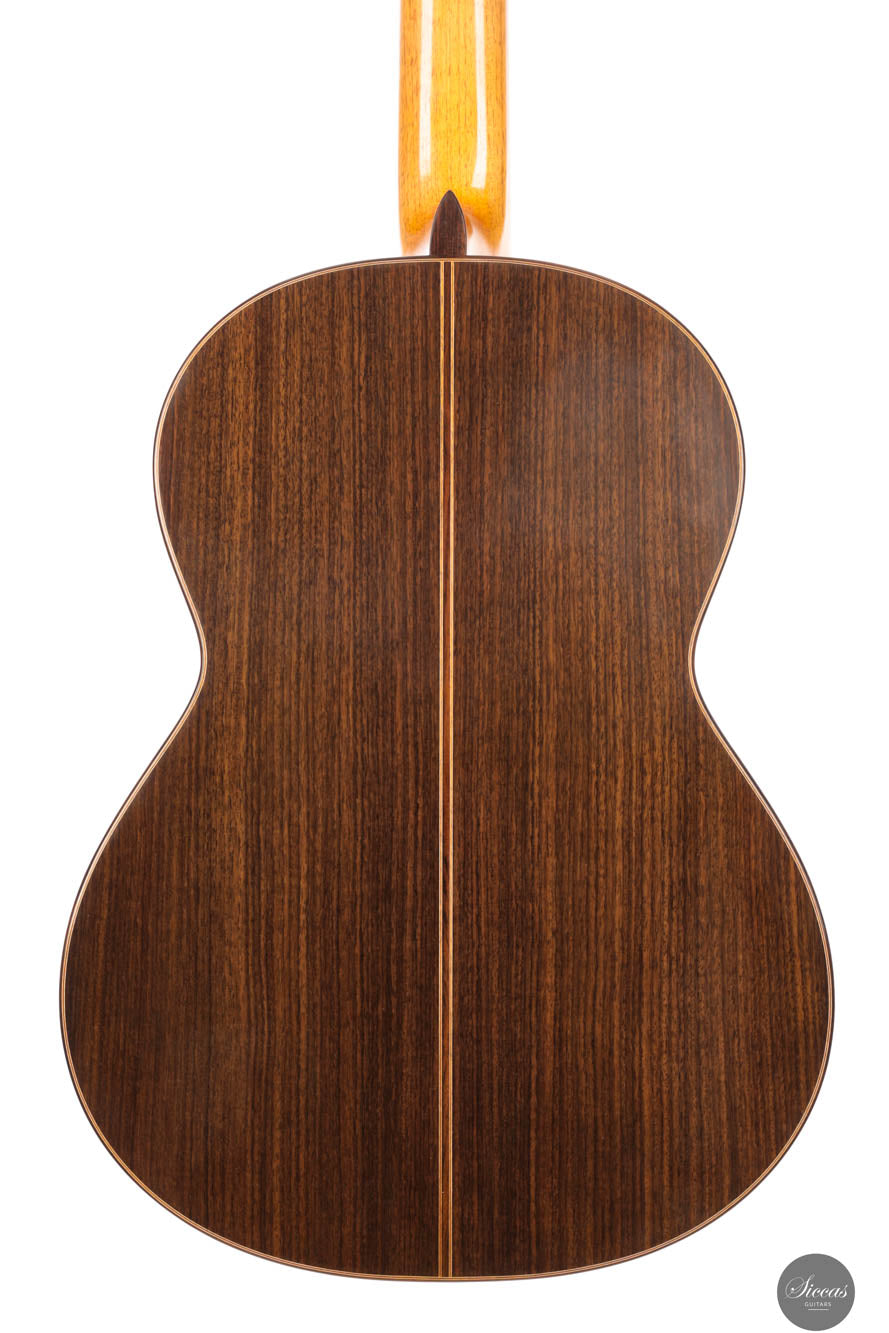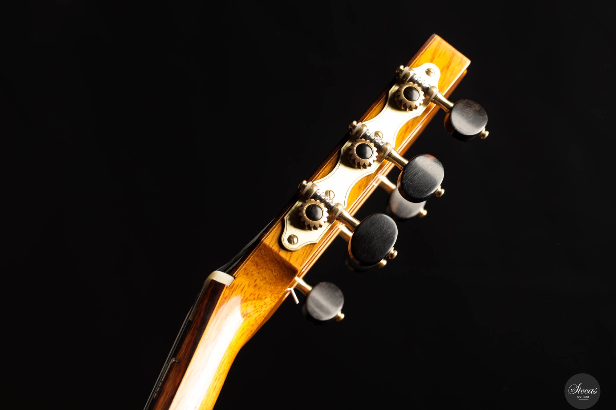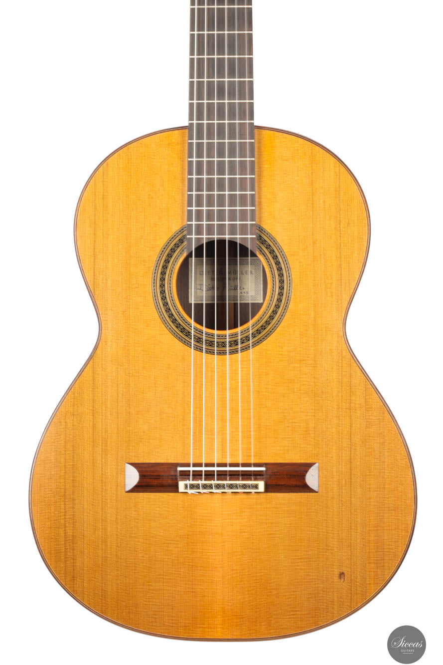 Diese Doubletop gitarre aus dem Jahr 2015 zeigt eindrucksvoll, dass auch frühere Arbeiten von Dieter Müller auf höchstem Niveau stehen. Trotz ihres Alters steht sie aktuellen Modellen in nichts nach – mit ausgezeichneter Tontrennung, warmem Sustain und einer reifen, entwickelten Klangfarbe. Zwar ist sie möglicherweise etwas weniger sensibel als Müllers neueste Instrumente, liefert aber dennoch einen kultivierten Ton mit großer Leichtigkeit und exzellenter Projektion. Die leichte Bauweise – ohne gedoppelte Zargen oder Boden – sorgt für hohen Spielkomfort, während das erhöhte Griffbrett den Zugang zu den oberen Lagen zusätzlich erleichtert. Die Schellackpolitur ist sorgfältig ausgeführt und unterstreicht die hohe handwerkliche Qualität des Instruments.