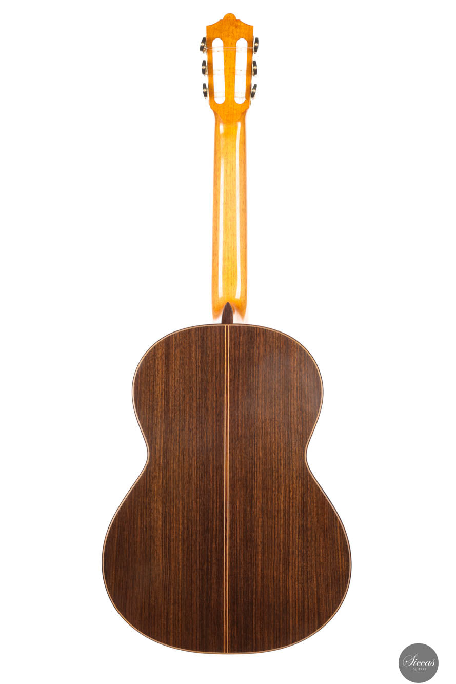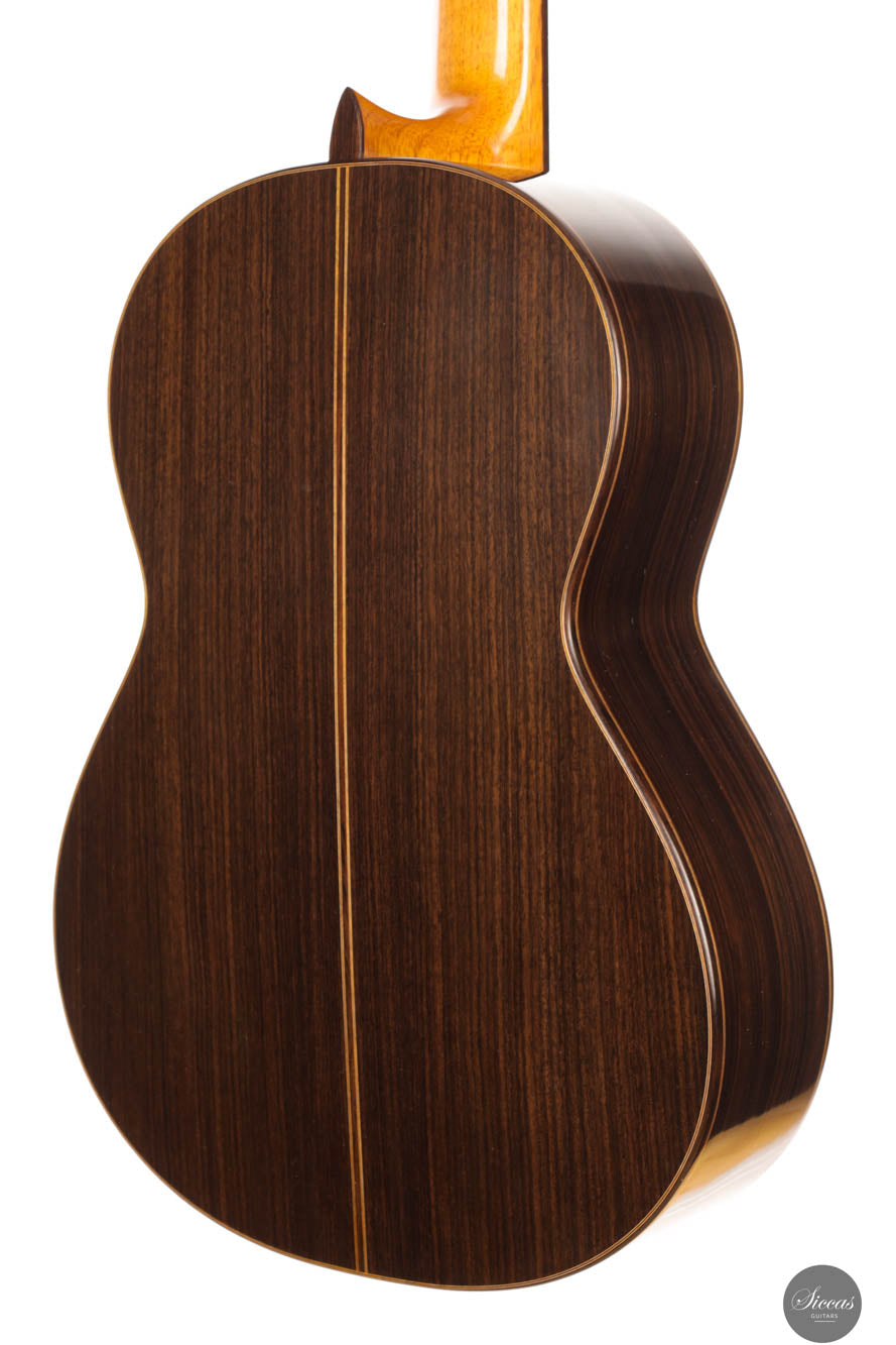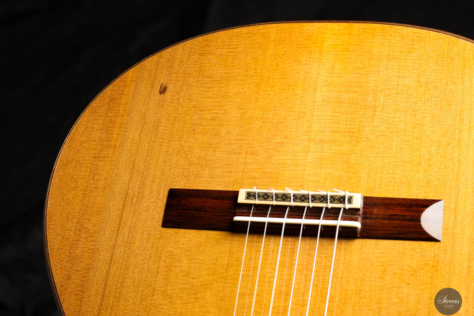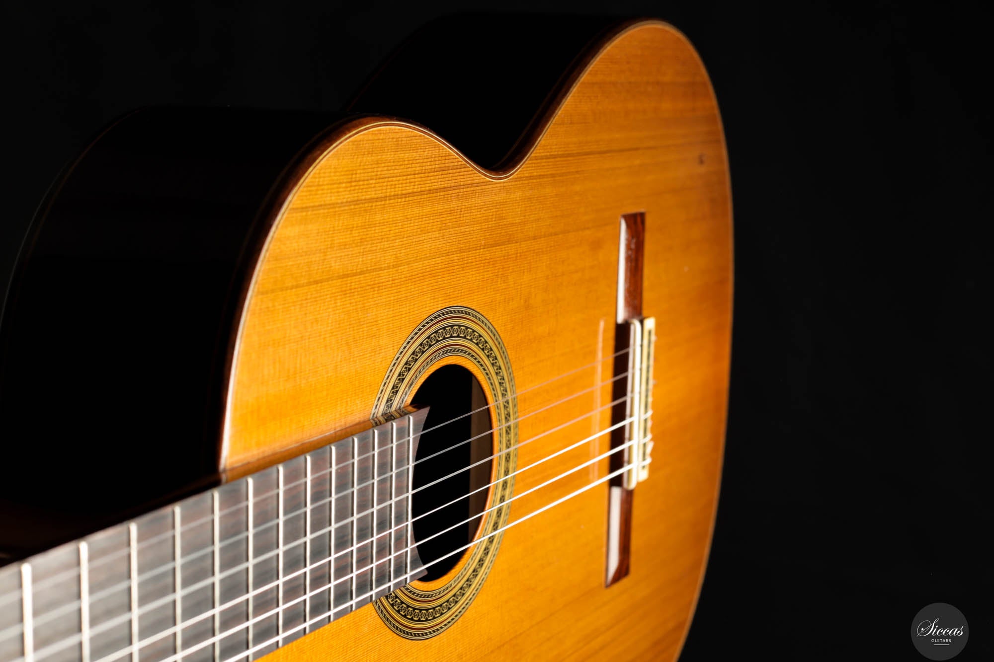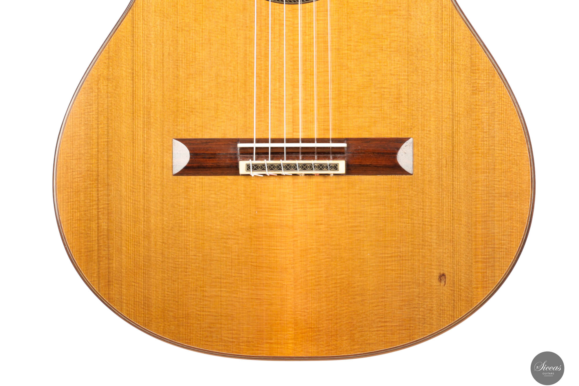 Diese Doubletop gitarre aus dem Jahr 2015 zeigt eindrucksvoll, dass auch frühere Arbeiten von Dieter Müller auf höchstem Niveau stehen. Trotz ihres Alters steht sie aktuellen Modellen in nichts nach – mit ausgezeichneter Tontrennung, warmem Sustain und einer reifen, entwickelten Klangfarbe. Zwar ist sie möglicherweise etwas weniger sensibel als Müllers neueste Instrumente, liefert aber dennoch einen kultivierten Ton mit großer Leichtigkeit und exzellenter Projektion. Die leichte Bauweise – ohne gedoppelte Zargen oder Boden – sorgt für hohen Spielkomfort, während das erhöhte Griffbrett den Zugang zu den oberen Lagen zusätzlich erleichtert. Die Schellackpolitur ist sorgfältig ausgeführt und unterstreicht die hohe handwerkliche Qualität des Instruments.