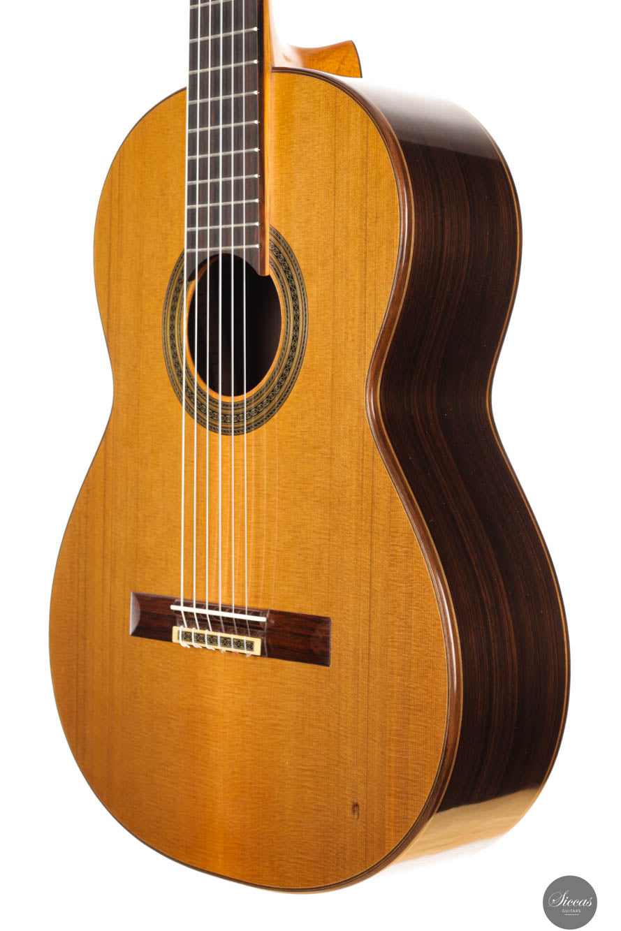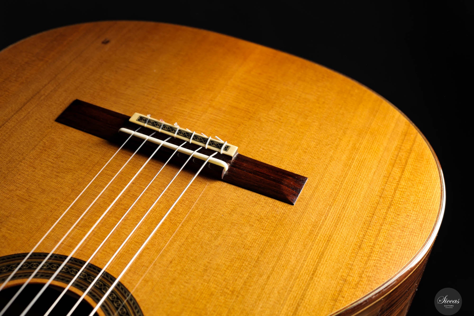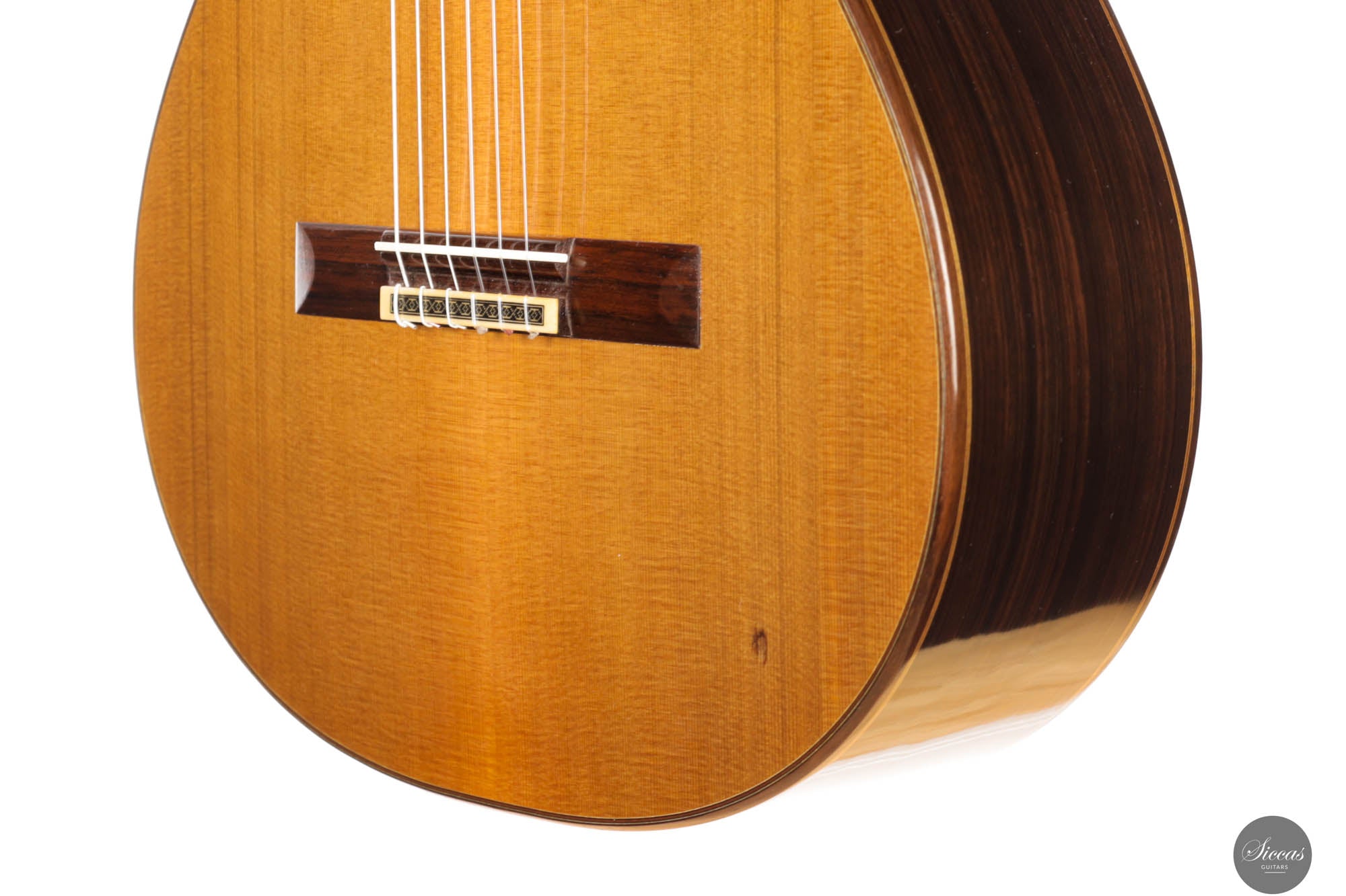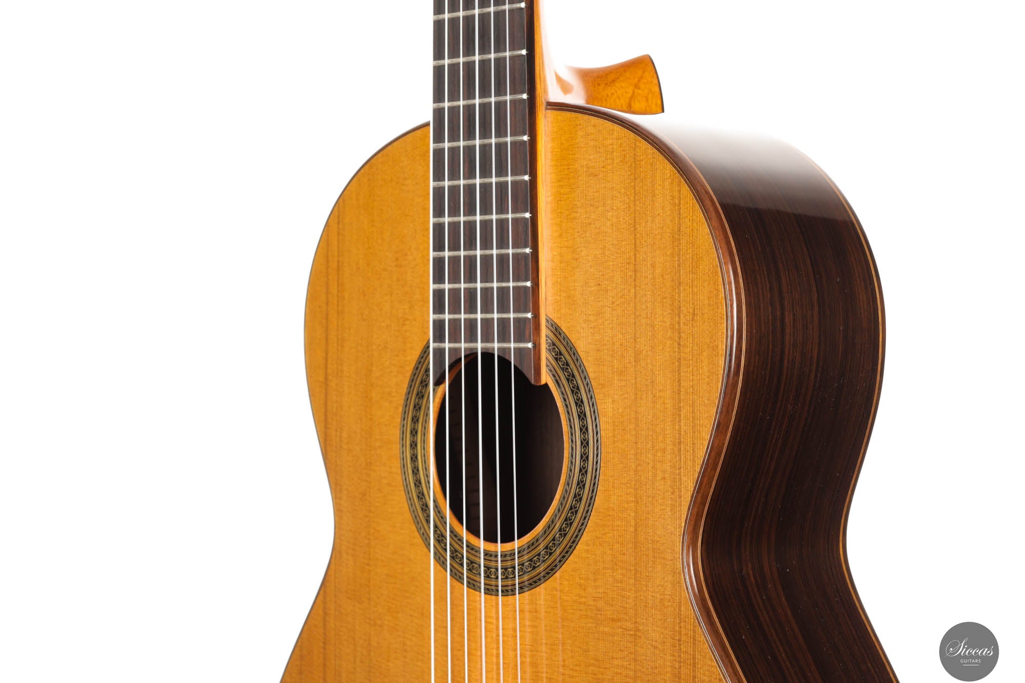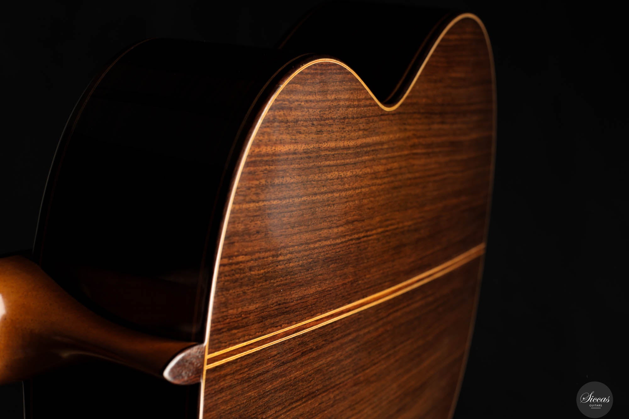 Diese Doubletop gitarre aus dem Jahr 2015 zeigt eindrucksvoll, dass auch frühere Arbeiten von Dieter Müller auf höchstem Niveau stehen. Trotz ihres Alters steht sie aktuellen Modellen in nichts nach – mit ausgezeichneter Tontrennung, warmem Sustain und einer reifen, entwickelten Klangfarbe. Zwar ist sie möglicherweise etwas weniger sensibel als Müllers neueste Instrumente, liefert aber dennoch einen kultivierten Ton mit großer Leichtigkeit und exzellenter Projektion. Die leichte Bauweise – ohne gedoppelte Zargen oder Boden – sorgt für hohen Spielkomfort, während das erhöhte Griffbrett den Zugang zu den oberen Lagen zusätzlich erleichtert. Die Schellackpolitur ist sorgfältig ausgeführt und unterstreicht die hohe handwerkliche Qualität des Instruments.