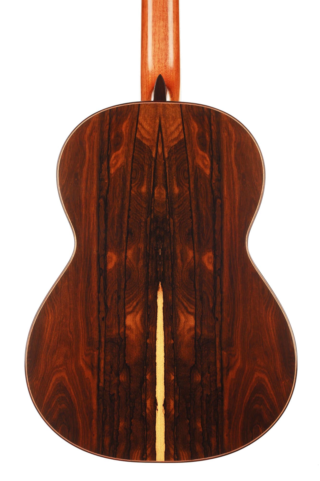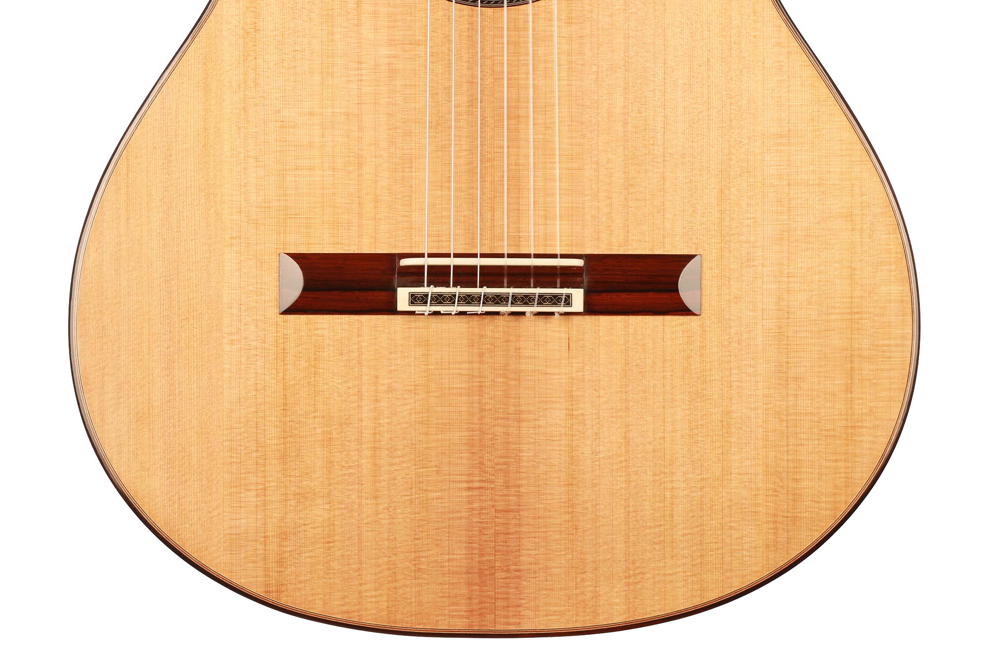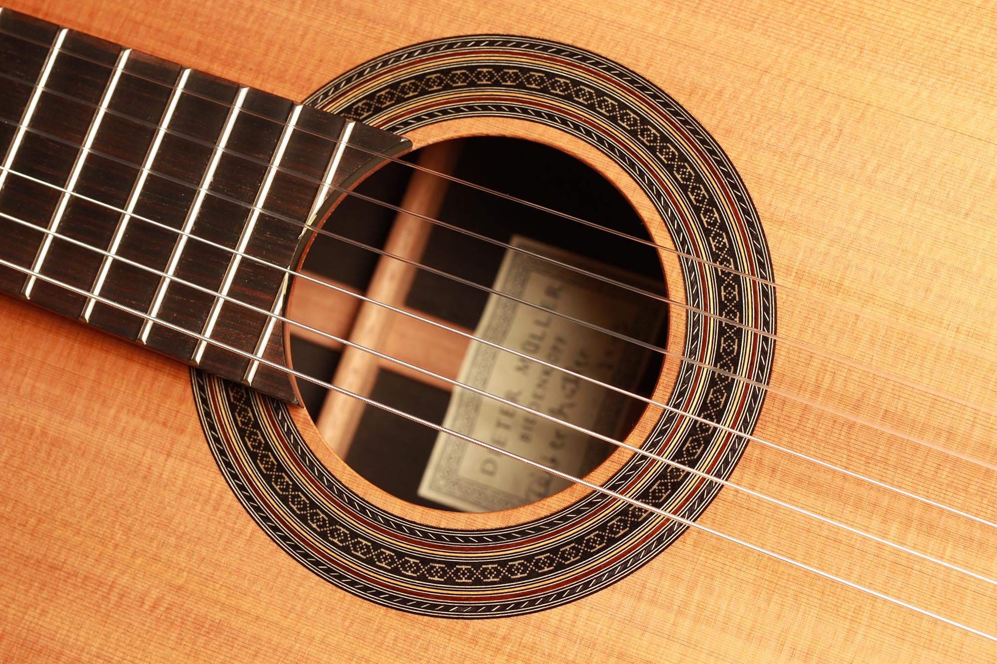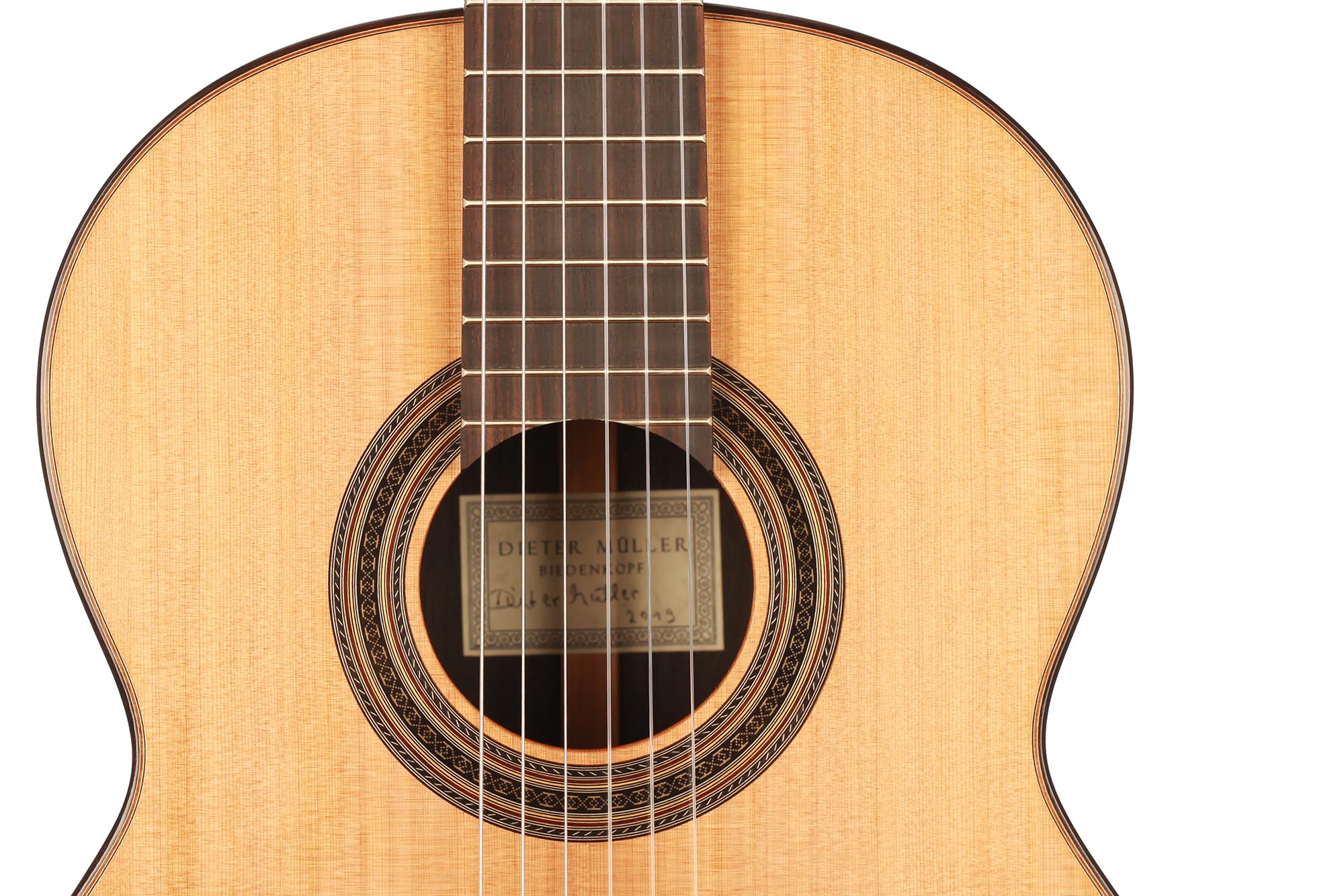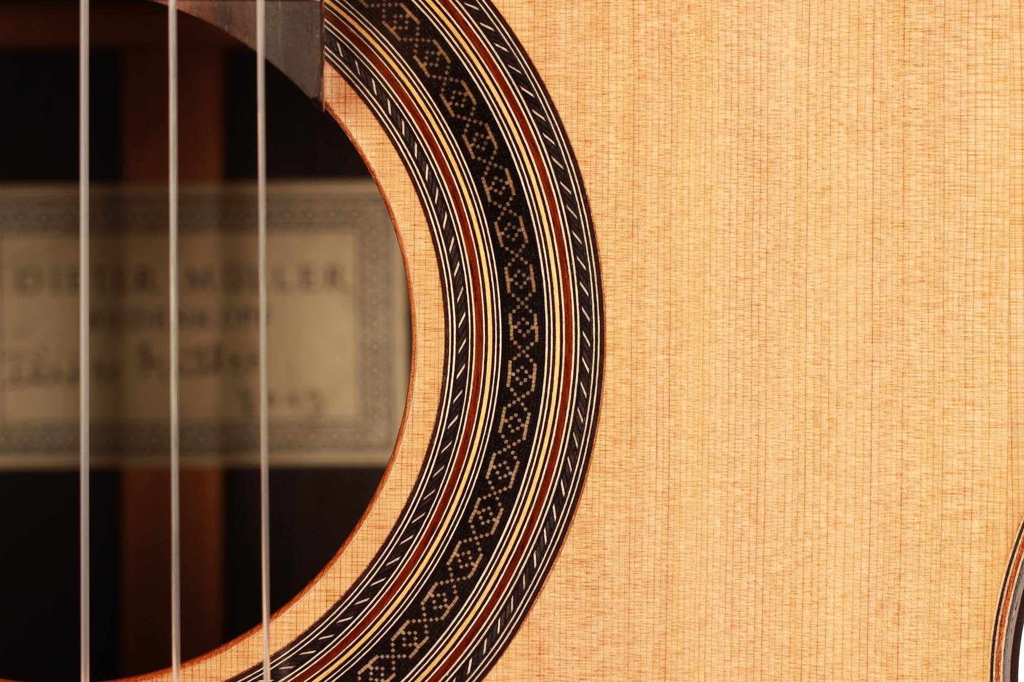 Dieter Müller is a respected German guitar maker who specializes in the construction of double-top guitars. Since Matthias Dammann, German guitar builders have been specialists in the field of double-top guitars. Dieter Müller's instruments are particularly in demand because of their sound quality and richness of timbre as well as their large volume and the craftsmanship is at a very high level. The fine dark rosette emphasizes the honey color of the light cedar top. Back and sides are made of Ziricote, which contrasts with the top to create an aesthetically perfectly balanced instrument.