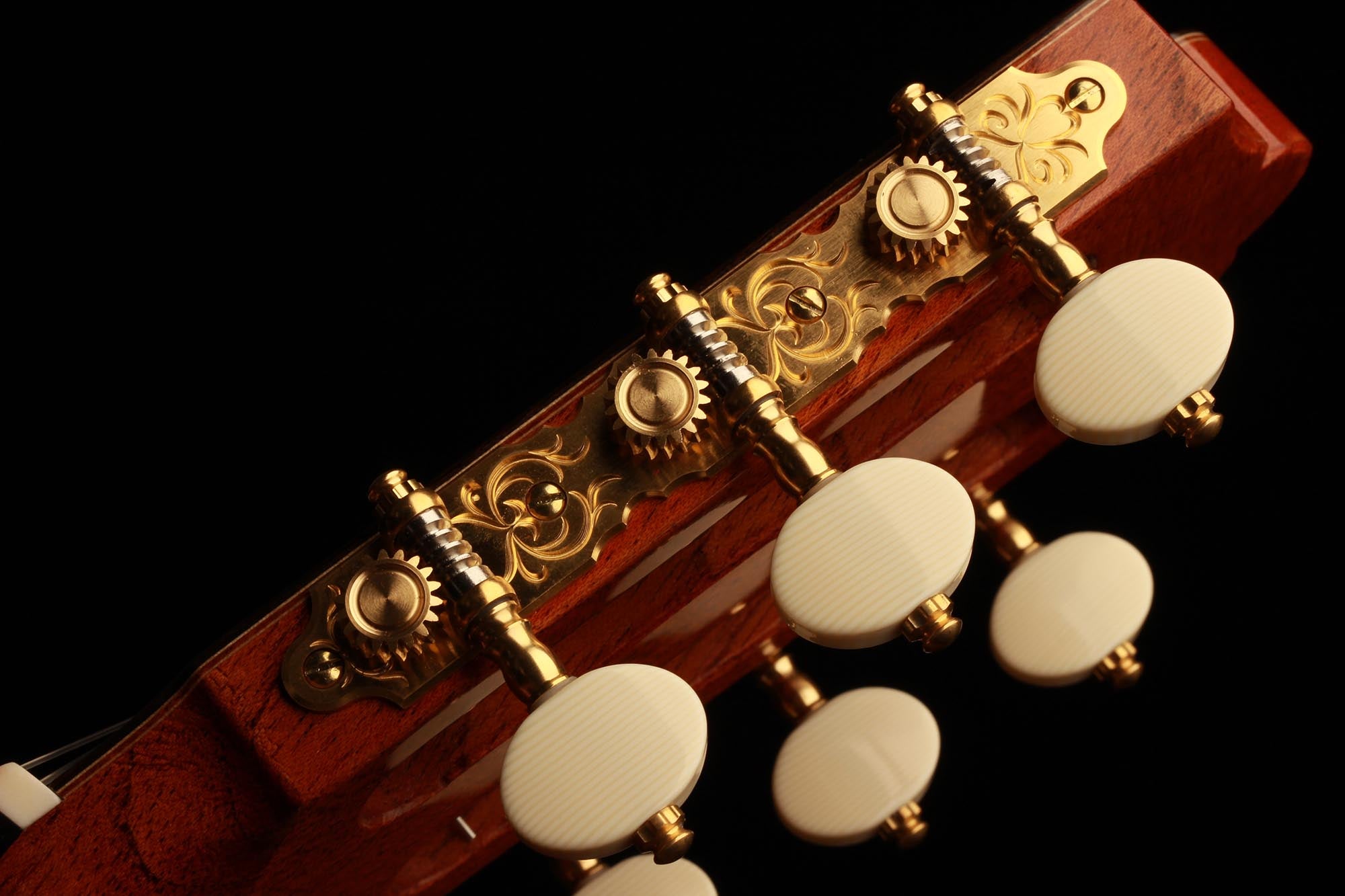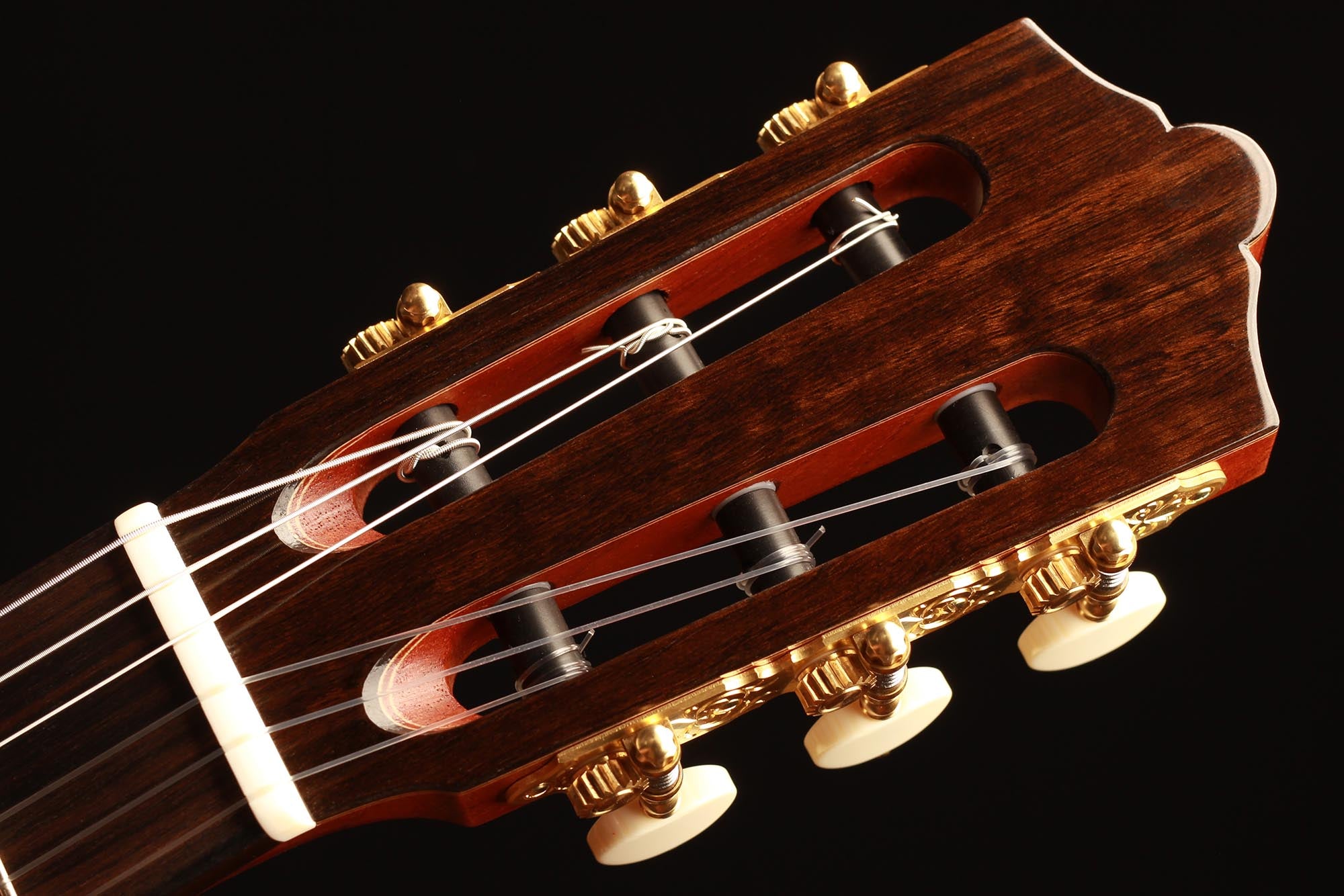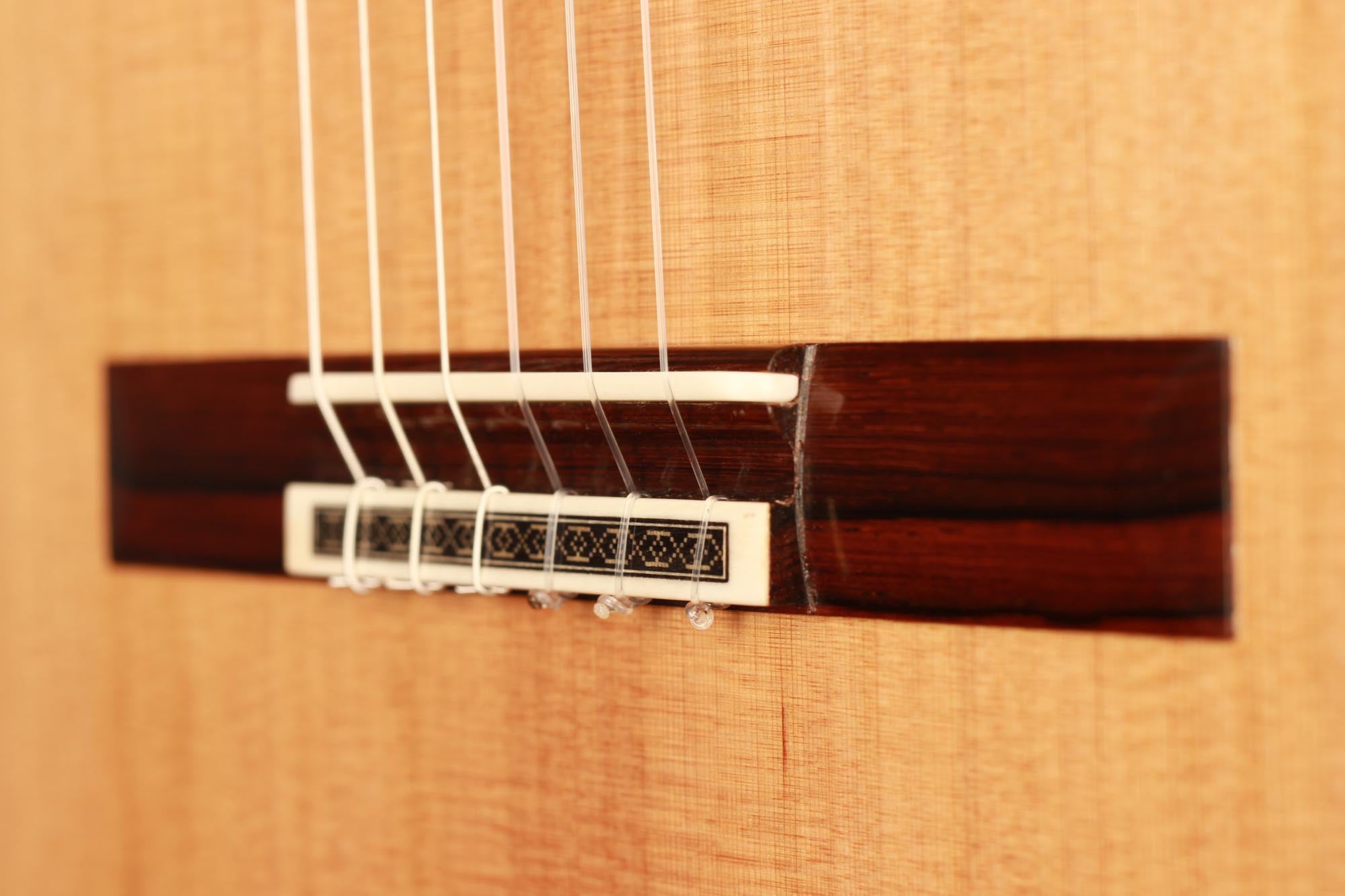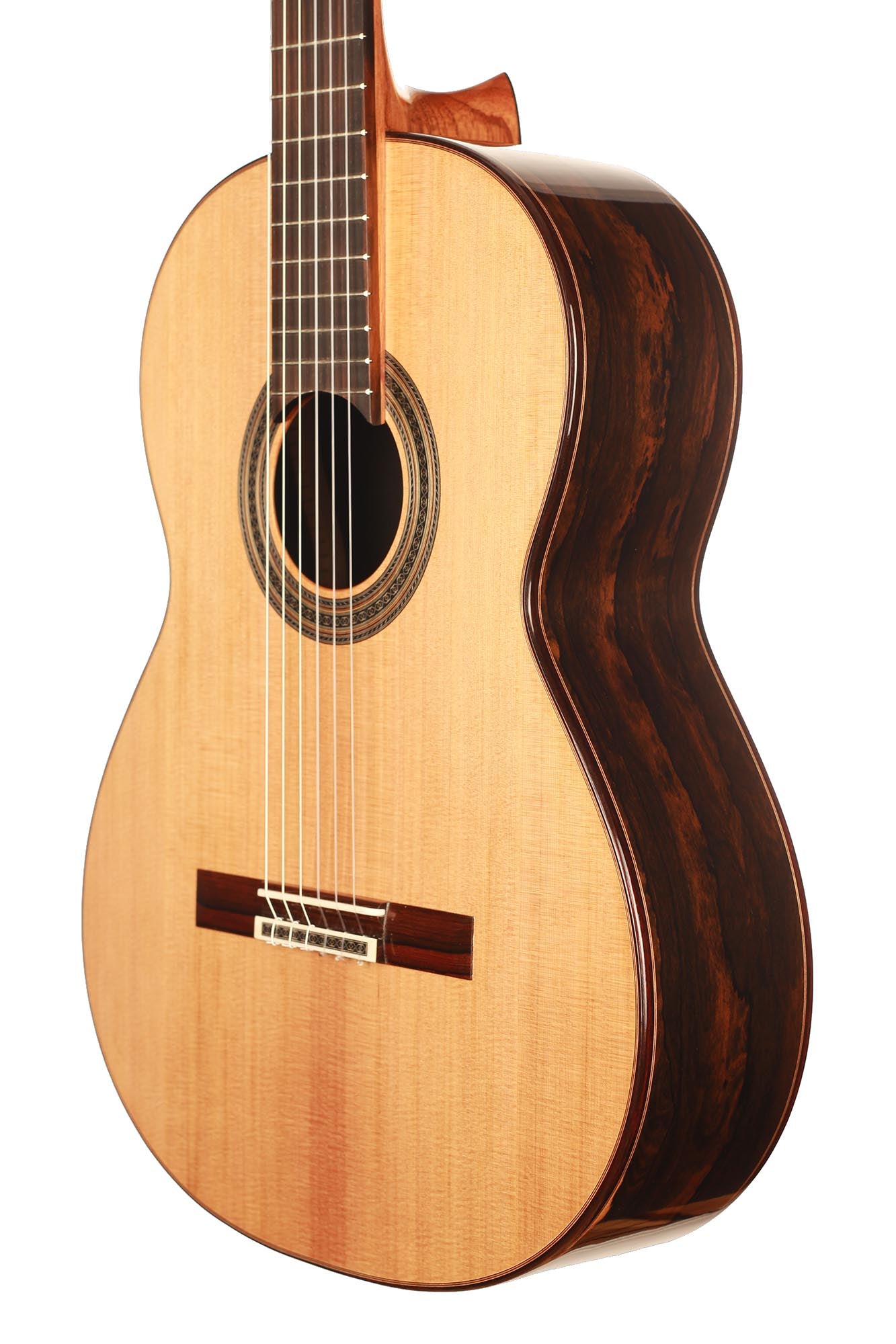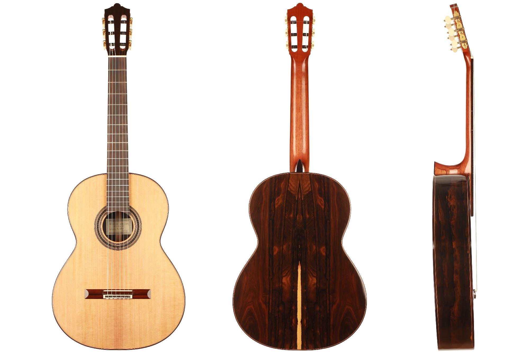 Dieter Müller is a respected German guitar maker who specializes in the construction of double-top guitars. Since Matthias Dammann, German guitar builders have been specialists in the field of double-top guitars. Dieter Müller's instruments are particularly in demand because of their sound quality and richness of timbre as well as their large volume and the craftsmanship is at a very high level. The fine dark rosette emphasizes the honey color of the light cedar top. Back and sides are made of Ziricote, which contrasts with the top to create an aesthetically perfectly balanced instrument.