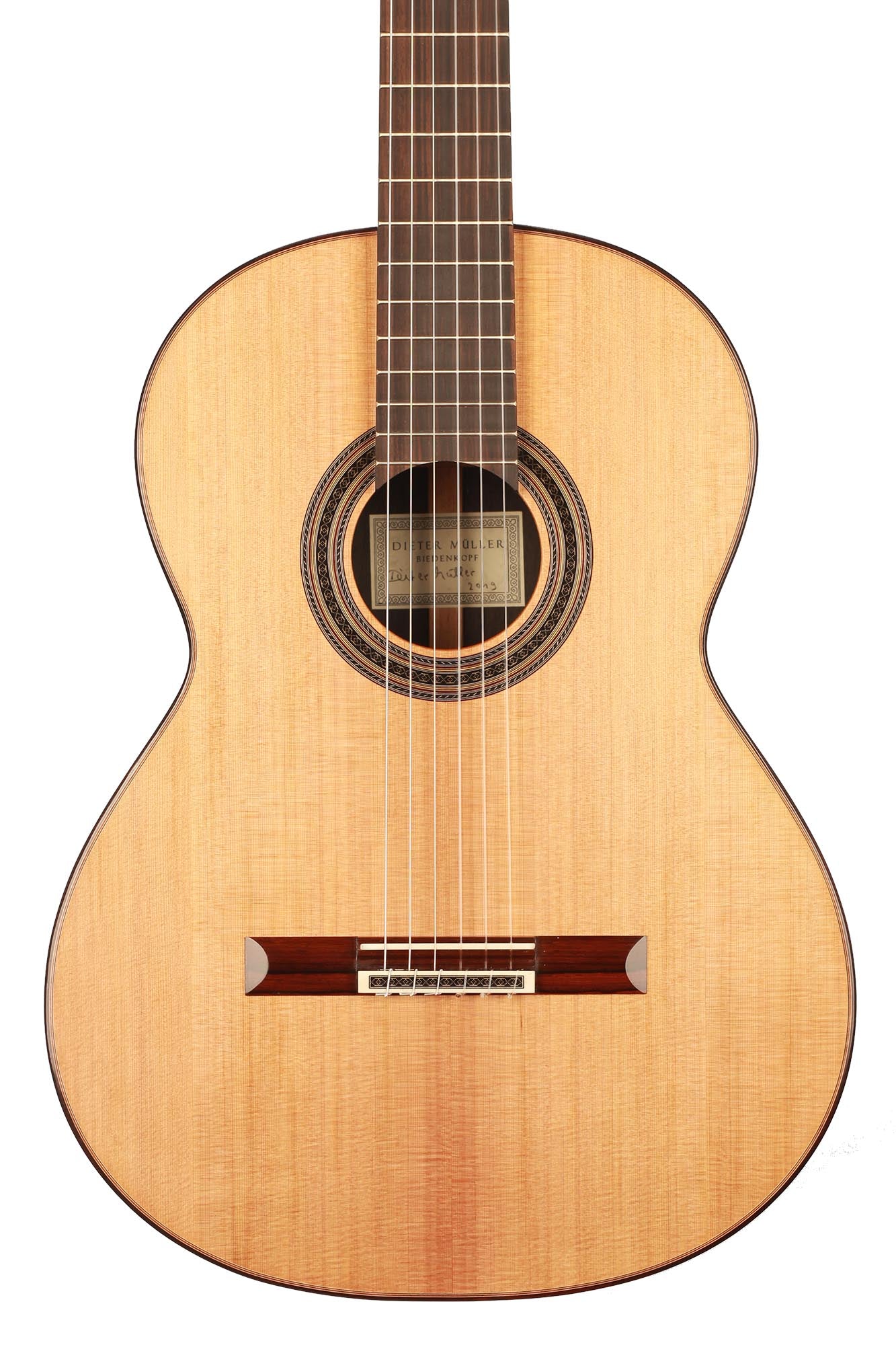 What a powerful guitar. It is built without any protected woods and therefore CITES-Free, it is light as a feather and reacts incredibly fast. The dynamics this guitar offers are extraordinary. All these qualities support the guitarist in live performances and competitions when it comes to a 100% reliable instrument in terms of sound, volume and playing comfort. Dieter Müller's guitars are definitely among the best German double top guitars of our time.