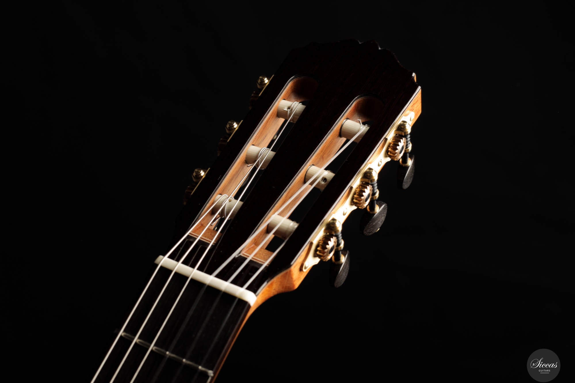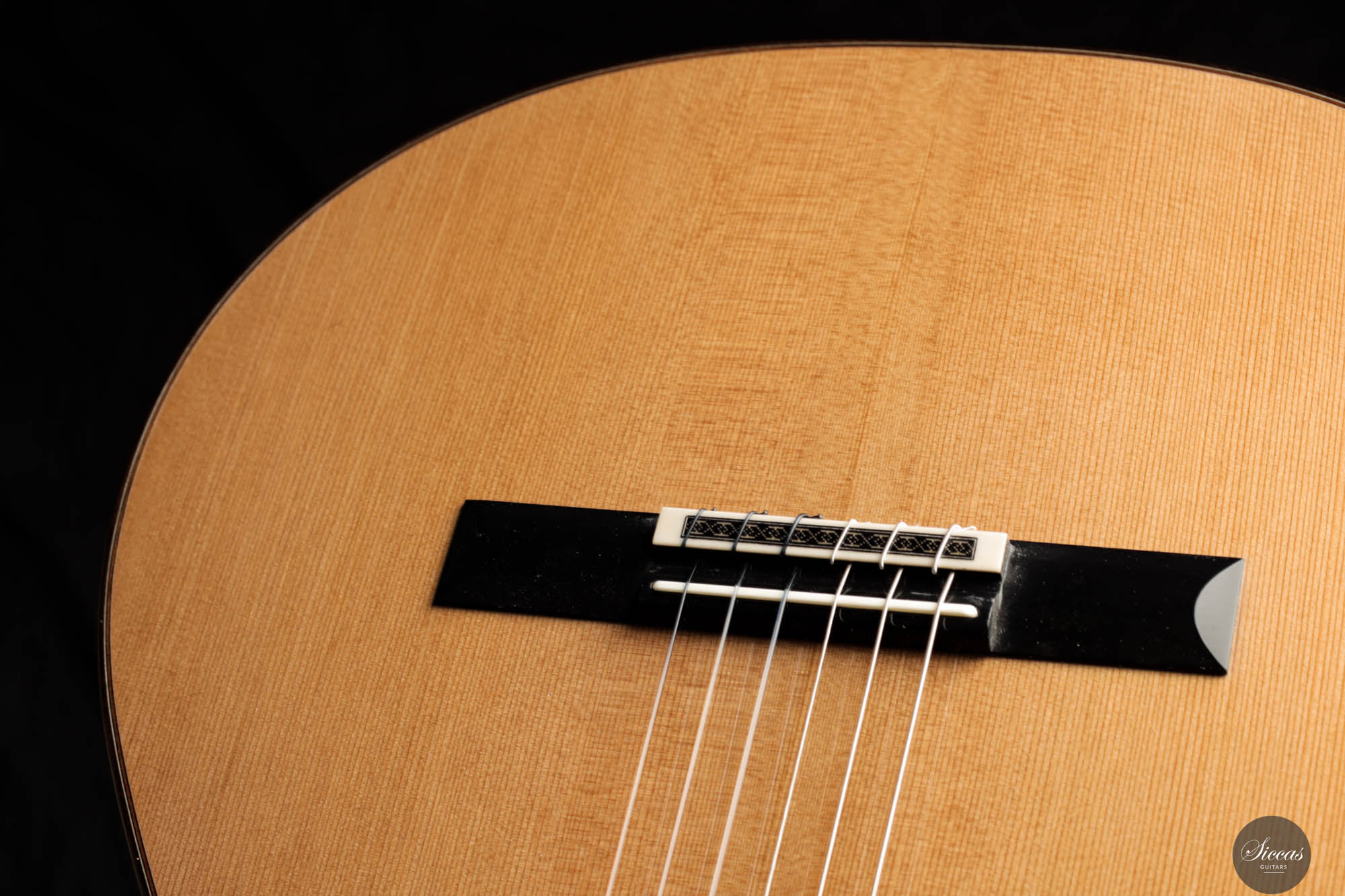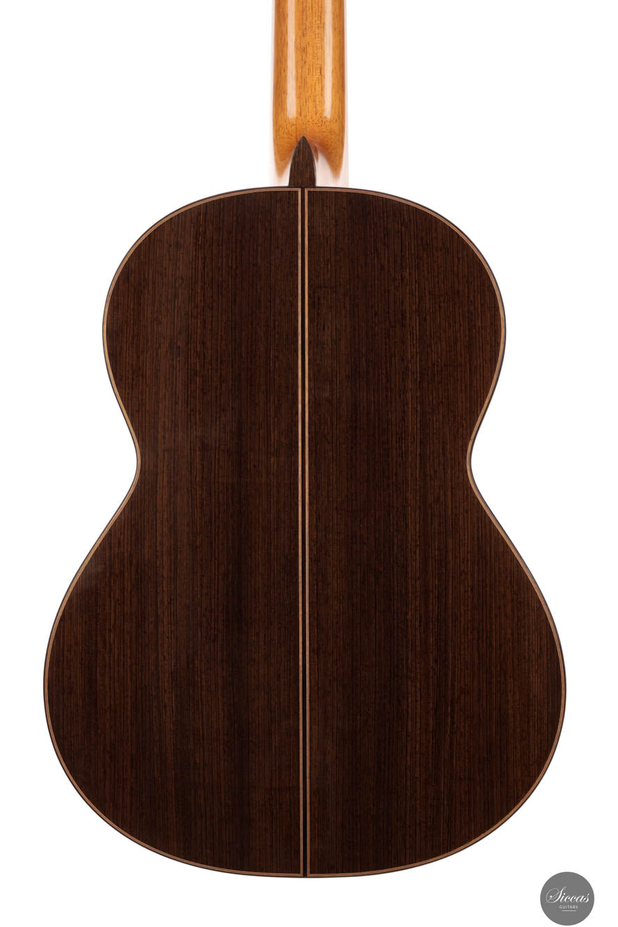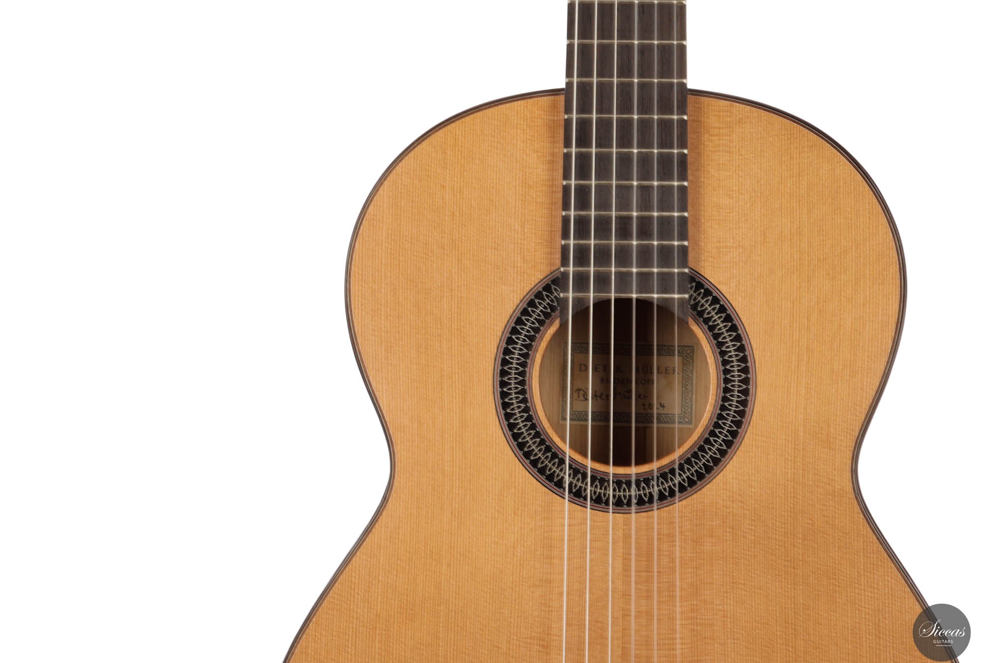 Dieses Instrument kombiniert meisterhaft traditionelle Merkmale mit erheblicher Stärke und Kraft und zeigt Dieters einzigartige Klangsignatur. Es zeichnet sich durch luftige Höhen und sehr tiefe Bässe aus, die Kennzeichen seines Designs sind. Die leichte Bauweise verbessert das Spielerlebnis erheblich, was sie zu einem sehr angenehmen Instrument zum Spielen macht. Zusätzlich reagiert die Gitarre schnell auf Anschläge der rechten Hand, was einen Spielstil ermöglicht, der minimalen Aufwand erfordert, aber maximale Ausdruckskraft bietet. Diese Ansprechbarkeit macht die Gitarre außergewöhnlich leicht zu handhaben, sodass Musiker mit großer Dynamik und Leichtigkeit spielen können, ohne übermäßig viel Energie aufzuwenden. Insgesamt hebt sich dieses Instrument als eine der besten modernen Konzertgitarren hervor, die hervorragende Spielbarkeit mit einem reichen, resonanten Klang verbindet.