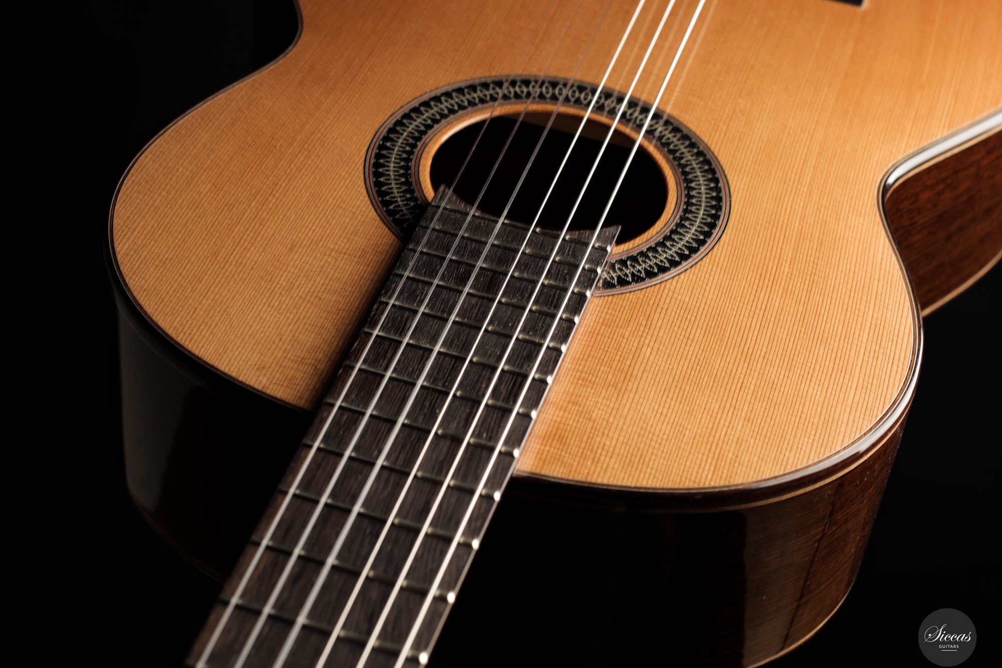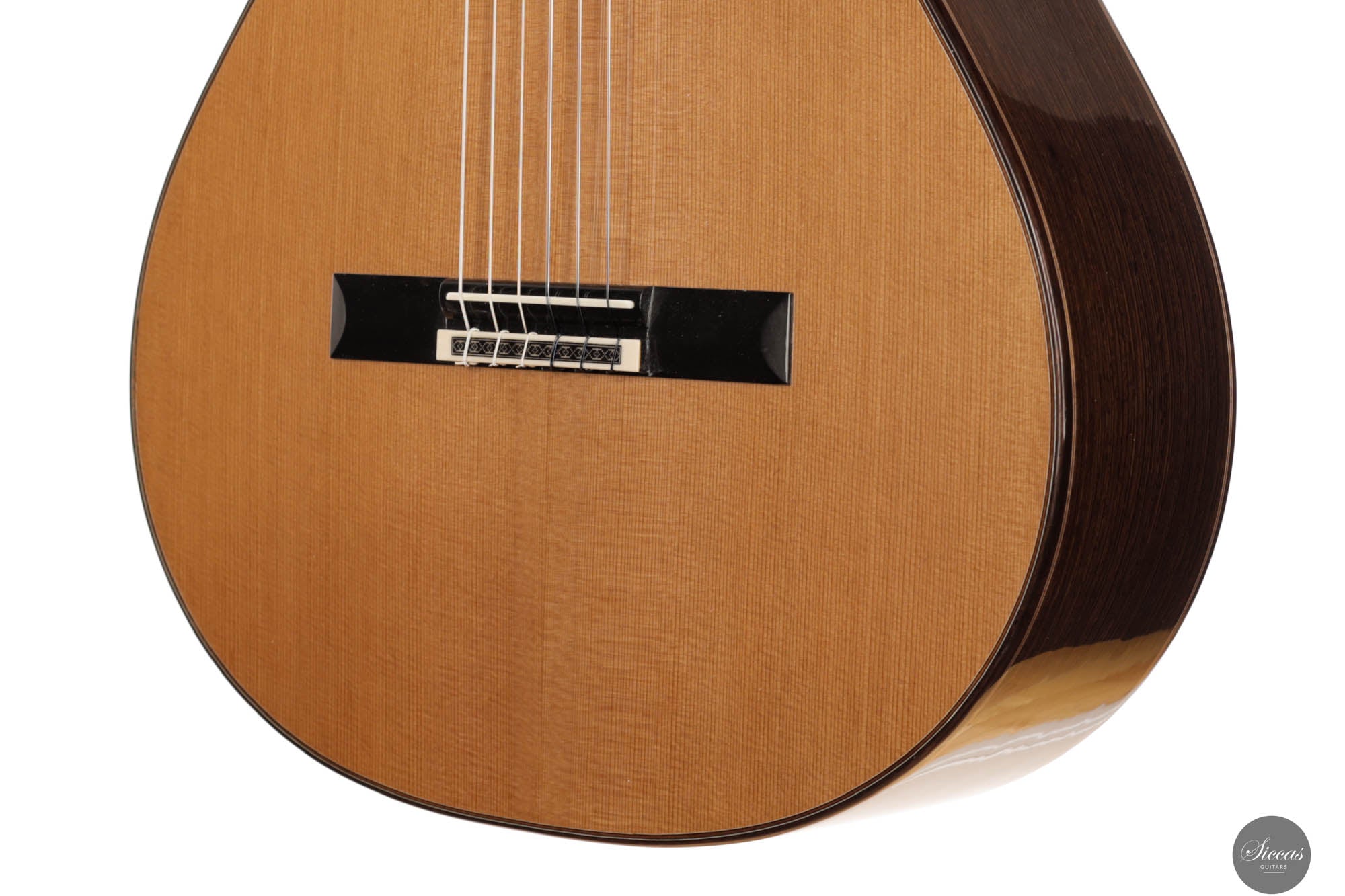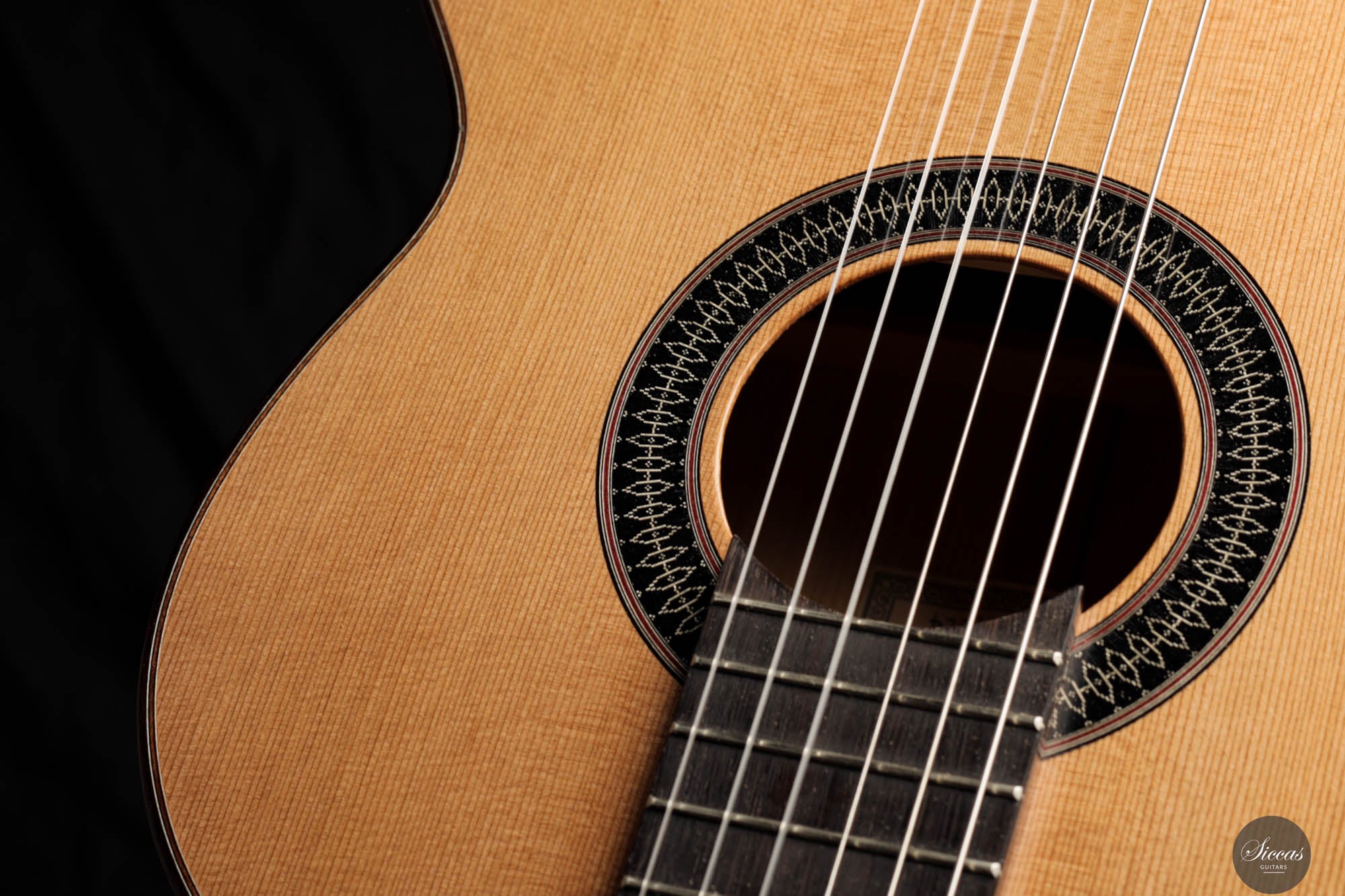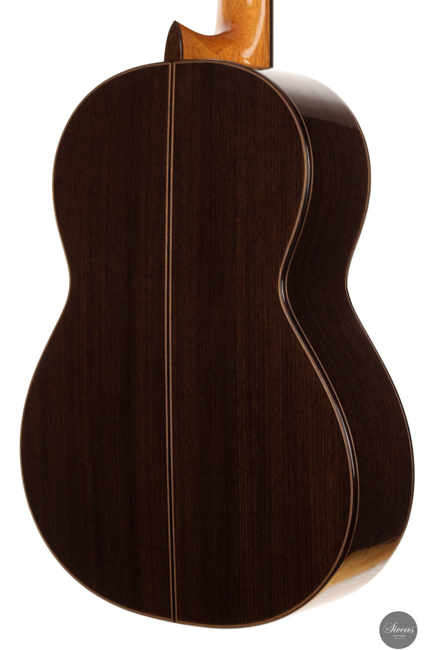Dieses Instrument kombiniert meisterhaft traditionelle Merkmale mit erheblicher Stärke und Kraft und zeigt Dieters einzigartige Klangsignatur. Es zeichnet sich durch luftige Höhen und sehr tiefe Bässe aus, die Kennzeichen seines Designs sind. Die leichte Bauweise verbessert das Spielerlebnis erheblich, was sie zu einem sehr angenehmen Instrument zum Spielen macht. Zusätzlich reagiert die Gitarre schnell auf Anschläge der rechten Hand, was einen Spielstil ermöglicht, der minimalen Aufwand erfordert, aber maximale Ausdruckskraft bietet. Diese Ansprechbarkeit macht die Gitarre außergewöhnlich leicht zu handhaben, sodass Musiker mit großer Dynamik und Leichtigkeit spielen können, ohne übermäßig viel Energie aufzuwenden. Insgesamt hebt sich dieses Instrument als eine der besten modernen Konzertgitarren hervor, die hervorragende Spielbarkeit mit einem reichen, resonanten Klang verbindet.