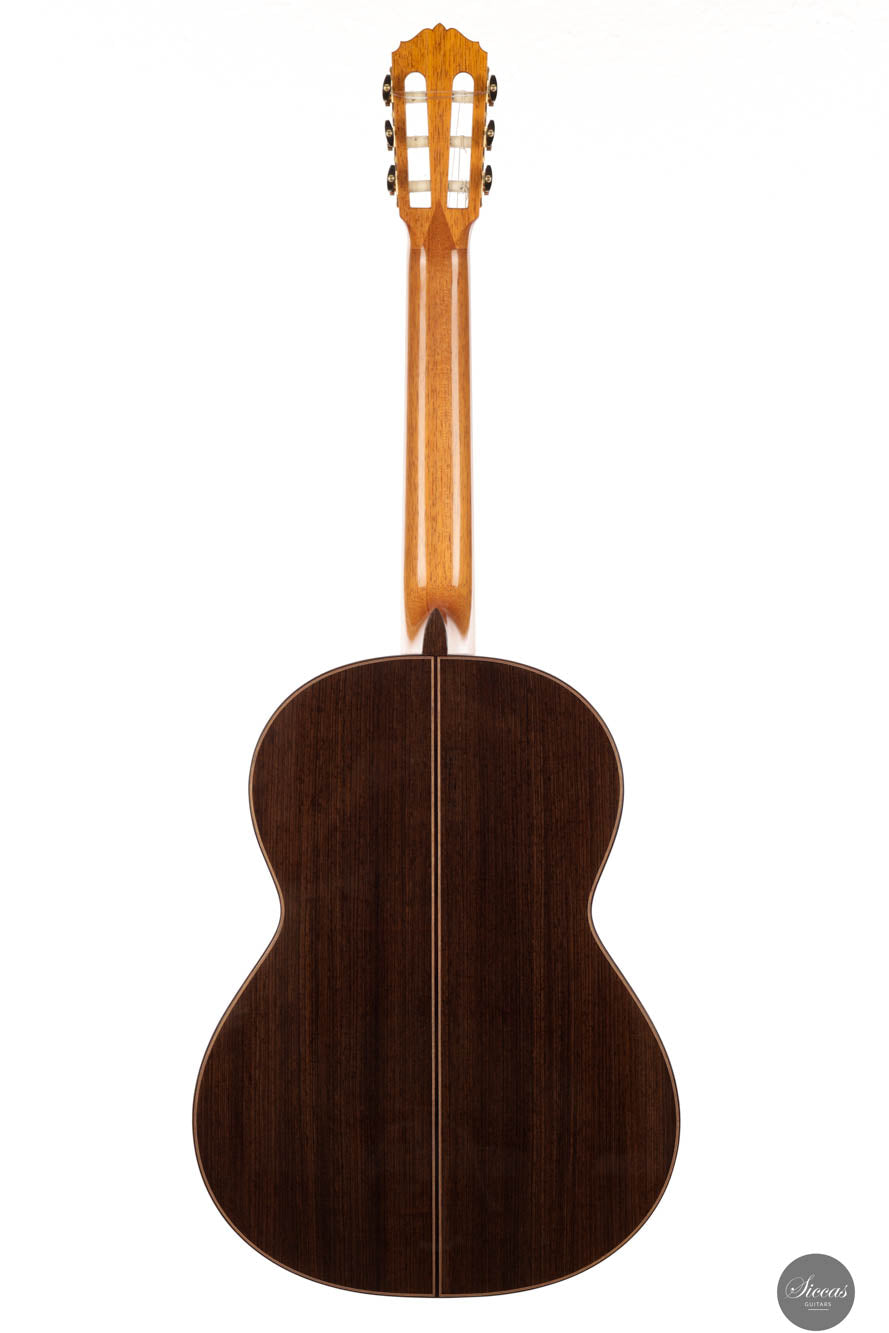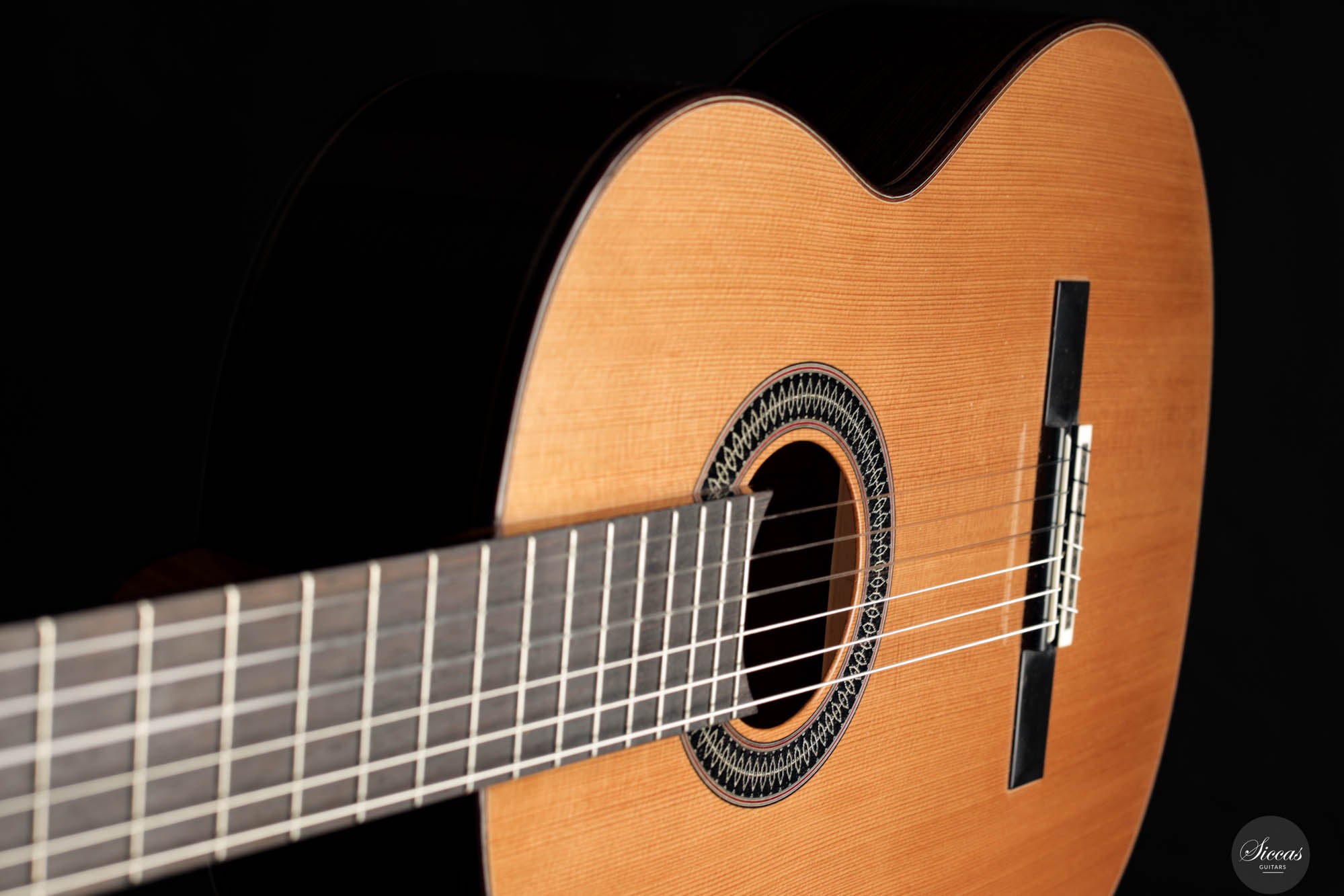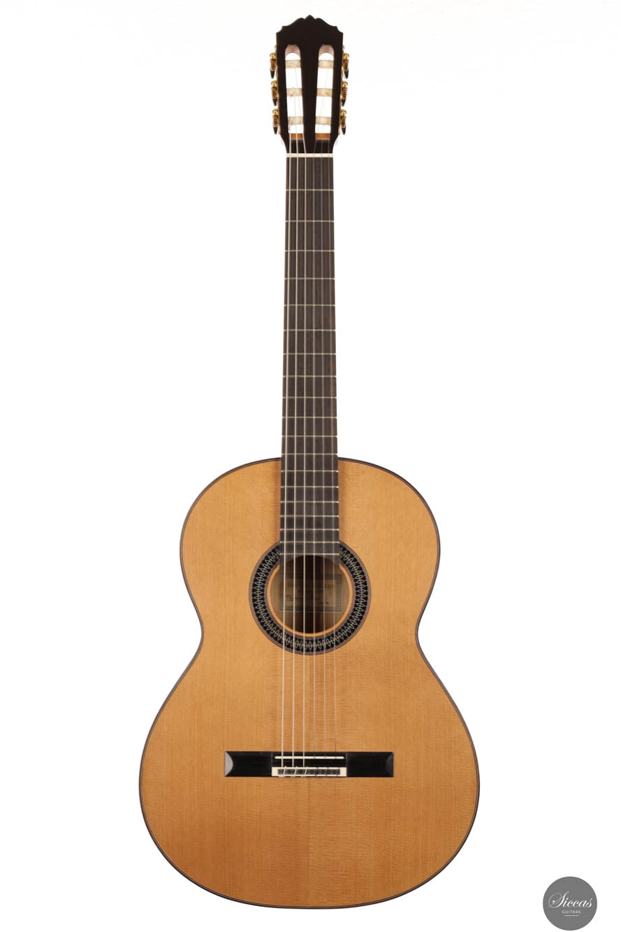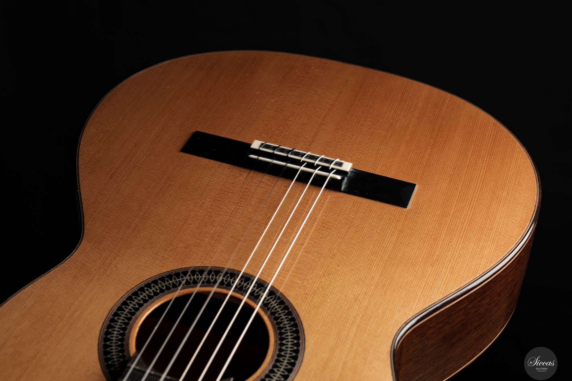 Dieses Instrument kombiniert meisterhaft traditionelle Merkmale mit erheblicher Stärke und Kraft und zeigt Dieters einzigartige Klangsignatur. Es zeichnet sich durch luftige Höhen und sehr tiefe Bässe aus, die Kennzeichen seines Designs sind. Die leichte Bauweise verbessert das Spielerlebnis erheblich, was sie zu einem sehr angenehmen Instrument zum Spielen macht. Zusätzlich reagiert die Gitarre schnell auf Anschläge der rechten Hand, was einen Spielstil ermöglicht, der minimalen Aufwand erfordert, aber maximale Ausdruckskraft bietet. Diese Ansprechbarkeit macht die Gitarre außergewöhnlich leicht zu handhaben, sodass Musiker mit großer Dynamik und Leichtigkeit spielen können, ohne übermäßig viel Energie aufzuwenden. Insgesamt hebt sich dieses Instrument als eine der besten modernen Konzertgitarren hervor, die hervorragende Spielbarkeit mit einem reichen, resonanten Klang verbindet.