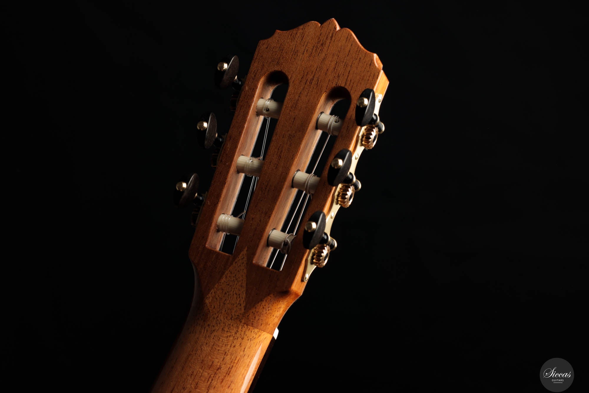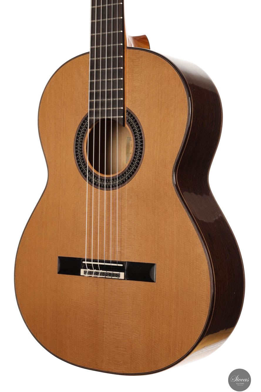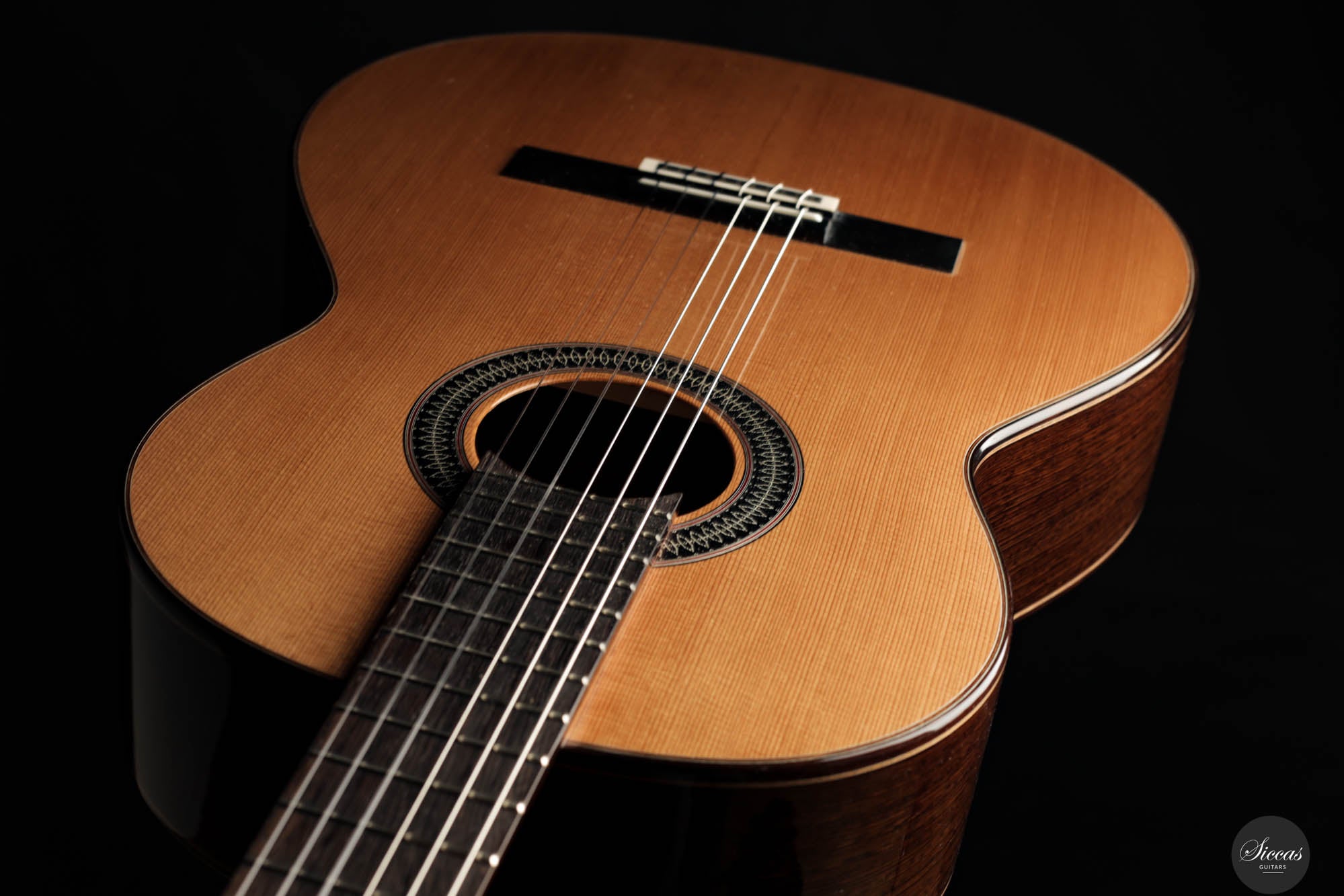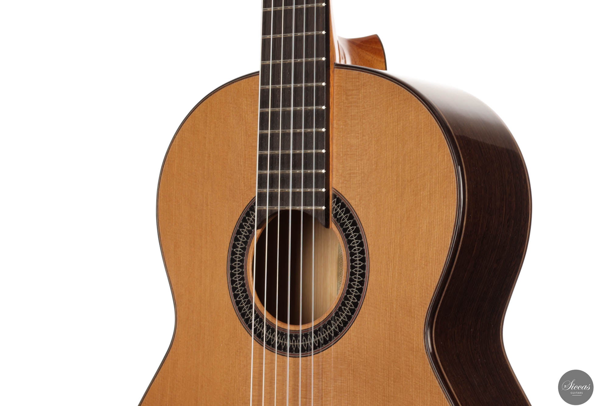 Dieses Instrument kombiniert meisterhaft traditionelle Merkmale mit erheblicher Stärke und Kraft und zeigt Dieters einzigartige Klangsignatur. Es zeichnet sich durch luftige Höhen und sehr tiefe Bässe aus, die Kennzeichen seines Designs sind. Die leichte Bauweise verbessert das Spielerlebnis erheblich, was sie zu einem sehr angenehmen Instrument zum Spielen macht. Zusätzlich reagiert die Gitarre schnell auf Anschläge der rechten Hand, was einen Spielstil ermöglicht, der minimalen Aufwand erfordert, aber maximale Ausdruckskraft bietet. Diese Ansprechbarkeit macht die Gitarre außergewöhnlich leicht zu handhaben, sodass Musiker mit großer Dynamik und Leichtigkeit spielen können, ohne übermäßig viel Energie aufzuwenden. Insgesamt hebt sich dieses Instrument als eine der besten modernen Konzertgitarren hervor, die hervorragende Spielbarkeit mit einem reichen, resonanten Klang verbindet.