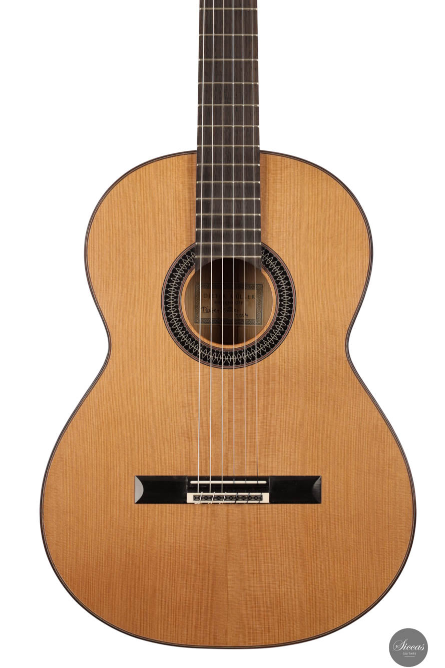 Dieses Gitarrenmodell ist ein "neues Modell" von Dieter Müller. Anfang 2023 nutzte Dieter die Gelegenheit, durch das Entwerfen seines eigenen Modells und die Verbesserung der Kopfplatte und Verzierung seiner Gitarren zu innovieren. Über die Ästhetik hinaus vertiefte er sich in die akustischen Eigenschaften seiner Instrumente, analysierte fünf seiner besten Gitarren und erwarb zeitweise zwei angesehene Dammann-Gitarren sowie eine Friederich-Gitarre, die er glücklicherweise in seiner Werkstatt studieren konnte. Seine Analyse ergab, dass die leistungsfähigsten und dynamischsten Instrumente eine sehr niedrige Korpus- und Hohlraumresonanz aufwiesen. Zudem konnte er durch präzises Stimmen der höheren Deckenresonanzen ein gutes Sustain und einen schön klingenden Formanten in den Höhen erreichen. Mit diesen Erkenntnissen fertigte er ein neues Modell, das eine sehr leichte Decke aus den leichtesten verfügbaren Materialien umfasst, wobei er seine ästhetische Vision mit akustischer Exzellenz verband, um eine bemerkenswert resonante und optisch beeindruckende Gitarre zu schaffen.