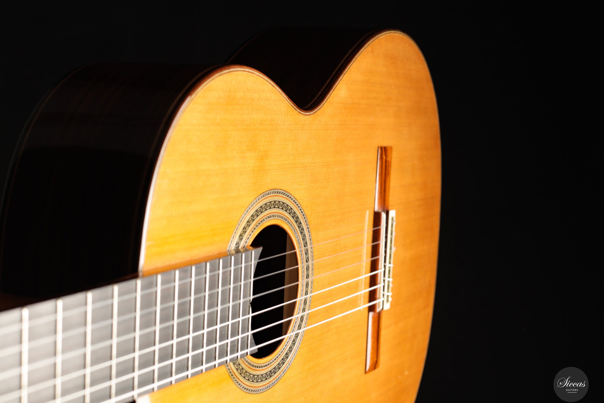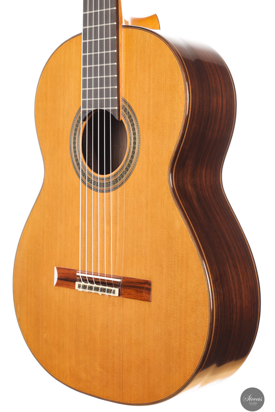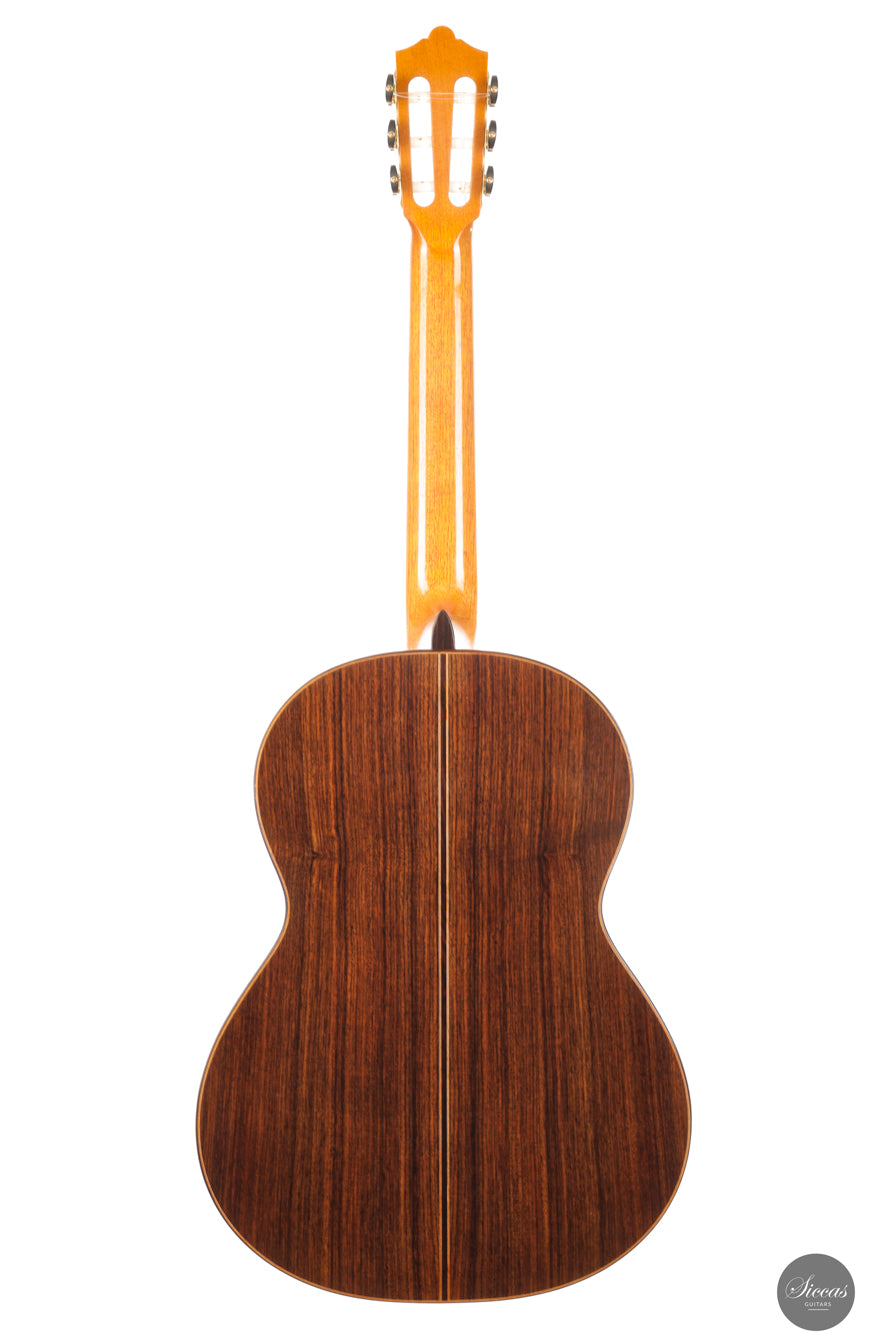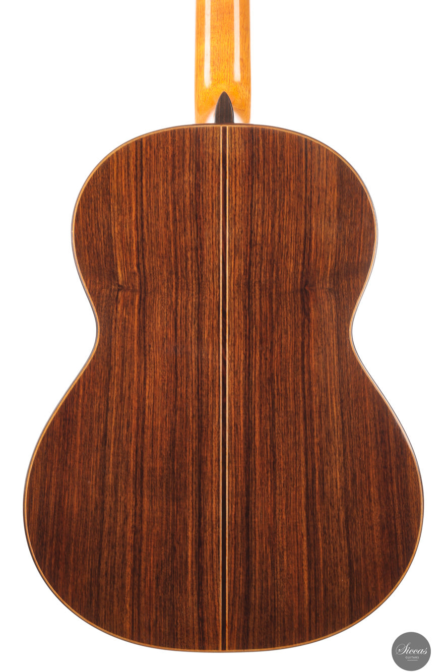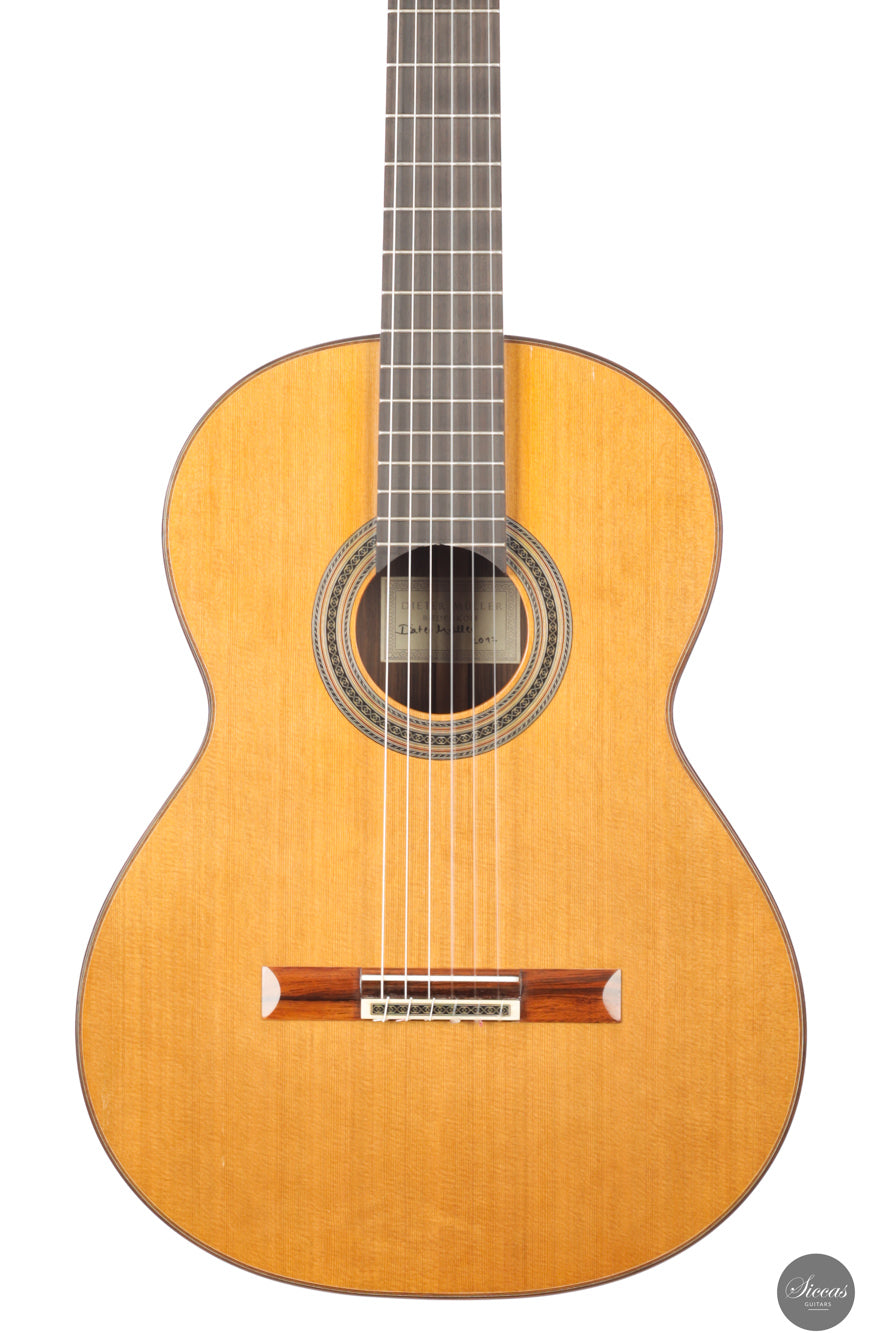 Diese Doubletop-Gitarre aus dem Jahr 2017 stellt ein besonders gelungenes Beispiel von Dieter Müllers Arbeit dar. Die Decke aus erstklassiger Zeder und der Korpus aus indischem Palisander ergeben ein Instrument mit großer klanglicher Tiefe und beeindruckender Projektion. Ihre Stimme ist voll und ausgewogen, wobei die E/F-Eigenresonanz den Bässen eine außergewöhnliche Tiefe und Fülle verleiht. Besonders auffällig ist das außergewöhnlich lange Sustain, gerade für eine so leichte Doubletop-Gitarre. Es verleiht der ersten Saite eine lebendige Präsenz und unterstützt sowohl virtuoses Spiel als auch ausdrucksvolle, langsame Melodien. Die Ansprache und Spielbarkeit dieses Instruments machen es zu einer hervorragenden Wahl für anspruchsvolles Repertoire und nuancierte Interpretation.