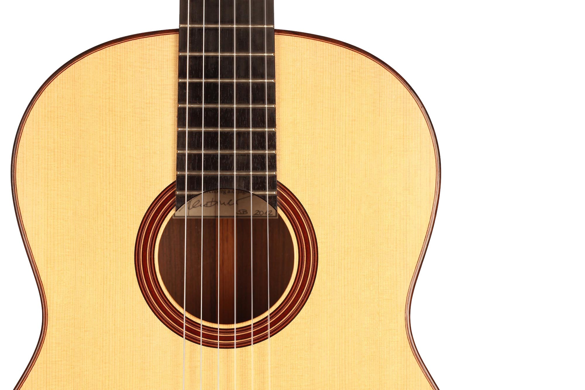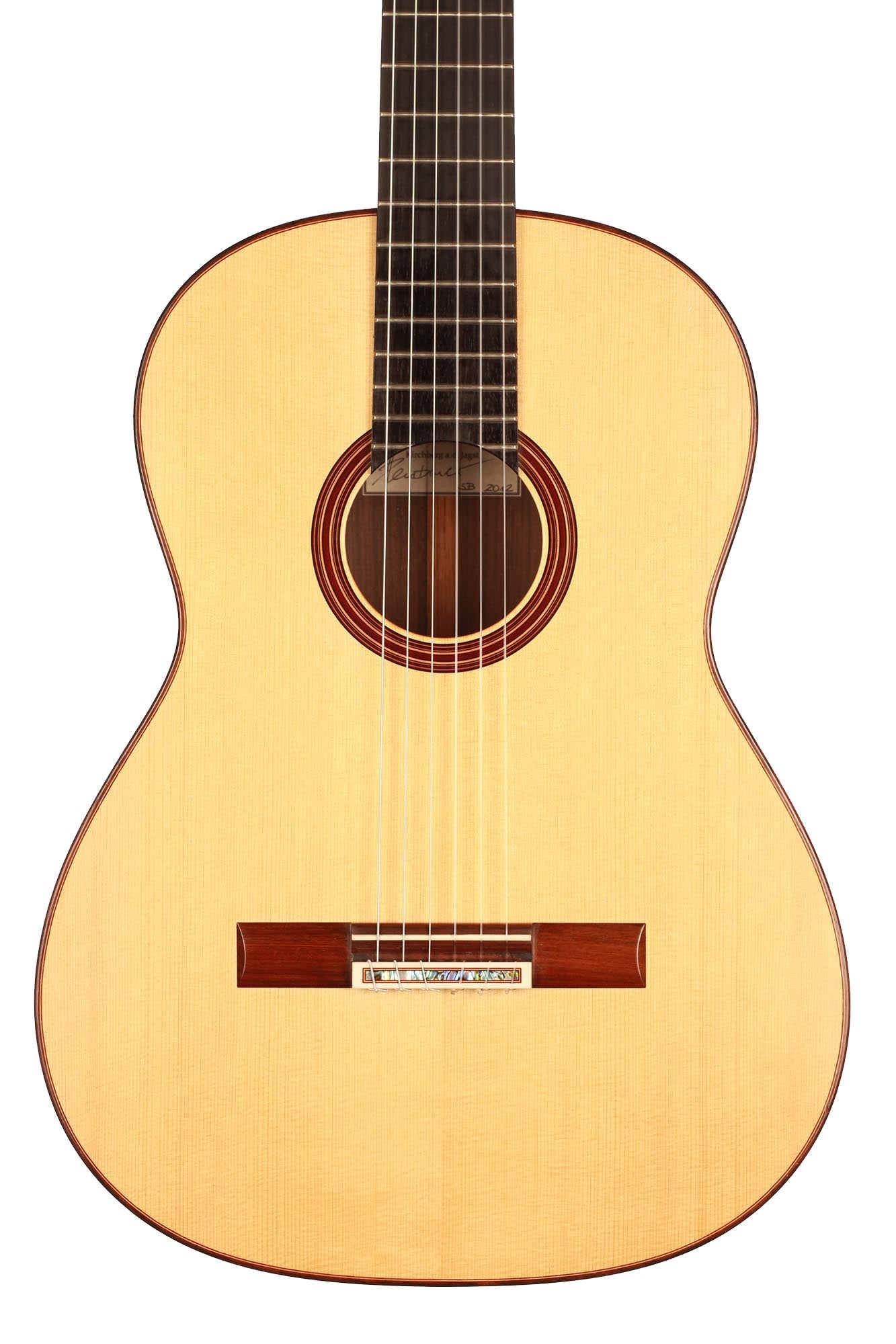 This superb guitar was built in 2012 and is in excellent condition. It is an elegant model with a fine rosette in the style of Atonio de Torres and Vicente Arias. The lutherie is very careful and this traditional guitar with a 7 fan bracing has a wonderful dynamic range.