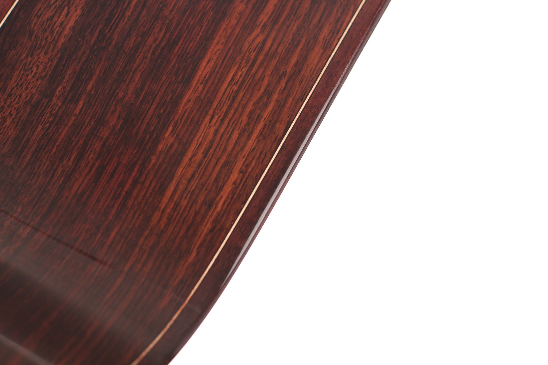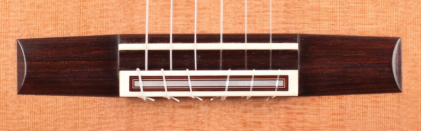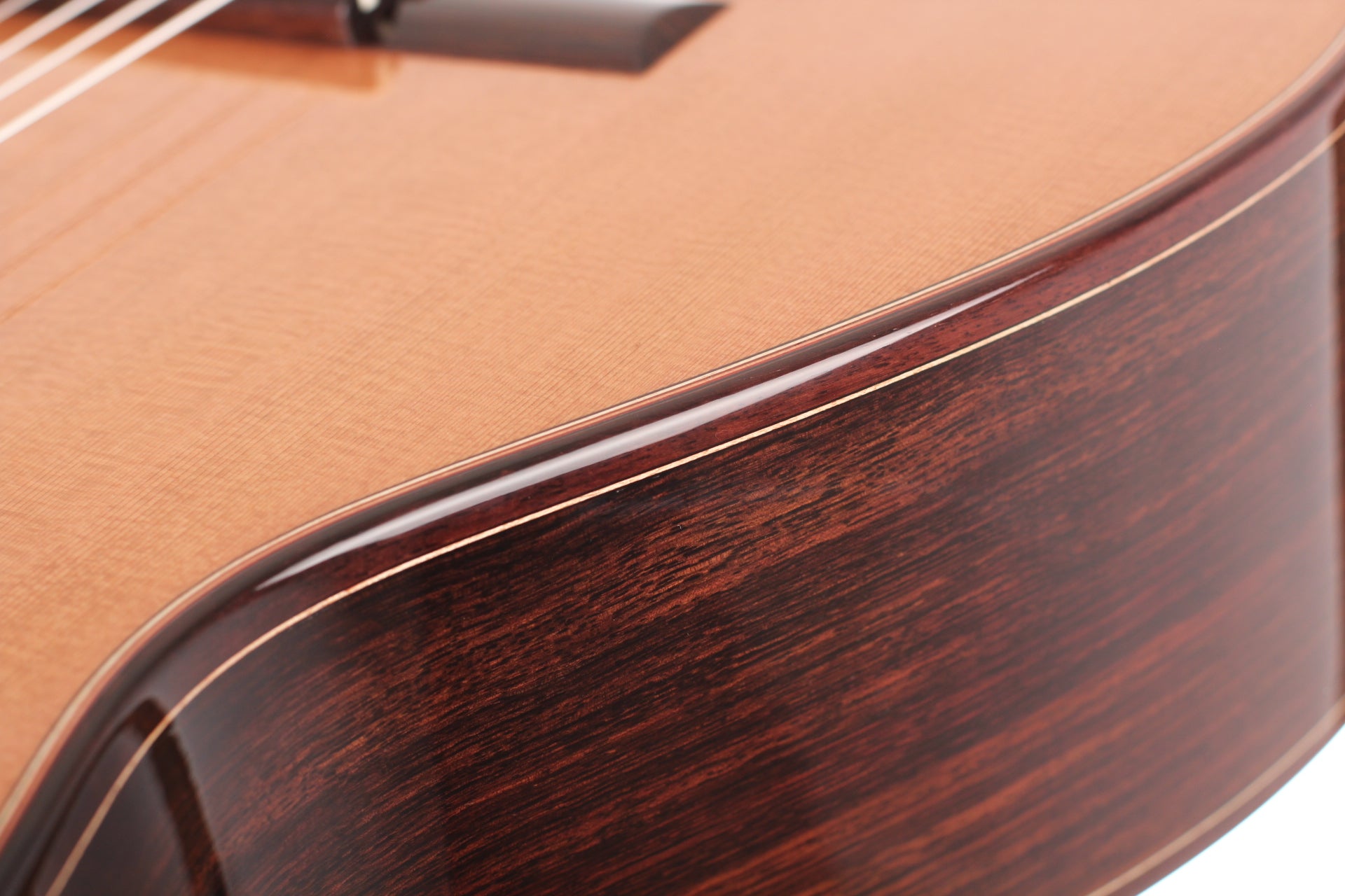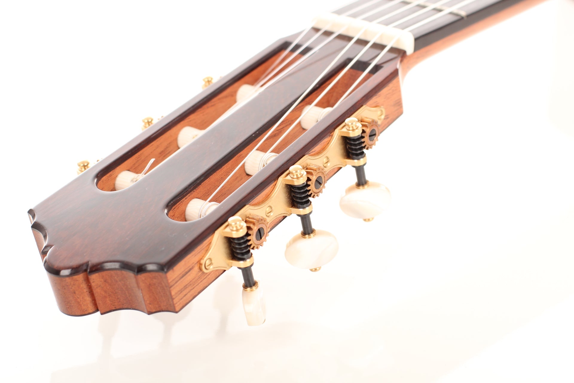 This is one of very rare Heubner guitars with a cedar top especially made for Siccas Guitars in May 2016. The high quality Scheller tuning machines have Macassar pearl knobs corresponding to the inlay on the 12 hole tie-block. Finest Indian rosewood was chosen for back and sides. As a special feature the neck was reinforced internally with an additional wooden bar. The fretboard is modestly elevated to improve the playability of higher notes. The rosette is decorated with celtic ornaments that are also found on the 12-hole tie block. All French polishes. Hardshell case included.